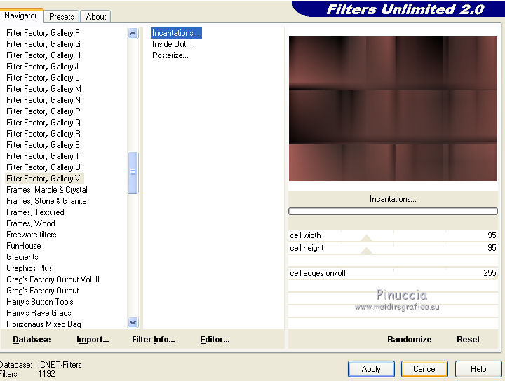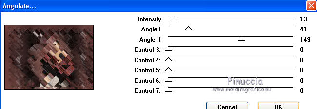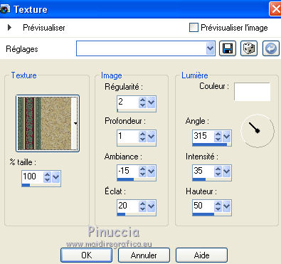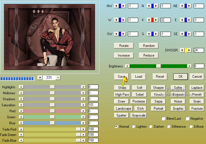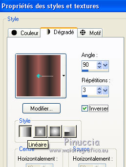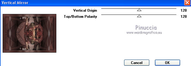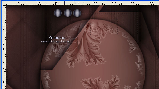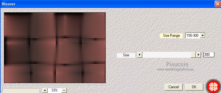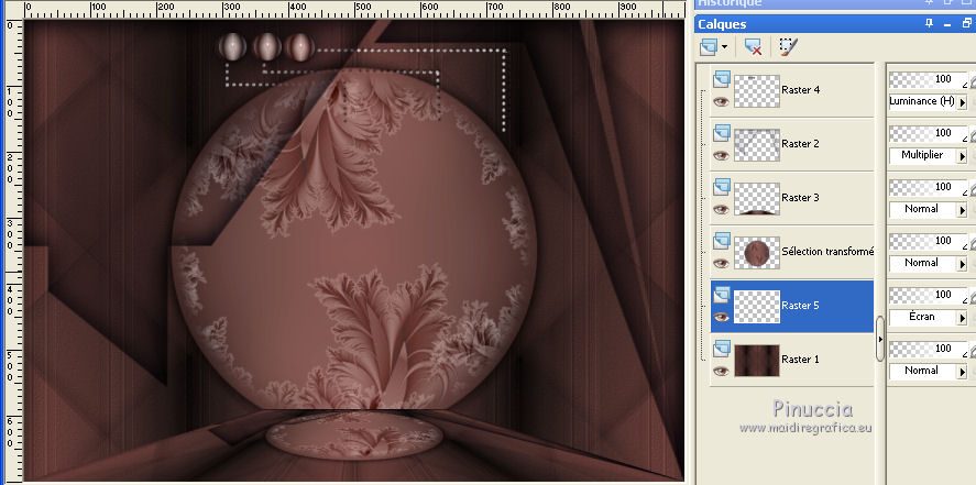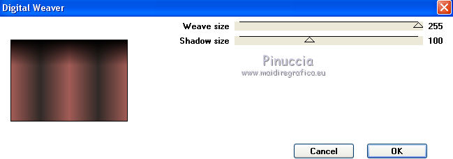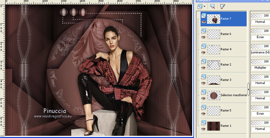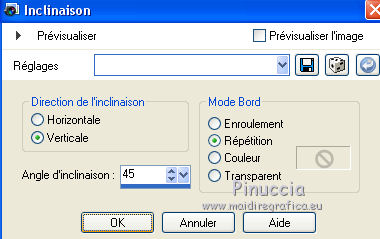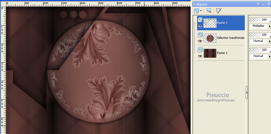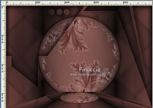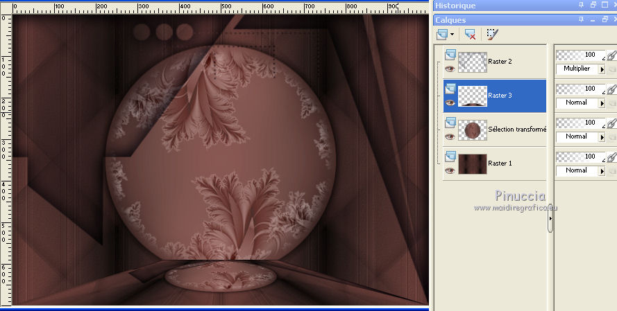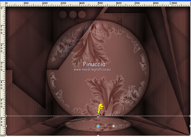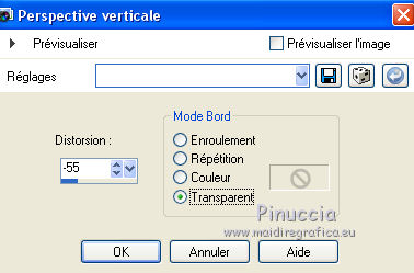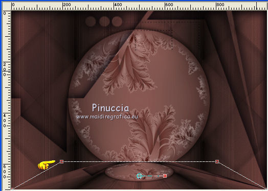 Pour traduire ce tutoriel j'ai utilisé CorelX12, mais il peut également être exécuté avec les autres versions. Suivant la version utilisée, vous pouvez obtenir des résultats différents. Depuis la version X4, la fonction Image>Miroir a été remplacée par Image>Renverser horizontalement, et Image>Renverser avec Image>Renverser verticalement . Dans les versions X5 et X6, les fonctions ont été améliorées par la mise à disposition du menu Objets. Avec la nouvelle version X7, nous avons encore Image>Miroir et Image>Renverser/Retourner, mais avec nouvelles différences. Voir les détails à ce sujet ici Certaines dénominations ont changées entre les versions de PSP. Les plus frequentes dénominations utilisées: ![]() Vos versions ici Nécessaire pour réaliser ce tutoriel: Matériel ici Pour le tube merci Noisette. (les liens des sites des createurs de tubes ici) Modules Externes: consulter, si nécessaire, ma section des filtres ici Filters Unlimited 2.0 ici Neology - Digital Weaver ici Mehdi - Weaver ici Filter Factory Gallery V - Incantations ici Graphics Plus - Vertical Mirror ici Optionnel AAA Filters - Custom ici Funhouse - Angulate ici Filtres Neology, Factory Gallery, Graphics Plus et Funhouse peuvent être utilisés seuls ou importés dans Filters Unlimited. voir comment le faire ici). Si un filtre est fourni avec cette icône, ![]() en fonction des couleurs utilisées, vous pouvez changer le mode mélange et l'opacité des calques. Dans les plus récentes versions de PSP, vous ne trouvez pas le dégradé d'avant plan/arrière plan ou Corel_06_029. Vous pouvez utiliser le dégradé des versions antérieures. Ici le dossier Dégradés de CorelX. Placer la sélection dans le dossier Sélections. 1. Ouvrir une nouvelle image transparente 1000 x 700 pixels. Placer en avant plan la couleur #312a27, et en arrière plan la couleur #a25c56. ![]() Préparer en avant plan un dégradé de premier plan/arrière plan, style Linéaire. ![]() Remplir l'image transparente du dégradé.2. Effets>Modules Externes>Neology - Digital Weaver ![]() 3. Effets>Modules Externes>Mehdi - Weaver ![]() 4. Effets>Modules Externes>Filters Unlimited 2.0 - Filter Factory Gallery V - Incantations ![]() 5. Effets>Effets géométriques>Inclinaison. ![]() 6. Effets>Effets de réflexion>Miroir rotatif. ![]() 7. Effets>Modules Externes>Graphics Plus - Vertical Mirror ![]() 8. Effets>Effets d'image>Mosaïque sans jointures. ![]() 9. Effets>Effets de textures>Texture - sélectionner la texture wp_ivy_111 ![]() 10. Sélections>Charger/Enregistrer une sélection>Charger à partir du disque. Chercher et charger la sélection opportunity_mj ![]() Sélections>Transformer la sélection en calque. 11. Réglage>Flou>Flou gaussien - rayon 40. ![]() 12. Calques>Nouveau calque raster. Ouvrir le tube decofolhas - Édition>Copier. Revenir sur votre travail et Édition>Coller dans la sélection. Placer le calque en mode Luminance (héritée). Effets>Effets 3D>Ombre portée, couleur noire. ![]() Calques>Fusionner>Fusionner le calque de dessous. Sélections>Désélectionner tout. 13. Calques>Dupliquer. Image>Renverser. Image>Miroir. Placer le calque en mode Écran. Calques>Fusionner>Fusionner le calque de dessous. Image>Miroir. 14. Ouvrir le tube deco_mjp - Édition>Copier. Revenir sur votre travail et Édition>Coller comme nouveau calque. Placer le calque en mode Multiplier. ![]() 15. Écute>Copie Spéciale>Copier avec fusion. 16. Édition>Coller comme nouveau calque. 17. Effets>Effets géométriques>Perspective vertical ![]() 18. Activer l'outil Sélecteur ![]() en mode Échelle ![]() pousser le noeud central en haut vers le bas, à peu près jusqu'à 610 pixels. ![]() en mode Perspective ![]() pousse le noeud supérieur gauche vers la droite comme ci-dessous (le noeud contraire se déplacera symétriquement) ![]() Touche M pour désélectionner l'outil. ![]() Calques>Agencer>Déplacer vers le bas. ![]() 19. Vous positionner sur le calque du haut de la pile. Ouvrir le tube deco_1 - Édition>Copier. Revenir sur votre travail et Édition>Coller comme nouveau calque. Positionner bien le tube(si vous voulez, fermer le calque Raster 1 pour voir mieux; dans ce cas, après avoir déplacer le tube, ne pas oublié de re-ouvrir le calque). ![]() Placer le calque en mode Luminance (héritée) 20. Vous positionner sur le calque du bas de la pile. Ouvrir le tube deco_1a_mj - Édition>Copier. Revenir sur votre travail et Édition>Coller comme nouveau calque. 21. Effets>Effets d'image>Décalage. ![]() Placer le calque en mode Écran ![]() 22. Vous positionner sur le calque du haut de la pile. Ouvrir le tube deco_2 - Édition>Copier. Revenir sur votre travail et Édition>Coller comme nouveau calque. Placer le calque en mode Écran. 23. Ouvrir le tube femme-noisette - Édition>Copier. Revenir sur votre travail et Édition>Coller comme nouveau calque. Image>Miroir. Image>Redimensionner, à 70%, redimensionner tous les calques décoché. Positionner bien le tube, voir mon exemple.Effets>Effets 3D>Ombre portée, à choix. 24. Vous devriez avoir ce-ci ![]() En fonction de vos couleurs, vous êtes libre de changer mode mélange et opacité des calques. 25. Calques>Fusionner>Calques visibles. 26. Image>Ajouter des bordures, 1 pixel, symétrique, couleur claire d'arrière plan. Image>Ajouter des bordures, 2 pixels, symétrique, couleur foncée d'avant plan. Image>Ajouter des bordures, 1 pixels, symétrique, couleur claire d'arrière plan. 27. Sélections>Sélectionner tout. Édition>Copier. 28. Image>Ajouter des bordures, 40 pixels, symétrique, couleur blanche. Sélections>Inverser. Édition>Coller dans la sélection. 29. Réglage>Flou>Flou gaussien - rayon 40 ![]() 30. Effets>Modules Externes>Funhouse - Angulate, par défaut. ![]() 31. Effets>Effets de réflexion>Miroir rotatif, par défaut. ![]() 32. Effets>Modules Externes>Graphics Plus - Vertical Mirror ![]() Réglage>Netteté>Davantage de netteté. Sélections>Inverser. Effets>Effets 3D>Omb