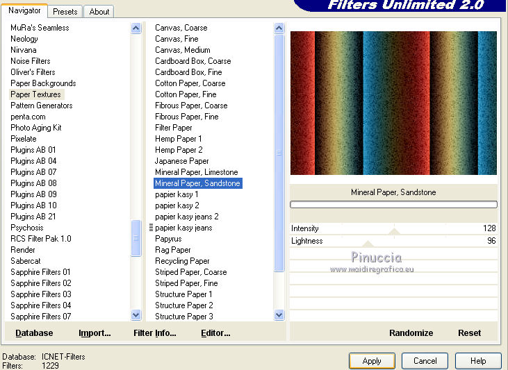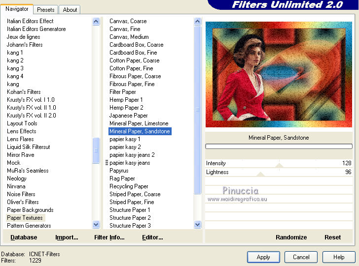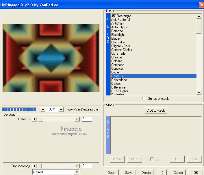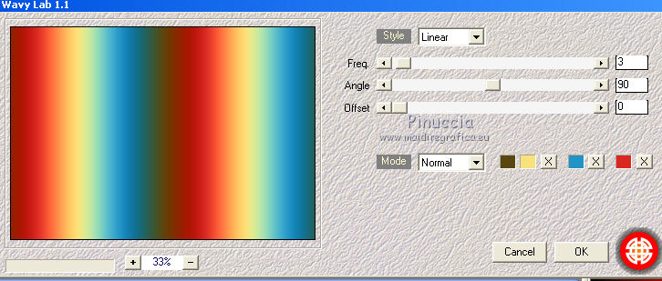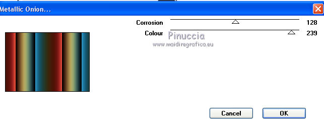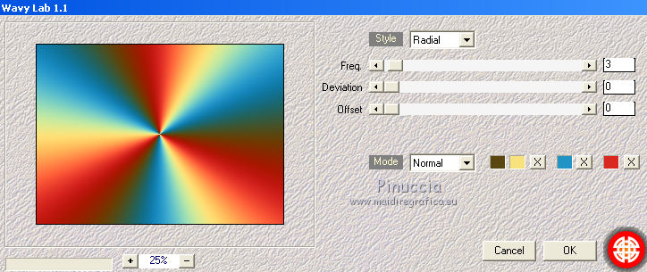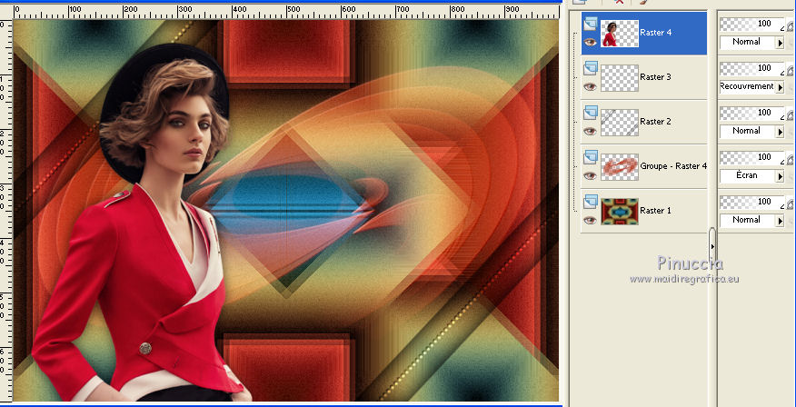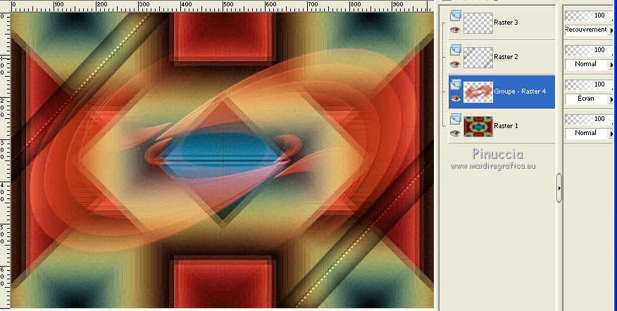 Pour traduire ce tutoriel j'ai utilisé CorelX17, mais il peut également être exécuté avec les autres versions. Suivant la version utilisée, vous pouvez obtenir des résultats différents. Depuis la version X4, la fonction Image>Miroir a été remplacée par Image>Renverser horizontalement, et Image>Renverser avec Image>Renverser verticalement . Dans les versions X5 et X6, les fonctions ont été améliorées par la mise à disposition du menu Objets. Avec la nouvelle version X7, nous avons encore Image>Miroir et Image>Renverser/Retourner, mais avec nouvelles différences. Voir les détails à ce sujet ici Certaines dénominations ont changées entre les versions de PSP. Les plus frequentes dénominations utilisées: ![]() Vos versions iciNécessaire pour réaliser ce tutoriel: Matériel ici Merci pour le tube Maryse. (ici les liens vers les sites des créateurs de tubes) Modules Externes: consulter, si nécessaire, ma section des filtres ici Filters Unlimited 2.0 ici Mehdi - Wavy Lab 1.1 ici Toadies - Metallic Onion ici Graphics Plus - Vertical Mirror ici Mura's Seamless - Emboss at Alpha ici Simple - Pizza Slice Mirror, Blintz ici VanDerLee - Unplugged-X ici Filtres Toadies, Graphics Plus, Mura's Seamless et Simple peuvent être utilisés seuls ou importés dans Filters Unlimited. voir comment le faire ici). Si un filtre est fourni avec cette icône, ![]() en fonction des couleurs utilisées, vous pouvez changer le mode mélange et l'opacité des calques. Ouvrir le masque dans PSP et le minimiser avec le reste du matériel. 1. Placer en avant plan la couleur #f8e27c. et en arrière plan la couleur #5a4611. ![]() 2. Ouvrir une nouvelle image transparente 1000 x 700 pixels. Effets>Modules Externes>Mehdi - Wavy Lab 1.1. Ce filtre crée des dégradés avec les couleurs de votre palette: la première est la couleur d'arrière plan, la deuxième est la couleur d'avant plan. Changer les autres deux couleurs créées par le filtre: la troisième avec #2193c5 et la quatrième avec #d92820. ![]() 3. Effets>Modules Externes>Toadies - Metallic Onion. ![]() 4. Effets>Modules Externes>Filters Unlimited 2.0 - Paper Texture - Mineral Paper,Sandstone, par défaut. ![]() 5. Effets>Modules Externes>Simple - Pizza Slice Mirror. 6. Effets>Effets de réflexion>Miroir rotatif. 7. Effets>Modules Externes>Simple - Blintz. ![]() 8. Image>Renverser. Répéter Effets>Modules Externes>Simple - Blintz. ![]() 9. Effets>Modules Externes>Graphics Plus - Vertical Mirror, par défaut. ![]() 10. Effets>Effets de réflexion>Miroir rotatif, comme précédemment. 11. Effets>Modules Externes>VanDerLee - Unplugged-X - Defocus ![]() 12. Réglage>Netteté>Netteté. 13. Ouvrir deco_original_mj - Édition>Copier. Revenir sur votre travail et Édition>Coller comme nouveau calque. 14. Ouvrir deco_original_1_mj - Édition>Copier. Revenir sur votre travail et Édition>Coller comme nouveau calque. Placer le calque en mode Recouvrement, ou autre. 15. Vous positionner sur le calque du bas de la pile. Placer en avant plan la couleur #b33117. ![]() Calques>Nouveau calque raster. Remplir le calque avec la couleur d'avant plan.16. Calques>Nouveau calque de masque>A partir d'une image. Ouvrir le menu deroulant sous la fenêtre d'origine et vous verrez la liste des images ouvertes. Sélectionner le masque originalmask_mj. ![]() Calques>Fusionner>Fusionner le groupe. 17. Effets>Modules Externes>Mura's Seamless - Emboss at Alpha, par défaut. ![]() Placer le calque en mode Écran, ou autre. ![]() 18. Vous positionner sur le calque du haut de la pile. Ouvrir le tube de la femme - Édition>Copier. Revenir sur votre travail et Édition>Coller comme nouveau calque. Positionner bien le tube.Effets>Effets 3D>Ombre portée, à choix. Les calques et la tag ![]() 19. Image>Ajouter des bordures, 2 pixels, symétrique, couleur #b33117. 20. Sélections>Sélectionner tout. Image>Ajouter des bordures, 50 pixels, symétrique, couleur blanche. Sélections>Inverser. 21. Avant d'appliquer le filtre Wavy Lab, placer en avant plan la couleur du début #f8e27c. ![]() Effets>Modules Externes>Wavy Lab 1.1. avec ces réglages et mêmes couleurs du début. ![]() 22. Effets>Modules Externes>Filters Unlimited 2.0 - Paper Texture - Mineral Paper,Sandstone, par défaut. ![]() 23. Réglage>Netteté>Netteté. 24. Effets>Effets 3D>Ombre portée, couleur noire. ![]() 25. Sélections>Sélectionner tout. Sélections>Modifier>Contracter - 25 pixels. Répéter Effets>Effets 3D>Ombre portée, comme précédemment. 26. Sélections>Modifier>Contracter - 25 pixels. Répéter Effets>Effets 3D>Ombre portée, comme précédemment. Sélections>Désélectionner tout. Image>Ajouter des bordures, 2 pixels, symétrique, couleur #b33117. 27. Signer votre travail sur un nouveau calque. Calques>Fusionner>Tous. 28. Image>Redimensionner, 1000 pixels de largeur, redimensionner tous les calques coché. Enregistrer en jpg. Version avec tube de Lecture 33 ![]() Vos versions ici![]() Si vous avez des problèmes, ou des doutes, ou vous trouvez un link modifié, ou seulement pour me dire que ce tutoriel vous a plu, vous pouvez m'écrire. 28 Mai 2019 |