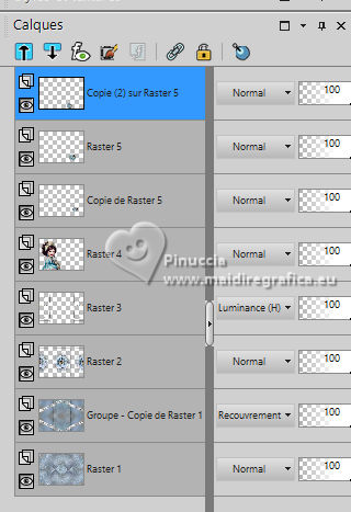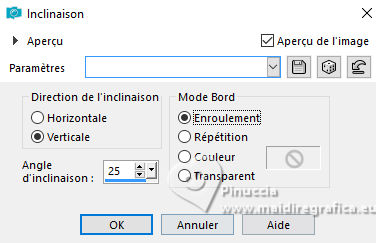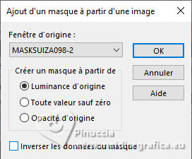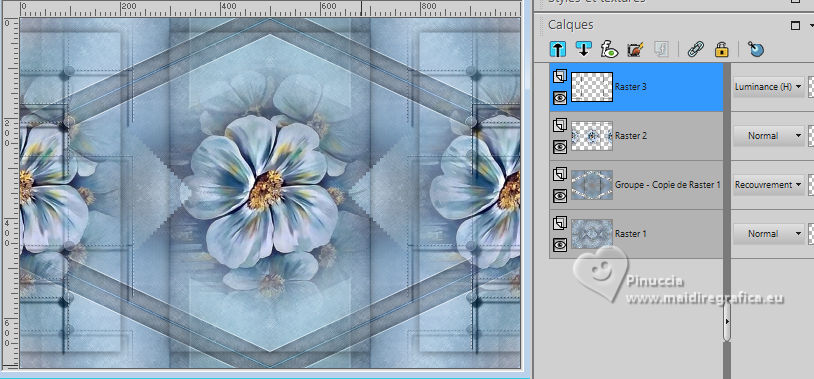 Pour traduire ce tutoriel j'ai utilisé PSPX9 et PSP2020, mais il peut également être exécuté avec les autres versions. Suivant la version utilisée, vous pouvez obtenir des résultats différents. Depuis la version X4, la fonction Image>Miroir a été remplacée par Image>Renverser horizontalement, et Image>Renverser avec Image>Renverser verticalement . Dans les versions X5 et X6, les fonctions ont été améliorées par la mise à disposition du menu Objets. Avec la nouvelle version X7, nous avons encore Image>Miroir et Image>Renverser/Retourner, mais avec nouvelles différences. Voir les détails à ce sujet ici Certaines dénominations ont changées entre les versions de PSP. Les plus frequentes dénominations utilisées: ![]() English translation here Vos versions ici![]() Nécessaire pour réaliser ce tutoriel: ![]() Pour le masque merci Suizabella. Le reste du matériel est de Maria José (ici les liens vers les sites des créateurs du matériel) ![]() consulter, si nécessaire, ma section des filtres ici Filters Unlimited 2.0 ici Mura's Seamless - Emboss at Alpha ici Fantastic Machine - Paint Engine ici Simple - Pizza Slice Mirror, Top Left Mirror ici Kiwi - Zig Zack ici Alien Skin Eye Candy 5 impact - Glass ici Filtres Mura's Seamless, Kiwi et Simple peuvent être utilisés seuls ou importés dans Filters Unlimited. voir comment le faire ici). Si un filtre est fourni avec cette icône, ![]() en fonction des couleurs utilisées, vous pouvez changer le mode mélange et l'opacité des calques. Placer le preset En cliquant sur le preset une ou deux fois (selon vos réglages) automatiquement il se placera directement dans le dossier Settings de Alien Skin Eye Candy. pourquoi un ou deux clic voir ici ![]() Placer la sélection dans le dossier Sélections. Ouvrir le masque dans PSP et le minimiser avec le reste du matériel. 1. Ouvrir une nouvelle image transparente 1000 x 700 pixels. Sélections>Sélectionner tout. 2. Ouvrir l'image grafico-potira ![]() Édition>Copier. Revenir sur votre travail et Édition>Coller dans la sélection. Sélections>Désélectionner tout. 3. Effets>Effets d'image>Mosaïque sans jointures. ![]() 4. Réglage>Flou>Flou gaussien - rayon 50. ![]() 5. Calques>Dupliquer. Fermer ce calque, et vous positionner sur le calque original, Raster 1. 6. Effets>Modules Externes>Fantastic Machine - PaintEngine - preset flakes si vous n'avez bien installé le filtre, et ne trouvez pas les presets, copiez les réglages de la capture. ![]() 7. Effets>Modules Externes>Simple - Pizza Slice Mirror. Cet effet travaille sans fenêtre; résultat ![]() 8. Effets>Effets d'image>Mosaïque sans jointures. ![]() 9. Effets>Effets de réflexion>Miroir rotatif. ![]() 10. Effets>Modules Externes>*Kiwi* - Zig-Zack, par défaut. ![]() Répéter l'Effet une deuxième fois. ![]() Réglage>Netteté>Netteté. 11. Effets>Modules Externes>Simple - Top Left Mirror. ![]() 12. Reouvrir et vous positionner sur le calque du haut de la pile, Copie de Raster 1. Calques>Nouveau calque de masque>A partir d'une image. Ouvrir le menu deroulant sous la fenêtre d'origine et vous verrez la liste des images ouvertes. Sélectionner le masque MASKSUIZA098-2. ![]() Calques>Fusionner>Fusionner le groupe. 13. Effets>Modules Externes>Mura's Seamless - Emboss at Alpha, par défaut. ![]() 14. Effets>Modules Externes>Simple - Top Left Mirror. ![]() Placer le calque en mode Recouvrement, ou selon vos couleurs. 15. Sélections>Charger/Enregistrer une sélection>Charger à partir du disque. Chercher et charger la sélection potira-MJ ![]() 16. Ouvrir le misted misted-potira ![]() Édition>Copier. Revenir sur votre travail et Édition>Coller comme nouveau calque. Sélections>Inverser. Presser CANC sur le clavier ![]() Sélections>Inverser. 17. Effets>Effets 3D>Ombre portée, couleur noire. ![]() Sélections>Désélectionner tout. 18. Effets>Effets d'image>Mosaïque sans jointures. ![]() 19. Vous positionner sur le groupe Groupe-Copie de Raster 1. Effets>Effets géométriques>Inclinaison. ![]() 20. Effets>Modules Externes>Simple - Top Left Mirror. ![]() Effets>Effets 3D>Ombre portée, comme précédemment. 21. Ouvrir decoMJ ![]() Édition>Copier. Revenir sur votre travail et Édition>Coller comme nouveau calque. Calques>Agencer>Placer en haut de la pile. Placer le calque en mode Luminance (héritée). La tag et les calques - adapter Mode mélange et opacité à votre goût. ![]() 22. Ouvrir le tube principal ai-tube-mariajose ![]() Édition>Copier. Revenir sur votre travail et Édition>Coller comme nouveau calque. Image>Redimensionner, à 80%, redimensionner tous les calques décoché. Déplacer le tube à gauche.Effets>Effets 3D>Ombre portée, à choix. 23. Édition>Copie Spéciale>Copier avec fusion. Édition>Coller comme nouvelle image. Continuer sur cette image. Image>Miroir. 24. Effets>Effets géométriques>Cercle. ![]() Image>Redimensionner, à 20%, redimensionner tous les calques coché. 25. Effets>Modules Externes>Alien Skin Eye Candy 5 Impact - Glass. Sélectionner le preset glass potira-MJ ![]() 26. Édition>Copier. Revenir sur votre travail et Édition>Coller comme nouveau calque. 27. Touche K sur le clavier pour activer l'outil Sélecteur ![]() et placer Position horiz.: 640,00 et Position vert.: 510,00. ![]() Touche M pour désélectionner l'outil. 28. Calques>Dupliquer. Image>Redimensionner, à 80%, redimensionner tous les calques décoché. Calques>Agencer>Déplacer vers le bas. Calques>Dupliquer. Calques>Agencer>Placer en haut de la pile. Positionner bien l'image - voir mon exemple.29. Rester sur le calque du haut de la pile, Copie 2 de Raster 5. ![]() Calques>Fusionner>Fusionner le calque de dessous - 2 fois 30. Image>Ajouter des bordures, 1 pixel, symétrique avec une couleur foncée de votre travail (#2e577e) 31. Sélections>Sélectionner tout. Édition>Copier Image>Ajouter des bordures, 50 pixels, symétrique, couleur blanche. 32. Sélections>Inverser. Édition>Coller dans la sélection 33. Réglage>Fl
