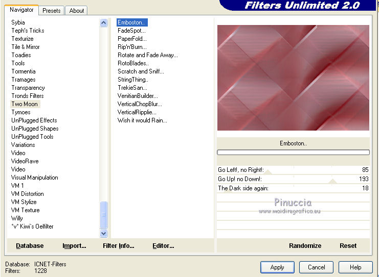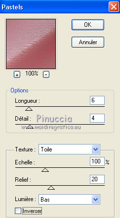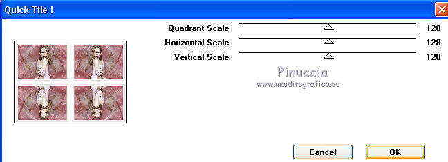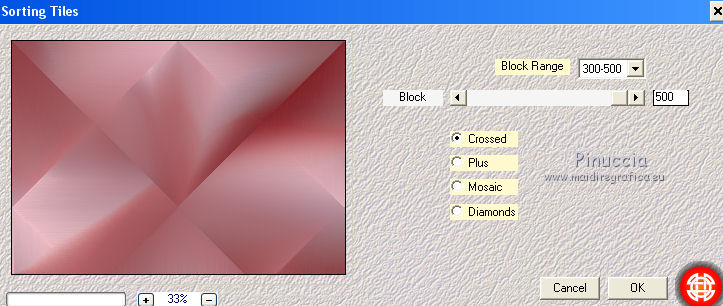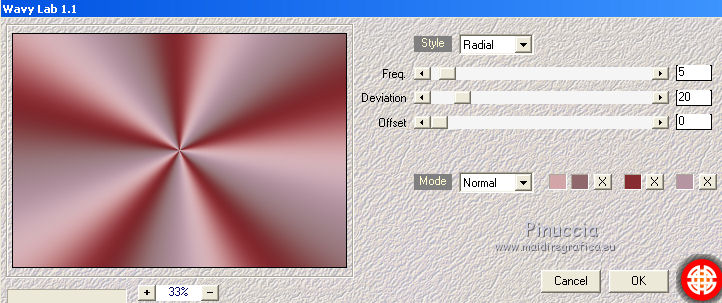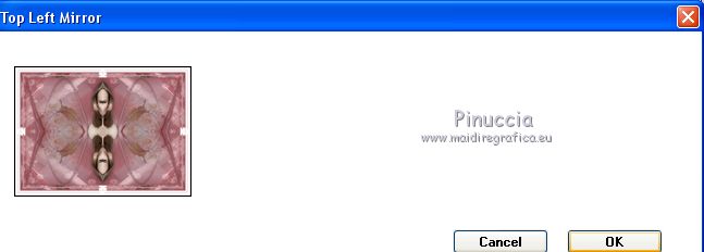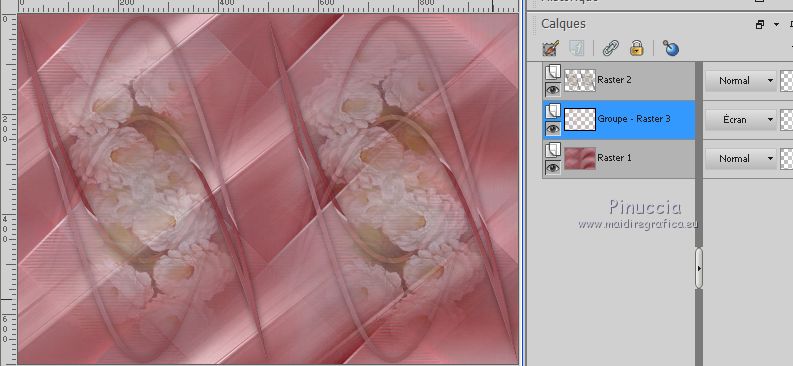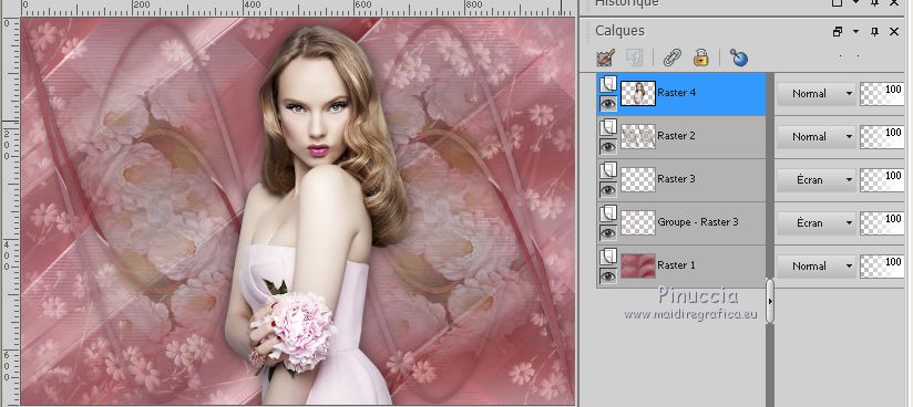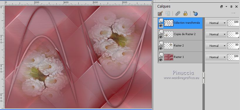 Pour traduire ce tutoriel j'ai utilisé CorelX17 et CorelX2, mais il peut également être exécuté avec les autres versions. Suivant la version utilisée, vous pouvez obtenir des résultats différents. Depuis la version X4, la fonction Image>Miroir a été remplacée par Image>Renverser horizontalement, et Image>Renverser avec Image>Renverser verticalement . Dans les versions X5 et X6, les fonctions ont été améliorées par la mise à disposition du menu Objets. Avec la nouvelle version X7, nous avons encore Image>Miroir et Image>Renverser/Retourner, mais avec nouvelles différences. Voir les détails à ce sujet ici Certaines dénominations ont changées entre les versions de PSP. Les plus frequentes dénominations utilisées: ![]() Vos versions iciNécessaire pour réaliser ce tutoriel: Matériel ici Pour le tube merci Tocha. (ici les liens vers les sites des créateurs de tubes) Modules Externes: consulter, si nécessaire, ma section des filtres ici Filters Unlimited 2.0 ici Mehdi - Wavy Lab 1.1 ici Mehdi - Sorting Tiles ici Artistiques - Pastels ici Two Moon - Emboston ici Mura's Seamless - Emboss, Emboss at Alpha ici Filtres Two Moon et Mura's Seamless peuvent être utilisés seuls ou importés dans Filters Unlimited. voir comment le faire ici). Si un filtre est fourni avec cette icône, ![]() en fonction des couleurs utilisées, vous pouvez changer le mode mélange et l'opacité des calques. Dans les plus récentes versions de PSP, vous ne trouvez pas le dégradé d'avant plan/arrière plan ou Corel_06_029. Vous pouvez utiliser le dégradé des versions antérieures. Ici le dossier Dégradés de CorelX. Placer les sélections dans le dossier Sélections. Ouvrir le masque dans PSP et le minimiser avec le reste du matériel. 1. Choisir deux couleurs. Mes couleurs. Avant plan #90676a Arrière plan #d2a5a9. ![]() Couleur de l'ombre #872c31 2. Ouvrir une nouvelle image transparente 1000 x 700 pixels. 3. Effets>Modules Externes>Mehdi - Wavy Lab Ce filtre crée des dégradés avec les couleurs de votre palette: la première est la couleur d'arrière plan, la deuxième est la couleur d'avant plan. Changer les autres deux couleurs créées par le filtre: la troisième avec la couleur #872c31 et la quatrième avec la couleur #b595a2. ![]() 4. Réglage>Flou>Flou radial. ![]() 5. Effets>Modules Externes>Artistic - Rouge Pastels - par défaut ou Artistiques - Pastels ![]() 6. Effets>Modules Externes>Mehdi - Sorting Tiles. ![]() 7. Effets>Effets d'image>Mosaïque sans jointures. ![]() 8. Effets>Modules Externes>Filters Unlimited 2.0 - Two Moon - Emboston, par défaut ![]() 9. Sélections>Charger/Enregistrer une sélection>Charger à partir du disque. Chercher et charger la sélection printemps_mj. ![]() Sélections>Transformer la sélection en calque. 10. Effets>Effets de distorsion>Vagues. ![]() Sélections>Modifier>Contracter - 10 pixels. Presser CANC sur le clavier ![]() Sélections>Désélectionner tout. 11. Sélections>Charger/Enregistrer une sélection>Charger à partir du disque. Charger à nouveau la sélection printemps_mj. ![]() Presser CANC sur le clavier ![]() Sélections>Désélectionner tout. 12. Calques>Dupliquer. Image>Miroir. Image>Renverser. Calques>Fusionner>Fusionner le calque de dessous. 13. Effets>Modules Externes>MuRa's Seamless - Emboss, par défaut ![]() Effets>Effets 3D>Ombre portée, couleur noire. ![]() 14. Sélections>Charger/Enregistrer une sélection>Charger à partir du disque. Chercher et charger la sélection printemps_3_mj. ![]() 15. Calques>Nouveau calque raster. Calques>Agencer>Déplacer vers le bas. 16. Ouvrir le misted - Édition>Copier. Revenir sur votre travail et Édition>Coller dans la sélection. Réduire l'opacité de ce calque à 80%. Sélections>Désélectionner tout. Calques>Dupliquer. Image>Renverser. Image>Miroir. 17. Vous positionner sur le calque du haut de la pile Sélections transformée. ![]() Calques>Fusionner>Fusionner le calque de dessous - 2 fois. 18. Effets>Effets d'image>Mosaïque sans jointures. ![]() 19. Vous positionner sur le calque du bas de la pile. Calques>Nouveau calque raster. Remplir avec la couleur claire d'arrière plan #d2a5a9.20. Calques>Nouveau calque de masque>A partir d'une image. Ouvrir le menu deroulant sous la fenêtre d'origine et vous verrez la liste des images ouvertes. Sélectionner le masque abstrakt-blau-metallic. ![]() Calques>Fusionner>Fusionner le groupe. 21. Effets>Modules Externes>MuRa's Seamless - Emboss at Alpha, par défaut. ![]() Placer le calque en mode Écran. ![]() 22. Ouvrir le tube fleurs_mj Edit - Édition>Copier. Revenir sur votre travail ete Édition>Coller comme nouveau calque. Placer le calque en mode Écran. 23. Vous positionner sur le calque du haut de la pile. Ouvrir le tube de la femme - Édition>Copier. Revenir sur votre travail ete Édition>Coller comme nouveau calque. Image>Miroir. Image>Redimensionner, à 65% (j'ai fait 70%), redimensionner tous les calques décoché. Effets>Effets 3D>Ombre portée, à choix. La tag et les calques ![]() 24. Pour les bords: placer en avant plan la couleur #872c31. ![]() Image>Ajouter des bordures, 1 pixel, symétrique, couleur d'avant plan #872c31. Image>Ajouter des bordures, 10 pixels, symétrique, couleur claire d'arrière plan #d2a5a9. Image>Ajouter des bordures, 1 pixel, symétrique, couleur #872c31. Image>Ajouter des bordures, 20 pixels, symétrique, couleur blanche. Image>Ajouter des bordures, 1 pixel, symétrique, couleur #872c31. Image>Ajouter des bordures, 30 pixels, symétrique, couleur blanche. Image>Ajouter des bordures, 1 pixel, symétrique, couleur #872c31. 25. Sélections>Charger/Enregistrer une sélection>Charger à partir du disque. Chercher et charger la sélection printemps_4_mj. ![]() 26. Effets>Modules Externes>Graphics Plus - Quick Tile I, par défaut. ![]() 27. Effets>Effets 3D>Ombre portée, couleur #872c31. ![]() 28. Effets>Effets de réflexion>Miroir rotatif. ![]() 29. Effets>Modules Externes>Simple - Top Left Mirror. ![