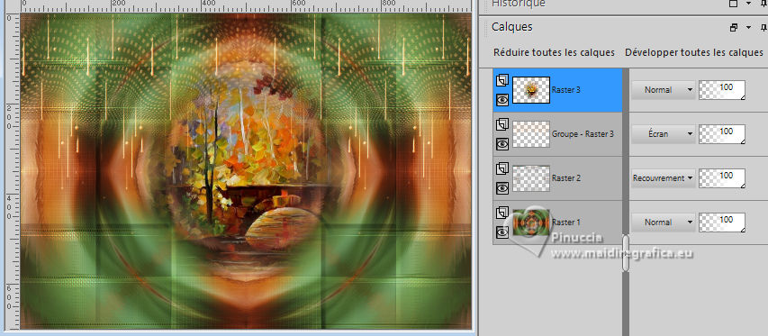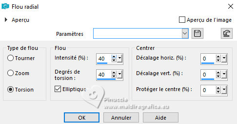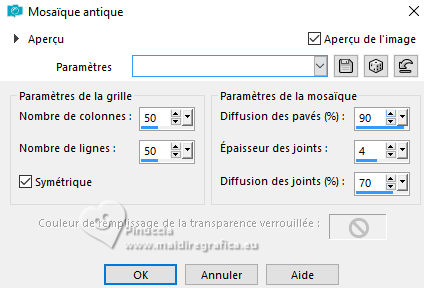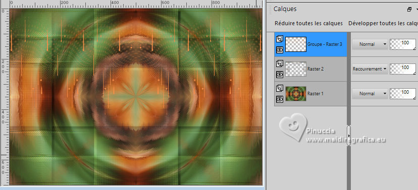 Pour traduire ce tutoriel j'ai utilisé PSPX9 et PSP2020, mais il peut également être exécuté avec les autres versions. Suivant la version utilisée, vous pouvez obtenir des résultats différents. Depuis la version X4, la fonction Image>Miroir a été remplacée par Image>Renverser horizontalement, et Image>Renverser avec Image>Renverser verticalement . Dans les versions X5 et X6, les fonctions ont été améliorées par la mise à disposition du menu Objets. Avec la nouvelle version X7, nous avons encore Image>Miroir et Image>Renverser/Retourner, mais avec nouvelles différences. Voir les détails à ce sujet ici Certaines dénominations ont changées entre les versions de PSP. Les plus frequentes dénominations utilisées: ![]() English translation here Vos versions ici![]() Nécessaire pour réaliser ce tutoriel: ![]() Pour le tube merci Kamil. Le reste du matériel est de Maria José (ici les liens vers les sites des créateurs du matériel) ![]() consulter, si nécessaire, ma section des filtres ici Filters Unlimited 2.0 ici Mehdi - Wavy Lab 1.1. ici Mehdi 2 - Flat Median ici Flaming Pear - Flexyfy 2 ici Funhouse - Spyrozag ici &<Bkg Kaleidoscope> - Flip SidesRsf (à importer dans Unlimited) ici Simple - Top Left Mirror ici Filtres Funhouse et Simple peuvent être utilisés seuls ou importés dans Filters Unlimited. voir comment le faire ici). Si un filtre est fourni avec cette icône, ![]() en fonction des couleurs utilisées, vous pouvez changer le mode mélange et l'opacité des calques. ![]() Placer le preset pour Flexify dans un dossier à choix (je le laisse habituellement dans le dossier du matériel). Vous l'importerez de ce dossier lorsque vous en aurez besoin. Ouvrir le masque dans PSP et le minimiser avec le reste du matériel. Placer en avant plan la couleur #293c1c et en arrière plan la couleur #fa8f49. ![]() 1. Ouvrir une nouvelle image transparente 1000 x 700 pixels. 2. Effets>Modules Externes>Mehdi - Wavy Lab 1.1. Ce filtre crée des dégradés avec les couleurs de votre palette: la premiére est la couleur d'arriére plan, la deuxiéme est la couleur d'avant plan. Changer les autres deux couleurs créées par le filtre: la troisième avec la couleur #6a9665 et la quatrième avec la couleur #f05513 ![]() 3. Réglage>Flou>Flou gaussien - rayon 30. ![]() 4. Sélections>Sélectionner tout. Ouvrir le tube principal KamilTube-858 ![]() Effacer le watermark et Édition>Copier, et minimiser le tube. Revenir sur votre travail et Édition>Coller dans la sélection. Sélections>Désélectionner tout. 5. Réglage>Flou>Flou radial. ![]() 6. Effets>Effets d'image>Mosaïque sans jointures. ![]() 7. Effets>Modules Externes>Funhouse - SpyroZag. ![]() 8. Effets>Modules Externes>Filters Unlimited 2.0 - &<Bkg Kaleidoscope> - Flip SidesRsf ![]() 9. Effets>Modules Externes>Simple - Top Left Mirror. ![]() 10. Effets>Modules Externes>Flaming Pear - Flexify 2 cliquer sur le bouton rouge et chercher le preset dans le dossier où vous l'avec copié ![]() Réglages ![]() 11. Effets>Modules Externes>Simple - Top Left Mirror. ![]() 12. Réglage>Netteté>Davantage de netteté. 13. Ouvrir deco-4-MJ ![]() Édition>Copier. Revenir sur votre travail et Édition>Coller comme nouveau calque. Placer le calque en mode Recouvrement. 14. Calques>Nouveau calque raster. Remplir le calque avec la couleur d'arrière plan #fa8f49.15. Calques>Nouveau calque de masque>A partir d'une image. Ouvrir le menu deroulant sous la fenêtre d'origine et vous verrez la liste des images ouvertes. Sélectionner le masque mask1-deco-MJ. ![]() Calques>Fusionner>Fusionner le groupe. 16. Calques>Dupliquer. ![]() Calques>Fusionner>Fusionner le calque de dessous. ![]() 17. Effets>Modules Externes>Mura's Seamless - Emboss at Alpha, par défaut. ![]() Placer le calque en mode Écran. 18. Touche K pour activer l'outil Sélecteur ![]() et placer position horiz.: 0,00 et Posizione vert.: -30,00. ![]() Touche M pour désélectionner l'outil. 19. Ouvrir le misted misted-4-MJ ![]() Édition>Copier. Revenir sur votre travail et Édition>Coller comme nouveau calque. La tag et les calques: adapter Mode mélange and opacité selon vos couleurs ![]() 20. Activer à nouveau le tube principal KamilTube-858 et Édition>Copier. Revenir sur votre travail et Édition>Coller comme nouveau calque. Image>Miroir. Image>Redimensionner, à 80%, redimensionner tous les calques décoché. Déplacer le tube à gauche.Effets>Effets 3D>Ombre portée, à choix. 21. Ouvrir le tube flor-deco-MJ ![]() Effacer le watermark et Édition>Copier. Revenir sur votre travail et Édition>Coller comme nouveau calque. Image>Redimensionner, à 85%, redimensionner tous les calques décoché. Déplacer le tube en bas à droite.Effets>Effets 3D>Ombre portée, couleur noire. ![]() 22. Calques>Dupliquer. Effets>Effets de textures>Mosaïque antique ![]() Calques>Agencer>Déplacer vers le bas. Placer le calque en mode Écran. 23. Image>Ajouter des bordures, 1 pixel, symétrique, couleur foncée. Image>Ajouter des bordures, 1 pixel, symétrique, couleur claire. Image>Ajouter des bordures, 1 pixel, symétrique, couleur foncée. 24. Sélections>Sélectionner tout. Édition>Copier Image>Ajouter des bordures, 50 pixels, symétrique, couleur blanche. 25. Sélections>Inverser. Édition>Coller dans la sélection 26. Effets>Modules Externes>Mehdi 2 - Flat Median. ![]() 27. Effets>Effets de réflexion>Miroir rotatif, par défaut. ![]() 28. Réglage>Netteté>Davantage de netteté. 29. Effets>Effets 3D>Ombre portée, couleur noire. ![]() Sélections>Inverser. Répéter Effets>Effets 3D>Ombre portée, comme précédemment. Sélections>Désélectionner tout. 30. Signer votre travail. Image>Ajouter des bordures, 1 pixel, symétrique, couleur claire #fa8f49. 31. Image>Redimensionner, 1000 pixels de largeur, redimensionner tous les calques coché. Enregistrer en jpg. Pour les tubes de cette version merci Lana et Anna.br ![]() ![]() Si vous avez des problèmes, ou des doutes, ou vous trouvez un 