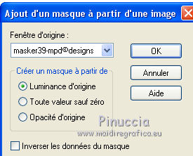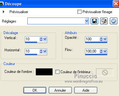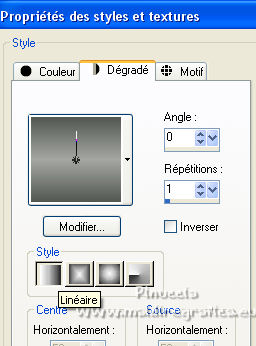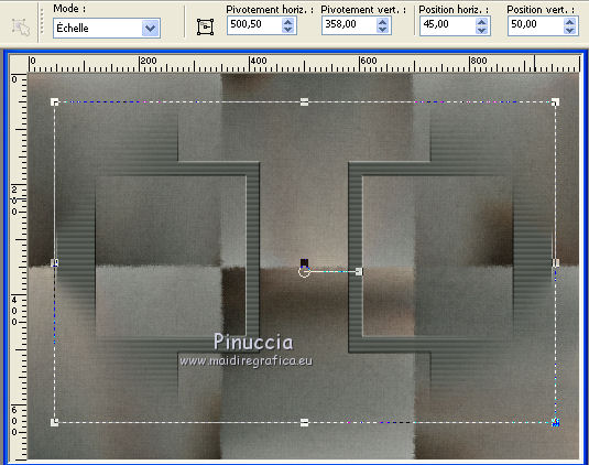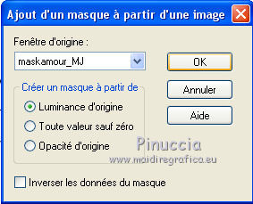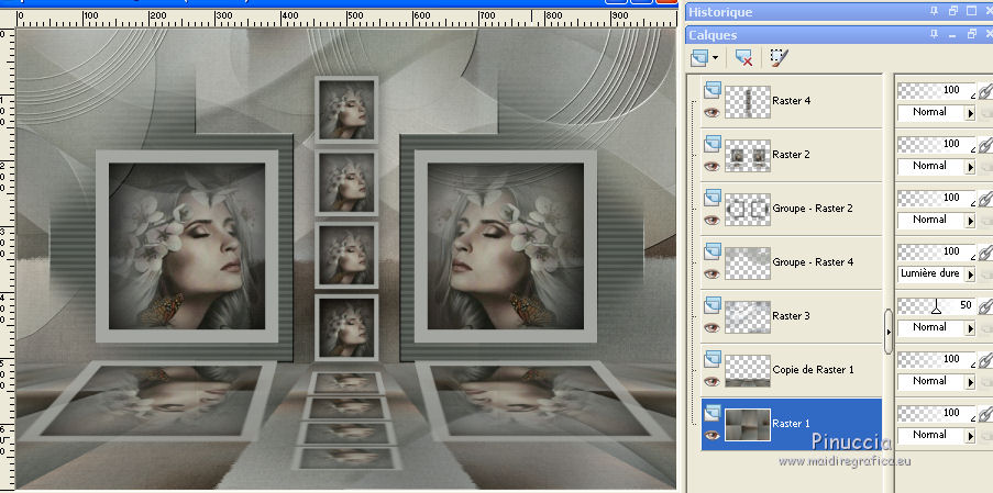 Pour traduire ce tutoriel j'ai utilisé PSPX7, PSPX2 et PSPX3, mais il peut également être exécuté avec les autres versions. Suivant la version utilisée, vous pouvez obtenir des résultats différents. Depuis la version X4, la fonction Image>Miroir a été remplacée par Image>Renverser horizontalement, et Image>Renverser avec Image>Renverser verticalement . Dans les versions X5 et X6, les fonctions ont été améliorées par la mise à disposition du menu Objets. Avec la nouvelle version X7, nous avons encore Image>Miroir et Image>Renverser/Retourner, mais avec nouvelles différences. Voir les détails à ce sujet ici Certaines dénominations ont changées entre les versions de PSP. Les plus frequentes dénominations utilisées: ![]() English translation here Vos versions ici![]() Nécessaire pour réaliser ce tutoriel: Matériel ici Le matériel est de Maria José. (ici les liens vers les sites des créateurs du matériel) Modules Externes: consulter, si nécessaire, ma section des filtres ici Filters Unlimited 2.0 ici Fantastic Machine - Paint Engine ici Mehdi - Sorting Tiles ici Carolaine and Sensibility - CS-HLines ici Alien Skin Eye Candy 5 Impact - Perspective Shadow ici Mura's Meister - Perspective Tiling ici Mura's Meister - Copies ici Mura's Seamless - Emboss at Alpha ici Filtres Mura's Seamless peuvent être utilisés seuls ou importés dans Filters Unlimited. voir comment le faire ici). Si un filtre est fourni avec cette icône, ![]() en fonction des couleurs utilisées, vous pouvez changer le mode mélange et l'opacité des calques. Dans les plus récentes versions de PSP, vous ne trouvez pas le dégradé d'avant plan/arrière plan ou Corel_06_029. Vous pouvez utiliser le dégradé des versions antérieures. Ici le dossier Dégradés de CorelX. Placer les presets En cliquant sur le preset une ou deux fois (selon vos réglages) automatiquement il se placera directement dans le dossier Settings de Alien Skin Eye Candy. pourquoi un ou deux clic voir ici Placer la sélection dans le dossier Sélections. Ouvrir les masques dans PSP et les minimiser avec le reste du matériel. 1. Placer en avant plan la couleur #525751. et en arrière plan la couleur #a5a7a2. ![]() Préparer en avant plan un dégradé de premier plan/arrière plan, style Linéaire. ![]() Ouvrir une nouvelle image transparente 1000 x 700 pixels. Remplir l'image transparente du dégradé.2. Sélections>Sélectionner tout. Ouvrir le misted du visage et Édition>Copier. Revenir sur votre travail et &EacutE;dition>Coller dans la sélection. Sélections>Désélectionner tout. 3. Effets>Effets d'image>Mosaïque sans jointures, par défaut. ![]() 4. Réglage>Flou>Flou gaussien - rayon 25. ![]() 5. Réglage>Ajouter/Supprimer du bruit>Ajouter du bruit. ![]() 6. Effets>Modules Externes>Mehdi - Sorting Tiles. ![]() 7. Effets>Modules Externes>Fantastic Machines - PaintEngine. Sélectionner le preset zap et ok. ![]() 8. Réglage>Netteté>Davantage de netteté. 9. Calques>Nouveau calque raster. Placer en avant plan la Couleur. Remplir le calque avec la couleur foncée d'avant plan.10. Calques>Nouveau calque de masque>A partir d'une image. Ouvrir le menu deroulant sous la fenêtre d'origine et vous verrez la liste des images ouvertes. Sélectionner le masque masker-39-mpd. ![]() Calques>Fusionner>Fusionner le groupe. 11. Effets>Modules Externes>Carolaine and Sensibility - CS-Hlines, par défaut. ![]() 12. Effets>Modules Externes>Mura's Seamless - Emboss at Alpha, par défaut. ![]() 13. Effets>Effets de réflexion>Miroir rotatif. ![]() 14. Touche K sur le clavier pour activer l'outil Sélecteur ![]() garder Position horiz.: 45,00 et placer Position vert.: 50,00. ![]() 15. Sélections>Charger/Enregistrer une sélection>Charger à partir du disque. Chercher et charger la sélection reflections_mj. ![]() 16. Calques>Nouveau calque raster. Remplir le calque avec la couleur claire.17. Sélections>Modifier>Contracter - 20 pixels. Presser CANC sur le clavier ![]() 18. Édition>Coller comme nouveau calque (le misted du visage est toujours en mémoire). Image>Redimensionner, à 70%, redimensionner tous les calques décoché. Positionner le tube sur la sélection.Sélections>Inverser. Presser CANC sur le clavier. 19. À nouveau Sélections>Inverser. Calques>Nouveau calque raster. Effets>Effets 3D>Découpe. ![]() Calques>Fusionner>Fusionner le calque de dessous - 2 fois. Sélections>Désélectionner tout. Édition>Copier. Édition>Coller comme nouvelle image, et minimiser cette image. 20. Revenir sur votre travail. Calques>Dupliquer. Image>Miroir. Calques>Fusionner>Fusionner le calque de dessous. 21. Effets>Modules Externes>Alien Skin Eye Candy 5 Impact - Perspective Shadow. Sélectionner le preset tuto-04-mj. ![]() 22. Vous positionner sur le calque Raster 1. Calques>Dupliquer. 23. Effets>Modules Externes>Mura's Meister - Perspective Tiling. ![]() 24. Activer l'outil Baguette magique ![]() et cliquer dans la partie transparente pour la sélectionner. Sélections>Modifier>Progressivité Intérieure/Extérieure - 30 ![]() Presser 8 fois CANC sur le clavier. Sélections>Désélectionner tout. 25. Effets>Effets de réflexion>Miroir rotatif, par défaut. ![]() 26. Ouvrir le tube decomask_mj - Édition>Copier. Revenir sur votre travail et Édition>Coller comme nouveau calque. Réduire l'opacité de ce calque à 50%. 27. Calques>Nouveau calque raster. Remplir le calque avec la couleur claire.28. Calques>Nouveau calque de masque>A partir d'une image. Ouvrir le menu deroulant sous la fenêtre d'origine et sélectionner le masque maskamour_mj. ![]() Calques>Fusionner>Fusionner le groupe. 29. Effets>Modules Externes>Mura's Seamless - Emboss at Alpha, par défaut. Placer le calque en mode Lumière dure. 30. Activer l'image minimisée à l'étape 19. Image>Redimensionner, à 35%, redimensionner tous les calques coché. 31. Édition>Copier. Revenir sur votre travail et Édition>Coller comme nouveau calque. Calques>Agencer>Placer en haut de la pile. 