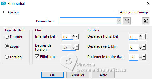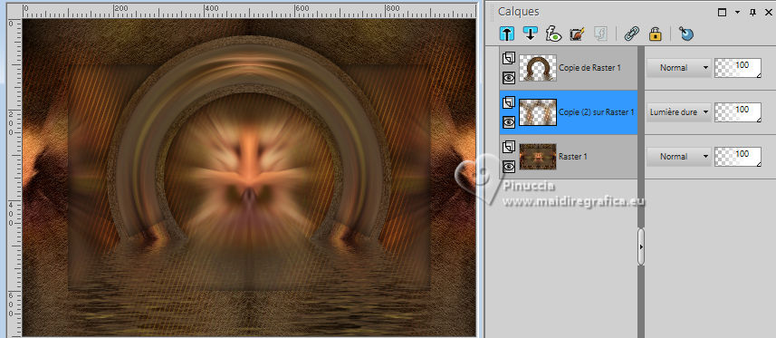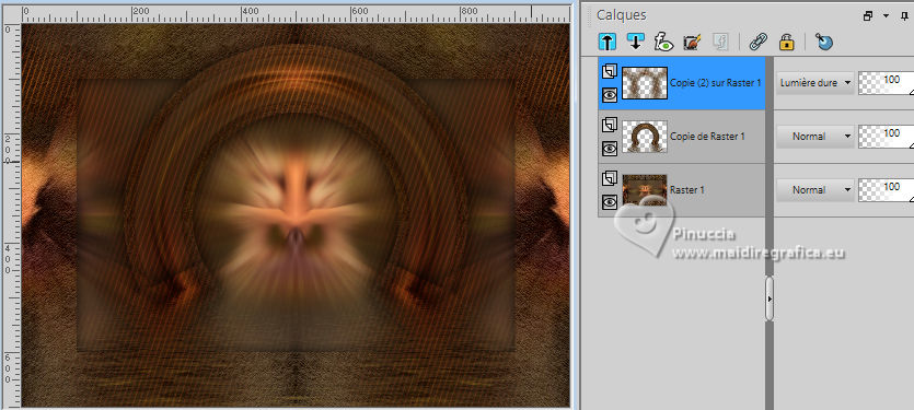 Pour traduire ce tutoriel j'ai utilisé PSPX9 et PSP2020, mais il peut également être exécuté avec les autres versions. Suivant la version utilisée, vous pouvez obtenir des résultats différents. Depuis la version X4, la fonction Image>Miroir a été remplacée par Image>Renverser horizontalement, et Image>Renverser avec Image>Renverser verticalement . Dans les versions X5 et X6, les fonctions ont été améliorées par la mise à disposition du menu Objets. Avec la nouvelle version X7, nous avons encore Image>Miroir et Image>Renverser/Retourner, mais avec nouvelles différences. Voir les détails à ce sujet ici Certaines dénominations ont changées entre les versions de PSP. Les plus frequentes dénominations utilisées: ![]() English translation here Vos versions ici![]() Nécessaire pour réaliser ce tutoriel: ![]() Pour le misted merci Elena Dudina. Le reste du matériel est de Maria José (ici les liens vers les sites des créateurs du matériel) ![]() consulter, si nécessaire, ma section des filtres ici Filters Unlimited 2.0 ici Mura's Meister - Pole Transform ici Flaming Pear - Flood ici AP Lines - Lines SilverLining ici Graphics Plus - Cross Shadow ici Filtres Graphics Plus peuvent être utilisés seuls ou importés dans Filters Unlimited. voir comment le faire ici). Si un filtre est fourni avec cette icône, ![]() en fonction des couleurs utilisées, vous pouvez changer le mode mélange et l'opacité des calques. Dans les plus récentes versions de PSP, vous ne trouvez pas le dégradé d'avant plan/arriére plan ou Corel_06_029. Vous pouvez utiliser le dégradé des versions antérieures. Ici le dossier Dégradés de CorelX. ![]() Placer la sélection dans le dossier Sélections. Placer en avant plan la couleur #2b201a, et en arrière plan la couleur #938266. ![]() Préparer en avant plan un dégradé de premier plan/arrière plan, style Linéaire. ![]() 1. Ouvrir une nouvelle image transparente 1000 x 700 pixels. Remplir l'image transparente du dégradé.2. Sélections>Sélectionner tout. Ouvrir le misted mistdelenadudina ![]() Édition>Copier. Revenir sur votre travail et Édition>Coller dans la sélection. Sélections>Désélectionner tout. 3. Effets>Effets d'image>Mosaïque sans jointures. ![]() 4. Réglage>Flou>Flou radial. ![]() 5. Effets>Effets d'image>Mosaïque sans jointures. ![]() 6. Sélections>Sélectionner tout. Sélections>Modifier>Contracter - 100 pixels. Sélections>Inverser. 7. Effets>Modules Externes>Filters Unlimited 2.0 - Paper Texture - Filter Paper. ![]() Effets>Effets 3D>Ombre portée, couleur noire. ![]() Sélections>Désélectionner tout. 8.- Effets>Effets de réflexion>Miroir rotatif. ![]() Calques>Dupliquer. 9. Effets>Modules Externes>Mura's Meister - Pole Transform. ![]() 10. Sélections>Charger/Enregistrer une sélection>Charger à partir du disque. Chercher et charger la sélection reflexos-MJ ![]() Presser CANC sur le clavier ![]() Sélections>Désélectionner tout. 11. Effets>Modules Externes>Flaming Pear - Flood couleur claire de votre image; pour l'exemple #aa8f40. ![]() 12. Effets>Effets de réflexion>Miroir rotatif. ![]() Effets>Effets 3D>Ombre portée, couleur noire. ![]() 13. Calques>Dupliquer. Réglage>Flou>Flou radial, comme précédemment. ![]() 14. Effets>Effets d'image>Mosaïque sans jointures. ![]() 15. Effets>Modules Externes>AP Lines - Lines SilverLining. ![]() 16. Effets>Effets de bords>Accentuer. Placer le calque en mode Lumière dure. ![]() 17. Effets>Modules Externes>Graphics Plus - Cross Shadow, par défaut. ![]() Calques>Agencer>Déplacer vers le bas. ![]() 18. Ouvrir deco-reflexos-MJ ![]() Édition>Copier. Revenir sur votre travail et Édition>Coller comme nouveau calque. Calques>Agencer>Déplacer vers le bas. Placer le calque en mode Recouvrement. 19. Vous positionner sur le calque de dessus, Copie (2) sur Raster 1. Activer à nouveau le misted mistdelenadudina Édition>Copier. Revenir sur votre tavail et Édition>Coller comme nouveau calque. Touche K pour activer l'outil Sélecteur ![]() placer Position horiz.: 184,00 et Position vert: 65,00. ![]() 20. Ouvrir deco-reflexos-1-MJ ![]() Édition>Copier. Revenir sur votre travail et Édition>Coller comme nouveau calque. Calques>Agencer>Placer en haut de la pile. 21. Garder Position horiz.: 222,00 et placer Position vert: 85,00. ![]() Touche M pour désélectionner l'outil. Placer le calque en mode Écran. 22. Ouvrir le texte texto ![]() Édition>Copier. Revenir sur votre travail et Édition>Coller comme nouveau calque. Déplacer le texte en bas à droite, ou à votre goût.Placer le calque en mode Luminance. La tag et les calques - adapter Mode mélange et opacité en fonction de vos couleurs. ![]() 23. Image>Ajouter des bordures, 1 pixel, symétrique, couleur foncée. 24. Sélections>Sélectionner tout. Édition>Copier Image>Ajouter des bordures, 50 pixels, symétrique, couleur blanche. 25. Sélections>Inverser. Édition>Coller dans la sélection 26. Réglage>Flou>Flou gaussien - rayon 30. ![]() Effets>Effets 3D>Ombre portée, couleur noire. ![]() 27. Calques>Nouveau calque raster. Ouvrir bordas-reflexos-MJ ![]() Édition>Copier. Revenir sur votre travail et Édition>Coller dans la sélection. Sélections>Désélectionner tout. Placer le calque en mode Luminance. Répéter Effets>Effets 3D>Ombre portée, comme précédemment. 28. Signer votre travail sur un nouveau calque. Image>Ajouter des bordures, 1 pixel, symétrique, couleur foncée. 29. Image>Redimensionner, 1000 pixels de largeur, redimensionner tous les calques coché. Enregistrer en jpg. Pour le tube de cette version merci Guismo ![]() ![]() Si vous avez des problèmes, ou des doutes, ou vous trouvez un link modifié, ou seulement pour me dire que ce tutoriel vous a plu, vous pouvez m'écrire. |