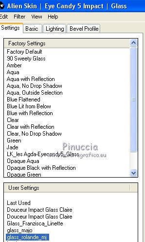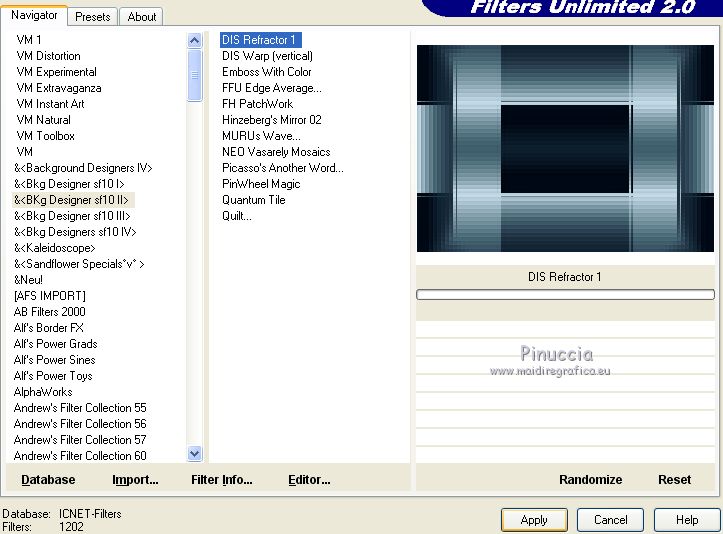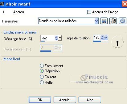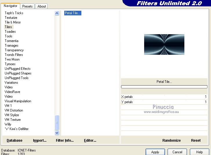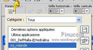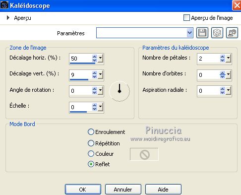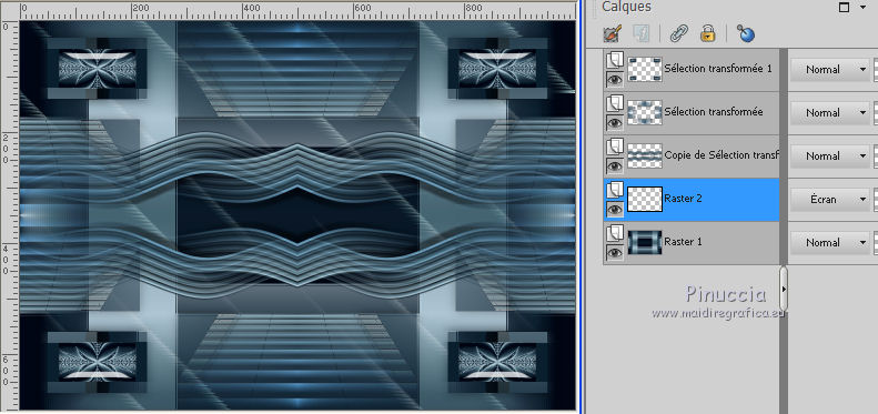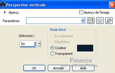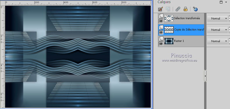 Pour traduire ce tutoriel j'ai utilisé CorelX17, mais il peut également être exécuté avec les autres versions. Suivant la version utilisée, vous pouvez obtenir des résultats différents. Depuis la version X4, la fonction Image>Miroir a été remplacée par Image>Renverser horizontalement, et Image>Renverser avec Image>Renverser verticalement . Dans les versions X5 et X6, les fonctions ont été améliorées par la mise à disposition du menu Objets. Avec la nouvelle version X7, nous avons encore Image>Miroir et Image>Renverser/Retourner, mais avec nouvelles différences. Voir les détails à ce sujet ici Certaines dénominations ont changées entre les versions de PSP. Les plus frequentes dénominations utilisées: ![]() Vos versions iciNécessaire pour réaliser ce tutoriel: Matériel ici Merci pour les tubes Colybrix. Le reste du matériel est de Maria José. (ici les liens vers les sites des créateurs de tubes) Modules Externes: consulter, si nécessaire, ma section des filtres ici Filters Unlimited 2.0 ici &<Bkg Designer sf10II> - DIS Refractor 1 (à importer dans Unlimited) ici Mehdi - Sorting Tiles ici Graphics Plus - Vertical Mirror ici Toadies What are you ici Tilers - Petal Tile ici VanDerLee - Unplugged-X ici Carolaine and Sensibility - CS-Linear-H ici Simple - Top Left Mirror ici Alien Skin Eye Candy 5 Impact - Glass ici Filtres Simple, Toadies et Graphics Plus peuvent être utilisés seuls ou importés dans Filters Unlimited. voir comment le faire ici). Si un filtre est fourni avec cette icône, ![]() en fonction des couleurs utilisées, vous pouvez changer le mode mélange et l'opacité des calques. Placer le preset En cliquant sur le preset une ou deux fois (selon vos réglages) automatiquement il se placera directement dans le dossier Settings de Alien Skin Eye Candy. pourquoi un ou deux clic voir ici Placer les presets MeshWarping_mj_rolande et Pick_rolande_mj dans le dossier Paramètres par défaut. Placer le dégradé dans le dossier Dégradés. Placer les sélections dans le dossier Sélections Choisir deux couleurs du graphique Placer en avant plan la couleur claire, pour moi#89a5b1, et en arrière plan la couleur foncée, pour moi #0c1f2e. ![]() Placer en avant plan le dégradé et sélectionner le dégradé ES Emerald Dragon 30, style Linéaire. ![]() 1. Ouvrir une nouvelle image transparente 1000 x 700 pixels. Remplir l'image transparente du dégradé.Colorisez à votre goût: Réglage>Teinte et Saturation>Coloriser 2. Effets>Modules Externes>Mehdi - Sorting Tiles. ![]() 3. Effets>Effets de réflexion>Miroir rotatif. ![]() 4. Effets>Modules Externes>Graphics Plus - Vertical Mirror. ![]() 5. Effets>Effets de distorsion>Bombage. ![]() 6. Effets>Modules Externes>Filters Unlimited 2.0 - &<Bkg Designer sf10II> - DIS Refractor 1. ![]() 7. Effets>Modules Externes>Toadies - What are you. ![]() 8. Sélections>Charger/Enregistrer une sélection>Charger à partir du disque. Chercher et charger la sélection rolande_mj. ![]() Sélections>Transformer la sélection en calque. 9. Effets>Modules Externes>VanDerLee Unplugged-X - Jalusi Blind color: couleur d'avant plan (foreground) ![]() Effets>Effets de réflexion>Miroir rotatif. ![]() Garder sélectionné. ![]() 10. Effets>Effets géométriques>Perspective Verticale, couleur d'arrière plan #0c1f2e. ![]() Sélections>Désélectionner tout. 11. Sélections>Charger/Enregistrer une sélection>Charger à partir du disque. Chercher et charger la sélection rolande_1_mj. ![]() 12. Effets>Modules Externes>Carolaine and Sensibility - CS-Linear-H ![]() 13. Effets>Effets de bords>Accentuer. Effets>Effets 3D>Ombre portée, couleur noire. ![]() Sélections>Désélectionner tout. 14. Effets>Effets d'image>Mosaïque sans jointures. ![]() 15. Calques>Dupliquer. Image>Renverser. Calques>Fusionner>Fusionner le calque de dessous. Calques>Dupliquer. 16. Effets>Effets de réflexion>Miroir rotatif. ![]() 17. Effets>Effets de réflexion>Kaléïdoscope. ![]() Édition>Répéter Kaléïdoscope. 18. Sélections>Charger/Enregistrer une sélection>Charger à partir du disque. Chercher et charger la sélection rolande_2_mj. ![]() Presser CANC sur le clavier ![]() Sélections>Désélectionner. 19. Activer l'outil Grille déformante ![]() Chercher et sélectionner le preset mj_rolande ![]() Cliquer sur la coche pour terminer l'application de l'outil.![]() 20. Effets>Effets d'image>Mosaïque sans jointures. ![]() 21. Activer l'outil Sélecteur ![]() chercher et sélectionner le preset rolande_mj. ![]() Résultat ![]() Touche M pour désélectionner l'outil. 22. Effets>Effets de réflexion>Miroir rotatif. ![]() 23. Réglage>Netteté>Davantage de netteté. Effets>Effets 3D>Ombre portée, par défaut ![]() 24. Effets>Modules Externes>Simple - Top Left Mirror. ![]() Calques>Agencer>Déplacer vers le bas. ![]() 25. Vous positionner sur le calque du bas de la pile, Raster 1. Sélections>Charger/Enregistrer une sélection>Charger à partir du disque. Chercher et charger la sélection rolande_3_mj. ![]() Sélections>Transformer la sélection en calque. Calques>Agencer>Placer en haut de la pile. Effets>Effets 3D>Ombre portée, couleur noire. ![]() 26. Sélections>Modifier>Contracter - 20 pixels. Presser CANC sur le clavier ![]() Sélections>Désélectionner tout. 27. Effets>Modules Externes>Carolaine and Sensibility - CS-Linear-H. ![]() 28. Sélections>Charger/Enregistrer une sélection>Charger à partir du disque. Chercher et charger la sélection rolande_4_mj. ![]() 29. Calques>Nouveau calque raster. Remplir la sélection du dégradé.30. Effets>Modules Externes>Filters Unlimited 2.0 - Tilers - Petal Tile, par défaut ![]() Répéter l'Effet une deuxième fois. ![]() 31. Effets>Modules Externes>Alien Skin Eye Candy5 Impact - Glass. Sélectionner le preset glass_rolande et ok. ![]() Calques>Fusionner>Fusionner le calque de dessous. Sélections>Désélectionner tout. 32. Calques>Dupliquer. Image>Miroir. Calques>Fusionner>Fusionner le calque de dessous. 33. Calq
