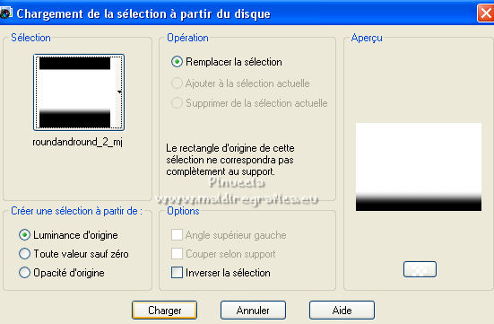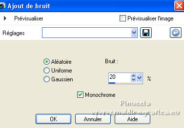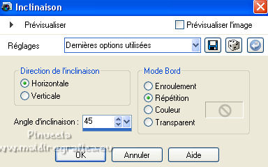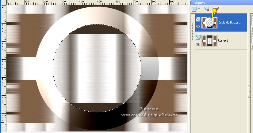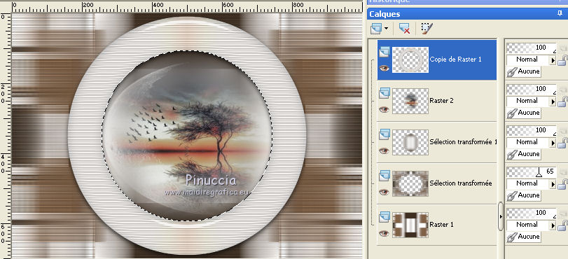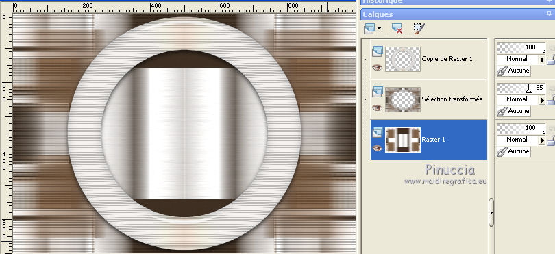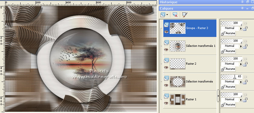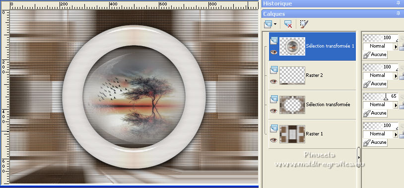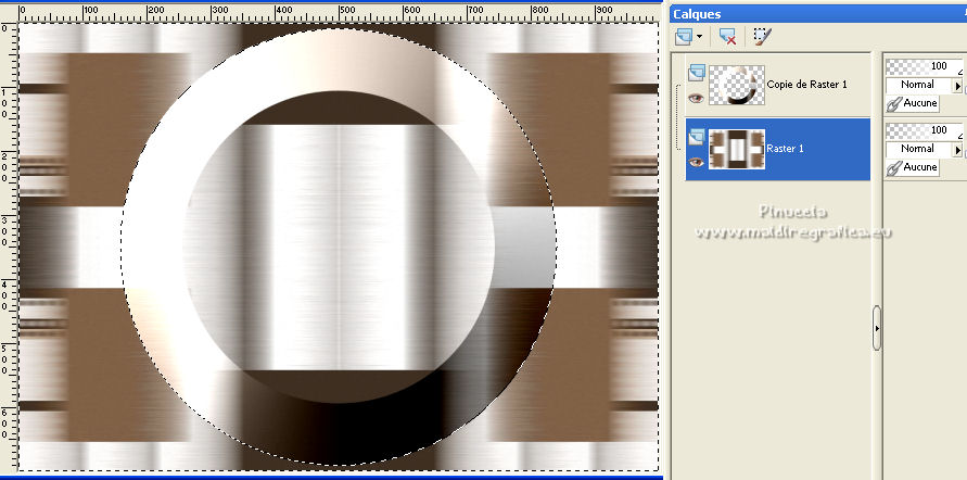 Pour traduire ce tutoriel j'ai utilisé PSPX7, PSPX2 et PSPX3, mais il peut également être exécuté avec les autres versions. Suivant la version utilisée, vous pouvez obtenir des résultats différents. Depuis la version X4, la fonction Image>Miroir a été remplacée par Image>Renverser horizontalement, et Image>Renverser avec Image>Renverser verticalement . Dans les versions X5 et X6, les fonctions ont été améliorées par la mise à disposition du menu Objets. Avec la nouvelle version X7, nous avons encore Image>Miroir et Image>Renverser/Retourner, mais avec nouvelles différences. Voir les détails à ce sujet ici Certaines dénominations ont changées entre les versions de PSP. Les plus frequentes dénominations utilisées: ![]() English translation here Vos versions ici![]() Nécessaire pour réaliser ce tutoriel: Matériel ici Pour les tubes merci Renée. Le reste du matériel est de Maria José. (ici les liens vers les sites des créateurs du matériel) Modules Externes: consulter, si nécessaire, ma section des filtres ici Filters Unlimited 2.0 ici Neology - Vasarely Mosaics ici Graphics Plus - Vertical Mirror ici Unplugged Tools - Round Button ici Toadies - Weaver ici Kohan's Filters - Autointerlace ici Alien Skin Eye Candy 5 Impact - Glass ici Simple - Top Left Mirror ici Mura's Meister - Perspective Tiling ici Mura's Seamless - Emboss at Alpha ici RCS Filter Pak 1.0 - RCS Coppertooling Simulator ici L&K's - L&K's Zitah ici L&K's - L&K's Adonis ici Filtres Neology, Simple, Graphics Plus, Unplugged Tools, Toadies, Kohan, Mura's Seamless et RCS Filter Pak peuvent être utilisés seuls ou importés dans Filters Unlimited. voir comment le faire ici). Si un filtre est fourni avec cette icône, ![]() en fonction des couleurs utilisées, vous pouvez changer le mode mélange et l'opacité des calques. Placer le preset En cliquant sur le preset une ou deux fois (selon vos réglages) automatiquement il se placera directement dans le dossier Settings de Alien Skin Eye Candy. pourquoi un ou deux clic voir ici Placer les sélections dans le dossier Sélections Ouvrir le masque dans PSP et le minimiser avec le reste du matériel. 1. Placer en avant plan la couleur #b9a38d, et en arrière plan la couleur #403124. ![]() 2. Ouvrir une nouvelle image transparente 1000 x 700 pixels. 3. Sélections>Sélectionner tout. Ouvrir le masque maskcarey1_camerontags et Édition>Copier. Revenir sur votre travail et Édition>Coller dans la sélection. Sélections>Désélectionner tout. 4. Coloriser l'image à votre goût; pour moi: Réglage>Teinte et Saturation>Teinte/Saturation/Luminosité ![]() 5. Effets>Modules Externes>Neology - Vasarely Mosaics ![]() 6. Effets>Effets de réflexion>Miroir rotatif. ![]() 7. Effets>Modules Externes>Graphics Plus - Vertical Mirror, par défaut ![]() 8. Réglage>Ajouter/Supprimer du bruit>Ajouter du bruit ![]() 9. Effets>Effets de distorsion>Vent - vers la droite, intensité 100 ![]() 10. Effets>Effets de réflexion>Miroir rotatif, par défaut. ![]() Calques>Dupliquer. 11. Effets>Modules Externes>Unplugged Tools - Round Botton ![]() 12. Sélections>Charger/Enregistrer une sélection>Charger à partir du disque. Chercher et charger la sélection roundandround_mj ![]() Presser CANC sur le clavier ![]() Vous ne verrez rien, mais c'est normal ![]() Sélections>Désélectionner tout. 13. Sélections>Charger/Enregistrer une sélection>Charger à partir du disque. Chercher et charger la sélection roundandround_1_mj ![]() Sélections>Inverser. Presser CANC sur le clavier. Garder sélectionné. 14. Vous positionner sur le calque Raster 1. ![]() Sélections>Transformer la sélection en calque. Sélections>Désélectionner tout. 15. Rester sur ce calque (Sélection transformée). Effets>Modules Externes>Toadies - Weaver, par défaut. ![]() 16. Effets>Modules Externes>Kohan's Filters - Autointerlace 1.0 ![]() 17. Effets>Modules Externes>Simple - Top Left Mirror ![]() 18. Réglage>Netteté>Davantage de netteté. Réduire l'opacité de ce calque à 65%. 19. Vous positionner sur le calque du haut de la pile, Copie de Raster 1. Effets>Modules Externes>Simple - Top Left Mirror. ![]() 20. Effets>Modules Externes>Kohan's Filters - Autointerlace 1.0, comme précédemment. ![]() 21. Effets>Modules Externes>Eye Candy 5 - Impact - Glass sélectionner le preset majo_glass Basic: Glass Color - couleur claire d'avant plan #b9a38d. ![]() 22. Vous positionner sur le calque Raster 1. ![]() Sélections>Charger/Enregistrer une sélection>Charger à partir du disque Chercher et charger à nouveau la sélection roundandround_mj ![]() Sélections>Transformer la sélection en calque. Calques>Agencer>Déplacer vers le haut. 23. Réglage>Flou>Flou gaussien - rayon 35. ![]() 24. Calques>Nouveau calque raster. Ouvrir le misted et Édition>Copier. Revenir sur votre travail et Édition>Coller dans la sélection. 25. Vous positionner sur le calque Copie de Raster 1. ![]() Calques>Fusionner>Fusionner le calque de dessous - 2 fois. Sélections>Désélectionner tout. 26. Image>Redimensionner, à 85%, redimensionner tous les calques décoché. Effets>Effets 3D>Ombre portée, couleur noire. ![]() 27. Vous positionner à nouveau sur le calque Raster 1. Effets>Modules Externes>L&K's - L&K's Zitah ![]() 28. Effets>Modules Externes>L&K's - L&K's Adonis ![]() 29. Effets>Modules Externes>Kohan's Filter - Autointerlace 1.0, comme précédemment. ![]() 30. Réglage>Netteté>Davantage de netteté. Fermer le calque du haut de la pile (Sélection transformée 1). 31. Édition>Copie Spéciale>Copier avec fusion. Édition>Coller comme nouveau calque. Calques>Agencer>Déplacer vers le haut. 32. Effets>Modules Externes>MuRa's Meister - Perspective Tiling ![]() 33. Effets>Effets géométriques>Inclinaison. ![]() 34. Sélections>Charger/Enregistrer une sélection>Charger à partir du disque Chercher et charger à nouveau la sélection roundandround_2_mj ![]() Presser +/- 15 fois CANC sur le clavier. Sélections>Désélectionner t