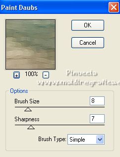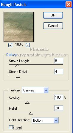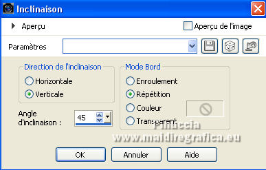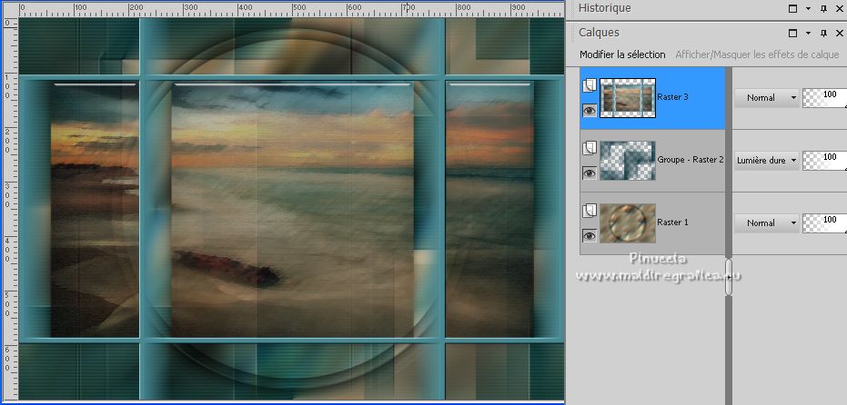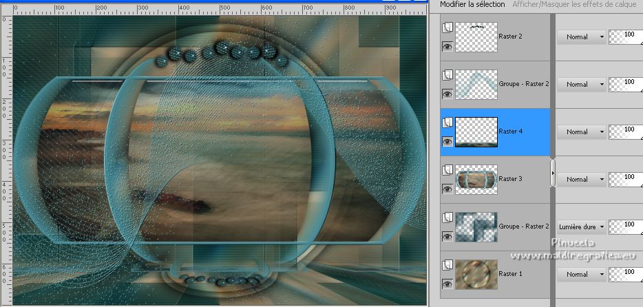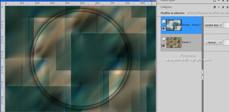 Pour traduire ce tutoriel j'ai utilisé PSPX7, PSPX2 et PSPX3, mais il peut également être exécuté avec les autres versions. Suivant la version utilisée, vous pouvez obtenir des résultats différents. Depuis la version X4, la fonction Image>Miroir a été remplacée par Image>Renverser horizontalement, et Image>Renverser avec Image>Renverser verticalement . Dans les versions X5 et X6, les fonctions ont été améliorées par la mise à disposition du menu Objets. Avec la nouvelle version X7, nous avons encore Image>Miroir et Image>Renverser/Retourner, mais avec nouvelles différences. Voir les détails à ce sujet ici Certaines dénominations ont changées entre les versions de PSP. Les plus frequentes dénominations utilisées: ![]() English translation here Vos versions ici![]() Nécessaire pour réaliser ce tutoriel: Matériel ici Merci pour le tube Nena Silva. Le reste du matériel est de Maria José. (ici les liens vers les sites des créateurs du matériel) Modules Externes: consulter, si nécessaire, ma section des filtres ici Filters Unlimited 2.0 ici Italian Editors Effects - Picture in Picture ici Carolaine and Sensibility - CS-HLines ici Mura's Meister - Perspective Tiling ici Filter Factory Gallery D - Dimensia ici Mura's Seamless - Emboss at Alpha ici Artistiques - Pastels, Barbouillage ici Alien Skin Eye Candy 5 Impact - Glass ici Flaming Pear - Flexify 2 ici Filtres Italian Editors, Factory Gallery et Mura's Seamless peuvent être utilisés seuls ou importés dans Filters Unlimited. voir comment le faire ici). Si un filtre est fourni avec cette icône, ![]() en fonction des couleurs utilisées, vous pouvez changer le mode mélange et l'opacité des calques. Placer le preset En cliquant sur le preset une ou deux fois (selon vos réglages) automatiquement il se placera directement dans le dossier Settings de Alien Skin Eye Candy. pourquoi un ou deux clic voir ici Placer les sélections dans le dossier Sélections. Ouvrir les masques dans PSP et les minimiser avec le reste du matériel. 1. Placer en avant plan la couleur #4a8992, et en arrière plan la couleur #133942. ![]() 2. Ouvrir une nouvelle image transparente 1000 x 700 pixels. Sélections>Sélectionner tout. Ouvrir l'image grafico-2404634 et Édition>Copier. Revenir sur votre travail et Édition>Coller dans la sélection. Sélections>Désélectionner tout. 3. Effets>Effets d'image>Mosaïque sans jointures. ![]() 4. Réglage>Flou>Flou gaussien - rayon 25. ![]() 5. Effets>Effets géométriques>Inclinaision. ![]() 6. Effets>Effets d'image>Mosaïque sans jointures, comme précédemment. ![]() 7. Effets>Modules Externes>Italian Editors Effects - Picture in picture. ![]() 8. Sélections>Charger/Enregistrer une sélection>Charger à partir du disque. Chercher et charger la sélection mariajose15 ![]() Sélections>Inverser. 9. Effets>Modules Externes>Filter Factory Gallery D - Dimensia. ![]() 10. Réglage>Netteté>Davantage de netteté. 11. Sélections>Inverser. Effets>Effets 3D>Ombre portée, couleur noire. ![]() Sélections>Modifier>Contracter - 20 pixels. Effets>Effets 3D>Ombre portée, comme précédemment. Sélections>Désélectionner tout. 12. Calques>Nouveau calque raster. Remplir le calque avec la couleur foncée d'arrière plan #133942.13. Calques>Nouveau calque de masque>A partir d'une image. Ouvrir le menu deroulant sous la fenêtre d'origine et vous verrez la liste des images ouvertes. Sélectionner le masque 98_mask_MJ. ![]() Calques>Fusionner>Fusionner le groupe. 14. Effets>Modules Externes>Carolaine and Sensibility - CS-HLines. ![]() 15. Effets>Modules Externes>Mura's Seamless - Emboss at Alpha, par défaut. ![]() 16. Effets>Effets d'image>Mosaïque sans jointures, comme précédemment. ![]() Placer le calque en mode Lumière dure. ![]() 17. Ouvrir le tube decoazul_MJ ![]() Édition>Copier. Revenir sur votre travail et Édition>Coller comme nouveau calque. (coloriser en fonction de vos couleurs). 18. Activer à nouveau le graphique grafico-2404634 et travailler sur cette image. Effets>Modules Externes>Artistique - Barbouillage, par défaut si vous utilisez la version anglaise du filtre (le résultat ne change pas) Effets>Modules Externes>Artistic - Paint Daubs, par défaut. ![]() 19. Effets>Modules Externes>Artistiques - Pastels, par défaut si vous utilisez la version anglaise: Effets>Modules Externes>Artistic - Rough Pastels ![]() 20. Édition>Copier. Revenir sur votre travail. 21. Sélections>Charger/Enregistrer une sélection>Charger à partir du disque. Chercher et charger la sélection mariajose15a ![]() 22. Calques>Nouveau calque raster. Édition>Coller dans la sélection. Réduire l'opacité de ce calque +/-81% (si nécessaire). 23. Effets>Modules Externes>Alien Skin Eye Candy 5 Impact - Glass. Sélectionner le preset glass_helank_mj et ok. ![]() Ci-dessous les règlages, en cas de problèmes avec le preset ![]() 24. Calques>Agencer>Déplacer vers le bas. 25. Vous positionner sur le calque du haut, Raster 2. Calques>Fusionner>Fusionner le calque de dessous. Sélections>Désélectionner tout. ![]() 26. Effets>Modules Externes>Flaming Pear - Flexify 2. ![]() le preset Eckert IV est un nouveau preset et se trouve dans la nouvelle version de Flexify ici Si vous avez de problèmes, j'ai ajouté dans le matériel le calque après l'application du preset. ![]() 27. Calques>Nouveau calque raster. Remplir le calque avec la couleur claire d'avant plan #4a8992.28. Calques>Nouveau calque de masque>A partir d'une image. Ouvrir le menu deroulant sous la fenêtre d'origine et sélectionner le masque 151_mask_MJ. ![]() Calques>Fusionner>Fusionner le groupe. 29. Effets>Modules Externes>Mura's Seamless - Emboss at Alpha, par défaut. ![]() 30. Ouvrir decotopazul_mj ![]() Édition>Copier. Revenir sur votre travail et Édition>Coller comme nouveau calque. Déplacer le tube en haut![]() 31. Édition>Copie Spéciale>Copier avec fusion. Édition>Coller comme nouveau calque. Image>Retourner>Renverser verticalement dans l