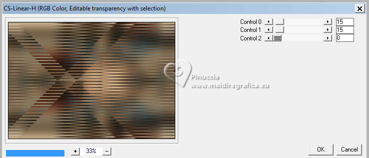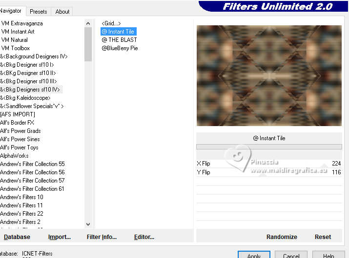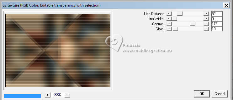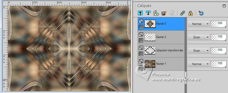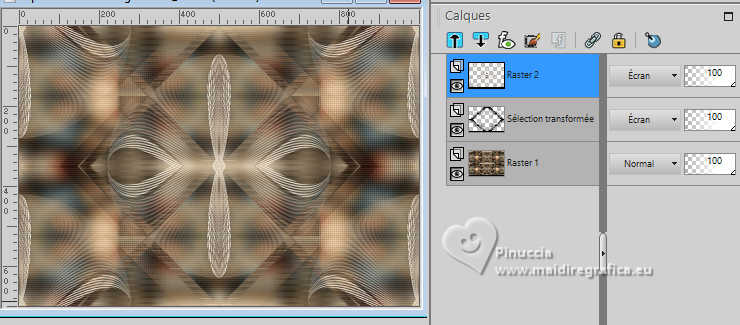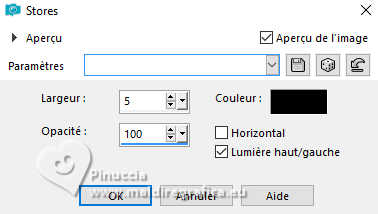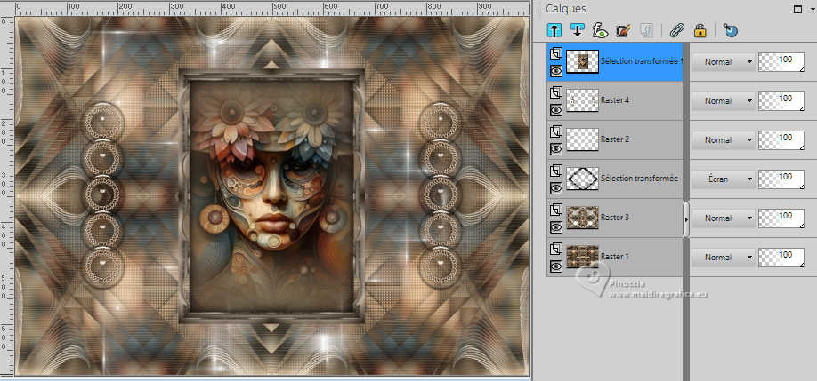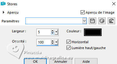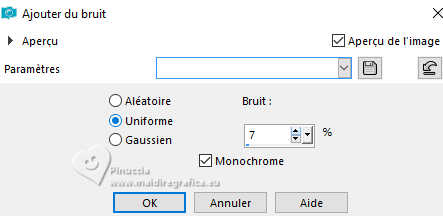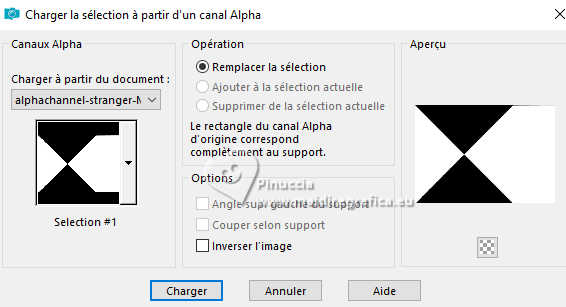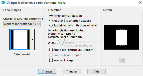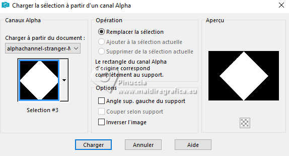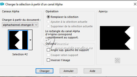 Pour traduire ce tutoriel j'ai utilisé PSPX9 et PSP2020, mais il peut également être exécuté avec les autres versions. Suivant la version utilisée, vous pouvez obtenir des résultats différents. Depuis la version X4, la fonction Image>Miroir a été remplacée par Image>Renverser horizontalement, et Image>Renverser avec Image>Renverser verticalement . Dans les versions X5 et X6, les fonctions ont été améliorées par la mise à disposition du menu Objets. Avec la nouvelle version X7, nous avons encore Image>Miroir et Image>Renverser/Retourner, mais avec nouvelles différences. Voir les détails à ce sujet ici Certaines dénominations ont changées entre les versions de PSP. Les plus frequentes dénominations utilisées: ![]() English translation here Vos versions ici![]() Nécessaire pour réaliser ce tutoriel: ![]() Matériel de Maria José. (ici les liens vers les sites des créateurs du matériel) ![]() consulter, si nécessaire, ma section des filtres ici Filters Unlimited 2.0 ici &<Bkg Designers sf10IV> - @Instant Tile (à importer dans Unlimited) ici Simple - Pizza Slice Mirror ici Carolaine and Sensibility - CS-Texture, CS-Linear-H ici Filtres Simple peuvent être utilisés seuls ou importés dans Filters Unlimited. voir comment le faire ici. Si un filtre est fourni avec cette icône, ![]() en fonction des couleurs utilisées, vous pouvez changer le mode mélange et l'opacité des calques. ![]() 1. Ouvrir alphachannel-stranger-MJ Fenêtre>Dupliquer ou sur le clavier shift+D pour faire une copie. ![]() 2. Fermer l'original. La copie, qui sera la base de votre travail, n'est pas vide, mais contient les sélections enregistrées sur le canal alpha. Sélections>Sélectionner tout. 3. Ouvrir l'image gráfico-MJ ![]() Édition>Copier. Revenir sur votre travail et Édition>Coller dans la sélection. Sélections>Désélectionner tout. 4. Effets>Effets d'image>Mosaïque sans jointures, par défaut. ![]() 5. Réglage>Flou>Flou gaussien - rayon 30. ![]() 6. Effets>Modules Externes>Simple - Pizza Slice Mirror. Cet effet travaille sans fenêtre; résultat ![]() 7. Sélections>Charger/Enregistrer une sélection>Charger à partir d'un canal alpha. La sélection Selection #1 est déjà disponible. On doit seulement cliquer sur Charger. ![]() 8. Effets>Modules Externes>Carolaine and Sensibility - CS-Texture, par défaut. ![]() Sélections>Inverser. 9. Effets>Modules Externes>Carolaine and Sensibility - CS-Linear-H ![]() Sélections>Désélectionner tout. 10. Effets>Modules Externes>Filters Unlimited 2.0 - &<Bkg Designers sf10IV> - @Instant Tile, par défaut. ![]() 11. Sélections>Charger/Enregistrer une sélection>Charger à partir d'un canal alpha. Ouvrir le menu des sélections et charger la sélection Selection #2 ![]() Sélections>Transformer la sélection en calque. 12. Effets>Effets de textures>Stores, couleur noire ![]() Répéter Effets>Effets de textures>Stores, cette fois Horizontal décoché. ![]() Sélections>Désélectionner tout. 13. Effets>Effets 3D>Ombre portée, couleur noire. ![]() 14. Effets>Effets de réflexion>Miroir rotatif, par défaut. ![]() 15. Effets>Effets d'image>Mosaïque sans jointures, par défaut. ![]() 16. Réglage>Netteté>Davantage de netteté. Placer le calque en mode Écran. 17. Ouvrir deco-1-MJ ![]() Édition>Copier. Revenir sur votre travail et Édition>Coller comme nouveau calque. 18. Réglage>Netteté>Netteté. Placer ce calque en mode Écran. ![]() 19. Édition>Copie Spéciale>Copier avec fusion. 20. Sélections>Charger/Enregistrer une sélection>Charger à partir d'un canal alpha. Ouvrir le menu des sélections et charger la sélection Selection #3 ![]() 21. Calques>Nouveau calque raster. Édition>Coller dans la sélection. Effets>Effets 3D>Ombre portée, comme précédemment. ![]() 22. Sélections>Modifier>Contracter - 30 pixels. Édition>Coller dans la sélection. Effets>Effets 3D>Ombre portée, comme précédemment. ![]() 23. Encore une fois Sélections>Modifier>Contracter - 30 pixels. Édition>Coller dans la sélection. Effets>Effets 3D>Ombre portée, comme précédemment. ![]() La tag et les calques ![]() Sélections>Désélectionner tout. 24. Effets>Effets d'image>Mosaïque sans jointures, Horizontal coché. ![]() 25. Effets>Effets d'image>Mosaïque sans jointures, par défaut. ![]() 26. Calques>Agencer>Déplacer vers le bas - 2 fois. Supprimer le calque Raster 2. ![]() ![]() 27. Ouvrir deco-transp-MJ ![]() Édition>Copier. Revenir sur votre travail et Édition>Coller comme nouveau calque. 28. Ouvrir new-deco-tuto-MJ ![]() Édition>Copier. Revenir sur votre travail et Édition>Coller comme nouveau calque. 29. Ouvrir cadre-tuto-MJ ![]() Édition>Copier. Revenir sur votre travail et Édition>Coller comme nouveau calque. Vous positionner sur le calque Raster 1. 30. Sélections>Charger/Enregistrer une sélection>Charger à partir d'un canal alpha. Ouvrir le menu des sélections et charger la sélection Selection #4 ![]() Sélections>Transformer la sélection en calque. Calques>Agencer>Placer en haut de la pile. 31. Réglage>Flou>Flou gaussien - rayon 30. ![]() 32. Réglage>Ajouter/Supprimer du bruit>Ajouter du bruit. ![]() 33. Ouvrir le misted misted-original ![]() Édition>Copier. Revenir sur votre travail et Édition>Coller comme nouveau calque. Sélections>Inverser. Presser CANC sur le clavier ![]() Sélections>Inverser. 34. Calques>Nouveau calque raster. Effets>Effets 3D>Découpe. ![]() ![]() Sélections>Désélectionner tout. 35. Calques>Fusionner>Fusionner le calque de dessous - 2 fois Calques>Agencer>Déplacer vers le bas. 36. Vous positionner sur le calque du haut de la pile (le cadre). ![]() Calques>Fusionner>Fusionner le calque de dessous. ![]() 37. Calques>Fusionner>Calques visibles. Sélections>Sélectionner tout. Édition>Copier 38. Image>Ajouter des bordures, 53 pixels, symétrique, couleur blanche. 39. Sélections>Inverser. Édition>Coller dans la sélection - l'image de l'étape 37. 40. Réglage>Flou>Flou gaussien - rayon 30. !