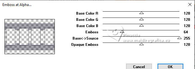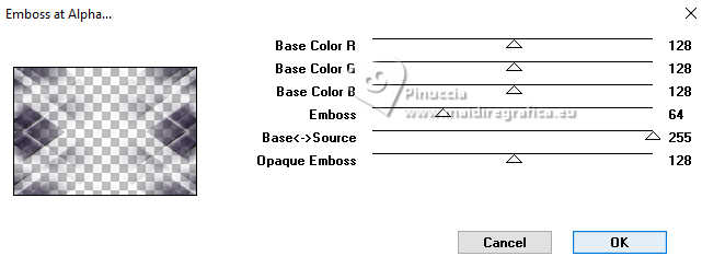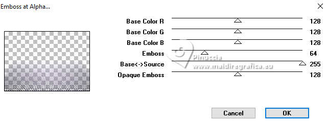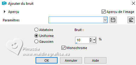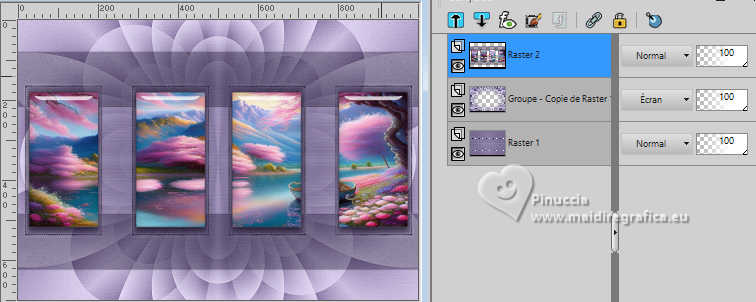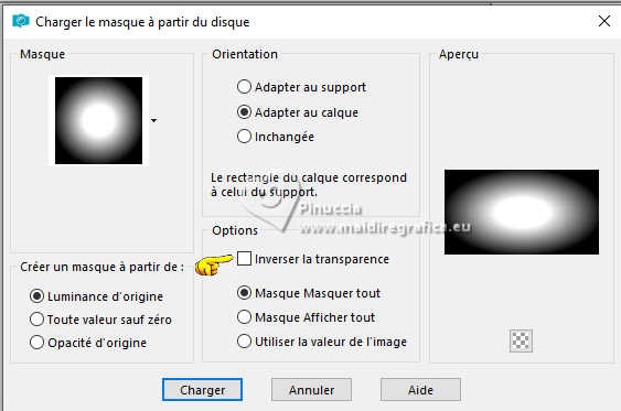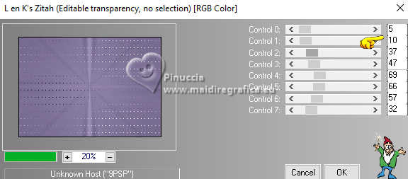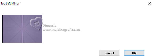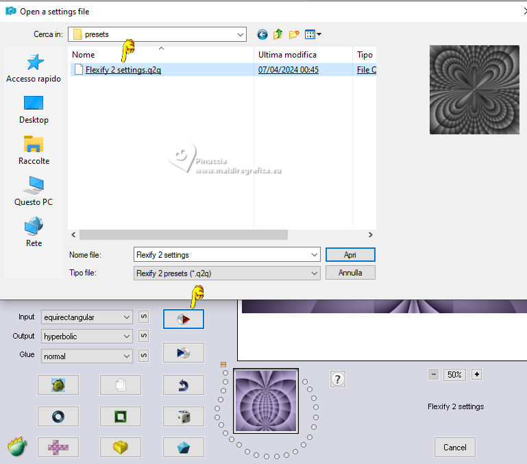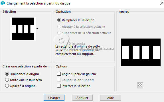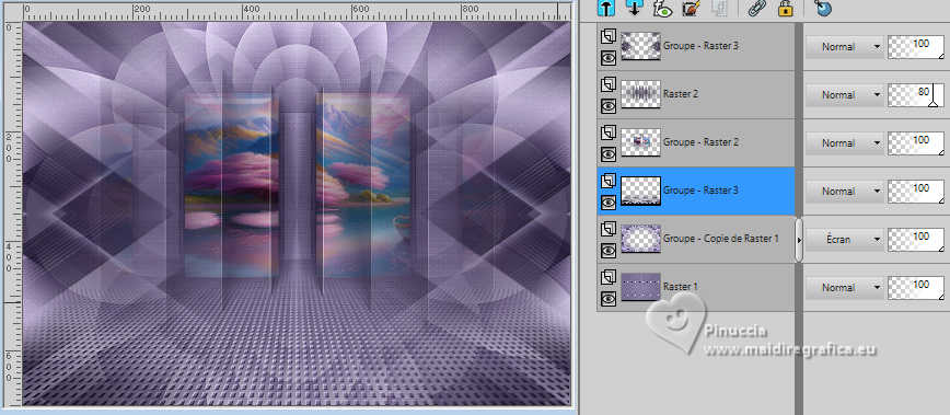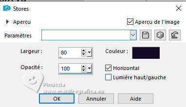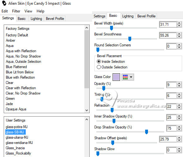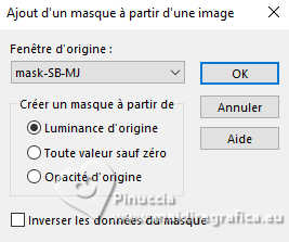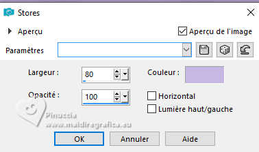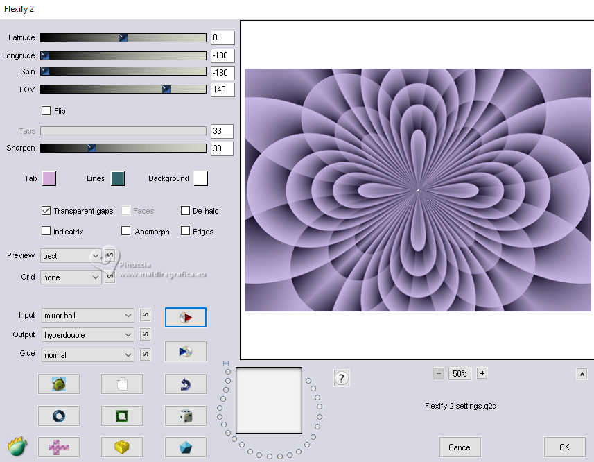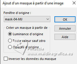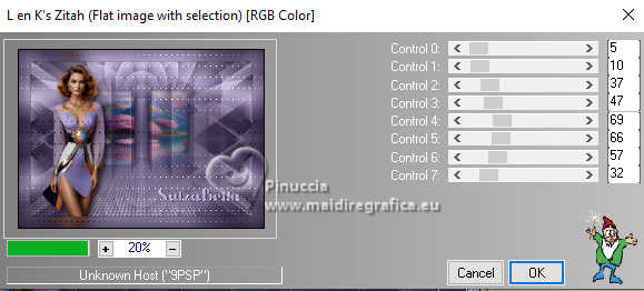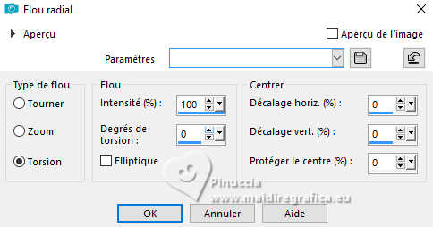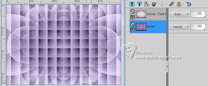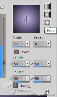 Pour traduire ce tutoriel j'ai utilisé PSPX9 et PSP2020, mais il peut également être exécuté avec les autres versions. Suivant la version utilisée, vous pouvez obtenir des résultats différents. Depuis la version X4, la fonction Image>Miroir a été remplacée par Image>Renverser horizontalement, et Image>Renverser avec Image>Renverser verticalement . Dans les versions X5 et X6, les fonctions ont été améliorées par la mise à disposition du menu Objets. Avec la nouvelle version X7, nous avons encore Image>Miroir et Image>Renverser/Retourner, mais avec nouvelles différences. Voir les détails à ce sujet ici Certaines dénominations ont changées entre les versions de PSP. Les plus frequentes dénominations utilisées: ![]() English translation here Vos versions ici![]() Nécessaire pour réaliser ce tutoriel: ![]() Pour un masque merci Noisette; le reste du matériel est de Maria José. (ici les liens vers les sites des créateurs du matériel) ![]() consulter, si nécessaire, ma section des filtres ici Filters Unlimited 2.0 ici Flaming Pear - Flexify 2 ici Simple - Top Left Mirror ici Mura's Seamless - Emboss at Alpha ici L&K's - L&K's Zitah ici Alien Skin Eye Candy 5 Impact - Glass ici Filtres Simple et Mura's Seamless peuvent être utilisés seuls ou importés dans Filters Unlimited. voir comment le faire ici). Si un filtre est fourni avec cette icône, ![]() en fonction des couleurs utilisées, vous pouvez changer le mode mélange et l'opacité des calques. Dans les plus récentes versions de PSP, vous ne trouvez pas le dégradé d'avant plan/arriére plan ou Corel_06_029. Vous pouvez utiliser le dégradé des versions antérieures. Ici le dossier Dégradés de CorelX. Placer le preset En cliquant sur le preset une ou deux fois (selon vos réglages) automatiquement il se placera directement dans le dossier Settings de Alien Skin Eye Candy. pourquoi un ou deux clic voir ici Placer le preset pour Flexify dans un dossier de votre choix. Je le laisse habituellement dans le dossier du matériel. Vous l'importerez de ce dossier lorsque vous en aurez besoin. ![]() Placer la sélection dans le dossier Sélections. Placer le masque 20-20 dans le dossier Masques. Ouvrir les autres masques dans PSP et les minimiser avec le reste du matériel. Placer en avant plan la couleur #c6b7e5 et en arrière plan la couleur #180f29. ![]() Préparer en avant plan un dégradé de premier plan/arrière plan, style Halo. ![]() 1. Ouvrir une nouvelle image transparente 1000 x 700 pixels. Remplir l'image transparente du dégradé.2. Effets>Effets de textures>Stores - couleur foncée. ![]() 3. Répéter Effets>Effets de textures>Stores - couleur claire, horizontal décoché. ![]() 4. Effets>Effets de réflexion>Miroir rotatif, par défaut. ![]() Calques>Dupliquer. 5. Effets>Modules Externes>Flaming Pear - Flexify 2. Cliquer sur le bouton rouge, chercher et sélectionner le preset dans le dossier où vous l'avez copié. ![]() Ci-dessous les réglages, en cas de problèmes. ![]() 6. Calques>Charger/Enregistrer un masque>Charger à partir du disque. Chercher et charger le masque 20-20. ![]() Calques>Dupliquer. Calques>Fusionner>Fusionner le groupe. 7. Réglage>Ajouter/Supprimer du bruit>Ajouter du bruit. ![]() 8. Réglage>Netteté>Davantage de netteté. Placer le calque en mode Écran. 9. Vous positionner sur le calque Raster 1. ![]() Réglage>Flou>Flou radial. ![]() 10. Effets>Modules Externes>Simple - Top Left Mirror ![]() 11. Effets>Modules Externes>L&K's - L&K's Zitah. ![]() Réglage>Netteté>Davantage de netteté. 12. Calques>Nouveau calque raster. Calques>Agencer>Placer en haut de la pile. Remplir le calque avec la couleur foncée d'arrière plan.13. Calques>Nouveau calque de masque>A partir d'une image. Ouvrir le menu deroulant sous la fenêtre d'origine et vous verrez la liste des images ouvertes. Sélectionner le masque mask-04-MJ. ![]() Calques>Fusionner>Fusionner le groupe. 14. Effets>Modules Externes>Mura's Seamless - Emboss at alpha, par défaut. ![]() 15. Sélections>Charger/Enregistrer une sélection>Charger à partir du disque. Chercher et charger la sélection mask-MJ ![]() 16. Calques>Nouveau calque raster. Ouvrir l'image gráfico-Sb-MJ ![]() Édition>Copier. Revenir sur votre travail et Édition>Coller dans la sélection. 17. Effets>Modules Externes>Alien Skin Eye Candy 5 Impact - Glass. Sélectionner le preset glass-SB-MJ Glass Color: couleur claire d'avant plan ![]() 18. Calques>Agencer>Déplacer vers le bas. 19. Vous positionner sur le calque Groupe-Raster 2. Calques>Fusionner>Fusionner le calque de dessous. Sélections>Désélectionner tout. ![]() 20. Calques>Charger/Enregistrer un masque>Charger à partir du disque. Chercher et charger le masque 20-20. ![]() Calques>Dupliquer. Calques>Fusionner>Fusionner le groupe. 21. Touche K pour activer l'outil Sélecteur ![]() garder Position horiz.: 17,00 et placer Position vert.: 28,00. ![]() 22. Ouvrir deco-SB-1-MJ ![]() Édition>Copier. Revenir sur votre travail et Édition>Coller comme nouveau calque. 23. Garder Position horiz.: 0,00 et placer Position vert.: 28,00. ![]() Touche M pour désélectionner l'outil. Réduire l'opacité de ce calque +/-80%. 24. Calques>Nouveau calque raster. Remplir le calque avec la couleur foncée d'arrière plan.25. Calques>Nouveau calque de masque>A partir d'une image. Ouvrir le menu deroulant sous la fenêtre d'origine et sélectionner le masque mask-SB-MJ. ![]() Calques>Fusionner>Fusionner le groupe. 26. Effets>Modules Externes>Mura's Seamless - Emboss at Alpha, par défaut. ![]() 27. Calques>Nouveau calque raster. Remplir le calque du dégradé.28. Calques>Nouveau calque de masque>A partir d'une image. Ouvrir le menu deroulant sous la fenêtre d'origine et sélectionner le masque masque17-noisette. ![]() Calques>Fusionner>Fusionner le groupe. 29. Effets>Modules Externes>Mura's Seamless - Emboss at Alpha, par défaut. ![]() 30. Touche K pour activer l'outil Sélecteur ![]() Garder Position horiz.: 0,00 e