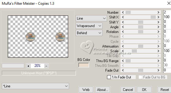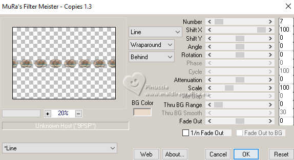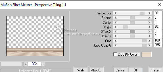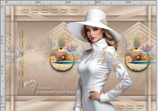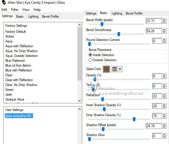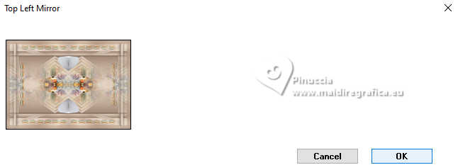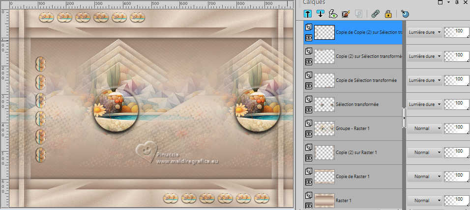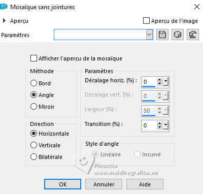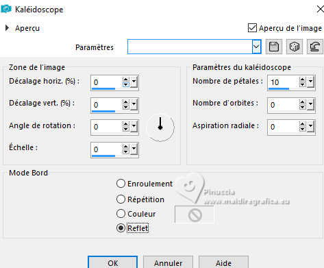 Pour traduire ce tutoriel j'ai utilisé PSPX9 et PSP2020, mais il peut également être exécuté avec les autres versions. Suivant la version utilisée, vous pouvez obtenir des résultats différents. Depuis la version X4, la fonction Image>Miroir a été remplacée par Image>Renverser horizontalement, et Image>Renverser avec Image>Renverser verticalement . Dans les versions X5 et X6, les fonctions ont été améliorées par la mise à disposition du menu Objets. Avec la nouvelle version X7, nous avons encore Image>Miroir et Image>Renverser/Retourner, mais avec nouvelles différences. Voir les détails à ce sujet ici Certaines dénominations ont changées entre les versions de PSP. Les plus frequentes dénominations utilisées: ![]() English translation here Vos versions ici![]() Nécessaire pour réaliser ce tutoriel: ![]() Pour le misted merci Kamil. Le reste du matériel est de Maria José. (ici les liens vers les sites des créateurs du matériel) ![]() consulter, si nécessaire, ma section des filtres ici Filters Unlimited 2.0 ici Mura's Meister - Perspective Tiling ici Mura's Meister - Copies ici Mura's Seamless - Emboss at Alpha ici Alien Skin Eye Candy 5 Impact - Glass ici Carolaine and Sensibility - CS-LDots ici Filtres Mura's Seamless peuvent être utilisés seuls ou importés dans Filters Unlimited. voir comment le faire ici. Si un filtre est fourni avec cette icône, ![]() en fonction des couleurs utilisées, vous pouvez changer le mode mélange et l'opacité des calques. Dans les plus récentes versions de PSP, vous ne trouvez pas le dégradé d'avant plan/arriére plan ou Corel_06_029. Vous pouvez utiliser le dégradé des versions antérieures. Ici le dossier Dégradés de CorelX. Placer le preset En cliquant sur le preset une ou deux fois (selon vos réglages) automatiquement il se placera directement dans le dossier Settings de Alien Skin Eye Candy. pourquoi un ou deux clic voir ici ![]() Placer les sélections dans le dossier Sélections. Ouvrir le masque dans PSP et le minimiser avec le reste du matériel. Placer en avant plan la couleur #795744 et en arrière plan la couleur #e9daca. ![]() Préparer en avant plan un dégradé de premier plan/arrière plan, style Linéaire. ![]() 1. Ouvrir une nouvelle image transparente 850 x 500 pixels. Remplir l'image transparente avec la couleur claire d'arrière plan.2. Sélections>Sélectionner tout. Ouvrir le misted misted-KamilTube-2432-BG ![]() Édition>Copier. Revenir sur votre travail et Édition>Coller dans la sélection. Sélections>Désélectionner tout. 3. Calques>Nouveau calque de masque>A partir d'une image. Ouvrir le menu deroulant sous la fenêtre d'origine et vous verrez la liste des images ouvertes. Sélectionner le masque mask-moi-21-MJ. ![]() Calques>Fusionner>Fusionner le groupe. 4. Effets>Modules Externes>Mura's Seamless - Emboss at Alpha, par défaut. ![]() 5. Image>Taille du support - 1000 x 700 pixels. ![]() 6. Calques>Nouveau calque raster. Calques>Agencer>Placer en bas de la pile. Remplir le calque du dégradé.7. Vous positionner sur le calque Groupe-Raster 1. Sélections>Charger/Enregistrer une sélection>Charger à partir du disque. Chercher et charger la sélection sympathie-MJ ![]() Effets>Effets 3D>Ombre portée, couleur noire. ![]() Garder sélectionné. Vous positionner sur le calque Raster 1. 8. Effets>Effets de réflexion>Kaléïdoscope. ![]() Sélections>Désélectionner tout. 9. Calques>Dupliquer. Effets>Modules Externes>Mura's Meister - Perspective Tiling. ![]() 10. Calques>Dupliquer. Image>Miroir>Miroir vertical. Calques>Fusionner>Fusionner le calque de dessous. 11. Sélections>Charger/Enregistrer une sélection>Charger à partir du disque. Chercher et charger la sélection sympathie-1-MJ ![]() Presser +/-10 fois CANC sur le clavier ![]() Sélections>Désélectionner tout. 12. Réglage>Ajouter/Supprimer du bruit>Ajouter du bruit. ![]() 13. Réglage>Netteté>Netteté. 14. Vous positionner sur le calque Groupe-Raster 1. Effets>Effets d'image>Mosaïque sans jointures. ![]() Réglage>Netteté>Netteté. 15. Sélections>Charger/Enregistrer une sélection>Charger à partir du disque. Chercher et charger la sélection sympathie-2-MJ ![]() Sélections>Transformer la sélection en calque. 16. Effets>Modules Externes>Alien Skin Eye Candy 5 Impact - Glass. Sélectionner le preset glass-sympathie-MJ si vous utilisez des autres couleurs, changez Glass Color avec votre couleur d'avant plan ![]() Placer le calque en mode Lumière dure. Sélections>Désélectionner tout. 17. Effets>Modules Externes>Mura's Meister - Copies. ![]() 18. Vous positionner sur le calque Copie de Raster 1. Calques>Dupliquer. Image>Rotation libre - 90 degrés à droite. ![]() 19. Effets>Effets de distorsion>Bombage - 3 fois. ![]() 20. Vous positionner sur le calque Raster 1. Sélections>Sélectionner tout. Vous positionner sur le calque Copie (2) de Raster 1. Image>Recadrer sur la sélection. 21. Effets>Modules Externes>Carolaine and Sensibility - CS-LDots. ![]() Réglage>Netetté>Netteté. 22. Effets>Effets 3D>Ombre portée, couleur noire. ![]() 23. Vous positionner sur le calque Sélection transformée. Calques>Dupliquer. Image>Redimensionner, à 50%, redimensionner tous les calques décoché. 24. Effets>Modules Externes>Mura's Meister - Copies. ![]() 25. Image>Redimensionner, à 45%, redimensionner tous les calques décoché. 26. Sélections>Charger/Enregistrer une sélection>Charger à partir du disque. Chercher et charger la sélection sympathie-3-MJ ![]() Presser CANC sur le clavier. Sélections>Désélectionner tout. 27. Touche K pour sur le clavier pour activer l'outil Sélecteur ![]() placer Position horiz.: 533,00 et Position vert.: 649,00. ![]() Placer le calque en mode Lumière dure. 28. Calques>Dupliquer. Position horiz.: 95,00 - Position vert.: 10,00. ![]() 29. Calques>Dupliquer. Image>Rotation libre - 90 degrés à droite. Placer Position horiz.: 90,00 - Position vert.: 158,00. ![]() Touche M pour désélectionner l'o