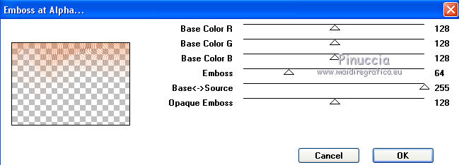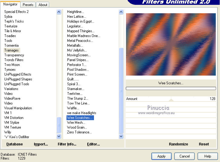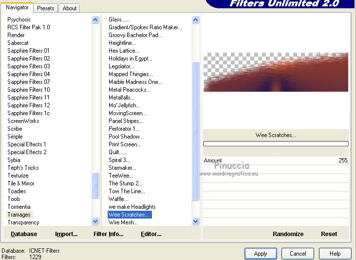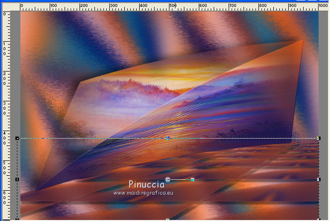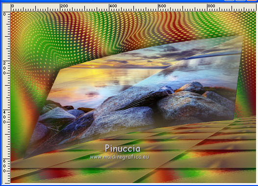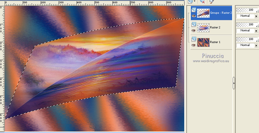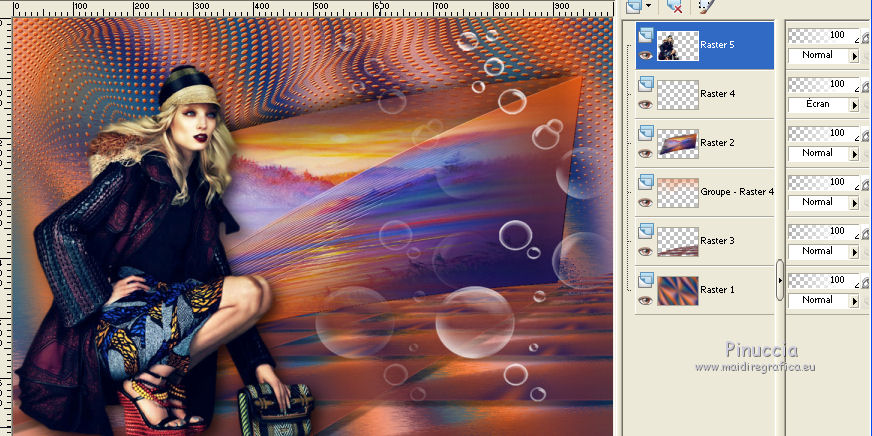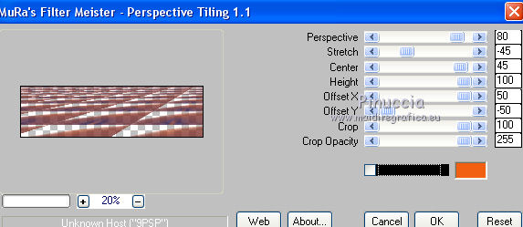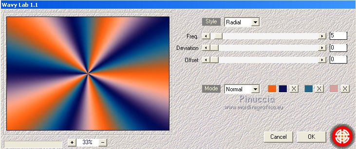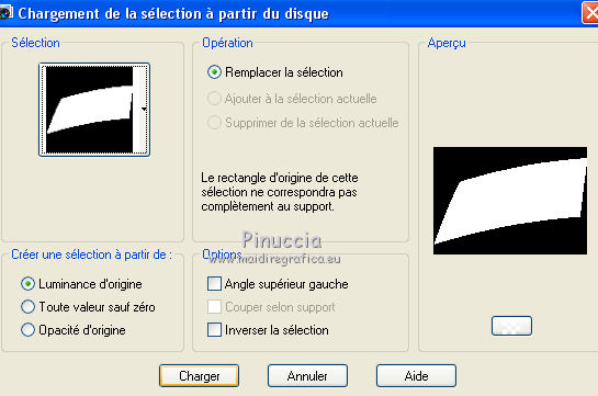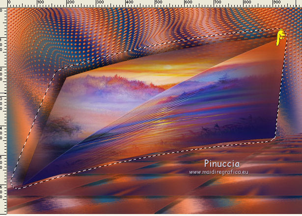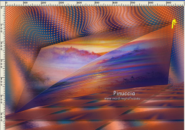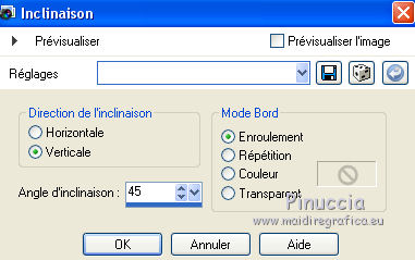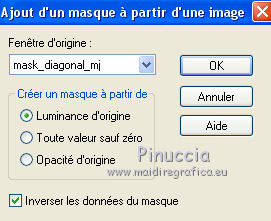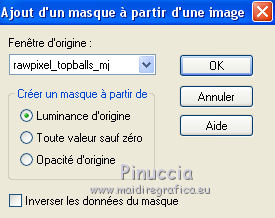 Pour traduire ce tutoriel j'ai utilisé CorelX17, mais il peut également être exécuté avec les autres versions. Suivant la version utilisée, vous pouvez obtenir des résultats différents. Depuis la version X4, la fonction Image>Miroir a été remplacée par Image>Renverser horizontalement, et Image>Renverser avec Image>Renverser verticalement . Dans les versions X5 et X6, les fonctions ont été améliorées par la mise à disposition du menu Objets. Avec la nouvelle version X7, nous avons encore Image>Miroir et Image>Renverser/Retourner, mais avec nouvelles différences. Voir les détails à ce sujet ici Certaines dénominations ont changées entre les versions de PSP. Les plus frequentes dénominations utilisées: ![]() Vos versions iciNécessaire pour réaliser ce tutoriel: Matériel ici Merci pour les tubes Luz Cristina. (ici les liens vers les sites des créateurs de tubes) Modules Externes: consulter, si nécessaire, ma section des filtres ici Filters Unlimited 2.0 ici Mehdi - Wavy Lab 1.1 ici Tramages - Wee Scratches ici Graphics Plus - Vertical Mirror ici Mura's Seamless - Emboss at Alpha ici Mura's Meister - Perspective Tiling ici Filtres Tramages, Graphics Plus et Mura's Seamless peuvent être utilisés seuls ou importés dans Filters Unlimited. voir comment le faire ici). Si un filtre est fourni avec cette icône, ![]() en fonction des couleurs utilisées, vous pouvez changer le mode mélange et l'opacité des calques. Placer les sélections dans le dossier Sélections. Ouvrir les masques dans PSP et les minimiser avec le reste du matériel. 1. Placer en avant plan la couleur #0b0e55, et en arrière plan la couleur #f25f11. ![]() 2. Ouvrir une nouvelle image transparente 1000 x 700 pixels. Effets>Modules Externes>Mehdi - Wavy Lab 1.1. Ce filtre crée des dégradés avec les couleurs de votre palette: la première est la couleur d'arrière plan, la deuxième est la couleur d'avant plan. Changer les autres deux couleurs créées par le filtre: la troisième avec #236588 et la quatrième avec #d99f9d. ![]() 3. Effets>Effets d'image>Mosaïque sans jointures ![]() 4. Réglage>Flou>Flou gaussien - rayon 25. ![]() 5. Effets>Effets géométriques>Inclinaison. ![]() 6. Effets>Effets de bords>Accentuer davantage. 7. Effets>Modules Externes>Tramages - Wee Scratches. ![]() Image>Renverser. 8. Préparer en avant plan un dégradé de premier plan/arrière plan, style Radial. ![]() 9. Calques>Nouveau calque raster. Remplir le calque du dégradé.10. Réglage>Flou>Flou gaussien - rayon 50. ![]() 11. Sélections>Sélectionner tout. Ouvrir le misted - Édition>Copier. Revenir sur votre travail et Édition>Coller dans la sélection. Sélections>Désélectionner tout. 12. Calques>Nouveau calque de masque>A partir d'une image. Ouvrir le menu deroulant sous la fenêtre d'origine et vous verrez la liste des images ouvertes. Sélectionner le masque mask_diagonal_mj. ![]() Calques>Fusionner>Fusionner le groupe. 13. Effets>Modules Externes>Mura's Seamless - Emboss at alpha, par défaut. ![]() 14. Effets>Effets de distorsion>Distorsion de l'objectif. ![]() 15. Sélections>Charger/Enregistrer une sélection>Charger à partir du disque. Chercher et charger la sélection talitha_mj. ![]() 16. Calques>Nouveau calque raster. Calques>Agencer>Déplacer vers le bas. 17. Édition>Coller dans la sélection (le misted est toujours en mémoire). 18. Vous positionner sur le calque du masque. ![]() Calques>Fusionner>Fusionner le calque de dessous. Sélections>Désélectionner tout. 19. Image>Redimensionner, à 90%, redimensionner tous les calques décoché. 20. Effets>Effets 3D>Ombre portée, couleur noire. ![]() 21. Sélections>Charger/Enregistrer une sélection>Charger à partir du disque. Chercher et charger la sélection talitha_1_mj. ![]() 22. Calques>Nouveau calque raster. Remplir le calque du dégradé.23. Réglage>Flou>Flou gaussien - rayon 25. ![]() 24. Effets>Modules Externes>Tramages - Wee Scratches, par défaut. ![]() Garder sélectionné. 25. Effets>Modules Externes>Mura's Meister - Perspective Tiling. ![]() 26. Réglage>Netteté>Davantage de netteté. Sélections>Désélectionner tout. Effets>Effets 3D>Ombre portée, par défaut. ![]() Calques>Agencer>Déplacer vers le bas. 27. Activer l'outil Sélecteur ![]() et règler l'image comme ci-dessous. ![]() 28. Calques>Nouveau calque raster. Réduire l'opacité de l'outil Pot de peinture à 80 Remplir le calque avec la couleur claire d'arrière plan.29. Calques>Nouveau calque de masque>A partir d'une image. Ouvrir le menu deroulant sous la fenêtre d'origine et sélectionner le masque rawpixel_topballs_mj. ![]() Calques>Fusionner>Fusionner le groupe. 30. Effets>Modules Externes>Mura's Seamless - Emboss at Alpha, par défaut. ![]() Placer le calque en mode Écran (j'ai gardé Normal). ***** Pour mon exemple, j'ai cherché un moyen d'effacer les traces du masque affichées ci-dessous, sans utiliser l'outil Gomme. ![]() Je ne sais pas pourquoi, mais cela a fonctionné: Sélections>Sélectionner tout. Sélections>Flottante et les traces sont disparu ![]() Dans ma version avec les tubes de Gabry, les traces ne sont pas apparues. ![]() ***** 31. Ouvrir le tube decoball_mj - Édition>Copier. Revenir sur votre travail et Édition>Coller comme nouveau calque. Calques>Agencer>Placer en haut de la pile. Placer le calque en mode Écran. 32. Ouvrir le tube de la femme - Édition>Copier. Revenir sur votre travail et Édition>Coller comme nouveau calque. Positionner bien le tube.Effets>Effets 3D>Ombre portée, à choix. La tag et les calques ![]() 33. Image>Ajouter des bordures, 1 pixel, symétrique, couleur foncée. Image>Ajouter des bordures, 3 pixels, symétrique, couleur claire. Image>Ajouter des bordures, 1 pixel, symétrique, couleur foncée. 34. Sélections>Sélectionner tout. Édition>Copier. Image>Ajouter des bordures, 50 pixels, symétrique, couleur blanche. 35. Sélections>Inverser. Édition>Coller dans la sélection. 36. Réglage>Flou>Flou directionnel ou