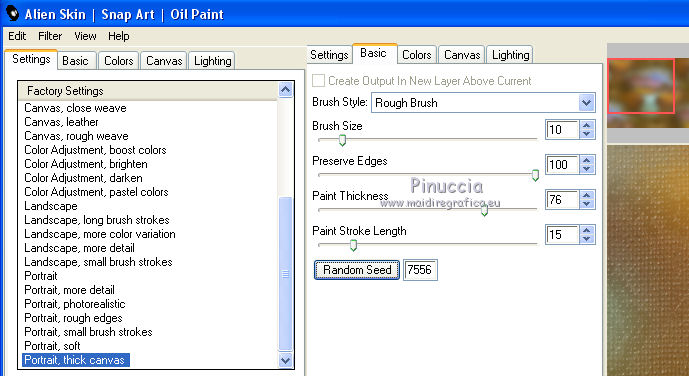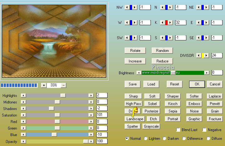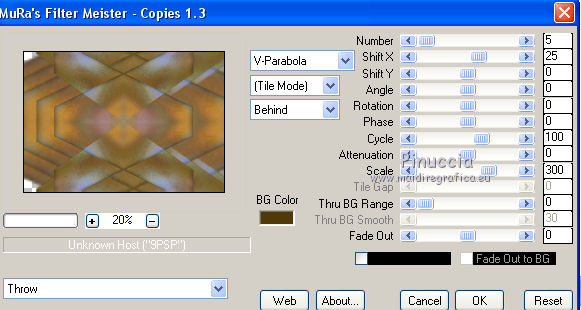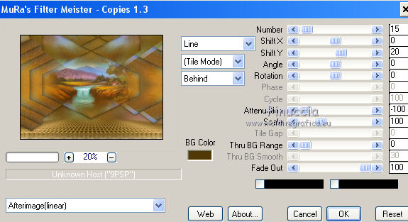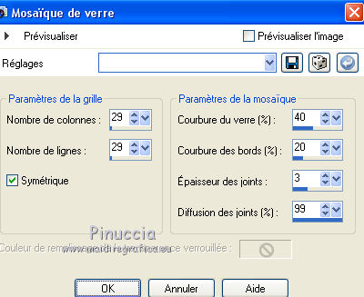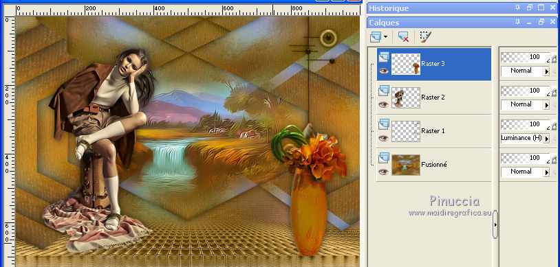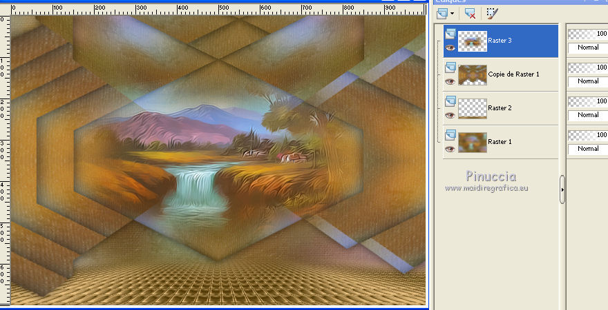Pour traduire ce tutoriel j'ai utilisé CorelX12, mais il peut également être exécuté avec les autres versions. Suivant la version utilisée, vous pouvez obtenir des résultats différents. Depuis la version X4, la fonction Image>Miroir a été remplacée par Image>Renverser horizontalement, et Image>Renverser avec Image>Renverser verticalement . Dans les versions X5 et X6, les fonctions ont été améliorées par la mise à disposition du menu Objets. Avec la nouvelle version X7, nous avons encore Image>Miroir et Image>Renverser/Retourner, mais avec nouvelles différences. Voir les détails à ce sujet ici Certaines dénominations ont changées entre les versions de PSP. Les plus frequentes dénominations utilisées: ![]() Le vostre versioni iciNécessaire pour réaliser ce tutoriel: Matériel ici Merci pour les tubes Syl, Beatriz et Luz Cristina. (ici les liens vers les sites des créateurs de tubes) Modules Externes: consulter, si nécessaire, ma section des filtres ici Filters Unlimited 2.0 ici Alien Skin Snap Art - Oil Paint ici Mirror Rave - Quadrant Mirror ici Mura's Seamless - Mirror Diagonal ici Mura's Meister - Copies ici Mura's Meister - Perspective Tiling ici AAA Filters - Custom ici Filtres Mirror Rave et Mura's Seamless peuvent être utilisés seuls ou importés dans Filters Unlimited. voir comment le faire ici). Si un filtre est fourni avec cette icône, ![]() en fonction des couleurs utilisées, vous pouvez changer le mode mélange et l'opacité des calques. Dans les plus récentes versions de PSP, vous ne trouvez pas le dégradé d'avant plan/arrière plan ou Corel_06_029. Vous pouvez utiliser le dégradé des versions antérieures. Ici le dossier Dégradés de CorelX. Placer les sélections dans le dossier Sélections. Placer en avant plan la couleur #e8c182, et en arrière plan la couleur #513907. ![]() Placer en avant plan le dégradé et sélectionner le dégradé tracy_mj, style Halo. ![]() 1. Ouvrir une nouvelle image transparente 1000 x 700 pixels. Remplir l'image transparente du dégradé.2. Sélections>Sélectionner tout. Ouvrir le misted - Édition>Copier. Revenir sur votre travail et Édition>Coller dans la sélection. Sélections>Désélectionner tout. 3. Effets>Effets d'image>Mosaïque sans jointures. ![]() 4. Réglage>Flou>Flou gaussien - rayon 25. ![]() 5. Effets>Modules Externes>Alien Skin Snap Art - Oil Paint ![]() 6. Calques>Dupliquer. Image>Redimensionner, à 70%, redimensionner tous les calques décoché. 7. Effets>Effets géométriques>Inclinaison. ![]() 8. Sélections>Charger/Enregistrer une sélection>Charger à partir du disque. Chercher et charger la sélection tracy_mj. ![]() Effets>Effets 3D>Ombre portée, couleur noire. ![]() 9. Effets>Effets de réflexion>Miroir rotatif. ![]() Sélections>Désélectionner tout. 10. Effets>Modules Externes>Mura's Seamless - Mirror Diagonal. ![]() 11. Effets>Modules Externes>Mirror Rave - Quadrant Flip, par défaut. ![]() 12. Effets>Modules Externes>Mura's Meister - Copies. ![]() Réglage>Netteté>Netteté. 13. Sélections>Charger/Enregistrer une sélection>Charger à partir du disque. Chercher et charger la sélection tracy_3_mj. ![]() 14. Presser CANC sur le clavier ![]() Sélections>Désélectionner tout. Effets>Effets 3D>Ombre portée, couleur noire. ![]() 15. Calques>Nouveau Calques raster. Calques>Agencer>Déplacer vers le bas. Remplir le calque du dégradé.16. Effets>Effets de textures>Mosaïque de verre ![]() 17. Effets>Modules Externes>Mura's Meister - Perspective Tiling. ![]() 18.- Sélections>Charger/Enregistrer une sélection>Charger à partir du disque. Chercher et charger la sélection tracy_2_mj. ![]() Presser +/- 6 fois CANC sur le clavier sélections>Désélectionner tout. Réglage>Netteté>Netteté 19. Édition>Coller comme nouveau calque (le misted est toujours en mémoire). Calques>Agencer>Placer en haut de la pile. Positionner bien le tube.![]() Calques>Fusionner>Calques visibles. 20. Effets>Modules Externes>AAA Filters - Custom - cliquer sur Landscape et ok. ![]() 21. Image>Taille du support - 1000 x 730 pixels. ![]() 22. Effets>Modules Externes>Mura's Meister - Copies. ![]() 23. Ouvrir le tube deco_tracy_mj - Édition>Copier. Revenir sur votre travail et Édition>Coller comme nouveau calque. Déplacer le tube en haut à droite![]() Placer le calque en mode Luminance (héritée). 24. Ouvrir le tube de la femme - Édition>Copier. Revenir sur votre travail et Édition>Coller comme nouveau calque. Déplacer le tube à gauche.Effets>Effets 3D>Ombre portée, à choix. Ouvrir le déco - Édition>Copier. Revenir sur votre travail et Édition>Coller comme nouveau calque. Image>Redimensionner, à 70%, redimensionner tous les calques décoché. Image>Miroir. Déplacer le tube à droite.Effets>Effets 3D>Ombre portée, à choix. ![]() 25. Calques>Fusionner>Tous. 26. Image>Ajouter des bordures, 1 pixel, symétrique, couleur noire. Image>Ajouter des bordures, 10 pixels, symétrique, couleur blanche. Image>Ajouter des bordures, 1 pixel, symétrique, couleur noire. Sélections>Sélectionner tout. 27. Image>Ajouter des bordures, 10 pixels, symétrique, couleur blanche. 28. Effets>Effets 3D>Ombre portée, couleur foncée. ![]() Sélections>Désélectionner tout. 29. Image>Ajouter des bordures, 1 pixel, symétrique, couleur noire. 30. Signer votre travail sur un nouveau calque. Calques>Fusionner>Tous. Image>Redimensionner, 1000 pixels de largeur, redimensionner tous les calques coché. Enregistrer en jpg. Version avec tubes de Syl ![]() Le vostre versioni ici![]() Si vous avez des problèmes, ou des doutes, ou vous trouvez un link modifié, ou seulement pour me dire que ce tutoriel vous a plu, vous pouvez m'écrire. 21 September 2019 |