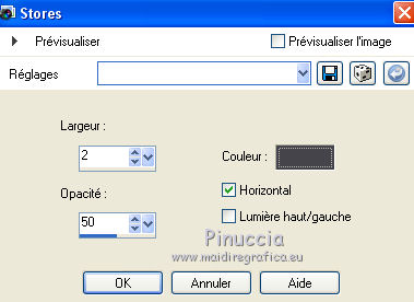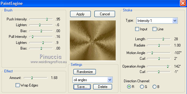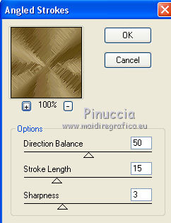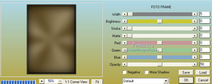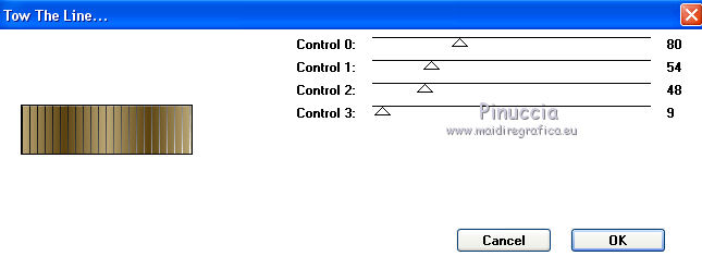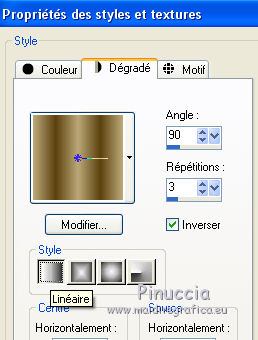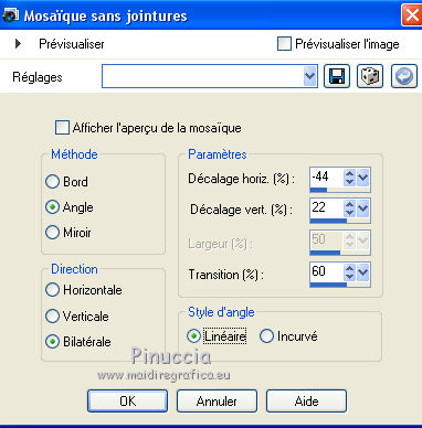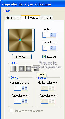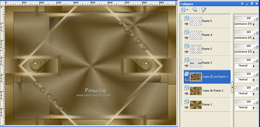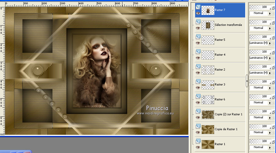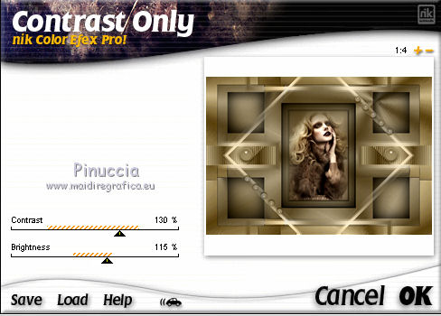 Pour traduire ce tutoriel j'ai utilisé CorelX12, mais il peut également être exécuté avec les autres versions. Suivant la version utilisée, vous pouvez obtenir des résultats différents. Depuis la version X4, la fonction Image>Miroir a été remplacée par Image>Renverser horizontalement, et Image>Renverser avec Image>Renverser verticalement . Dans les versions X5 et X6, les fonctions ont été améliorées par la mise à disposition du menu Objets. Avec la nouvelle version X7, nous avons encore Image>Miroir et Image>Renverser/Retourner, mais avec nouvelles différences. Voir les détails à ce sujet ici Certaines dénominations ont changées entre les versions de PSP. Les plus frequentes dénominations utilisées: ![]() Vos versions ici Nécessaire pour réaliser ce tutoriel: Matériel ici Pour le tube merci Luz Cristina. (ici les liens vers les sites des créateurs de tubes) Modules Externes: consulter, si nécessaire, ma section des filtres ici Filters Unlimited 2.0 ici Fantastic Machines - Paint Engine ici Brush Strokes - Angled Strokes ici Tramages - Tow the line ici AAA Frames - Foto Frame ici Nik Software - Color Efex Pro 1.0e ici Filtres Tramages peuvent être utilisés seuls ou importés dans Filters Unlimited. voir comment le faire ici). Si un filtre est fourni avec cette icône, ![]() en fonction des couleurs utilisées, vous pouvez changer le mode mélange et l'opacité des calques. Dans les plus récentes versions de PSP, vous ne trouvez pas le dégradé d'avant plan/arrière plan ou Corel_06_029. Vous pouvez utiliser le dégradé des versions antérieures. Ici le dossier Dégradés de CorelX. Placer les sélections dans le dossier Sélections. Placer en avant plan la couleur #5a410e, et en arrière plan la couleur #bba777. ![]() Préparer en avant plan un dégradé de premier plan/arrière plan, style Radial. ![]() Préparer en arrière plan un dégradé de premier plan/arrière plan, style Linéaire. ![]() 1. Ouvrir une nouvelle image transparente 1000 x 700 pixels. Remplir l'image transparente du dégradé radial d'avant plan.2. Effets>Modules Externes>Fantastic Machine - PaintEngine, sélectionner le preset oil angles et ok. ![]() 3. Effets>Modules Externes>Brush Strokes - Angled Strokes, 2 fois, par défaut. ![]() 4. Calques>Dupliquer. Image>Redimensionner, à 90%, redimensionner tous les calques décoché. 5. Effets>Effets 3D>Ombre portée, couleur noire. ![]() Répéter Ombre portée, vertical et horizontal -1. 6. Effets>Effets d'image>Mosaïque sans jointures. ![]() 7. Calques>Dupliquer. Image>Redimensionner, à 90%, redimensionner tous les calques décoché. 8. Effets>Effets 3D>Ombre portée, couleur noire. ![]() Répéter Ombre portée, vertical et horizontal -1. 9. Effets>Effets de textures>Stores ![]() 10. Ouvrir deco_trudy_mj - Édition>Copier. Revenir sur votre travail et Édition>Coller comme nouveau calque. Placer le calque en mode Luminance (héritée). 11. Effets>Effets d'image>Mosaïque sans jointures, par défaut. ![]() 12. Sélections>Charger/Enregistrer une sélection>Charger à partir du disque. Chercher et charger la sélection trudy_mj. ![]() 13. Calques>Nouveau calque raster. Remplir le calque du dégradé linéaire d'arrière plan.14. Effets>Modules Externes>Tramages - Tow the line, par défaut. ![]() Sélections>Désélectionner tout. 15. Calques>Dupliquer. Image>Miroir. Calques>Fusionner>Fusionner le calque de dessous. Calques>Agencer>Déplacer vers le bas. 16. Ouvrir deco_trudy_1_mj - Édition>Copier. Revenir sur votre travail et Édition>Coller comme nouveau calque. Placer le calque en mode Luminance (héritée). Calques>Agencer>Placer en haut de la pile. 17. Ouvrir deco_trudy_2_mj - Édition>Copier. Revenir sur votre travail et Édition>Coller comme nouveau calque. Placer le calque en mode Luminance (héritée). 18. Vous positionner sur le calque Copie (2) sur Raster 1. ![]() Sélections>Charger/Enregistrer une sélection>Charger à partir du disque. Chercher et charger la sélection trudy_1_mj. ![]() 19. Calques>Nouveau calque raster. Effets>Effets 3D>Découpe. ![]() Sélections>Désélectionner tout. 20. Calques>Dupliquer. Image>Renverser. Calques>Fusionner>Fusionner le calque de dessous. 21. Calques>Dupliquer. Image>Miroir. Calques>Fusionner>Fusionner le calque de dessous. 22. Vous positionner à nouveau sur le calque Copie (2) sur Raster 1. Sélections>Charger/Enregistrer une sélection>Charger à partir du disque. Chercher et charger la sélection trudy_2_mj. ![]() Sélections>Transformer la sélection en calque. Calques>Agencer>Placer en haut de la pile. 23. Réglage>Flou>Flou gaussien - rayon 20. ![]() 24. Calques>Nouveau calque raster. Effets>Effets 3D>Découpe, comme précédemment. ![]() Calques>Fusionner>Fusionner le calque de dessous. 25. Effets>Modules Externes>AAA Frames - Foto Frame. ![]() 26. Sélections>Modifier>Contracter - 30 pixels. Répéter Effets>Modules Externes>AAA Frames - Foto Frame, comme précédemment. 27. Sélections>Modifier>Contracter - 5 pixels. 28. Ouvrir le tube de la femme de Luz Cristina - Édition>Copier. Revenir sur votre travail et Édition>Coller comme nouveau calque. Positionner bien le tube sur la sélection.Sélections>Inverser. Presser CANC sur le clavier ![]() Sélections>Désélectionner tout. Vous devriez avoir ce-ci ![]() Calques>Fusionner>Calques visibles. 29. Effets>Modules Externes>Nik Color Efex Pro 1.0e - Contrast Only. ![]() 30. Image>Ajouter des bordures, 1 pixel, symétrique, couleur noire. Image>Ajouter des bordures, 10 pixels, symétrique, couleur #876e3b. Image>Ajouter des bordures, 1 pixel, symétrique, couleur noire. Image>Ajouter des bordures, 15 pixels, symétrique, couleur #876e3b. 31. Sélections>Sélectionner tout. Édition>Copier. Image>Ajouter des bordures, 30 pixels, symétrique, couleur blanche. 32. Sélections>Inverser. Édition>Coller dans la sélection. Effets>Effets 3D>Ombre portée, couleur noire. ![]() Sélections>Inverser. Répéter Ombre portée, comme préc