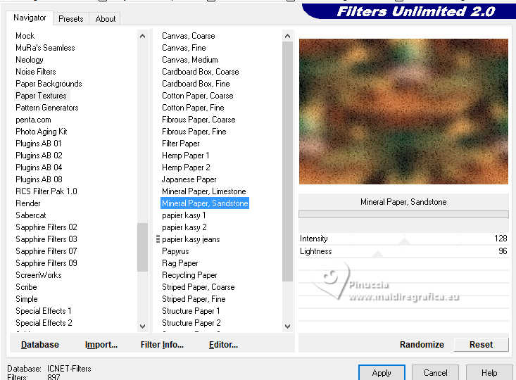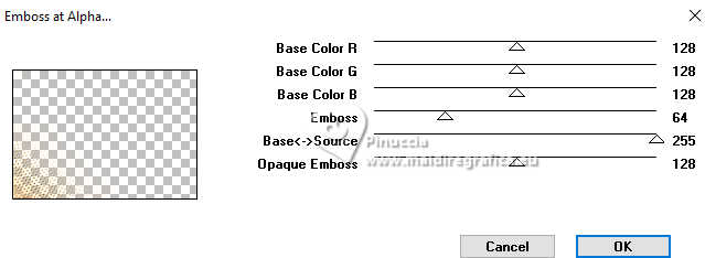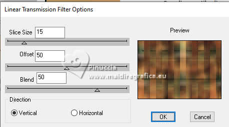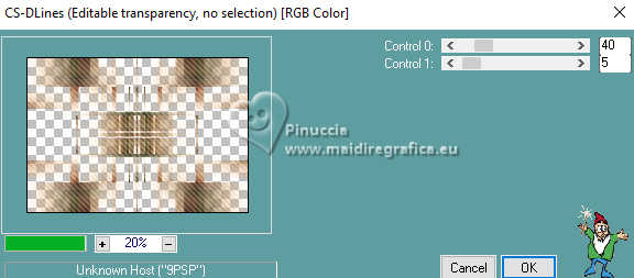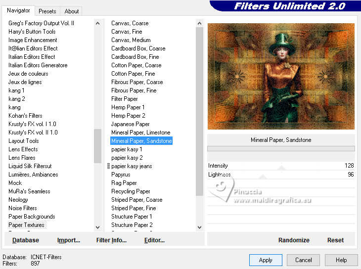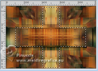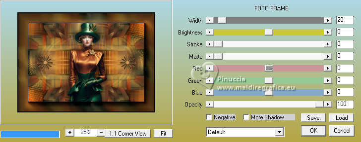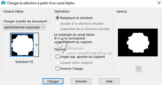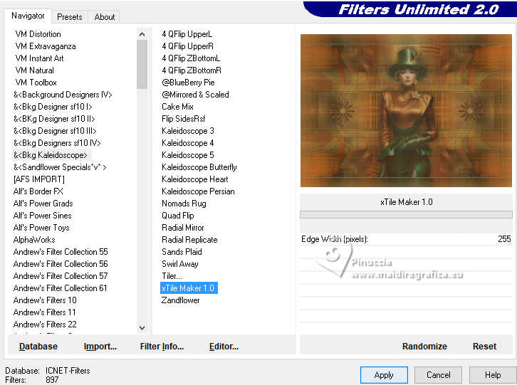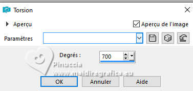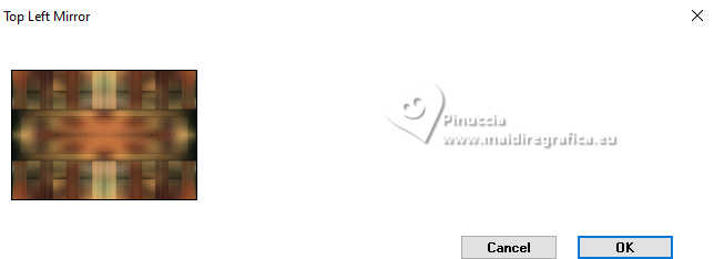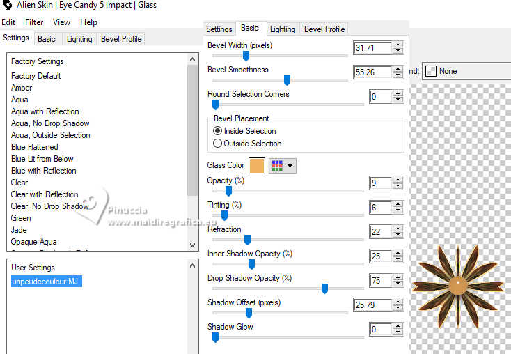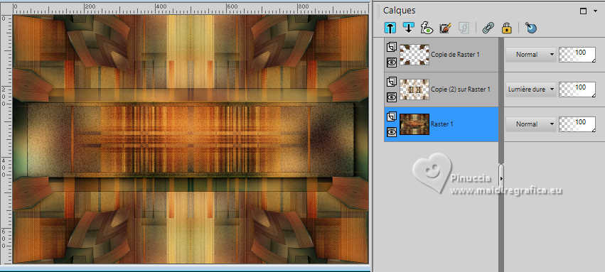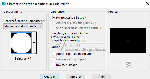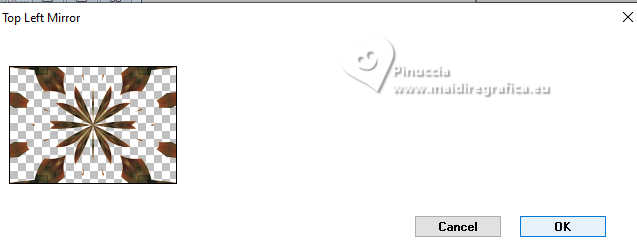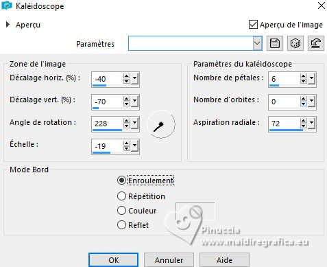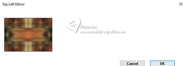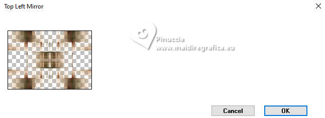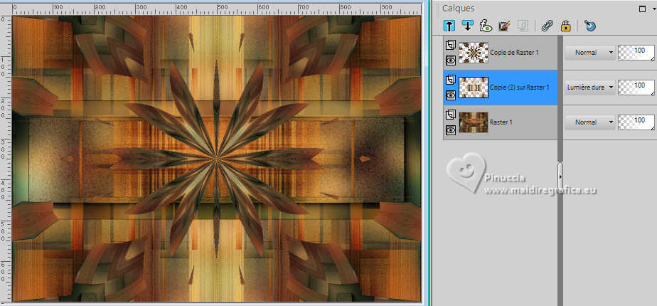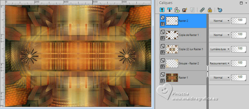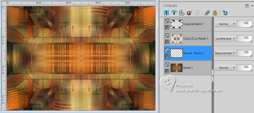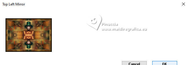 Pour traduire ce tutoriel j'ai utilisé PSPX9 et PSP2020, mais il peut également être exécuté avec les autres versions. Suivant la version utilisée, vous pouvez obtenir des résultats différents. Depuis la version X4, la fonction Image>Miroir a été remplacée par Image>Renverser horizontalement, et Image>Renverser avec Image>Renverser verticalement . Dans les versions X5 et X6, les fonctions ont été améliorées par la mise à disposition du menu Objets. Avec la nouvelle version X7, nous avons encore Image>Miroir et Image>Renverser/Retourner, mais avec nouvelles différences. Voir les détails à ce sujet ici Certaines dénominations ont changées entre les versions de PSP. Les plus frequentes dénominations utilisées: ![]() English translation here Vos versions ici![]() Nécessaire pour réaliser ce tutoriel: ![]() Matériel de Maria José. (ici les liens vers les sites des créateurs du matériel) ![]() consulter, si nécessaire, ma section des filtres ici Filters Unlimited 2.0 ici &<Kaleidoscope> - xTile Maker 1.0 (à importer dans Unlimited) ici AAA Frames - Foto Frame ici DSB Flux - Linear Transmission ici Simple - Top Left Mirror ici Toadies - Weaver ici Carolaine and Sensibility - CS-DLines ici Graphics Plus - Quick Tile I ici Mura's Seamless - Emboss at Alpha ici Alien Skin Eye Candy 5 Impact - Glass ici Filtres Simple, Toadies, Graphics Plus et Mura's Seamless peuvent être utilisés seuls ou importés dans Filters Unlimited. voir comment le faire ici. Si un filtre est fourni avec cette icône, ![]() en fonction des couleurs utilisées, vous pouvez changer le mode mélange et l'opacité des calques. Placer le preset En cliquant sur le preset une ou deux fois (selon vos r glages) automatiquement il se placera directement dans le dossier Settings de Alien Skin Eye Candy. pourquoi un ou deux clic voir ici ![]() Ouvrir le masque dans PSP et le minimiser avec le reste du matériel. Choisir deux couleur de votre tube (qu'il soit bien coloré). Placer en avant plan la couleur foncée #042c22 et en arrière plan la couleur claire #f2b062. ![]() 1. Ouvrir alphachannel-unpeudecouleur Fenêtre>Dupliquer ou sur le clavier shift+D pour faire une copie. ![]() 2. Fermer l'original. La copie, qui sera la base de votre travail, n'est pas vide, mais contient les sélections enregistrées sur le canal alpha. Remplir l'image transparente avec la couleur claire d'arrière plan.Sélections>Sélectionner tout. 3. Ouvrir le tube femme-AI-tube-MJ ![]() Édition>Copier. Revenir sur votre travail et Édition>Coller dans la sélection. Sélections>Désélectionner tout. 4. Effets>Effet d'image>Mosaïque sans jointures. ![]() 5. Réglage>Flou>Flou gaussien - rayon 25. ![]() 6. Effets>Modules Externes>Filters Unlimited 2.0 - Paper Textures - Mineral Paper,Sandstone, par défaut. ![]() 7. Sélections>Charger/Enregistrer une sélection>Charger à partir d'un canal alpha. La sélection Selection #1 est déjà disponible. On doit seulement cliquer sur Charger. ![]() ![]() 8. Effets>Modules Externes>AAA Frames - Foto Frame. ![]() Sélections>Inverser. 9. Effets>Modules Externes>DSB Flux - Linear Transmission. ![]() 10. Effets>Effets de réflexion>Miroir rotatif, par défaut. ![]() 11. Effets>Modules Externes>Simple - Top Left Mirror. ![]() Sélections>Désélectionner tout. 12. Calques>Dupliquer. Image>Redimensionner, à 80%, redimensionner tous les calques décoché. 13. Effets>Effets de réflexion>Kaléïdoscope. ![]() 14. Effets>Modules Externes>Simple - Top Left Mirror. ![]() Calques>Dupliquer. 15. Effets>Modules Externes>Toadies - Weaver, par défaut. ![]() 16. Effets>Effets de réflexion>Miroir rotatif. ![]() 17. Effets>Modules Externes>Simple - Top Left Mirror. ![]() 18. Effets>Modules Externes>Carolaine and Sensibility - CS-DLines, par défaut. ![]() 19. Effets>Modules Externes>Graphics Plus - Quick Tile I. ![]() Placer le calque en mode Lumière dure (ou autre). Calques>Agencer>Déplacer vers le bas. ![]() Vous positionner sur le calque du haut de la pile, Copie de Raster 1. 20. Sélections>Charger/Enregistrer une sélection>Charger à partir d'un canal alpha. Ouvrir le menu des sélections et charger la sélection Selection #2 ![]() ![]() 21. Édition>Couper. Édition>Coller comme nouvelle image, et minimiser cette image. 22. Sélections>Charger/Enregistrer une sélection>Charger à partir d'un canal alpha. Ouvrir le menu des sélections et charger la sélection Selection #3 ![]() ![]() Presser CANC sur le clavier ![]() Sélections>Désélectionner tout. Effets>Effets 3D>Ombre portée, couleur noire. ![]() Vous positionner sur le calque Raster 1. ![]() 23. Effets>Effets de distorsion>Vent - vers la droite, intensité 50 ![]() 24. Effets>Effets de réflexion>Miroir rotatif, par défaut. ![]() 25. Effets>Modules Externes>Simple - Top Left Mirror. ![]() 26. Calques>Nouveau calque raster. Calques>Agencer>Placer en haut de la pile. Remplir le calque avec la couleur claire d'arrière plan.27. Calques>Nouveau calque de masque>A partir d'une image. Ouvrir le menu deroulant sous la fenêtre d'origine et vous verrez la liste des images ouvertes. Sélectionner le masque mask-moi-39-MJ. ![]() Calques>Fusionner>Fusionner le groupe. 28. Effets>Modules Externes>Mura's Seamless - Emboss at Alpha, par défaut. ![]() 29. Effets>Effets 3D>Ombre portée, par défaut. ![]() Répéter Ombre portée, vertical et horizontal -10. ![]() 30. Effets>Effets de distorsion>Vent - vers la gauche, intensité 50. ![]() 31. Calques>Dupliquer. Image>Retourner>Renverser verticalement. Image>Miroir>Miroir horizontal. Calques>Fusionner>Fusionner le calque de dessous. 32. Effets>Effets de distorsion>Torsion ![]() Placer le calque en mode Recouvrement (ou autre). Calques>Agencer>Déplacer vers le bas - 2 fois. ![]() 33. Activer l'image minimisée à l'étape 21 ![]() Image>Redimensionner, à 25%, redimensionner tous les calques décoché. 34. Édition>Copier. Revenir sur votre travail et Édition>Coller comme nouveau calque. Calques