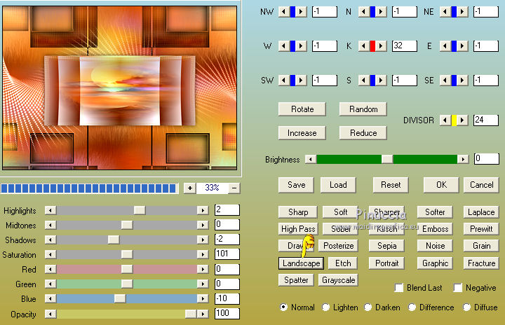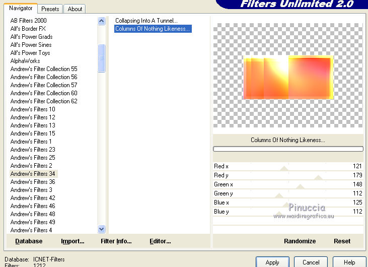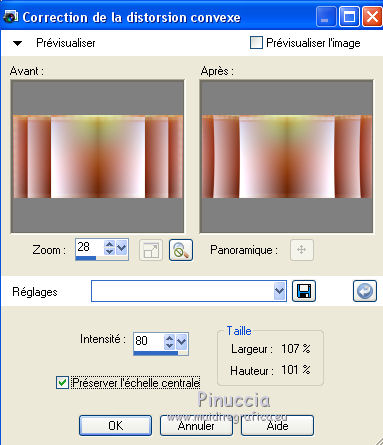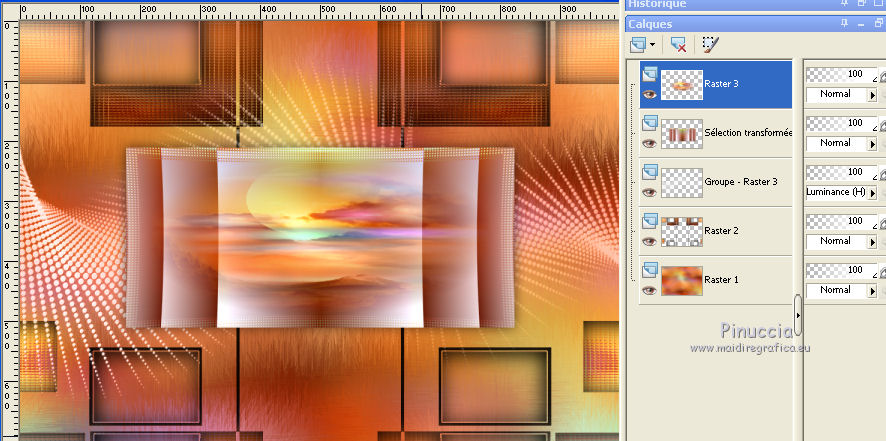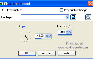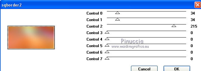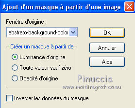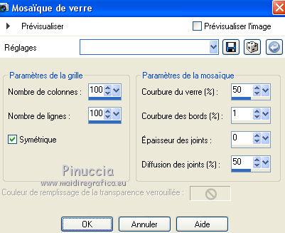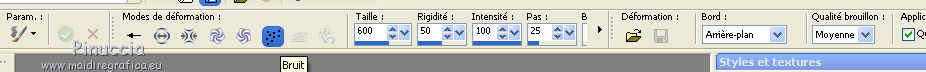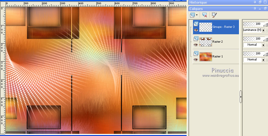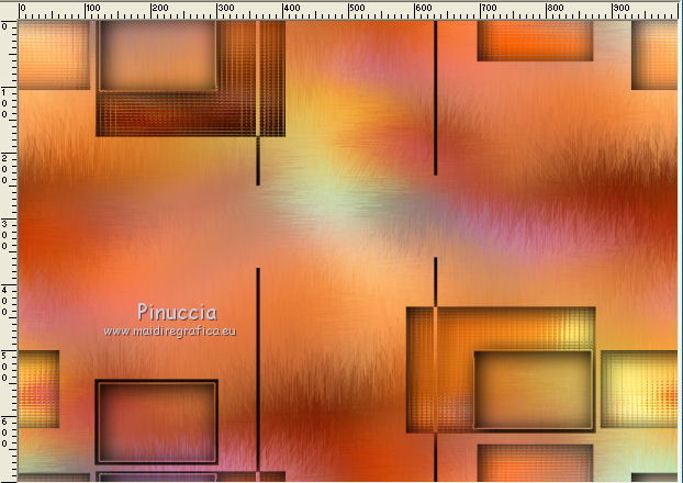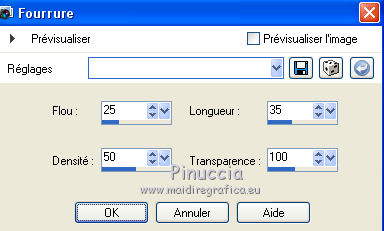 Pour traduire ce tutoriel j'ai utilisé CorelX12, mais il peut également être exécuté avec les autres versions. Suivant la version utilisée, vous pouvez obtenir des résultats différents. Depuis la version X4, la fonction Image>Miroir a été remplacée par Image>Renverser horizontalement, et Image>Renverser avec Image>Renverser verticalement . Dans les versions X5 et X6, les fonctions ont été améliorées par la mise à disposition du menu Objets. Avec la nouvelle version X7, nous avons encore Image>Miroir et Image>Renverser/Retourner, mais avec nouvelles différences. Voir les détails à ce sujet ici Certaines dénominations ont changées entre les versions de PSP. Les plus frequentes dénominations utilisées: ![]() Vos versions ici Nécessaire pour réaliser ce tutoriel: Matériel ici (ici les liens vers les sites des créateurs de tubes) Modules Externes: consulter, si nécessaire, ma section des filtres ici Filters Unlimited 2.0 ici Mura's Seamless - Emboss at Alpha ici [AFS IMPORT] - sqborder2 ici Andrew's Filters 34 - Columns of Nothing Likeness ici Simple - Half Wrap ici Optionnel AAA Filters - Custom ici Filtres Mura's Seamless et Simple peuvent être utilisés seuls ou importés dans Filters Unlimited. voir comment le faire ici). Si un filtre est fourni avec cette icône, ![]() en fonction des couleurs utilisées, vous pouvez changer le mode mélange et l'opacité des calques. Placer les sélections dans le dossier Sélections. Ouvrir le masque dans PSP et le minimiser avec le reste du matériel. 1. Ouvrir une nouvelle image transparente 1000 x 700 pixels. 2. Sélections>Sélectionner tout. Ouvrir l'image gráficovera - Édition>Copier. Revenir sur votre travail et Édition>Coller dans la sélection. Sélections>Désélectionner tout. 3. Effets>Effets d'image>Mosaïque sans jointures. ![]() 4. Réglage>Flou>Flou gaussien - rayon 25,00. ![]() Sélections>Sélectionner tout. 5. Activer l'outil Pinceau déformant - Bruit![]() Cliquez sur les 4 coins, sur les côtés et au centre pour mélanger les couleurs. Cliquer sur la coque pour appliquer l'outil. ![]() 6. Effets>Effets de textures>Fourrure ![]() 7. Calques>Nouveau calque raster. Sélections>Charger/Enregistrer une sélection>Charger à partir du disque. Chercher et charger la sélection vera_mj. ![]() 8. Édition>Coller dans la sélection (l'image graficovera est toujours en mémoire). ![]() 9. Effets>Effets de textures>Mosaïque de verre. ![]() 10. Calques>Nouveau calque raster. Effets>Effets 3D>Découpe. ![]() Sélections>Désélectionner tout. 11. Sélections>Charger/Enregistrer une sélection>Charger à partir du disque. Chercher et charger la sélection vera_1_mj. ![]() Répéter Effets>Effets 3D>Découpe, comme précédemment. ![]() Sélections>Désélectionner tout. Calques>Fusionner>Fusionner le calque de dessous. 12. Effets>Modules Externes>Simple - Half Wrap. L'effet travail sans fenêtre; résultat ![]() 13. Effets>Effets de réflexion>Miroir rotatif. ![]() 14. Calques>Nouveau calque raster. Placer en avant plan la couleur blanche. Remplir le calque avec la couleur blanche.15. Calques>Nouveau calque de masque>A partir d'une image. Ouvrir le menu deroulant sous la fenêtre d'origine et vous verrez la liste des images ouvertes. Sélectionner le masque abstratobackgroundcolorido. ![]() Calques>Fusionner>Fusionner le groupe. 16. Effets>Modules Externes>MuRa's Seamless - Emboss at Alpha, par défaut. ![]() Placer le calque en mode Luminance (héritée), ou autre. ![]() 17. Vous positionner sur le calque Raster 1. Sélections>Charger/Enregistrer une sélection>Charger à partir du disque. Chercher et charger la sélection vera_2_mj. ![]() Sélections>Transformer la sélection en calque. Calques>Agencer>Placer en haut de la pile. 18. Réglage>Flou>Flou gaussien - rayon 25,00. ![]() 19. Effets>Modules Externes>[AFS IMPORT] - sqborder2. ![]() Sélections>Désélectionner tout. 20. Effets>Modules Externes>Filters Unlimited 2.0 - Andrew's Filters 34 - Columns Of Nothing Likeness, par défaut. ![]() attention, si votre résultat donne une ligne colorée comme ci-dessous ![]() avant d'appliquer le plugin, placer en arrière plan la couleur blanche 21. Effets>Effets de réflexion>Miroir rotatif. ![]() 22. Réglage>Correction de la distorsion convexe ![]() Effets>Effets 3D>Ombre portée, couleur noire. ![]() 23. Sélections>Charger/Enregistrer une sélection>Charger à partir du disque. Chercher et charger la sélection vera_3_mj. ![]() 24. Calques>Nouveau calque raster. Ouvrir le misted et Édition>Copier. Revenir sur votre travail et Édition>Coller dans la sélection. Sélections>Désélectionner tout. Les calques et la tag ![]() Calques>Fusionner>Calques visibles. Optionnel: Effets>Modules Externes> AAA Filters - Custom - Landscape ![]() 25. Image>Ajouter des bordures, 1 pixel, symétrique, couleur noire. 26. Sélections>Sélectionner tout. Édition>Copier. 27. Image>Ajouter des bordures, 50. pixels, symétrique, couleur blanche. 28. Sélections>Inverser. Édition>Coller dans la sélection (l'image copiée à l'étape 26). 29. Réglage>Flou>Flou directionnel ou Flou de mouvement. ![]() 30. Effets>Effets de réflexion>Miroir rotatif. ![]() 31. Sélections>Inverser. Effets>Effets 3D>Ombre portée, couleur noire. ![]() Sélections>Désélectionner tout. 32. Ouvrir le tube de la femme, effacer le watermark et Édition>Copier. Revenir sur votre travail et Édition>Coller comme nouveau calque. Déplacer ![]() Effets>Effets 3D>Ombre portée, à choix. 33. Image>Ajouter des bordures, 1 pixel, symétrique, couleur noire. 34. Signer votre travail sur un nouveau calque. Calques>Fusionner>Tous. 35. Image>Redimensionner, 1000 pixels de largeur, redimensionner tous les calques coché. Enregistrer en jpg. Version avec tubes de Cal ![]() Vos versions ici ![]() Si vous avez des problèmes, ou des doutes, ou vous trouvez un link modifié, ou seulement pour me dire que ce tutoriel vous a plu, vous pouvez m'écrire. 18 Octobre 2019 |