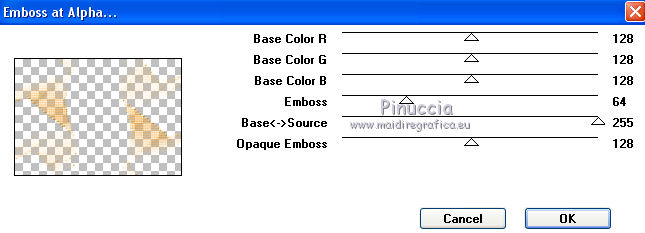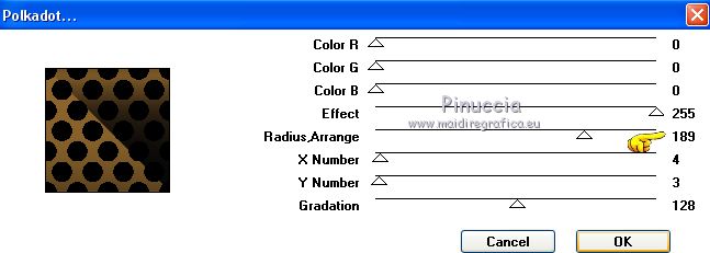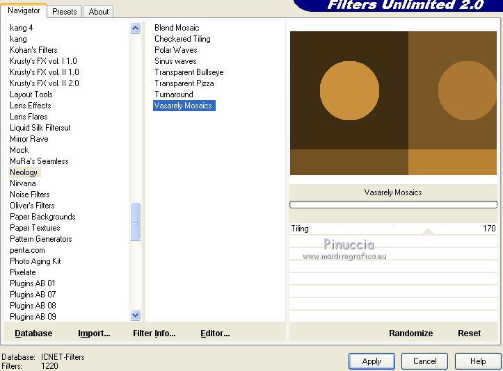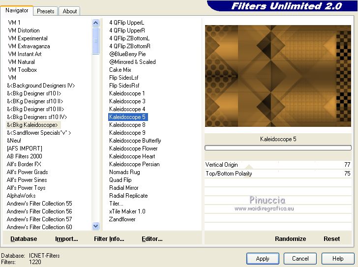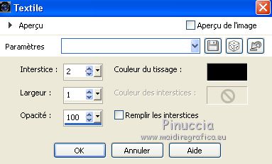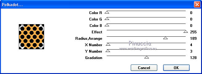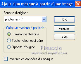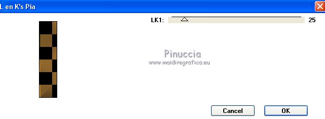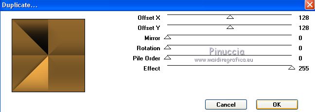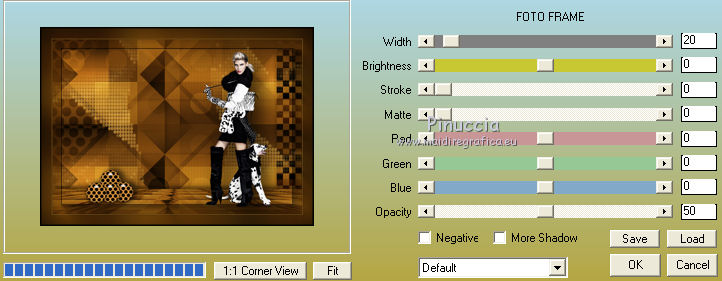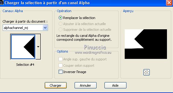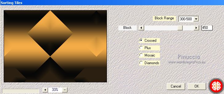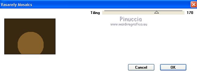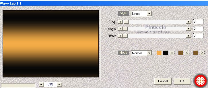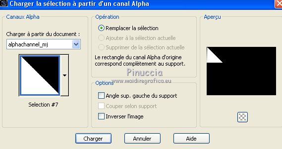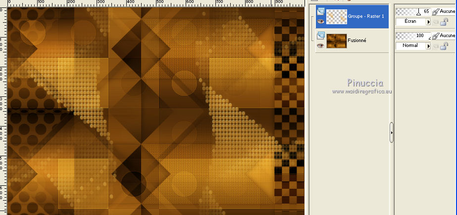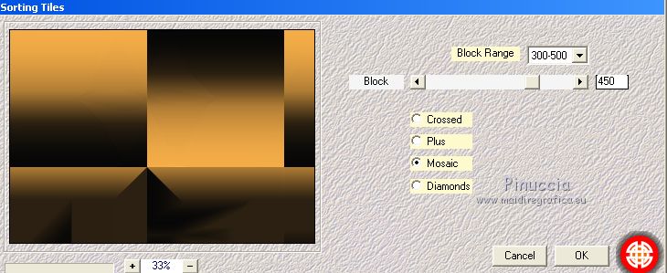 Pour traduire ce tutoriel j'ai utilisé CorelX17, mais il peut également être exécuté avec les autres versions. Suivant la version utilisée, vous pouvez obtenir des résultats différents. Depuis la version X4, la fonction Image>Miroir a été remplacée par Image>Renverser horizontalement, et Image>Renverser avec Image>Renverser verticalement . Dans les versions X5 et X6, les fonctions ont été améliorées par la mise à disposition du menu Objets. Avec la nouvelle version X7, nous avons encore Image>Miroir et Image>Renverser/Retourner, mais avec nouvelles différences. Voir les détails à ce sujet ici Certaines dénominations ont changées entre les versions de PSP. Les plus frequentes dénominations utilisées: ![]() Vos versions ici Nécessaire pour réaliser ce tutoriel: Matériel ici Pour le tube merci Tocha; le masque vient du net. (ici les liens vers les sites des créateurs de tubes) Modules Externes: consulter, si nécessaire, ma section des filtres ici Filters Unlimited 2.0 ici &<Bkg Kaleidoscope> - Kaleidoscope 5 (à importer dans Unlimited) ici Mehdi - Wavy Lab 1.1 ici Mehdi - Sorting Tiles ici Neology Vasarely Mosaic ici L&K's - L&K's Pia ici Carolaine and Sensibility - CS-HLines ici Mura's Meister - Perspective Tiling ici Mura's Seamless - Duplicate, Polkadot, Emboss at Alpha ici Alien Skin Eye Candy 5 Impact - Glass ici AAA Frames - Foto Frame ici Filtres Neology et Mura's Seamless peuvent être utilisés seuls ou importés dans Filters Unlimited. voir comment le faire ici). Si un filtre est fourni avec cette icône, ![]() en fonction des couleurs utilisées, vous pouvez changer le mode mélange et l'opacité des calques. Placer le preset En cliquant sur le preset une ou deux fois (selon vos réglages) automatiquement il se placera directement dans le dossier Settings de Alien Skin Eye Candy. pourquoi un ou deux clic voir ici Ouvrir le masque dans PSP et le minimiser avec le reste du matériel. 1. Choisir deux couleurs. Placer en avant plan la couleur foncée, pour moi #070707, et en arrière plan la couleur claire, pour moi #f3ac47. ![]() 2. Ouvrir alphachannel_mj. Fenêtre>Dupliquer ou sur le clavier shift+D pour faire une copie. ![]() Fermer l'original. La copie, qui sera la base de votre travail, n'est pas vide, mais contient les sélections enregistrées sur le canal alpha. 2. Effets>Modules Externes>Mehdi - Wavy Lab 1.1. Ce filtre crée des dégradés avec les couleurs de votre palette: la première est la couleur d'arrière plan, la deuxième est la couleur d'avant plan. Garder les autres deux couleurs créées par le filtre (la même couleur #7d5927) ![]() 3. Effets>Modules Externes>Mehdi - Sorting Tiles. ![]() Calques>Duplicate. 4. Effets>Modules Externes>Mehdi - Sorting Tiles. ![]() 5. Réduire l'opacité de ce calque à 50%. Calques>Fusionner>Fusionner le calque de dessous. 6. Sélections>Charger/Enregistrer une sélection>Charger à partir d'un canal alpha. La sélection #1 est déjà disponible. On doit seulement cliquer sur Charger. ![]() 7. Effets>Modules Externes>L&K's - L&K's Pia ![]() Effets>Effets 3D>Ombre portée, couleur noire. ![]() Sélections>Désélectionner tout. 8. Sélections>Charger/Enregistrer une sélection>Charger à partir d'un canal alpha. Ouvrir le menu des sélections et charger la sélection #2. ![]() 9. Effets>Effets de textures>Textile - couleur du tissage #000000. ![]() Effets>Effets 3D>Ombre portée, couleur noire. ![]() Sélections>Désélectionner tout. 10. Sélections>Charger/Enregistrer une sélection>Charger à partir d'un canal alpha. Ouvrir le menu des sélections et charger la sélection #3. ![]() 11. Effets>Modules Externes>Carolaine and Sensibility - CS-HLines ![]() Effets>Effets 3D>Ombre portée, couleur noire. ![]() Sélections>Désélectionner tout. 12. Sélections>Charger/Enregistrer une sélection>Charger à partir d'un canal alpha. Ouvrir le menu des sélections et charger la sélection #4. ![]() 13. Effets>Modules Externes>Mura's Seamless - Duplicate. ![]() Effets>Effets 3D>Ombre portée, couleur noire. ![]() Sélections>Désélectionner tout. 14. Sélections>Charger/Enregistrer une sélection>Charger à partir d'un canal alpha. Ouvrir le menu des sélections et charger la sélection #7. ![]() 15. Effets>Modules Externes>Mura's Seamless - Polkadot. ![]() Effets>Effets 3D>Ombre portée, couleur noire. ![]() Sélections>Désélectionner tout. 16. Effets>Effets d'image>Mosaïque sans jointures. ![]() 17. Effets>Modules Externes>Filters Unlimited 2.0 - &<Bkg Kaleidoscope> - Kaleidoscope 5 ![]() Calques>Dupliquer. 18. Effets>Modules Externes>Neology - Vasarely Mosaics ![]() si vous utilisez l'effet dans Unlimited: ![]() Résultat ![]() 19. Effets>Effets de bords>Accentuer. Placer le calque en mode Lumière douce. Calques>Fusionner>Calques visibles. 20. Calques>Nouveau calque raster. Réduire l'opacité de l'outil Pot de peinture à 80% Remplir le calque avec la couleur claire.21. Calques>Nouveau calque de masque>A partir d'une image. Ouvrir le menu deroulant sous la fenêtre d'origine et vous verrez la liste des images ouvertes. Sélectionner le masque photomask_1. ![]() Calques>Fusionner>Fusionner le groupe. 22. Effets>Modules Externes>Mura's Seamless - Emboss at Alpha, par défaut ![]() Placer le calque en mode Écran et réduire l'opacité à 65%. ![]() Calques>Fusionner>Calques visibles. 23. Sélections>Charger/Enregistrer une sélection>Charger à partir d'un canal alpha. Ouvrir le menu des sélections et charger la sélection #5. ![]() Sélections>Transformer la sélection en calque. Garder sélectionné. 24. Effets>Modules Externes>Mura's Meister - Perspective Tiling. ![]() Effets>Effets 3D>Ombre portée, couleur noire. ![]() 25. Sélections>Charger/Enregistrer une sélection>Charger à partir d'un canal alpha. Ouvrir le menu des sélections et charger la sélection #6. ![]() 26. Placer à nouveau l'opacité de l'outil Pot de peintura à 100. Calques>Nouveau calque raster. Remplir le calque avec la couleu