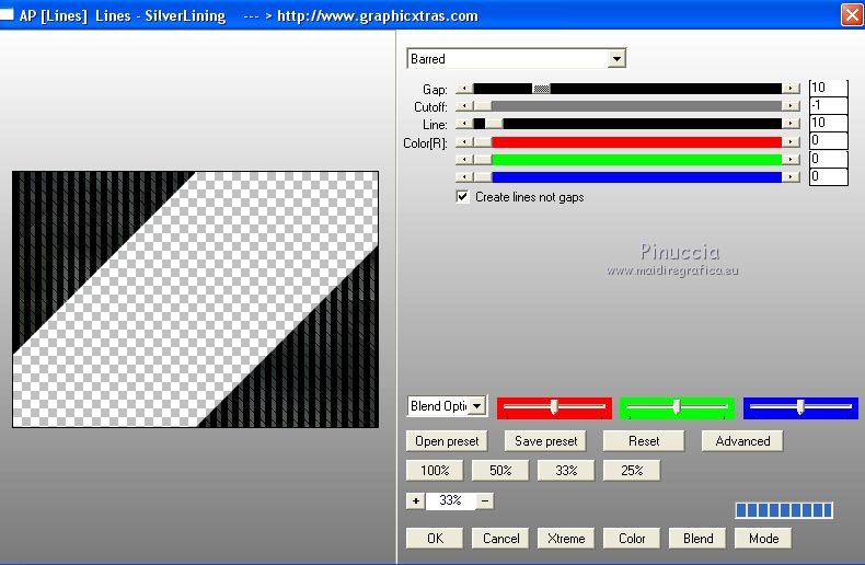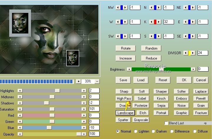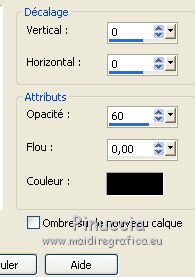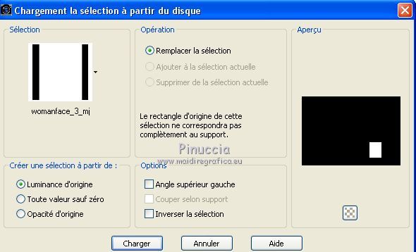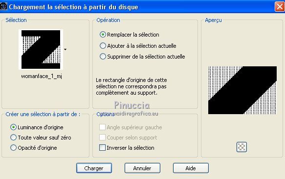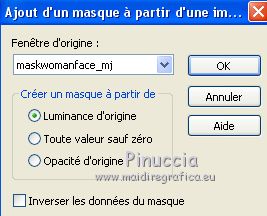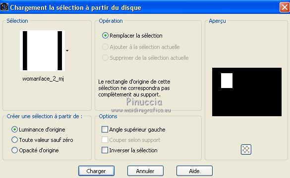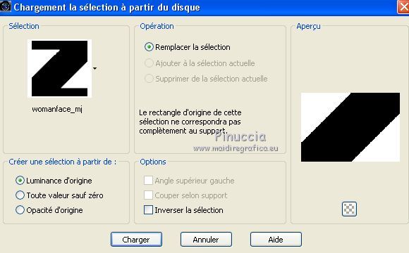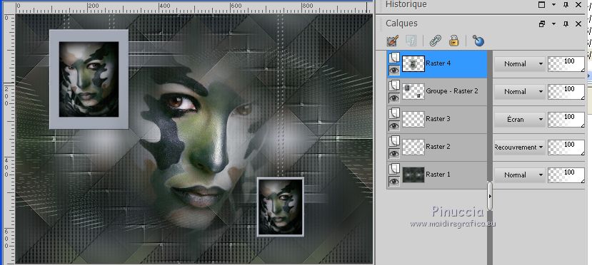 Pour traduire ce tutoriel j'ai utilisé CorelX17, mais il peut également être exécuté avec les autres versions. Suivant la version utilisée, vous pouvez obtenir des résultats différents. Depuis la version X4, la fonction Image>Miroir a été remplacée par Image>Renverser horizontalement, et Image>Renverser avec Image>Renverser verticalement . Dans les versions X5 et X6, les fonctions ont été améliorées par la mise à disposition du menu Objets. Avec la nouvelle version X7, nous avons encore Image>Miroir et Image>Renverser/Retourner, mais avec nouvelles différences. Voir les détails à ce sujet ici Certaines dénominations ont changées entre les versions de PSP. Les plus frequentes dénominations utilisées: ![]() Vos versions iciNécessaire pour réaliser ce tutoriel: Matériel ici Graphique du net. (ici les liens vers les sites des créateurs de tubes) Modules Externes: consulter, si nécessaire, ma section des filtres ici Filters Unlimited 2.0 ici Simple - Pizza Slice Mirror, Blintz ici AP [Lines] - Lines SilverLining ici Mura's Seamless - Emboss at Alpha ici AAA Filters - Custom ici Filtres Simple et Mura's Seamless peuvent être utilisés seuls ou importés dans Filters Unlimited. voir comment le faire ici). Si un filtre est fourni avec cette icône, ![]() en fonction des couleurs utilisées, vous pouvez changer le mode mélange et l'opacité des calques. Placer les sélections dans le dossier Sélections. Ouvrir le masque dans PSP et le minimiser avec le reste du matériel. Placer en avant plan la couleur #a3a9b4. 1. Ouvrir une nouvelle image transparente 1000 x 700 pixels. 2. Sélections>Sélectionner tout. Ouvrir l'image graficoface - Édition>Copier. Revenir sur votre travail et Édition>Coller comme nouveau calque. 3. Effets>Effets d'image>Mosaïque sans jointures. ![]() 4. Réglage>Flou>Flou gaussien - radius 30. ![]() 5. Effets>Modules Externes>Simple - Pizza Slice Mirror. 6. Effets>Modules Externes>Simple - Blintz. Édition>Répéter Blintz. 7. Effets>Effets d'image>Mosaïque sans jointures. ![]() 8. Calques>Dupliquer. Image>Miroir. Image>Renverser. Réduire l'opacité de ce calque à 50%. Placer le calque en mode Multiplier, ou autre. Calques>Fusionner>Fusionner le calque de dessous. Effets>Effets de bords>Accentuer davantage. 9. Sélections>Charger/Enregistrer une sélection>Charger à partir du disque. Chercher et charger la sélection womanface_mj ![]() Sélections>Transformer la sélection en calque. 10. Effets>Modules Externes>AP [Lines] - Lines SilverLining. ![]() 11. Sélections>Charger/Enregistrer une sélection>Charger à partir du disque. Chercher et charger la sélection womanface_1_mj ![]() Presser CANC sur le clavier ![]() 12. Effets>Effets 3D>Ombre portée, couleur noire. ![]() Répéter Ombre portée, vertical et horizontal -2. Sélections>Désélectionner tout. Réglage>Netteté>Davantage de netteté. 13. Effets>Effets d'image>Mosaïque sans jointures. ![]() 14. Effets>Effets d'image>Mosaïque sans jointures. ![]() Calques>Fusionner>Fusionner le calque de dessous. 15. Calques>Nouveau calque raster. Remplir le calque avec la couleur d'avant plan #a3a9b4.16. Calques>Nouveau calque de masque>A partir d'une image. Ouvrir le menu deroulant sous la fenêtre d'origine et vous verrez la liste des images ouvertes. Sélectionner le masque maskwomanface_mj. ![]() Calques>Fusionner>Fusionner le groupe. 17. Effets>Modules Externes>Mura's Seamless - Emboss at Alpha, par défaut. ![]() 18. Sélections>Charger/Enregistrer une sélection>Charger à partir du disque. Chercher et charger la sélection womanface_2_mj ![]() 19. Calques>Nouveau calque raster. Ouvrir l'image imagemface - Édition>Copier. Revenir sur votre travail et Édition>Coller dans la sélection. Réduire l'opacité de ce calque à 80%. 20. Calques>Nouveau calque raster. Effets>Effets 3D>Découpe. ![]() Calques>Nouveau calque raster. Répéter l'Effet Découpe vertical et horizontal -10. ![]() Calques>Fusionner>Fusionner le calque de dessous - 3 fois. Sélections>Désélectionner tout. 21. Sélections>Charger/Enregistrer une sélection>Charger à partir du disque. Chercher et charger la sélection womanface_3_mj ![]() Calques>Nouveau calque raster. Édition>Coller dans la sélection (l'image est toujours en mémoire). Réduire l'opacité de ce calque à 80%. Calques>Nouveau calque raster. Effets>Effets 3D>Découpe, comme précédemment. ![]() Répéter l'Effet Découpe vertical et horizontal 10 ![]() Calques>Fusionner>Fusionner le calque de dessous - 3 fois. Effets>Effets 3D>Ombre portée, couleur noire. ![]() 22. Ouvrir decowomanface1 - Édition>Copier. Revenir sur votre travail et Édition>Coller comme nouveau calque. Calques>Agencer>Déplacer vers le bas. Placer le calque en mode Recouvrement, ou autre. Réglage>Netteté>Davantage de netteté. 23. Ouvrir decowomanface_2a - Édition>Copier. Revenir sur votre travail et Édition>Coller comme nouveau calque. Placer le calque en mode Écran, ou autre. 24. Ouvrir le tube mistedface - Édition>Copier. Revenir sur votre travail et Édition>Coller comme nouveau calque. Calques>Agencer>Placer en haut de la pile. Positionner bien le tube.Les calques ![]() Calques>Fusionner>Calques visibles. Optionnel: Effets>Modules Externes>AAA Filters - Custom - cliquer sur Landscape et ok. ![]() 25. Image>Ajouter des bordures, 1 pixel, symétrique, couleur noire. Image>Ajouter des bordures, 1 pixel, symétrique, couleur d'avant plan #a3a9b4. Image>Ajouter des bordures, 1 pixel, symétrique, couleur noire. 26. Sélections>Sélectionner tout. Édition>Copier. Image>Ajouter des bordures, 50 pixels, symétrique, couleur blanche. 27. Sélections>Inverser. Édition>Coller dans la sélection. 28. Réglage>Flou>Flou gaussien - rayon 30. ![]() 29. Ouvrir l'image borderswomanface - coloriser, si nécessaire. Édition>Coller dans la sélection. Réglage>Netteté>Davantage de netteté. 30. Sélections>Inverser. Effets>Effets 3D>Ombre portée, couleur noire. ![]() Sélections>D