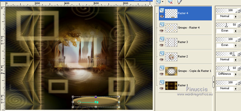 Pour traduire ce tutoriel j'ai utilisé PSPX7, PSPX2 et PSPX3, mais il peut également être exécuté avec les autres versions. Suivant la version utilisée, vous pouvez obtenir des résultats différents. Depuis la version X4, la fonction Image>Miroir a été remplacée par Image>Renverser horizontalement, et Image>Renverser avec Image>Renverser verticalement . Dans les versions X5 et X6, les fonctions ont été améliorées par la mise à disposition du menu Objets. Avec la nouvelle version X7, nous avons encore Image>Miroir et Image>Renverser/Retourner, mais avec nouvelles différences. Voir les détails à ce sujet ici Certaines dénominations ont changées entre les versions de PSP. Les plus frequentes dénominations utilisées: ![]() English translation here Vos versions ici![]() Nécessaire pour réaliser ce tutoriel: Matériel ici Pour le masque merci Cameron. Le reste du matériel est de Maria José. (ici les liens vers les sites des créateurs du matériel) Modules Externes: consulter, si nécessaire, ma section des filtres ici Filters Unlimited 2.0 ici Stereogram Lab Filter ici L&K's - L&K's Katharina ici Toadies - What are you ici Mura's Meister - Pole Transform ici Simple - Top Left Mirror ici Mura's Seamless - Emboss at Alpha ici Horizonaus Mixed Bag - PutitintheCorner ici Carolaine and Sensibility - CS_Texture ici Alien Skin Eye Candy 5 Impact - Extrude ici AAA Filters - Custom ici Filtres Simple, Toadies, Horizonaus et Mura's Seamless peuvent être utilisés seuls ou importés dans Filters Unlimited. voir comment le faire ici). Si un filtre est fourni avec cette icône, ![]() en fonction des couleurs utilisées, vous pouvez changer le mode mélange et l'opacité des calques. Dans les plus récentes versions de PSP, vous ne trouvez pas le dégradé d'avant plan/arrière plan ou Corel_06_029. Vous pouvez utiliser le dégradé des versions antérieures. Ici le dossier Dégradés de CorelX. Placer le preset En cliquant sur le preset une ou deux fois (selon vos réglages) automatiquement il se placera directement dans le dossier Settings de Alien Skin Eye Candy. pourquoi un ou deux clic voir ici Placer la sélection dans le dossier Sélections. Placer le masque 20-20 dans le dossier Masques. Ouvrir le deuxième masque dans PSP et le minimiser avec le reste du matériel. Placer en avant plan la couleur #221703, et en arrière plan la couleur #f8d47e. ![]() Préparer en avant plan un dégradé de premier plan/arrière plan, style Radial. ![]() 1. Ouvrir alphachannel_yedralina. Fenêtre>Dupliquer ou sur le clavier shift+D pour faire une copie. ![]() Fermer l'original. La copie, qui sera la base de votre travail, n'est pas vide, mais contient les sélections enregistrées sur le canal alpha. Remplir l'image transparente du dégradé.2. Effets>Modules Externes>Stereogram - Set Texture ![]() cliquer sur ok pour configurer la texture. ![]() 3. Effets>Modules Externes>Stereogram - Hidden Image Stereogram. ![]() si vous avez problèmes, copie/coller comme nouveau calque le résultat de l'effet fourni dans le matériel; coloriser à votre goût si nécessaire. 4. Effets>Modules Externes>L&K's - L&K's Katharina. ![]() 5. Effets>Effets de réflexion>Miroir rotatif, par défaut. ![]() 6. Effets>Effets de réflexion>Miroir rotatif. ![]() 7. Calques>Dupliquer. Effets>Modules Externes>Toadies - What are you. ![]() 8. Effets>Modules Externes>Mura's Meister - Pole Transform, par défaut. ![]() 9. Effets>Modules Externes>Simple - Top Left Mirror. ![]() Placer le calque en mode Différence et réduire l'opacité à 60%. 10. Effets>Modules Externes>AAA Filters - Custom - cliquer sur Landscape, Brighness -10 et ok. ![]() 11. Vous positionner sur le calque Raster 1. Effets>Modules Externes>Simple - Top Left Mirror. ![]() Répéter Effets>Modules Externes>AAA Filters - Custom 12. Vous positionner sur le calque Copie de Raster 1. Calques>Charger/Enregistrer un masque>Charger à partir du disque. Chercher et charger le masque 20-20. ![]() Calques>Fusionner>Fusionner le groupe. 13. Sélections>Charger/Enregistrer une sélection>Charger à partir d'un canal alpha. La sélection #1 est déjà disponible. On doit seulement cliquer sur Charger. ![]() 14. Calques>Nouveau calque raster. Ouvrir le misted et Édition>Copier. Revenir sur votre travail et Édition>Coller dans la sélection. Réduire l'opacité de ce calque à 85% (si nécessaire). Sélections>Désélectionner tout. 15. Ouvrir le tube deco_marijo - Édition>Copier. Revenir sur votre travail et Édition>Coller comme nouveau calque. Placer le calque en mode Écran. 16. Calques>Nouveau calque raster. Réduire l'opacité de l'outil Pot de peinture à 75%. Remplir le calque avec la couleur claire.Calques>Agencer>Déplacer vers le bas. 17. Calques>Nouveau calque de masque>A partir d'une image. Ouvrir le menu deroulant sous la fenêtre d'origine et vous verrez la liste des images ouvertes. Sélectionner le masque maskcamerontags-retro3. ![]() Calques>Fusionner>Fusionner le groupe. 18. Effets>Modules Externes>Mura's Seamless - Emboss at Alpha, par défaut. ![]() 19. Sélections>Charger/Enregistrer une sélection>Charger à partir d'un canal alpha. Ouvrir le menu des sélections et charger la sélection #2. ![]() Presser CANC sur le clavier ![]() Sélections>Désélectionner tout. 20. Image>Miroir. Image>Renverser. 21. Effets>Modules Externes>Toadies - What Are you. ![]() Placer le calque en mode Écran et réduire l'opacité à 48%. 22. Sélections>Charger/Enregistrer une sélection>Charger à partir d'un canal alpha. Ouvrir le menu des sélections et charger la sélection #3. ![]() Calques>Agencer>Déplacer vers le haut. 23. Calques>Nouveau calque raster. Placer l'opacité de l'outil Pot de peinture à 80. Remplir le calque du dégradé.(Ne pas oublier de placer à nouveau l'opacité de l'outil Pot de Peinture à 100) 24. Réglage>Flou>Flou gaussien - rayon 15. ![]() 25. Effets>Modules Externes>Alien Skin Eye Candy 5 Impact - Extrude. Sélectionner le p