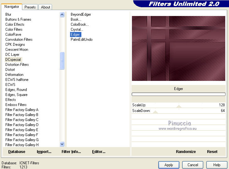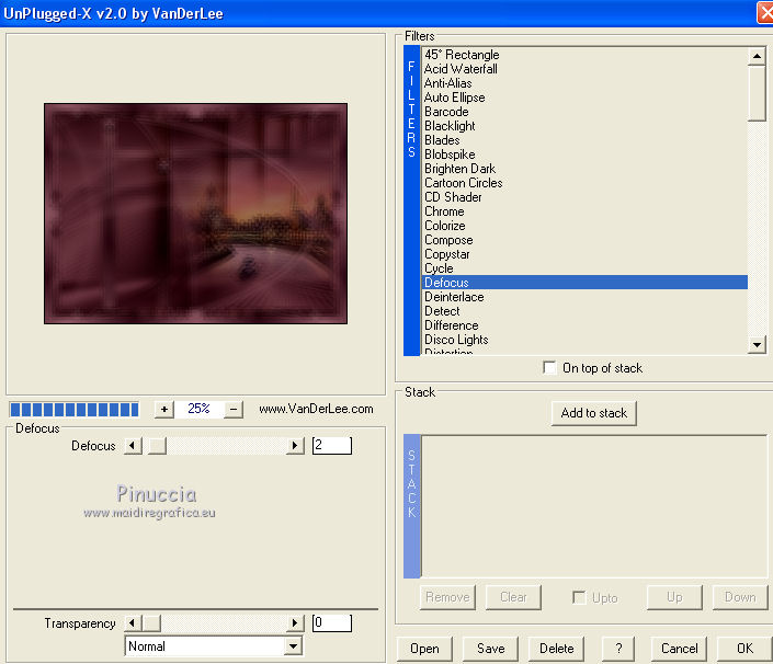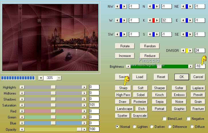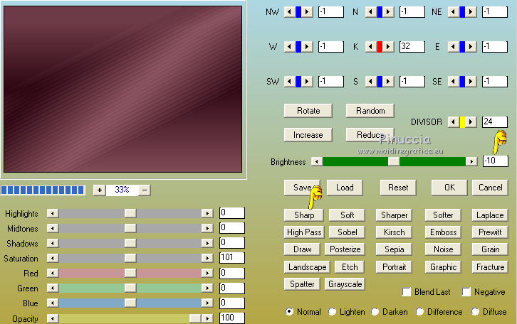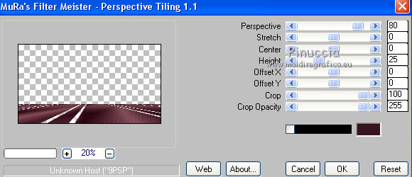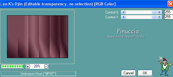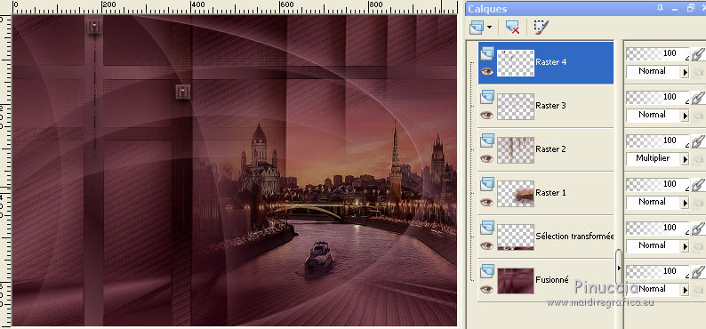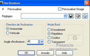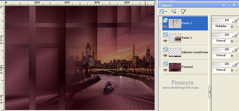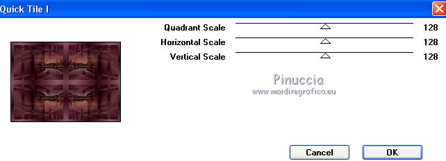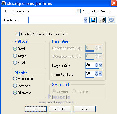 Pour traduire ce tutoriel j'ai utilisé CorelX12, mais il peut également être exécuté avec les autres versions. Suivant la version utilisée, vous pouvez obtenir des résultats différents. Depuis la version X4, la fonction Image>Miroir a été remplacée par Image>Renverser horizontalement, et Image>Renverser avec Image>Renverser verticalement . Dans les versions X5 et X6, les fonctions ont été améliorées par la mise à disposition du menu Objets. Avec la nouvelle version X7, nous avons encore Image>Miroir et Image>Renverser/Retourner, mais avec nouvelles différences. Voir les détails à ce sujet ici Certaines dénominations ont changées entre les versions de PSP. Les plus frequentes dénominations utilisées: ![]() Vos versions ici Nécessaire pour réaliser ce tutoriel: Matériel ici (ici les liens vers les sites des créateurs de tubes) Modules Externes: consulter, si nécessaire, ma section des filtres ici Filters Unlimited 2.0 ici Mura's Meister - Perspective Tiling ici VanDerLee - Unplugged-X ici DC Special - Edger qui L&K's - L&K's Djin ici Graphics Plus - Quick Tile I ici Optionnel AAA Filters - Custom ici Filtres Dc Special et Graphics Plus peuvent être utilisés seuls ou importés dans Filters Unlimited. voir comment le faire ici). Si un filtre est fourni avec cette icône, ![]() en fonction des couleurs utilisées, vous pouvez changer le mode mélange et l'opacité des calques. Dans les plus récentes versions de PSP, vous ne trouvez pas le dégradé d'avant plan/arrière plan ou Corel_06_029. Vous pouvez utiliser le dégradé des versions antérieures. Ici le dossier Dégradés de CorelX. Placer les sélections dans le dossier Sélections. 1. Placer en avant plan la couleur #986470 et en arrière plan la couleur #381420. ![]() Préparer en avant plan un dégradé de premier plan/arrière plan, style Linéaire. ![]() Ouvrir une nouvelle image transparente 1000 x 700 pixels. Remplir l'image transparente du dégradé.2. Effets>Modules Externes>L&K's - L&K's Djin. ![]() 3. Image>Renverser. Répéter Effets>Modules Externes>L&K's - L&K's Djin, comme précédemment. 4. À nuoveau Image>Renverser. Répéter Effets>Modules Externes>L&K's - L&K's Djin, comme précédemment. 5. Effets>Effets géométriques>Inclination. ![]() Édition>Répéter Inclination. 6. Effets>Modules Externes>AAA Filters - Custom - Sharp ![]() 7. Image>Redimensionner, à 70%, redimensionner tous les calques décoché. 8. Effets>Effets d'image>Mosaïque sans jointures. ![]() 9. Calques>Dupliquer. À nouveau Image>Redimensionner, à 70%, redimensionner tous les calques décoché. Effets>Effets d'image>Mosaïque sans jointures, comme précédemment. 10. Calques>Nouveau calque raster. Remplir le calque du dégradé.Calques>Agencer>Placer en bas de la pile. Calques>Fusionner>Calques visibles. 11. Effets>Modules Externes>Filters Unlimited 2.0 - DCspecial - Edger ![]() 12. Sélections>Charger/Enregistrer une sélection>Charger à partir du disque. Chercher et charger la sélection yeva_mj. ![]() Sélections>Transformer la sélection en calque. 13. Effets>Modules Externes>MuRa's Meister - Perspective Tiling. ![]() Sélections>Désélectionner tout. 14. Sélections>Charger/Enregistrer une sélection>Charger à partir du disque. Chercher et charger la sélection yeva_1_mj ![]() Presser 4 fois CANC sur le clavier ![]() Sélections>Désélectionner tout. 15. Sélections>Charger/Enregistrer une sélection>Charger à partir du disque. Chercher et charger la sélection yeva_2_mj. ![]() 16. Ouvrir le misted, effacer le watermark et Édition>Copier. Revenir sur votre travail et Édition>Coller comme nouveau calque. Positionner bien le tube sur la sélection17. Sélections>Inverser. Presser CANC sur le clavier .Sélections>Désélectionner tout. 18. Ouvrir le tube déco yeva_mj et Édition>Copier. Revenir sur votre travail et Édition>Coller comme nouveau calque. Placer le calque en mode Multiplier ou autre ![]() 19. Ouvrir le tube deco_mj et Édition>Copier. Revenir sur votre travail et Édition>Coller comme nouveau calque. 20. Ouvrir le tube déco yeva_2_mj et Édition>Copier. Revenir sur votre travail et Édition>Coller comme nouveau calque. Déplacer le tube en haut à gauche, voir mon exempleLes calques et la tag ![]() Calques>Fusionner>Calques visibles. 21. Optionnel: Répéter Effets>Modules Externes>AAA Filters - Custom, comme précédemment. ![]() 22. Image>Ajouter des bordures, 1 pixels, symétrique, couleur noire. 23. Sélections>Sélectionner tout. Image>Ajouter des bordures, 50 pixels, symétrique, couleur blanche. 24.- Sélections>Inverser. Remplir la sélection du dégradé.25. Effets>Modules Externes>AAA Filters - Custom - Sharp, comme précédemment 26. Effets>Modules Externes>Graphics Plus - Quick Tile I, par défaut. ![]() 27. Effets>Modules Externes>VanDerLee - UnPlugged-X - Defocus ![]() 28. Réglage>Netteté>Davantage de netteté. 29. Effets>Effets 3D>Ombre portée, couleur noire. ![]() Sélections>Inverser. Répéter Effets>Effets 3D>Ombre portée, comme précédemment. Sélections>Désélectionner tout. 30. Ouvrir texto et Édition>Copier. Revenir sur votre travail et Édition>Coller comme nouveau calque. Déplacer le texte à gauche, voir mon exemple.Effets>Effets 3D>Ombre portée, à choix. 31. Ouvrir le tube de la femme, effacer le watermark et Édition>Copier. Revenir sur votre travail et Édition>Coller comme nouveau calque. Déplacer ![]() Effets>Effets 3D>Ombre portée, à choix. 32. Ouvrir le tube déco de Valy, effacer le watermark et Édition>Copier. Revenir sur votre travail et Édition>Coller comme nouveau calque. Déplacer le tube en bas à droite.Effets>Effets 3D>Ombre portée, à choix. 33. Image>Ajouter des bordures, 1 pixel, symétrique, couleur noire. 34. Signer votre travail sur un nouveau calque. Calques>Fusionner>Tous. 35. Image>Redimensionner, 1000 pixels de largeur, redimensionner tous les calques coché. Enregistrer en jpg. Version avec tubes de Thafs et Syl ![]() Vos v