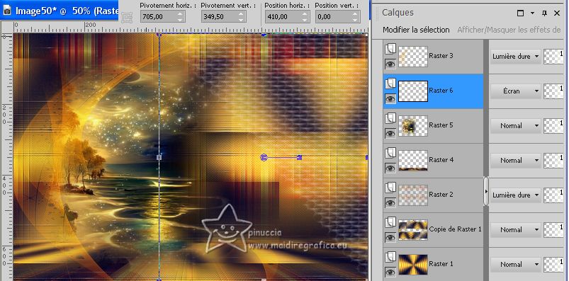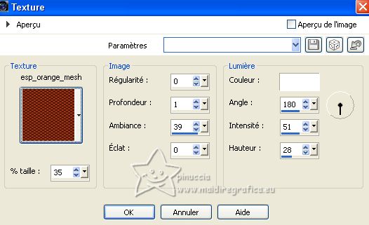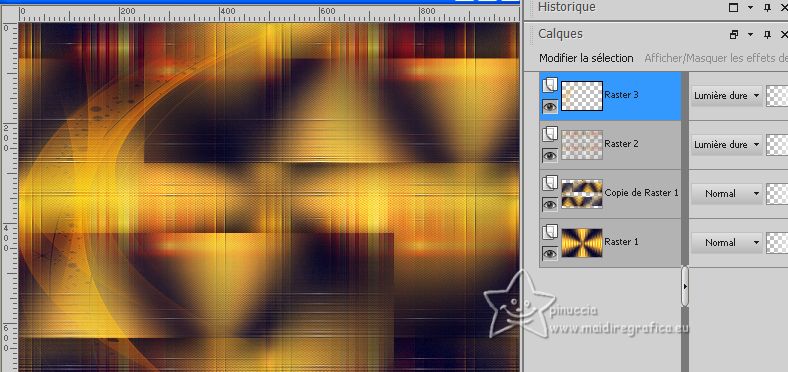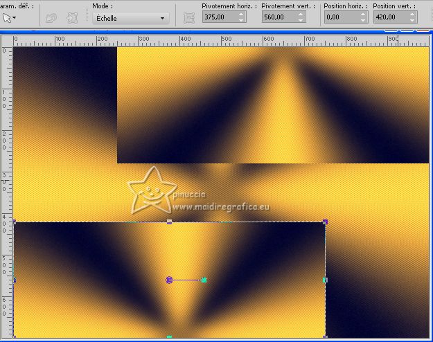 Pour traduire ce tutoriel j'ai utilisé PSPX7, PSPX2 et PSPX3, mais il peut également être exécuté avec les autres versions. Suivant la version utilisée, vous pouvez obtenir des résultats différents. Depuis la version X4, la fonction Image>Miroir a été remplacée par Image>Renverser horizontalement, et Image>Renverser avec Image>Renverser verticalement . Dans les versions X5 et X6, les fonctions ont été améliorées par la mise à disposition du menu Objets. Avec la nouvelle version X7, nous avons encore Image>Miroir et Image>Renverser/Retourner, mais avec nouvelles différences. Voir les détails à ce sujet ici Certaines dénominations ont changées entre les versions de PSP. Les plus frequentes dénominations utilisées: ![]() English translation here Vos versions ici![]() Nécessaire pour réaliser ce tutoriel: ![]() Pour la sélection merci Renée. (ici les liens vers les sites des créateurs du matériel) ![]() consulter, si nécessaire, ma section des filtres ici Mehdi - Wavy Lab 1.1. ici Mura's Meister - Perspective Tiling ici ![]() en fonction des couleurs utilisées, vous pouvez changer le mode mélange et l'opacité des calques. ![]() Placer la sélection dans le dossier Sélections Placer la texture esp_orange_mesk dans le dossier Textures. Placer en avant plan la couleur #040625, et en arrière plan la couleur #eba738. ![]() 1. Ouvrir une nouvelle image transparente 1000 x 700 pixels. 2. Effets>Modules Externes>Mehdi - Wavy Lab 1.1. Ce filtre crée des dégradés avec les couleurs de votre palette: la premiére est la couleur d'arriére plan, la deuxiéme est la couleur d'avant plan. Garder les autres deux couleurs créées par le filtre ![]() 3. Réglage>Flou>Flou gaussien - rayon 25. ![]() 4. Réglage>Ajouter/Supprimer du bruit>Ajouter du bruit. ![]() 5. Effets>Effets de textures>Texture - sélectionner la texture esp_orange_mesh ![]() 6. Calques>Dupliquer. Image>Redimensionner, à 80%, redimensionner tous les calques décoché. 7. Effets>Effets d'image>Décalage. ![]() 8. Calques>Dupliquer. Image>Renverser. 9. Objets>Aligner>Gauche (Position horiz.: 0,00) ![]() Calques>Fusionner>Fusionner le calque de dessous. 10. Effets>Effets d'image>Mosaïque sans jointures. ![]() Effets>Effets 3D>Ombre portée, couleur noire. ![]() 11. Ouvrir MJ-deco ![]() Édition>Copier. Revenir sur votre travail et Édition>Coller comme nouveau calque. Placer le calque en mode Lumière dure. 12. Calques>Nouveau calque raster. Sélections>Charger/Enregistrer une sélection>Charger à partir du disque. Chercher et charger la sélection renee-printemps ![]() Réduire l'opacité de l'outil Pot de peinture à 80% et remplir la sélection avec la couleur claire.13. Réglage>Netteté>Netteté. Sélections>Désélectionner tout. ne pas oublier de placer à nouveau l'opacité de l'outil Pot de peinture à 100 Placer le calque en mode Lumière dure. ![]() 14. Édition>Copie Spéciale>Copier avec fusion. Édition>Coller comme nouveau calque. Image>Miroir. 15. Effets>Modules Externes>Mura's Meister - Perspective Tiling. ![]() 16. Activer l'outil Baguette magique , progressivité 50,et cliquer dans la partie transparente pour la sélectionner. Presser +/-10 fois CANC sur le clavier ![]() Sélections>Désélectionner tout. Calques>Agencer>Déplacer vers le bas. 17. Ouvrir le misted misted-4-MJ ![]() Édition>Copier. Revenir sur votre travail et Édition>Coller comme nouveau calque. 18. Touche K pour activer l'outil Sélecteur ![]() et placer Position horiz.: 52,00 et Position vert.: 8,00. ![]() Touche M pour désélectionner l'outil. 19. Ouvrir MJ-deco-1 ![]() Édition>Copier. Revenir sur votre travail et Édition>Coller comme nouveau calque. 20. Objets>Aligner>Droite (Position horiz.: 410,00). Placer le calque en mode Écran. La tag et les calques - adapter mode mélange et opacité à votre goût. ![]() 21. Vous positionner sur le calque du haut de la pile. Ouvrir le tube de la femme mistedface-MJ ![]() Édition>Copier. Revenir sur votre travail et Édition>Coller comme nouveau calque. Déplacer le tube à droite.22. Image>Ajouter des bordures, 1 pixel, symétrique, couleur foncée. Image>Ajouter des bordures, 1 pixel, symétrique, couleur claire. Image>Ajouter des bordures, 1 pixel, symétrique, couleur foncée. 23. Sélections>Sélectionner tout. Édition>Copier Image>Ajouter des bordures, 50 pixels, symétrique, couleur blanche. 24. Sélections>Inverser. Édition>Coller dans la sélection. 25. Réglage>Flou>Flou gaussien - rayon 25. ![]() Garder sélectionné. 26. Calques>Nouveau calque raster. Ouvrir bordas-MJ ![]() Édition>Copier. Revenir sur votre travail et Édition>Coller dans la sélection. Placer le calque en mode Écran, ou autre. 27. Effets>Effets 3D>Ombre portée, couleur noire. ![]() Sélections>Désélectionner tout. 28. Signer votre travail sur un nouveau calque. Image>Ajouter des bordures, 1 pixel, symétrique, couleur foncée. Image>Redimensionner, 1000 pixels de largeur, redimensionner tous les calques coché. Enregistrer en jpg. Pour les tubes de cette version merci Yoka et Jewel ![]() ![]() Si vous avez des problèmes, ou des doutes, ou vous trouvez un link modifié, ou seulement pour me dire que ce tutoriel vous a plu, vous pouvez m'écrire. |