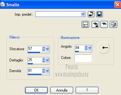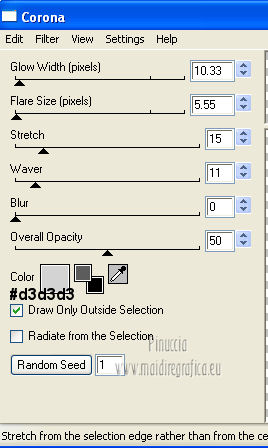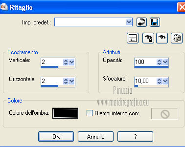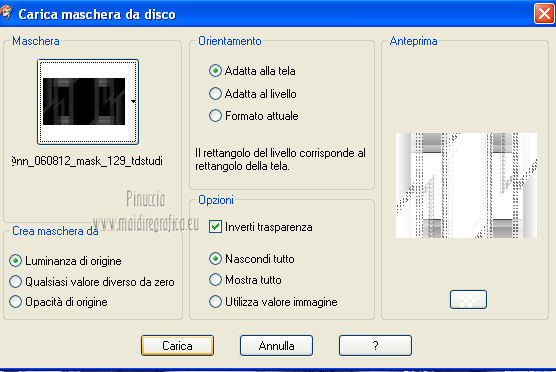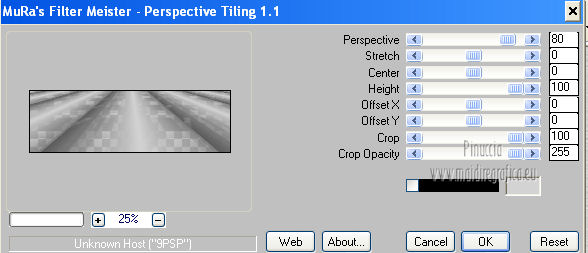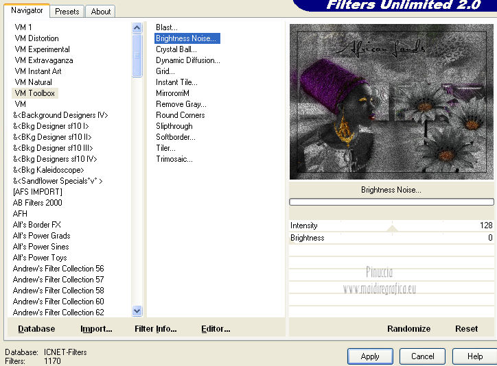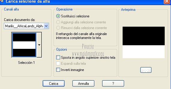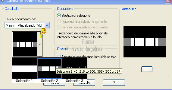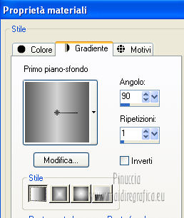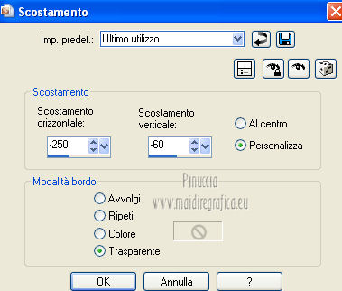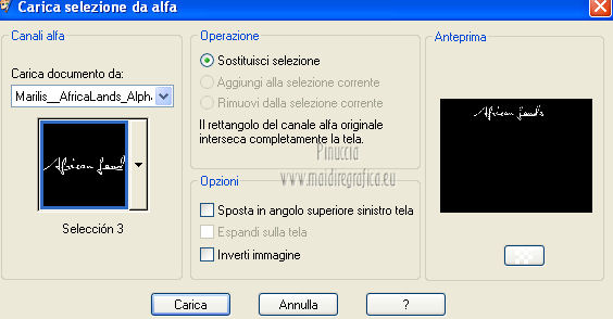 qui puoi trovare qualche risposta ai tuoi dubbi. Se l'argomento che ti interessa non è presente, ti prego di segnalarmelo. Questo tutorial è stato scritto e tradotto con Corel X, ma può essere eseguito anche con le altre versioni di PSP. Il materiale viene da vari gruppi di condivisione. Il copyright appartiene ai rispettivi autori. Grazie ai creatori dei tubes che mettono a disposizione il loro lavoro in vari gruppi di condivisione. Occorrente: Materiale qui I tubes utilizzati in questo tutorial sono di Mary, Magie, Athenais e Guismo La maschera è di @nn TDStudio Rispetta il lavoro degli autori. Non togliere il watermark e non modificare o cambiare nome al tube. Filtri: consulta, se necessario, la mia sezione filtri qui Filters Unlimited 2.0 qui VM Toolbox - Brightness Noise qui Alien Skin Eye Candy 5 Impact qui Eye Candy 4000 - Corona qui Mura's Meister - Perspective Tiling qui L&K - L&K Zitah qui Flaming Pear - Chroma Solarize qui Dragonfly - Sinedots II qui ![]() Se stai usando altri colori puoi sperimentare le modalità di miscelatura e le opacità più adatte ai tuoi colori. Metti il preset nella cartella del filtro Alien Skin Eye Candy 5 Impact>Settings>Glass. Con un clic sul file il preset sarà automaticamente installato nella cartella corretta. Metti la maschera nella cartella Maschere. 1. Apri "Marilis_AfricaLands_Alpha". Questa immagine - che sarà la base del tuo lavoro - non è vuota, ma contiene le selezioni salvate sul canale alfa. Premi sulla tastiera il tasto CANC per eliminare il watermark. 2. Imposta il colore di primo piano con il colore nero #000000, e riempi l'immagine trasparente con il colore nero.3. Livelli>Nuovo livello raster. Selezione>Seleziona tutto. 4. Apri la trama "grena4.jpg" e vai a Modifica>Copia. Torna al tuo lavoro e vai a Modifica>Incolla nella selezione. Selezione>Deseleziona. Cambia la modalità di miscelatura di questo livello in Luce netta. 5. Imposta il colore di primo piano con #5c5c5c, e il colore di sfondo con #d3d3d3. Passa il colore di primo piano a Gradiente, stile lineare, con i seguenti settaggi. ![]() 6. Livelli>Nuovo livello raster. Riempi con il gradiente.7. Livelli>Carica/Salva maschera>Carica maschera da disco. Cerca e carica la maschera @nn_060812_mask_tdstudio. ![]() Livelli>Unisci>Unisci gruppo. 8. Selezione>Carica/Salva selezione>Carica selezione da canale alfa. La selezione "selecciòn#1" è già presente. Devi soltanto cliccare Carica. ![]() 9. Effetti>Plugins>Mura's Meister - Perspective Tiling. ![]() Selezione>Deseleziona. 10. Effetti>Plugins>Flaming Pear - ChromaSolarize. 11. Effetti>Plugins>L&K - L&K Zitah. ![]() 12. Livelli>Nuovo livello raster. Selezione>Carica/Salva selezione>Carica selezione da canale alfa. Carica nuovamente "selecciòn#1". ![]() 13. Selezione>Inverti. Apri il tube Marilis_PaisajeAfricaLands e vai a Modifica>Copia. Torna al tuo lavoro e vai a Modifica>Incolla nella selezione. Cambia la modalità di miscelatura di questo livello in Sovrapponi. Selezione>Deseleziona. 14. Livelli>Nuovo livello raster. Effetti>Plugins>Dragonfly - Sinedots II. ![]() Cambia la modalità di miscelatura di questo livello in Luce diffusa. 15. Apri il tube "Magie658" e vai a Modifica>Copia. Torna al tuo lavoro e vai a Modifica>Incolla come nuovo livello. 16. Effetti>Effetti di immagine>Scostamento. ![]() 17. Regola>Tonalità e saturazione>Viraggio. ![]() Abbassa l'opacità di questo livello al 70%. 18. Apri il tube "athe-HP5" e vai a Modifica>Copia. Torna al tuo lavoro e vai a Modifica>Incolla come nuovo livello. 19. Regola>Tonalità e saturazione>Viraggio, con i settaggi precedenti. ![]() 20. Effetti>Effetti di immagine>Scostamento. ![]() Abbassa l'opacità di questo livello al 70%. 21. Apri il tube "Mary 0812-73" e vai a Modifica>Copia. Torna al tuo lavoro e vai a Modifica>Incolla come nuovo livello. 22. Immagine>Ridimensiona, al 70%, bicubica, tutti i livelli non selezionato. ![]() 23. Immagine>Rifletti. Effetti>Effetti di immagine>Scostamento. ![]() 24. Apri il tube "cal-guis-beauteafricaine-27102008" e vai a Modifica>Copia. Torna al tuo lavoro e vai a Modifica>Incolla come nuovo livello. Immagine>Rifletti. Immagine>Ridimensiona, all'85%, bicubica, tutti i livelli non selezionato. 25. Effetti>Effetti di immagine>Scostamento. ![]() 26. Livelli>Duplica, e attiva il livello sottostante dell'originale. 27. Regola>Sfocatura>Sfocatura gaussiana - raggio 15. ![]() 28. Attiva nuovamente il livello superiore della copia. Selezione>Carica/Salva selezione>Carica selezione da disco. Apri il menu delle selezioni e carica Seleccion#2. ![]() 29. Modifica>Copia Unione. Modifica>Incolla come nuova IMMAGINE. Immagine>Rifletti. Modifica>Copia. 30. Torna al tuo lavoro e attiva il livello della maschera. ![]() 31. Livelli>Nuovo livello raster. Imposta il colore di primo piano con il colore bianco #ffffff, e riempi il livello con il colore bianco.Selezione>Modifica>Contrai - 2 pixels. Mantieni selezionato. 32. Livelli>Nuovo livello raster. Modifica>Incolla nella selezione. Mantieni ancora selezionato. 33. Effetti>Effetti artistici>Smalto. ![]() 34. Effetti>Plugins>Alien Skin Eye Candy 5 Impact - Glass, seleziona il preset AfricaLands_Glass e ok. ![]() Selezione>Deseleziona. Livelli>Unisci>Unisci giù. 35. Effetti>Plugins>Alien Skin Eye Candy 5 Impact - Perspective Shadow. Seleziona il preset Drop Shadow,Blurry e ok. ![]() 36. Attiva nuovamente il livello superiore della copia del tube. 37. Livelli>Nuovo livello raster. Selezione>Carica/Salva selezione>Carica selezione da disco. Apri il menu delle selezioni e carica Seleccion#3. ![]() Imposta il colore di primo piano con il colore nero #000000. Riempi la selezione con il colore nero.Selezione>Deseleziona. 38. Effetti>Effetti 3D>Sfalsa ombra, con il colore nero. ![]() 39. Effetti>Plugins>Eye Candy 4000 - Corona Color: #d3d3d3. ![]() 40. Modifica>Copia Unione. 41. Immagine>Aggiungi bordatura, 2 pixels, simmetriche, con il colore nero. Selezione>Seleziona tutto. Immagine>Aggiungi bordatura, 30 