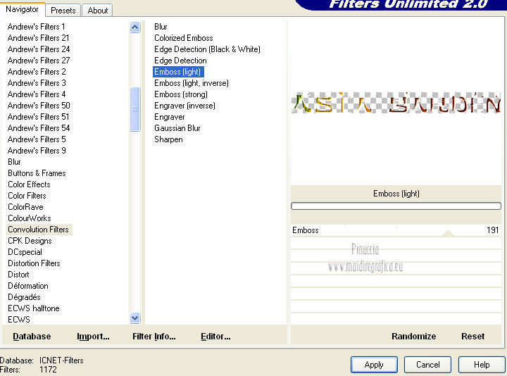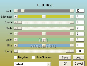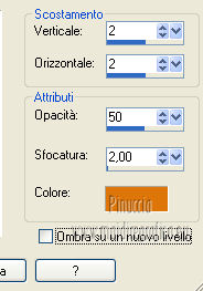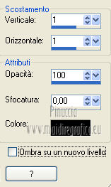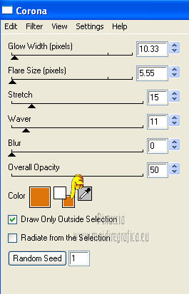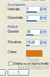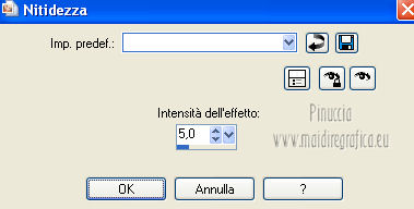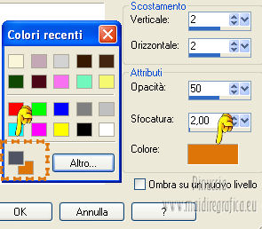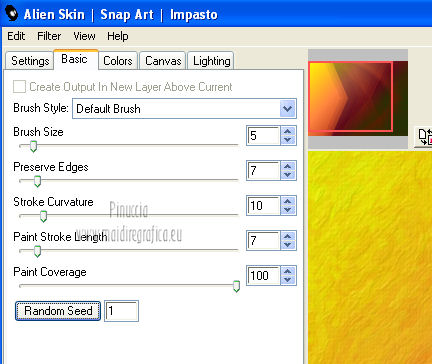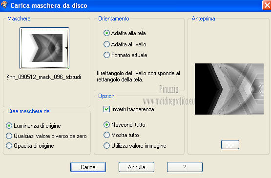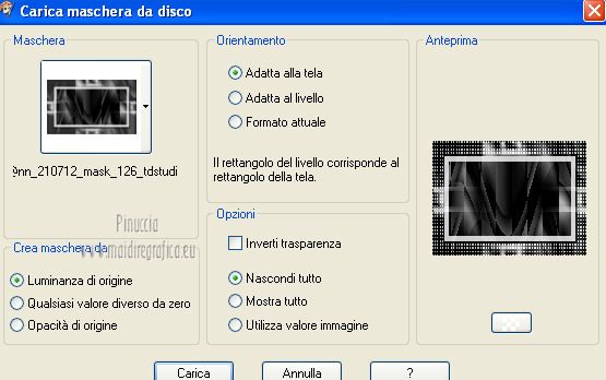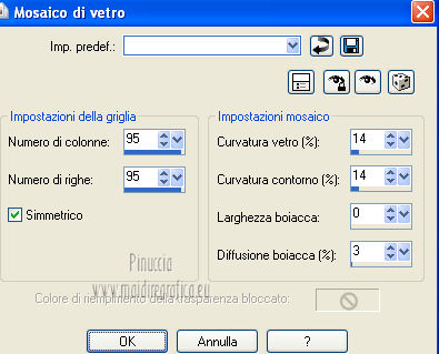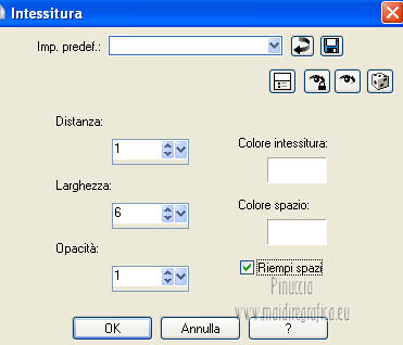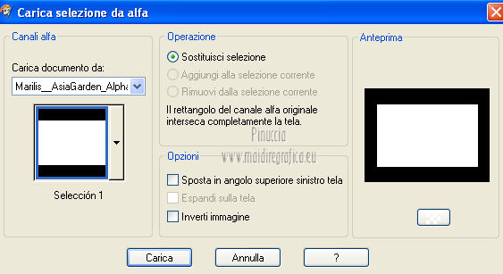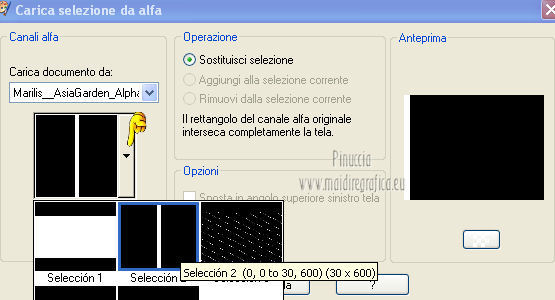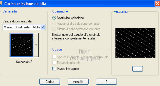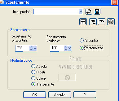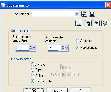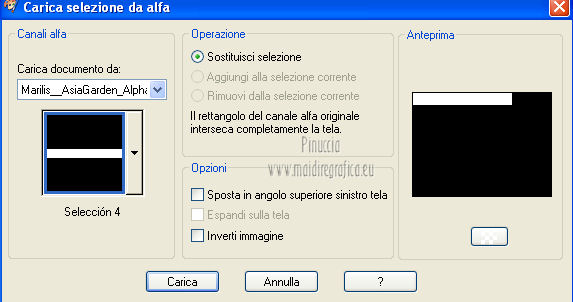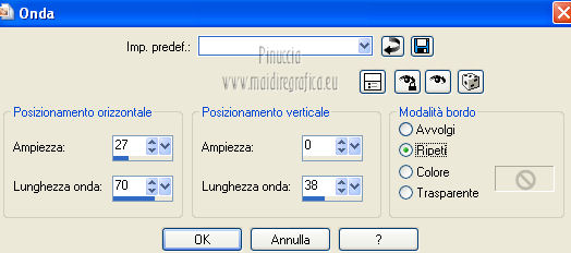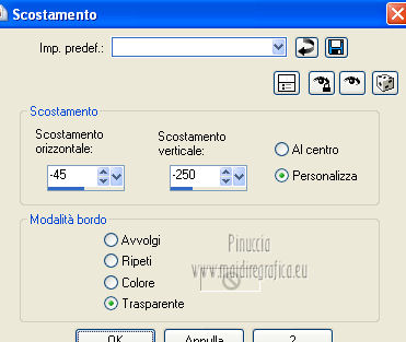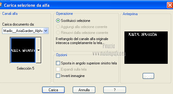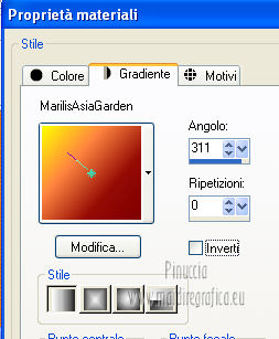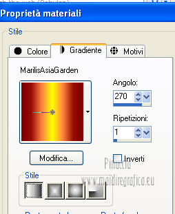 qui puoi trovare qualche risposta ai tuoi dubbi. Se l'argomento che ti interessa non è presente, ti prego di segnalarmelo. Questo tutorial è stato scritto e tradotto con Corel X, ma può essere eseguito anche con le altre versioni di PSP. Il materiale viene da vari gruppi di condivisione. Il copyright appartiene ai rispettivi autori. Grazie ai creatori dei tubes che mettono a disposizione il loro lavoro in vari gruppi di condivisione. Occorrente: Materiale qui I tubes utilizzati in questo tutorial sono di LuzCristina, JHanna e Luna. Le maschere sono di @nn TD Studio Rispetta il lavoro degli autori. Non cancellare il watermark e non modificare o cambiare nome al tube. Filtri: consulta, se necessario, la mia sezione filtri qui Filters Unlimited 2.0 qui AAA Frames - Foto Frame qui Eye Candy 4000 - Corona qui Alien Skin Snap Art - Impasto qui ![]() Se stai usando altri colori puoi sperimentare le modalità di miscelatura e le opacità più adatte ai tuoi colori. Metti il gradiente MarilisAsiaGarden nella cartella Gradienti. Metti le maschere nella cartella Maschere. 1. Passa il colore di primo piano a Gradiente, e seleziona il gradiente MarilisAsiaGarden, con i seguenti settaggi. ![]() Imposta il colore di sfondo con #de750a. 2. Apri "Marilis_Asia_Garden_Alpha". Questa immagine - che sarà la base del tuo lavoro - non è vuota, ma contiene le selezioni salvate sul canale alfa. Premi sulla tastiera il tasto CANC per eliminare il watermark. 3. Riempi l'immagine trasparente con il gradiente.4. Livelli>Nuovo livello raster. Riempi con il colore di sfondo #de750a.5. Livelli>Carica/Salva maschera>Carica maschera da disco. Cerca e seleziona la maschera @nn_090512_mask_096_tdstudio. ![]() Livelli>Unisci>Unisci gruppo. Effetti>Effetti di bordo>Aumenta. 6. Effetti>Effetti di trama>Intessitura. entrambi i colori impostati con il colore bianco ![]() 7. Effetti>Effetti 3D>Sfalsa ombra, con il colore di sfondo #de750a. cliccando con il tasto destro del mouse sulla palettina del colore, avrai la tabella dei colori recenti. In basso a sinistra, i tuoi colori di primo piano e sfondo. Clicca sulla palettina corrispondente per impostare il colore. ![]() Cambia la modalità di miscelatura di questo livello in Differenza, e abbassa l'opacità al 50%. 8. Livelli>Unisci>Unisci visibile. Finestra>Duplica (o, sulla tastiera, maiuscola+D), per fare una copia dell'immagine. Minimizza la copia che userai più tardi per lo sfondo. 9. Torna al tuo lavoro. Livelli>Nuovo livello raster. Riempi con il colore di sfondo #de750a.10. Livelli>Carica/Salva maschera>Carica maschera da disco. Cerca e seleziona la maschera @nn_210712_mask_126_tdstudio. ![]() Livelli>Unisci>Unisci gruppo. Cambia la modalità di miscelatura di questo livello in Moltiplica. 11. Effetti>Effetti 3D>Sfalsa ombra, con i settaggi precedenti. ![]() 12. Livelli>Nuovo livello raster. Selezione>Carica/Salva selezione>Carica selezione da canale alfa. La selezione "selecciòn#1" è già presente. Devi soltanto cliccare Carica. ![]() 13. Apri il tube "lunapaisagem1464" e vai a Modifica>Copia. Torna al tuo lavoro e vai a Modifica>Incolla nella selezione. Selezione>Deseleziona. Livelli>Disponi>Sposta giù. Abbassa l'opacità di questo livello al 50%. 14. Attiva il livello superiore (il livello della maschera). Selezione>Carica/Salva selezione>Carica selezione da canale alfa. Apri il menu delle selezioni e carica "selecciòn#2" . ![]() 15. Cambia i settaggi del gradiente. ![]() Riempi la selezione con il gradiente.Selezione>Deseleziona. 16. Effetti>Effetti di trama>Mosaico di vetro. ![]() 17. Effetti>Effetti 3D>Sfalsa ombra, con il colore di sfondo #de750a. ![]() Cambia la modalità di miscelatura di questo livello in Differenza. 18. Livelli>Duplica. Immagine>Rifletti. 19. Livelli>Nuovo livello raster. Selezione>Carica/Salva selezione>Carica selezione da canale alfa. Apri il menu delle selezioni e carica "selecciòn#3". ![]() 20. Imposta il colore di primo piano con il colore bianco #ffffff. Riempi la selezione con il colore bianco #ffffff.Selezione>Deseleziona. Cambia la modalità di miscelatura di questo livello in Luce diffusa, e abbassa l'opacità al 65%. 21. Effetti>Effetti di distorsione>Onda. ![]() 22. Apri il tube "TReagen3534_29_7_012" e vai a Modifica>Copia. Torna al tuo lavoro e vai a Modifica>Incolla come nuovo livello. Immagine>Ridimensiona, all'80%, bicubica, tutti i livelli non selezionato. ![]() 23. Effetti>Effetti di immagine>Scostamento. ![]() Cambia la modalità di miscelatura di questo livello in Filtra, e abbassa l'opacità al 70%. 24. Apri il tube "JHanna_568 tube" e vai a Modifica>Copia. Torna al tuo lavoro e vai a Modifica>Incolla come nuovo livello. Immagine>Ridimensiona, 2 volte al 70%, bicubica, tutti i livelli non selezionato. ![]() Regola>MEssa a fuoco>Metti a fuoco. 25. Effetti>Effetti 3D>Sfalsa ombra, con il colore nero #000000. ![]() 26. Effetti>Effetti di immagine>Scostamento. ![]() 27. Apri il tube "43-luzcristina" e vai a Modifica>Copia. Torna al tuo lavoro e vai a Modifica>Incolla come nuovo livello. Immagine>Rifletti. 28. Effetti>Effetti di immagine>Scostamento. ![]() 29. Regola>Luminosità e contrasto>Nitidezza. ![]() 30. Livelli>Duplica, e attiva il livello sottostante dell'originale. Regola>Sfocatura>Sfocatura gaussiana - raggio 40. ![]() Cambia la modalità di miscelatura di questo livello in Filtra. 31. Attiva il livello superiore della copia. Effetti>Effetti 3D>Sfalsa ombra, con il colore nero #000000. ![]() 32. Selezione>Carica/Salva selezione>Carica selezione da canale alfa. Apri il menu delle selezioni e carica "selecciòn#4". ![]() 33. Modifica>Copia Unione. Selezione>Deseleziona. 34. Livelli>Nuovo livello raster. Selezione>Carica/Salva selezione>Carica selezione da canale alfa. Apri il menu delle selezioni e carica "selecciòn#5". ![]() Riempi la selezione con il colore bianco #ffffff.35. Selezione>Modifica>Contrai - 2 pixels. Modifica>Incolla nella selezione. Mantieni selezionato. 36. Effetti>Plugins>Filters Unlimite