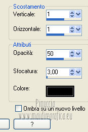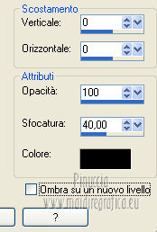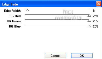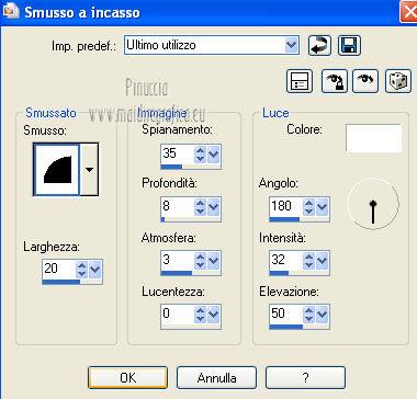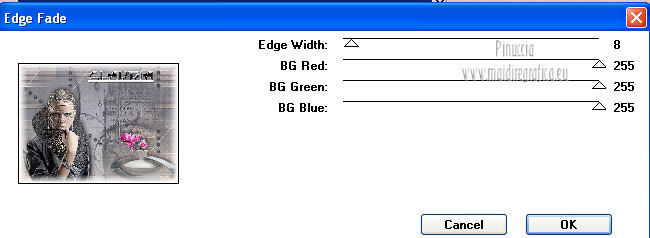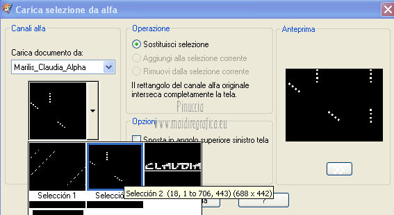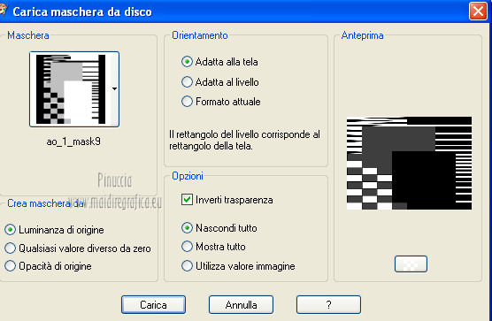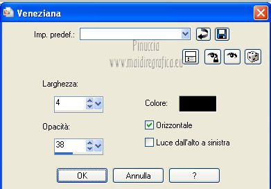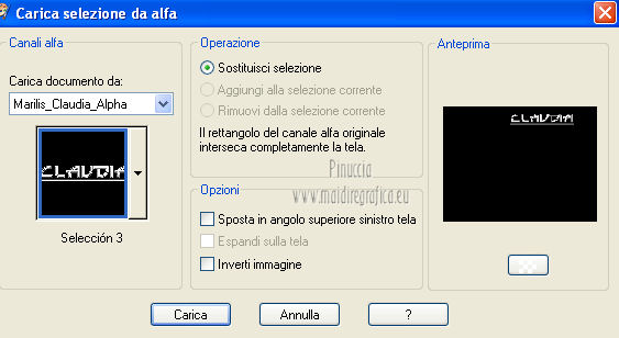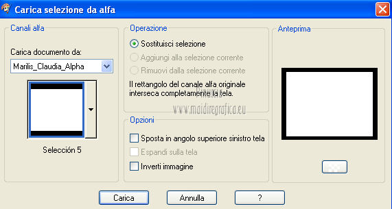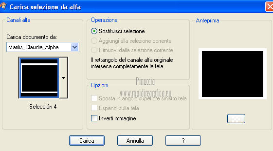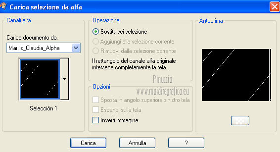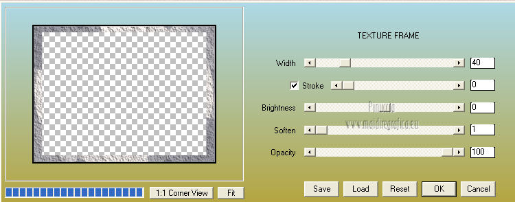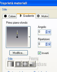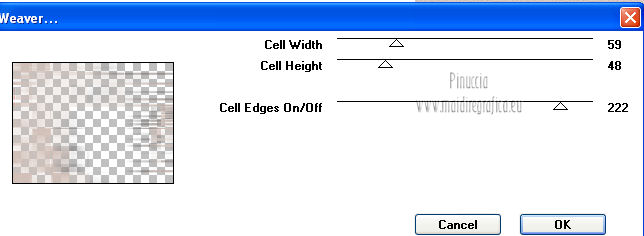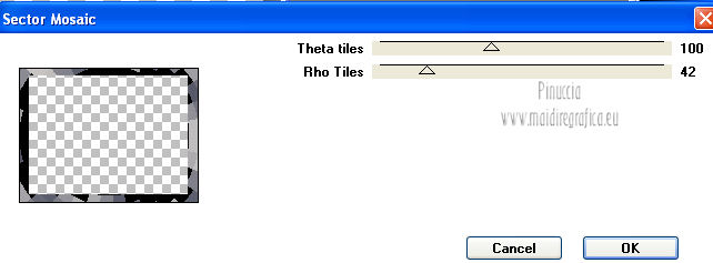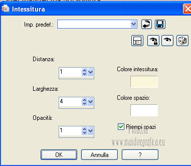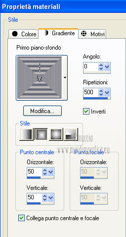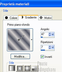 qui puoi trovare qualche risposta ai tuoi dubbi. Se l'argomento che ti interessa non è presente, ti prego di segnalarmelo. Questo tutorial è stato scritto e tradotto con Corel X, ma può essere eseguito anche con le altre versioni di PSP. Il materiale viene da vari gruppi di condivisione. Il copyright appartiene ai rispettivi autori. Grazie ai creatori dei tubes che mettono a disposizione il loro lavoro in vari gruppi di condivisione. Occorrente: Materiale qui I tubes utilizzati in questo tutorial sono di Aclis, Grace's, Mary . Rispetta il lavoro degli autori. Non cancellare il watermark e non modificare o cambiare nome al tube. Filtri: consulta, se necessario, la mia sezione filtri qui Filters Unlimited 2.0 qui AAA Frames - Texture Frame qui Carolaine and Sensibility - CS Texture qui ECWS - Edge Fade qui Alien Skin Eye Candy 5 Impact - Glass qui FM Tile Tools - Blend Emboss qui Funhouse - Sector Mosaico qui Graphics Plus qui Toadies - Weaver qui Penta.com - Color dot qui ![]() Se stai usando altri colori puoi sperimentare le modalità di miscelatura e le opacità più adatte ai tuoi colori. Metti la maschera nella cartella Maschere. 1. Imposta il colore di primo piano con #505363, e il colore di sfondo con #d3cfcd. Passa il colore di primo piano a Gradiente, stile Lineare. ![]() 2. Apri "Marilis_Claudia_Alpha". Questa immagine - che sarà la base del tuo lavoro - non è vuota, ma contiene le selezioni salvate sul canale alfa. Riempi l'immagine trasparente con il gradiente.3. Effetti>Plugins>Carolaine and Sensibility - CS_texture. ![]() 4. Livelli>Nuovo livello raster. Imposta il colore di primo piano con #d3c1b9, e riempi il livello con questo colore.5. Livelli>Carica/Salva maschera>Carica maschera da disco. Cerca e carica la maschera ao_1mask9. ![]() Livelli>Unisci>Unisci gruppo. 6. Effetti>Plugins>Toadies - Weaver. ![]() 7. Effetti>Plugins>Graphics Plus - Horizontal Mirror. ![]() Regola>Messa a fuoco>Accentua messa a fuoco. 8. Effetti>Effetti 3D>Sfalsa ombra. ![]() 9. Effetti>Plugins>Penta.com - Color dot. ![]() Abbassa l'opacità di questo livello all'80%. 10. Livelli>Nuovo livello raster. Selezione>Seleziona tutto. Apri il tube "aclis_steampunk_02_22_07_2012.psp" e vai a Modifica>Copia. Torna al tuo lavoro e vai a Modifica>Incolla nella selezione. Selezione>Deseleziona. 11. Effetti>Plugins>FM Tile Toolds - Blend Emboss. ![]() Cambia la modalità di miscelatura di questo livello in Luminanza (esistente), e abbassa l'opacità al 50%. 12. Livelli>Nuovo livello raster. Selezione>Carica/Salva selezione>Carica selezione da canale alfa. La selezione "selecciòn#1" è già presente. Devi soltanto cliccare Carica. ![]() Imposta il colore di primo piano con il colore bianco #ffffff, e riempi la selezione con questo colore.Mantieni selezionato. 13. Effetti>Effetti di trama>Veneziana. ![]() Effetti>Effetti di bordo>Aumenta. Selezione>Deseleziona. Cambia la modalità di miscelatura di questo livello in Filtra, e abbassa l'opacità al 60%. 14. Riporta il colore di primo piano al colore #505363 il colore di sfondo è sempre #d3cfcd. Passa il colore di primo piano a Gradiente, stile Rettangolare, con i seguenti settaggi. ![]() 15. Livelli>Nuovo livello raster. Selezione>Carica/Salva selezione>Carica selezione da canale alfa. Apri il menu delle selezioni e carica "selecciòn#2". ![]() Riempi la selezione con il gradiente rettangolare.Mantieni selezionato. 16. Effetti>Plugins>Alien Skin Eye Candy 5 Impact - Glass seleziona il preset Clear e ok. ![]() Selezione>Deseleziona. 17. Apri il tube Grace's_TLC_Brocate.psp e vai a Modifica>Copia. Torna al tuo lavoro e vai a Modifica>Incolla come nuovo livello. 18. Effetti>Effetti di immagine>Scostamento. ![]() 19. Effetti>Effetti 3D>Sfalsa ombra. ![]() 20. Apri il tube "Mary 180312-6.psp" e vai a Modifica>Copia. Torna al tuo lavoro e vai a Modifica>Incolla come nuovo livello. Immagine>Rifletti. Immagine>Ridimensiona, al 50%, bicubica, tutti i livelli non selezionato. ![]() 21. Effetti>Effetti di immagine>Scostamento. ![]() 22. Effetti>Effetti 3D>Sfalsa ombra. ![]() 23. Livelli>Nuovo livello raster. Selezione>Carica/Salva selezione>Carica selezione da canale alfa. Apri il menu delle selezioni e carica "selecciòn#3". ![]() Imposta il colore di primo piano con #0d0b0c, e riempi la selezione con questo colore.Mantieni selezionato. 24. Effetti>Effetti 3D>Smusso a incasso. ![]() 25. Effetti>Effetti di trama>Intessitura. Colore intessitura: #f8f6da - riempi spazi: bianco #ffffff. ![]() 26. Effetti>Effetti 3D>Sfalsa ombra, con il colore bianco. ![]() Abbassa l'opacità di questo livello al 95%. 26. Livelli>Unisci>Unisci visibile. 27. Selezione>Seleziona tutto. Selezione>Modifica>Contrai - 2 pixels. 28. Effetti>Plugins>ECWS - Edge Fade. ![]() Selezione>Inverti. Imposta nuovamente il colore di primo piano con #505363, e riempi la selezione con questo colore.Selezione>Deseleziona. 30. Immagine>Ridimensiona, al 90%, tutti i livelli non selezionato. Chiudi momentaneamente il livello. 31. Livelli>Nuovo livello raster. Livelli>Disponi>Sposta giù. Selezione>Carica/Salva selezione>Carica selezione da canale alfa. Apri il menu delle selezioni e carica "selecciòn#4". ![]() 32. Con colori di primo piano #505363 e sfondo #d3cfcd passa il colore di primo piano a Gradiente, con i seguenti settaggi: ![]() Riempi la selezione con il gradiente.33. Effetti>Plugins>Funhouse - Sector Mosaic attenzione, l'Effetto Sector Mosaic ha una particolarità: una volta inserito nei Percorsi files, non lo trovi sotto Funhouse, ma sotto Pixelate>Sector Mosaic. ![]() Selezione>Deseleziona. 34. Livelli>Duplica. Immagine>Rifletti. Immagine>Capovolgi. Abbassa l'opacità di questo livello al 50%. 35. Livelli>Unisci>Unisci giù. 36. Effetti>Plugins>AAA Frames - Texture Frame. ![]() 37. Effetti>Plugins>Graphics Plus - Cross Shadow - 2 volte con i settaggi standard. ![]() 38. Selezione>Seleziona tutto. Selezione>Modifica>Contrai - 2 pixels. 39. Effetti>Plugins>ECWS - Edge Fade. ![]() 40. Apri e attiva il