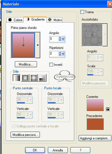 1. Scegliamo un colore scuro per il primo piano e uno chiaro per lo sfondo. Passiamo il colore di primo piano a gradiente, angolo 0 ripetizioni 0.