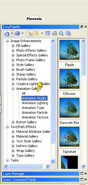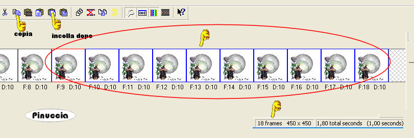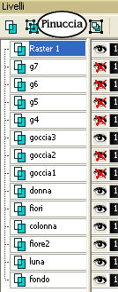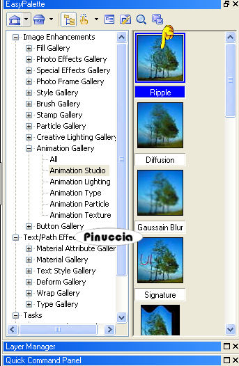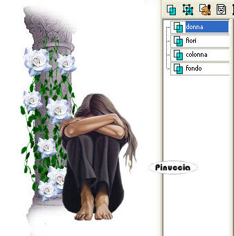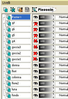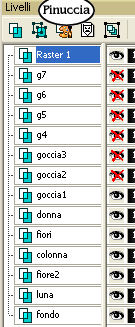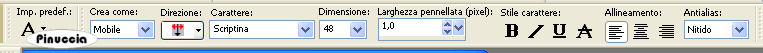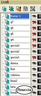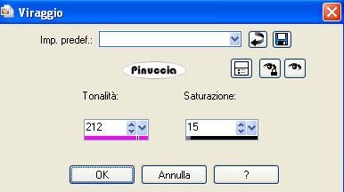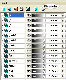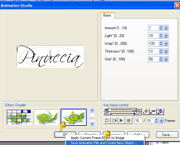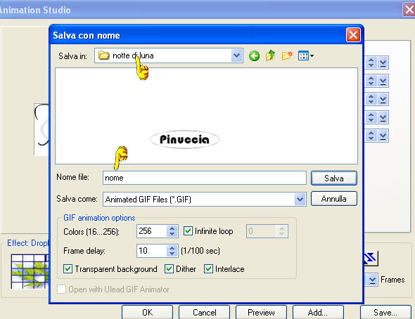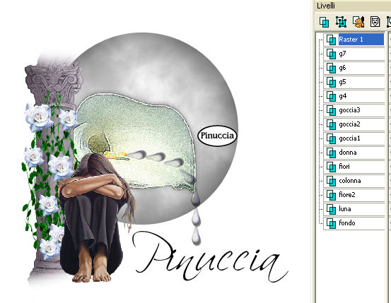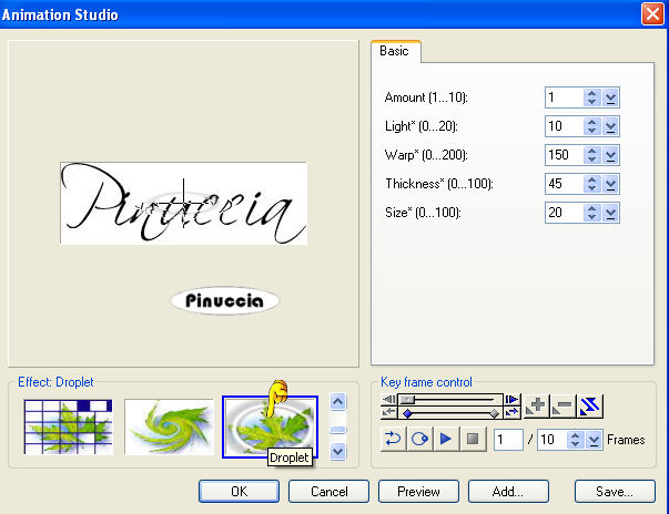 qui puoi trovare qualche risposta ai tuoi dubbi. Se l'argomento che ti interessa non è presente, ti prego di segnalarmelo. Questo tutorial è stato scritto con PSP 9, ma può essere realizzato con qualsiasi versione del programma. Occorrente: Paint Shop Pro 8 o 9 Jasc Animation Shop Photo Impact 10 Filtro Mura's Meister - Cloud qui Materiale qui Per realizzare questo tutorial è necessaria una buona conoscenza del lavoro con i livelli e le animazioni. Con il materiale trovi un secondo zip che contiene uno script, che devi mettere nella cartella Script ristretti, e una trama (che serve per realizzare lo script), che devi mettere nella cartella Motivi di PSP. Apri una nuova immagine trasparente 450 x 450 pixels. Riempila con il colore bianco.Apri il tube BlueStone e vai a Modifica>copia. Torna al tuo lavoro e vai a Modifica>Incolla>Incolla come nuovo livello. Attiva lo strumento Selezione a mano libera così impostato: ![]() Seleziona tutto il tube eccetto la colonna a sinistra: ![]() quando rilascerai il tasto del mouse la selezione si allargherà per effetto della sfumatura Sulla tastiera premi il tasto CANC. Selezione>Nessuna selezione. Rimani su questo livello. Regola>Saturazione e tonalità>Viraggio: ![]() e nella finestra che si apre metti questi valori: ![]() Apri il tube "RoseVine". Questo tube è formato da due livelli. Vai a Modifica>Copia Unione. Torna al tuo lavoro e vai a Modifica>Incolla>Incolla come nuovo livello. Posizionalo sulla colonna.![]() Apri il tube della donna Immagine>Ridimensiona, 60%, tutti i livelli selezionato: ![]() Modifica>Copia. Torna al tuo lavoro e vai a Modifica>Incolla>Incolla come nuovo livello. ![]() Apri il tube "ccd-ff02". Immagine>Ridimensiona, 80%, tutti i livelli selezionato. Seleziona lo script tp-Manet (se non vedi la finestra dello strumento nella barra superiore di PSP vai a Visualizza>Barre degli strumenti>Script. Clicca sulla freccia alla destra del nome dello script: ![]() e lo script comincerà a lavorare. Alla fine il tube avrà 4 livelli: ![]() Elimina il livello superiore, quello che ha l'opacità al 50% (posizionati sul livello e vai a Livelli>Elimina). e unisci il resto dei livelli (Livelli>Unisci>Unisci visibile). ![]() Modifica>Copia. Ritorna al tuo lavoro, posizionati sul livello "Fondo" e vai a Modifica>Incolla>Incolla come nuovo livello. Posiziona il tube e nella paletta dei livelli rinomina il livello "Fiore2".La paletta dei livelli adesso sarà questa: ![]() Adesso andiamo a creare la luna. Posizionati sul livello fondo e vai a Livelli>Nuovo livello raster, e nominalo "luna". ![]() Attiva lo strumento Selezione così impostato:![]() e disegna un cerchio, pressappoco come nel mio esempio: ![]() riempi il cerchio con il bianco.Effetti>Plugins>Mura's Meister / Cloud, con il colore di sfondo #c0c0c0. ![]() Selezione>Inverti. Effetti>Effetti 3D>Sfalsa ombra, con i seguenti settaggi: ![]() Selezione>Nessuna selezione. Apri il tube della goccia e vai a Modifica>Copia. Torna al tuo lavoro e vai a Modifica>Incolla>Incolla come nuovo livello. Ruota un po' la goccia: Immagine>Ruota>Ruota per gradi: ![]() Posiziona la goccia come nell'esempio.![]() Livelli>Duplica e ripeti fino ad avere quattro livelli goccia. Usando gli strumenti spostamento e deformazione sposta e posiziona le gocce come nell'esempio.![]() Il tube della goccia dovrebbe essere ancora nella tua memoria. Se non lo è, attivalo nuovamente e vai a Modifica>Copia. Sul tuo lavoro vai a Modifica>Incolla>Incolla come nuovo livello e posizionalo. ![]() Duplica quest'ultimo livello due volte e colloca le gocce così: ![]() Per non sbagliare quando sarà il momento di creare l'animazione, rinomina i livelli della goccia d'acqua. ![]() Livelli>Nuovo livello raster. Attiva lo strumento Testo con queste impostazioni:![]() e scrivi il tuo nome. Ricordati di salvare spesso Adesso dovrai creare l'animazione dell'acqua sul tuo nome. Posizionati sul livello del testo e vai a Modifica>Copia. Modifica>Incolla>Incolla come nuova immagine e salva il file in formato jpg. ![]() salvando in formato jpg il livello di sfondo sarà appiattito e diventerà bianco. Va bene così. Apri Photo Impact 10. Apri il file che hai appena salvato: File>Open: ![]() Nella paletta Easy Palette, seleziona "Animation Studio" (se non la vedi premi F2). ![]() A destra, nel menu degli effetti, fai doppio clic sulla prima icona: "Ripple". ![]() Nella finestra che apparirà seleziona l'effetto Droplet: ![]() Premi Ok. Si aprirà un piccolo menu: seleziona l'opzione "Save Animation File and Create New Object" ![]() e nella nuova finestra che si apre assegna un nome al lavoro e scegli la cartella dove salvare il file. ![]() Chiudi questo programma e apri Animation Shop. Apri il file che hai appena salvato in formato gif. Posizionati sull'ultimo fotogramma. Soltanto questo fotogramma deve essere selezionato e quindi soltanto questo deve avere la cornice blu. ![]() Modifica>Copia e mininizza l'immagine che ti servirà dopo. Torna a Paint Shop Pro e al tuo lavoro. Modifica>Incolla>Incolla come nuovo livello e posizionalo adeguatamente. (tieni conto che non si deve notare il fondo bianco; se il cerchio del nome copre l'ultima goccia, puoi anche spostare il nome un po' più in basso rispetto al precedente). Elimina il livello del testo originale e avrai questo: ![]() Ritaglia lo spazio in eccesso. Comincia a realizzare l'animazione della goccia che cade. Chiudi tutti i livelli della goccia. ![]() Modifica>Copia Unione. Torna in Animation Shop e vai a Modifica>Incolla>Incolla come nuova animazione. Di nuovo in PSP. Torna in PSP. Apri il livello goccia1. ![]() Modifica>Copia Unione. Torna in Animation Shop e vai a Modifica>Incolla>Incolla dopo il fotogramma corrente. Di nuovo in PSP. Chiudi il livello goccia 1 e apri il livello goccia 2. ![]() Modifica>Copia Unione In Animation Shop: Modifica>Incolla>Incolla dopo il fotogramma corrente. Torna in PSP. Chiudi il livello goccia 2 e apri il livello goccia 3. ![]() Modifica>Copia Un