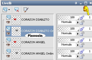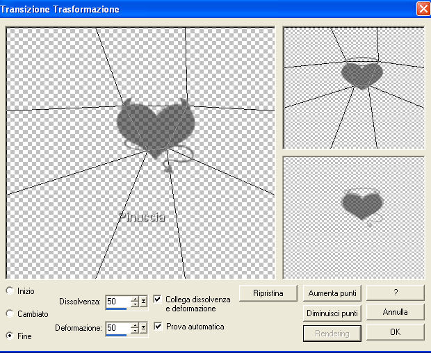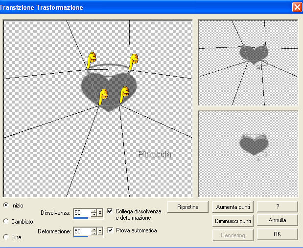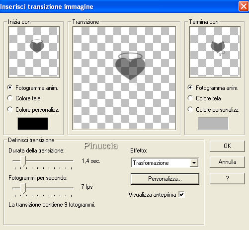 qui puoi trovare qualche risposta ai tuoi dubbi. Se l'argomento che ti interessa non è presente, ti prego di segnalarmelo. Questo tutorial è stato scritto con PSP X2, ma può essere realizzato con qualsiasi versione del programma. Per tradurlo ho usato PSP X. Occorrente: Materiale qui Ti servirà anche Animation Shop qui Adesso spiegherò come passare un effetto da "ombra buona" a "ombra cattiva", che vi servirà di base per divertirti con altre tue creazioni. 1. Apri il file "trabajo", che ti è stato fornito con il tutorial. Vedrai che è formato da due livelli: Corazon Angel, e Corazon Diablito. Attiva il livello "Corazon Angel". Effetti>Effetti 3D>Sfalsa ombra, con i seguenti settaggi, e selezionando la casella "Ombra su nuovo livello": ![]() Attiva il livello "Corazon Diablito". Effetti>Effetti 3D>Sfalsa ombra, con i settaggi precedenti. Adesso avrai un file con quattro livelli. Il numero 1 accanto ad ogni livello significa che i livelli sono stati "linkati", per evitare che, per un involontario spostamento, si rovini l'animazione. Infatti quando si linkano i livelli, spostandone uno si spostano anche quelli che sono collegati. ![]() 2. Chiudi tutti i livelli tranne il livello dell'ombra di "Corazon Angelito". ![]() Salva in formato psp. ![]() 3. Chiudi tutti i livelli eccetto il livello dell'ombra di "Corazon Diablito". Salva in formato psp. 4. Apri in Animation Shop. Apri l'immagine con l'ombra dell'angelo. Apri l'immagine con l'ombra del diavolo e vai a Modifica>Copia. Torna all'immagine con l'ombra dell'angolo e vai a Modifica>Incolla>Incolla dopo il fotogramma corrente. E avrai questo: ![]() 5. Attiva il primo fotogramma (ombra del cuore dell'angelo). Effetti>Effetti transizione immagine ![]() e nella finestra che si apre scegli l'effetto Trasformazione, e clicca su Personalizza: ![]() nella finestra che segue, usando i nodi forniti dallo strumento, dovrai creare la trasformazione del cuore da angelo a diavolo. Mettendo il pallino su Inizio, avrai l'anteprima dell'inizio del movimento (riferito al primo fotogramma:angelo), nell'immagine in alto a sinistra potrai seguire i tuoi movimenti e nell'immagine piccola in basso il risultato. ![]() Mettendo il pallino su Fine, avrai l'immagine finale nella finestra più grande. ![]() Clicca ok e avrai l'animazione dell'ombra (che dovrebbe essere composta da 11 fotogrammi. ![]() 6. Torna in PSP. Chiudi tutti i livelli, tranne i livelli del Corazon Bueno, e salva in formato psp. se non vuoi conservare il file, copia semplicemente il livello: Modifica>Copia. Torna in Animation Shop e vai a Modifica>Incolla>Incolla come nuova animazione. Livelli>Duplica, e ripeti fino ad avere 11 fotogrammi. Clicca sul primo fotogramma per selezionarlo e vai a Modifica>Seleziona tutto e poi Modifica>Copia. Riprendi il tuo lavoro. Clicca sul primo fotogramma e vai a Modifica>Seleziona tutto, e poi Modifica>Incolla>Incolla nel fotogramma selezionato. Posiziona il cuore adeguatamente e, quando sei certo di aver trovato la posizione corretta, rilascia il tasto del mouse. Modifica>Proprietà animazione, e imposta la velocità a 20. ![]() Clicca sull'ultimo fotogramma per selezionarlo. Soltanto questo fotogramma deve avere la cornice blu. Modifica>Proprietà animazione, e imposta la velocità di questo fotogramma a 200. ![]() Salva in formato gif. ![]() Se hai problemi o dubbi, o trovi un link non funzionante, o anche soltanto per un saluto, scrivimi. 17 Agosto 2009 |