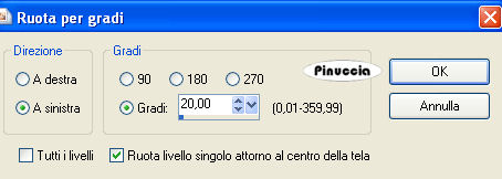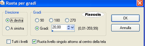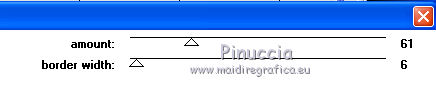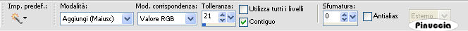 qui puoi trovare qualche risposta ai tuoi dubbi. Se l'argomento che ti interessa non è presente, ti prego di segnalarmelo. Questo tutorial è stato scritto con PSP X2, ma può essere realizzato con qualsiasi versione del programma. Occorrente: Foto, tube e font a tua scelta. Il resto del materiale qui Gli elementi scrap sono di Petit Moineaux Le cornici sono di La maschera è di Filtro: Penta.com - Jeans (nello zip). Ti servirà anche Animation Shop qui 1. Apri tutto il materiale in PSP. Apri una nuova immagine trasparente 600 x 600 pixels, e riempila con il colore che hai scelto di utilizzato.Nel mio esempio il bianco. Rinomina questo livello SFONDO. 2. Apri la trama "Kelyanbypetitmoineaux(26), e vai a Modifica>Copia. Torna al tuo lavoro e vai a Modifica>incolla come nuovo livello. Immagine>Ridimensiona, al 15%, tutti i livelli non selezionato. Livelli>Nuovo livello maschera>Da immagine. Apri il menu sotto la finestra di origine e seleziona la maschera Vix Mask147: ![]() Livelli>Unisci>Unisci gruppo. Rinomina questo livello MASCHERA. 3. Rimani posizionato sul livello della maschera. Selezione>Seleziona tutto. Selezione>Mobile. Selezione>Inverti. Apri il tube del paesaggio JBL_121906_Pier, e vai a Modifica>Copia. Torna al tuo lavoro e vai a Modifica>Incolla come nuovo livello. Immagine>Ridimensiona, al 70%, tutti i livelli non selezionato. Posiziona il paesaggio al centro,e premi sulla tastiera il tasto CANC ![]() Selezione>Deseleziona. Effetti>Plugins>Penta.com - Jeans: ![]() Cambia la modalità di miscelatura di questo livello in Luminanza (esistente), e rinomina il livello PAESAGGIO. 4. Apri il pezzo di carta Kelyanbypetitmoineaux(21), e vai a Modifica>Copia. Torna al tuo lavoro e vai a Modifica>Incolla come nuovo livello. Immagine>Ridimensiona, al 20%, tutti i livelli non selezionato. Immagine>Rifletti. Immagine>Ruota per gradi - 20 gradi a destra: ![]() Effetti>Effetti 3D>Sfalsa ombra: ![]() Posiziona la carta a sinistra, come nel mio esempio.Rinomina questo livello CARTA1. 5. Apri il secondo pezzetto di carta, Kelyanpetitmoineaux(14), e vai a Modifica>Copia. Torna al tuo lavoro e vai a Modifica>Incolla come nuovo livello. Immagine>Ridimensiona, al 15%, tutti i livelli non selezionato. Immagine>Rifletti. Immagine>Capovolgi. Immagine>Ruota per gradi - 20 gradi a sinistra: ![]() Posiziona adeguatamente il pezzo di carta.Effetti>Effetti 3D>Sfalsa, con i settaggi precedenti. Rinomina questo livello CARTA2. Dovresti avere questo: ![]() 6. Attiva il livello CARTA1. Attiva lo strumento Selezione a mano libera ![]() e traccia una selezione come nell'esenpio: ![]() Premi sulla tastiera il tasto CANC. Selezione>Deseleziona. 7. Apri il cuore Kelyanbypetitmoineaux(13), e vai a Modifica>Copia. Torna al tuo lavoro e vai a Modifica>Incolla come nuovo livello. Immagine>Ridimensiona, al 12%, tutti i livelli non selezionato. Posiziona il cuore a destra (vedi il mio esempio).Effetti>Effetti 3D>Sfalsa ombra, con i settaggi precedenti. Livelli>Duplica. Attiva il livello originale del cuore (non la copia). Immagine>Ruota per gradi - 20 gradi a sinistra: ![]() Rinomina questi livelli CUORE1 e CUORE2. 8. Apri il tube delle 4 cornici "Foldedframe". Vedrai che contiene vari livelli. Modifica>Copia Unione. Torna al tuo lavoro e vai a Modifica>Incolla come nuovo livello. Immagine>Ridimensiona, al 15%, tutti i livelli non selezionato. Immagine>Ruota per gradi. ![]() ![]() 9. Attiva lo strumento Bacchetta magica , con i seguenti settaggi.![]() Clicca sui rettangoli grigi delle cornici per selezionarli. ![]() Selezione>Inverti. Apri una foto a tua scelta e vai a Modifica>Copia. Torna al tuo lavoro e vai a Modifica>Incolla come nuovo livello. Ridimensiona se necessario e sistemala nelle cornici. Premi sulla tastiera il tasto CANC. Selezione>Deseleziona. ![]() 10. Attiva lo strumento Testo e scrivi un testo a scelta.Livelli>Unisci>Unisci visibile e salva in formato psp. Apri Animation Shop e apri il file che hai appena salvato. Animazione>Proprietà fotogramma, e imposta la velocità a 20. ![]() Modifica>Duplica, e ripeti finchè non avrai 10 fotogrammi. Clicca sul primo fotogramma per selezionarlo e vai a Modifica>Seleziona tutto. Apri l'animazione animado.mng, anche questa composta da 10 fotogrammi. Clicca sul primo fotogramma per selezionarlo e vai a Modifica>Seleziona tutto. Modifica>Copia. Attiva il tuo lavoro e vai a Modifica>Incolla>Incolla nel fotogramma selezionato. Quando sei certo di aver trovato la posizione corretta, rilascia il tasto del mouse. Se non ti soddisfa puoi tornare indietro con Modifica>Annulla Incolla e ripetere. ![]() 11. In Animation Shop apri il tube che hai scelto di usare. Ridimensionalo, se necessario. Modifica>Duplica e ripeti finchè non avrai 10 fotogrammi. Modifica>Seleziona tutto. Modifica>Copia. Torna al tuo lavoro e vai a Modifica>Incolla>Incolla nel fotogramma selezionato. Posiziona il tube e, quando sei certo della posizione, rilascia il tasto del mouse. Controlla il risultato cliccando su Visualizza e salva in formato gif.![]() ![]() Se hai problemi o dubbi, o trovi un link non funzionante, o anche soltanto per un saluto, scrivimi. 27 Luglio 2008 |