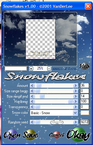 Selezione>Inverti; e in ognuno dei livelli del paesaggio applica il filtro VDL Adrenaline>Snoflakes cambiando soltanto in ogni livello il valore del Random seed.