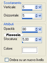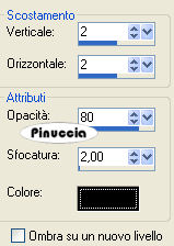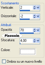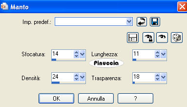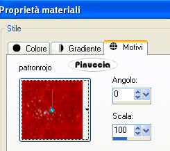 qui puoi trovare qualche risposta ai tuoi dubbi. Se l'argomento che ti interessa non è presente, ti prego di segnalarmelo. Questo tutorial è stato scritto con PSP 9, ma può essere eseguito anche con le altre versioni di PSP. Occorrente: Il materiale scrap è di Pillowgirl-pillowgirlmk@comcast.net, http://www.dipdivas.blogspot.com" Dipdivas< by and copyright Shelleyrae Cusbert 2006. Materiale qui Apri tutto il materiale in PSP. Apri una nuova immagine trasparente 650 x 450 pixels. Imposta il colore di primo piano su Motivi e seleziona il motivo Patron verde: ![]() Riempi l'immagine trasparente con questo motivo.Effetti>Effetti di trama>Manto: ![]() Attiva il tube barbderksen_flkfrmrect2, e vai a Modifica>Copia. Torna al tuo lavoro e vai a Modifica>Incolla>Incolla come nuovo livello. ti sembrerà di non veder niente, non preoccuparti, vai avanti. Immagine>Ridimensiona, al 18%, tutti i livelli non selezionato. Immagine>Ruota>Ruota per gradi, 90 gradi a sinistra. ![]() Sposta il tube a sinistra.Attiva lo strumento Selezione , rettangolo,e traccia un rettangolo al centro della cornice: ![]() Livelli>Nuovo livello raster. Attiva il tube SS.baby-048 e vai a Modifica>Copia. Torna al tuo lavoro e vai a Modifica>Incolla>Incolla nella selezione. Selezione>Nessuna selezione. Attiva il tube scrapabit-tinsel-santacming, e vai a Modifica>copia. Torna al tuo lavoro e vai a Modifica>Incolla>Incolla come nuovo livello. Immagine>Ridimensiona, al 20%, tutti i livelli non selezionato. Effetti>Effetti 3d>Sfalsa ombra, con i seguenti settaggi, colore nero: ![]() Sposta il tube in basso.Attiva il tube scrapabit-tinsel-deco e vai a Modifica>Copia. Torna al tuo lavoro e vai a Modifica>Incolla>Incolla come nuovo livello. Immagine>Ridimensiona, al 10%, tutti i livelli non selezionato. Immagine>Ruota>ruota per gradi, 90 gradi a sinistra. Effetti>Effetti 3D>Sfalsa ombra, con i settaggi precedenti. Livelli>Duplica. Immagine>Rifletti. Posiziona i tubes come nel mio esempio.Attiva il tube scrapabit-tinsel-treeshape-green e vai a Modifica>Copia. Torna al tuo lavoro e vai a Modifica>Incolla>Incolla come nuovo livello. Immagine>Ridimensiona, al 10%, tutti i livelli non selezionato. Effetti>Effetti 3D>Sfalsa ombra, con i settaggi precedenti. Posiziona il tube come nel mio esempio.Attiva il tube hollystar e vai a Modifica>Copia. Torna al tuo lavoro e vai a Modifica>Incolla>Incolla come nuovo livello. Immagine>Ridimensiona, al 5%, tutti i livelli non selezionato. Posiziona il tube in cima all'albero.Effetti>Effetti 3D>Sfalsa ombra, con i seguenti settaggi, colore bianco. ![]() Attiva il tube hollyspring, e vai a Modifica>copia. Torna al tuo lavoro e vai a Modifica>Incolla>Incolla come nuovo livello. Immagine>Ridimensiona, al 25%, tutti i livelli non selezionato. Posiziona il tube nell'angolo in alto a sinistra.Livelli>Duplica. Immagine>Rifletti. Posiziona il secondo tube sotto l'albero.Aggiungi il tuo nome e/o il tuo watermark. Controlla che ogni cosa sia al suo posto e vai a Livelli>Unisci>Unisci visibile. Immagine>Ridimensiona, al 90%, tutti i livelli non selezionato. Livelli>Nuovo livello raster. Riempi il livello con il motivo verde.Livelli>Disponi>Sposta sotto. Livelli>Nuovo livello raster. Imposta il colore di primo piano con il Motivo Patron Rojo: ![]() Riempi il livello con questo motivo.Io ho applicato il seguente Effetto Sfalsa ombra al livello della tag, poi ripetuto con i valori invertiti (-2, 2). ![]() Decidi tu se vuoi seguire il mio esempio Livelli>Unisci>Unisci tutto e salva in formato jpg. ![]() Se hai problemi o dubbi, o trovi un link non funzionante, o anche soltanto per un saluto, scrivimi. 20 Dicembre 2007 |