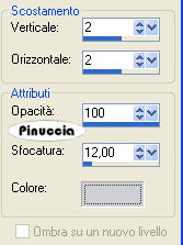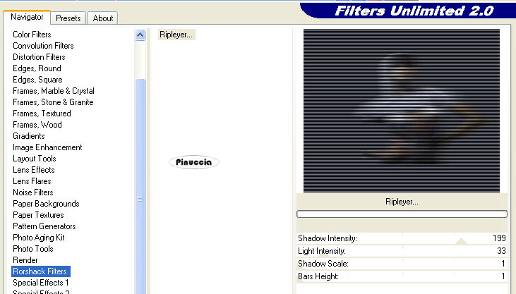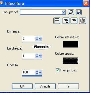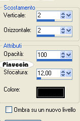 qui puoi trovare qualche risposta ai tuoi dubbi. Se l'argomento che ti interessa non è presente, ti prego di segnalarmelo. Questo tutorial è stato creato con PSP 9, ma può essere eseguito anche con le altre versioni di PSP. Occorrente: Materiale qui Metti il pennello nella cartella dei Pennelli (vedi i miei appunti sui pennelli qui Apri la maschera in PSP. La troverai nella lista delle maschere, quando ti servirà. I tubes dello scrap sono di Alejandra I tubes sono di Resistire e Marif. Filtri: Filters Unlimited 2.0 qui Rorshack Filter - Ripleyer qui il filtro Ripleyer, si usa importato nel filtro Unlimited. Come fare vedi qui Funziona anche da solo. Imposta il colore di primo piano con #4b4f5b, e il colore di sfondo con #cfd0d5. Apri una nuova immagine trasparente 600 x 500 pixels, e riempila con il colore scuro di primo piano.Livelli>Nuovo livello raster. Riempi il nuovo livello con il colore chiaro di sfondo.ricorda che per riempire con il colore di sfondo, devi cliccare con il tasto destro del mouse. Livelli>Nuovo livello maschera>Da immagine, apri il menu sotto la Finestra di origine e seleziona la maschera gabemask45. ![]() Livelli>Unisci>Unisci gruppo. Effetti>effetti 3D>Sfalsa ombra, con i seguenti settaggi: ![]() Attiva lo strumento Selezione a mano libera , da punto a punto,e traccia una selezione, come mostrato nella schermata. ![]() Attiva il livello dello sfondo. Livelli>Nuovo livello raster. Attiva il tube Marif_2007_07Julliet_lady0336, e vai a Modifica>Copia. Torna al tuo lavoro e vai a Modifica>Incolla>Incolla nella selezione. Selezione>Nessuna selezione. Livelli>Duplica. Attiva il livello inferiore del tube. Effetti>Effetti di distorsione>Vento, intensità 100 da destra ![]() Effetti>Plugins>Filters Unlimited - Rorshack Filtres - Ripleyer, con i settaggi standard: ![]() Attiva il livello superiore del tube. Effetti>Effetti 3D>sfalsa ombra, con i settaggi precedenti. Io ho applicato il filtro Ripleyer anche a questo livello, abbassando un po' l'opacità. Decidi tu se fare altrettanto. Livelli>Unisci>Unisci visibile. Livelli>Nuovo livello raster. Attiva lo strumento Pennello ![]() cerca e seleziona il pennello CB30 001, e applicalo con il colore scuro in alto a destra. Livelli>duplica. Immagine>rifletti. Immagine>Capovolgi. Livelli>Unisci>Unisci tutto. Immagine>Aggiungi bordatura, 30 pixels, simmetriche, con il colore bianco. ![]() Seleziona questo bordo con la bacchetta magica ![]() ![]() e riempilo con il colore scuro.Effetti>Plugins>Filters Unlimited - Rorshack Filtres - Ripleyer, con i settaggi precedenti. Effetti>Effetti di trama>Intessitura: ![]() Selezione>inverti. Effetti>Effetti 3D>Sfalsa ombra, con i seguenti settaggi, con il colore di sfondo: ![]() Ripeti l'Effetto Sfalsa ombra, ma cambiando verticale e orizzontale a -2. Selezione>nessuna selezione. Attiva il tube Marif_2007_07julliet_lady0335-1, e vai a Modifica>Copia. Torna al tuo lavoro e vai a Modifica>Incolla>Incolla come nuovo livello. Immagine>Ridimensiona, all'85%, tutti i livelli non selezionato. Posiziona il tube a destra.Effetti>Effetti 3D>Sfalsa ombra, con i seguenti settaggi, colore nero: ![]() Attiva il tube 2346Scrap-hinger-abril, e vai a Modifica>Copia. Torna al tuo lavoro e vai a Modifica>Incolla>Incolla come nuovo livello. Immagine>ridimensiona, al 55%, tutti i livelli non selezionato. Sposta questo tube in alto a destra.Livelli>duplica. Immagine>Rifletti. Attiva il tube caro1042, e vai a Modifica>Copia. Torna al tuo lavoro e vai a Modifica>Incolla>Incolla come nuovo livello. Immagine>Ridimensiona, al 65%, tutti i livelli non selezionato. Spostalo in basso a sinistra.Se vuoi scrivere il nome come nell'esempio sotto il titolo: Livelli>Duplica. Immagine>Ridimensiona, al 65%, tutti i livelli non selezionato. Livelli>Duplica, il numero necessario per le lettere che vuoi usare. Per questo tutorial ho utilizzato il font Karnac two (fornito con il materiale), ma puoi usare il font che preferisci. Nel primo flacone aggiungi su un nuovo livello l'iniziale del nome con una dimensione più grande, rispetto a quella che userai per le lettere successive. Scrivi la lettera e posizionala. Selezione>Innalza selezione a livello. Selezione>mobile. Selezione>immobilizza. Premi due volte il tasto CANC sulla tastiera , così rimarrà la selezione vuota.Effetti>Effetti 3D>Sfalsa ombra: ![]() Selezione>Nessuna selezione. Ripeti lo stesso passaggio per tutte le altre lettere. Immagine>Aggiungi bordatura, 2 pixels, simmetriche, con il colore chiaro. Salva in formato jpg. ![]() ![]() Le vostre versioni. Grazie ![]() ![]() Cookies ![]() Se hai problemi o dubbi, o trovi un link non funzionante, o anche soltanto per un saluto, scrivimi. 9 Agosto 2007 |
