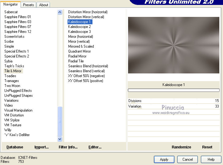 3. Effets>Modules Externes>Filters Unlimited 2.0 - Tile & Mirror - Kaleidoscope 1.