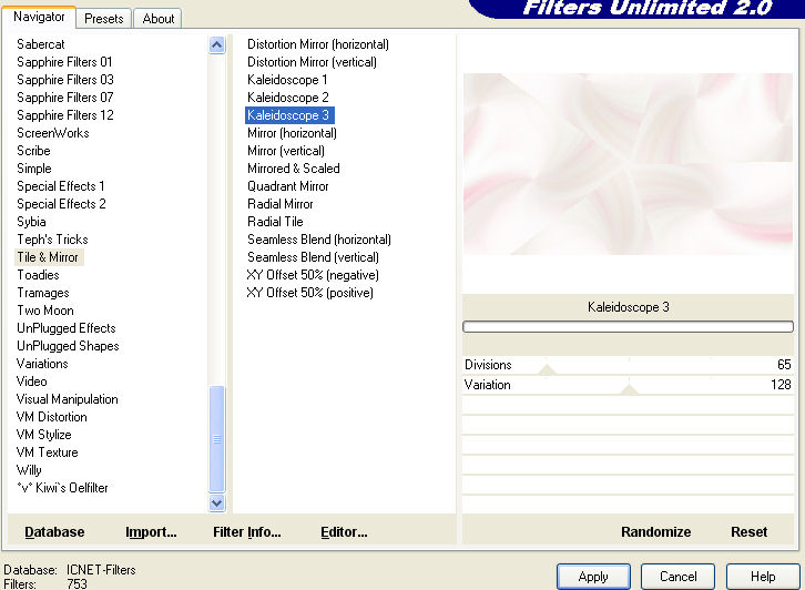 7. Effets>Modules Externes>Filters Unlimited 2.0 - Tile & Mirror - Kaleidoscope 3.