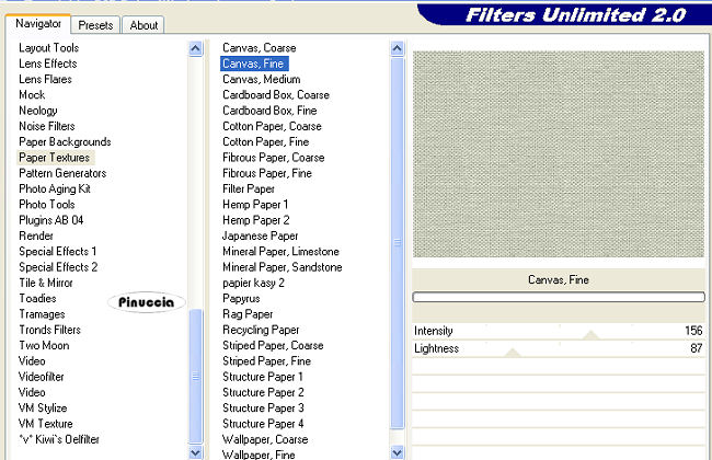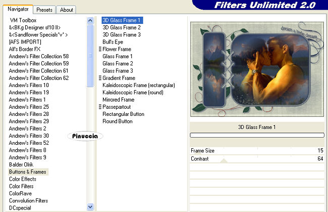 qui puoi trovare qualche risposta ai tuoi dubbi. Se l'argomento che ti interessa non è presente, ti prego di segnalarmelo. Questo tutorial è stato scritto in PSP X2, ma può essere eseguito anche con le altre versioni di PSP. Per tradurlo, ho usato PSP X. Occorrente: Materiale qui Il tube è di @AnnTDstudio, la maschera è di http://www.zuzzanna.dk/mask.html Zuzzanna. Attenzione, i livelli dei tubes sono chiusi. Filtri: Filters Unlimited qui Metti la maschera nella cartella maschere. Ti servirà anche la maschera 20-20. Prendila qui 1. Apri una nuova immagine trasparente 700 x 500 pixels. Scegli dai tubes un colore chiaro come colore di primo piano (il mio #cacdbc), e un colore scuro come colore di sfondo (il mio #313e57). 2. Livelli>Nuovo livello raster. Riempi con il colore di sfondo.3. Livelli>Nuovo livello raster. Riempi con il colore di primo piano.4. Effetti>Plugins>Filters Unlimited 2.0 - Paper Textures - Canvas Fine, con i settaggi standard. ![]() 5. Livelli>Carica/Salva maschera>Carica maschera da disco. Cerca e carica la maschera zuzzanna_mask44: ![]() Livelli>Unisci>Unisci gruppo. 6. Attiva lo strumento Selezione , rettangolo arrotondato e seleziona la cornice più grande della maschera.(non preoccuparti di essere preciso, perchè potrai sistemare l'immagine più tardi). ![]() Livelli>Nuovo livello raster. Apri l'immagine Dream-a-little-dreambg e vai a Modifica>Copia. Torna al tuo lavoro e vai a Modifica>Incolla nella selezione. Selezione>Deseleziona. Adesso puoi adattare l'immagine alla cornice attivando lo strumento Puntatore ![]() deformazione se stai usando PSP 9.7. Selezione>Seleziona tutto. Selezione>Mobile. Selezione>immobilizza. Selezione>inverti. Selezione>Modifica>Sfuma - 15 pixels. Premi sulla tastiera il tasto CANC 2 o 3 volte. Selezione>Deseleziona. Abbassa l'opacità di questo livello al 46%. 8. Ripeti lo stesso passaggio per la cornice più piccola della maschera. Questa volta però, per adattare l'immagine usa la maschera 20-20. ![]() Livelli>Unisci>Unisci gruppo. Abbassa l'opacità di questo livello al 75% (o, se stai usando altre immagini, alla percentuale più adatta). 9. Attiva lo strumento Gomma , dimensione 20, e cancella attentamente le tracce dello sfondo dagli occhielli della maschera in entrambi i livelli dell'immagine.10. Apri il tube @nn_070107_BourneID_tdstudio. Livelli>Carica/Salva maschera>Carica maschera da disco. Carica la maschera 20-20. Livelli>Unisci>Unisci gruppo. Modifica>Copia Torna al tuo lavoro e vai a Modifica>Incolla come nuovo livello. Immagine>Ridimensiona, all'85%, tutti i livelli non selezionato. Posiziona il tube al centro della maschera.Livelli>Duplica. Livelli>Unisci>Unisci giù. 11. Attiva il livello inferiore e cambia la modalità di miscelatura di questo livello in Luminanza (esistente). (Prendi nota che se il tuo livello inferiore è nero, dovrai cambiare la modalità di miscelatura in Filtra). 12. Livelli>Nuovo livello raster. Livelli>Disponi>Porta sotto. Attiva lo strumento Selezione , da punto a punto.![]() e seleziona le foglie. Non potrai essere troppo preciso ma cerca di lasciare fuori dalla selezione le ombre della maschera. Riempi la selezione con il colore #013901, o un colore a tua scelta.13. Fai lo stesso con le spirali e le parole e riempi con #bb6a4f, o con un colore a tua scelta.Nel mio esempio ho colorato anche le piccole bacche di rosso (ho lasciato, invece, le parole con il colore originario). 14. Livelli>Unisci>Unisci visibile. Effetti>Plugins>Filters Unlimited 2.0 - Buttons and Frames - 3D Glass Frame 1: ![]() 15. Selezione>Seleziona tutto. Selezione>Modifica>Contrai - 14 pixels. Selezione>Inverti. Effetti>Effetti 3D>Sfalsa ombra, con i seguenti settaggi, colore nero: ![]() Ripeti l'Effetto Sfalsa ombra, cambiando verticale e orizzontale con -5. 16. Aggiungi il tuo nome e/o il tuo watermark e salva in formato jpg. ![]() Se hai problemi o dubbi, o trovi un link non funzionante, o anche soltanto per un saluto, scrivimi 19 Agosto 2009 |