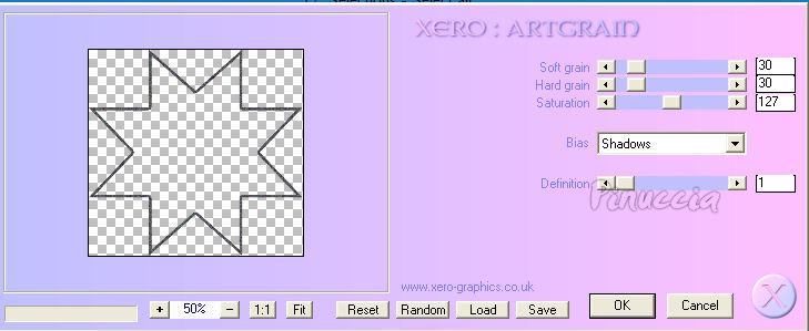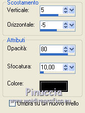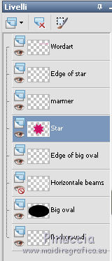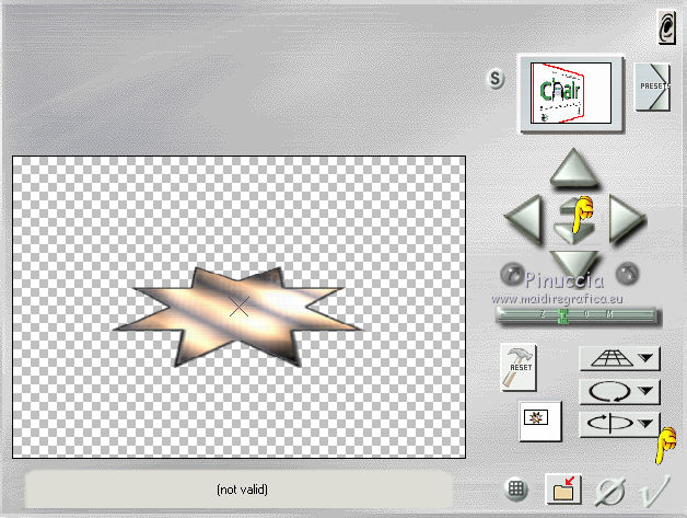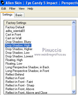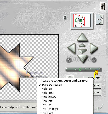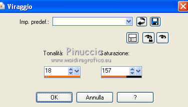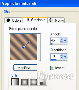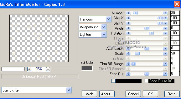 qui puoi trovare qualche risposta ai tuoi dubbi. Se l'argomento che ti interessa non è presente, ti prego di segnalarmelo. Questo tutorial è stato creato con PSP Ultimate Photo X3, ma può essere eseguito anche con le altre versioni di PSP. Per tradurlo, ho usato PSP X. Occorrente: Un tube a scelta. Il resto del materiale qui Il template A star is born è di Martine. Se vuoi usare tuo materiale, ti serve il misted di uno scenario di massimo 600 pixels di larghezza. Il tube principale deve essere alto al massimo 500 pixels. I tubes che ho usato per i miei esempi sono di JenC e Guismo. Filtri: Graphics plus - Cross Shadow qui Mura's Meister - Copies qui Xero - Fritillary qui Xero - Artgrain qui Alien Skin Eye Candy 5 Impact qui Andromeda - Perspective qui Metti il pennello nella cartella Pennelli. Attenzione, il pennello è composto da due files che non devono essere separati. Vedi gli appunti sui pennelli qui. Apri il resto del materiale in PSP. 1. Scegli due colori dal tuo tube, e imposta il colore chiaro come colore di primo piano, e il colore scuro come colore di sfondo. 2. Passa il colore di primo piano a Gradiente di primo piano/sfondo, con i seguenti settaggi. ![]() 3. Attiva il template. Elimina il livello "Martine". Chiudi il livello "horizontale beams" e attiva il livello "star". ![]() 4. Selezione>Seleziona tutto. Selezione>Mobile. Selezione>Immobilizza. 5. Livelli>Nuovo livello raster. Riempi il livello con il gradiente.6. Livelli>Unisci>Unisci giù. 7. Effetti>Plugins>Graphics Plus - Cross Shadow, con i settaggi standard. ![]() 8. Effetti>Plugins>Xero - Fritillary. ![]() 9. Attiva il livello "edge of star". 10. Selezione>Seleziona tutto. Selezione>Mobile. Selezione>Immobilizza. 11. Livelli>Nuovo livello raster. Riempi la selezione con il colore di sfondo (tasto destro del mouse).12. Effetti>Plugins>Xero - Artgrain. ![]() 13. Selezione>Deseleziona. 14. Effetti>Effetti 3D>Smusso a incasso. ![]() 15. Livelli>Unisci>Unisci giù e ripeti ancora due volte. Se tutto è andato bene ti troverai sul livello "star". ![]() 16. Effetti>Plugins>Andromeda - Perspective. Clicca su Reset per annullare precedenti settaggi, quindi clicca sull'icona indicata dalla manina e selezione Standard position. ![]() Clicca 1 o due volte sull freccia inferiore in modo che la stella si veda come nell'anteprima qui sotto, e applica il filtro cliccando sul segno di spunta. ![]() 17. Attiva il livello inferiore "background". Immagine>Dimensione tela: ![]() 18. Sposta la stella in basso a sinistra.19. Attiva il livello "wordart". 20. Regola>Tonalità e saturazione>Viraggio, con i valori corrispondenti al tuo colore di primo piano. (sul Viraggio vedi qui I miei settaggi. ![]() 21. Cambia i settaggi del gradiente. ![]() 22. Attiva il livello "big oval". 24. Selezione>Seleziona tutto. Selezione>Mobile. Selezione>Immobilizza. 25. Livelli>Nuovo livello raster. Riempi la selezione con il gradiente.26. Livelli>Unisci>Unisci giù. 27. Regola>Sfocatura>Sfocatura gaussiana - raggio 10. ![]() 28. Apri il tube "misted scenary tubed_by_viviane14 e cancella il watermark. Modifica>Copia. Torna al tuo lavoro e vai a Modifica>Incolla come nuovo livello. Immagine>Ridimensiona, al 110%, tutti i livelli non selezionato. 29. Posiziona correttamente il tube nell'ovale.30. Selezione>Inverti. Premi sulla tastiera il tasto CANC. 31. Selezione>Deseleziona. Livelli>Unisci>Unisci giù. 32. Riapri e attiva il livello "horizontal beams" e cambia la modalità di miscelatura in Luce diffusa. 33. Livelli>Unisci>Unisci giù. 34. Attiva il livello "edge of big oval". 35. Selezione>Seleziona tutto. Selezione>Mobile. Selezione>Immobilizza. 36. Livelli>Nuovo livello raster. Riempi la selezione con il colore di sfondo.37. Effetti>Plugins>Xero - Artgrain, con i settaggi precedenti. 38. Selezione>Deseleziona. 39. Effetti>Effetti 3D>Smusso a incasso, con i settaggi precedenti. 40. Livelli>Unisci>Unisci giù e ripeti. 41. Attiva il livello "big oval" e spostalo un po' più in basso.42. Apri il tuo tube e vai a Modifica>Copia. Torna al tuo lavoro e vai a Modifica>Incolla come nuovo livello. Posiziona il tube sulla stella.43. Attiva il livello "wordart". Effetti>Effetti 3D>Sfalsa ombra: ![]() 44. Attiva il livello "big oval". Effetti>Effetti 3D>sfalsa ombra, con i settaggi precedenti. prima di applicare l'Effetto Sfalsa ombra, sposta un po' più a destra l'immagine, in questo modo l'ombra non uscirà dal bordo della tela. 45. Attiva il livello del tube. Effetti>Effetti 3D>sfalsa ombra: ![]() 46. Attiva il livello con la stella. Effetti>Plugins>Alien Skin Eye Candy 5 Impact - Perspective Shadow: settings: Drop shadow,High e ok. ![]() 47. Attiva il livello "big oval". Livelli>Nuovo livello raster. 48. Attiva lo strumento Pennello ,cerca e seleziona il pennello "sterren", riporta il colore di primo piano da gradiente a colore, e applica il pennello cliccando un paio di volte sull'ovale, cliccando con il tasto sinistro del mouse per usare il colore di primo piano. 49. Apri il tube "sterwit" e vai a Modifica>Copia. Torna al tuo lavoro e vai a Modifica>Incolla come nuovo livello. 50. Effetti>Plugins>Mura's Meister Copies. ![]() 51. Livelli>Disponi>Porta sotto. Se necessario, cancella le stelle che "disturbano" il risultato (per esempio quelle rimaste a metà sui bordi della tela). 52. Attiva il livello "big oval". Modifica>Incolla come nuovo livello (la stella è ancora in memoria). 53. Apri il tube "feathers_n_flowers_Lizztish" e vai a Modifica>copia. Torna al tuo lavoro e vai a Modifica>Incolla come nuovo livello. Sposta questo tube in basso, accanto alla grande stella.54. Aggiungi il tuo nome e/o il tuo watermark su un nuovo livello. 55. Livelli>Unisci>Unisci visibile (per mantenere la trasparenza dello sfondo). 56. Immagine>Ridimensiona, a 600 pixels di larghezza. Salva il lavoro in formato png. ![]() ![]() Se hai problemi o dubbi, o trovi un link non funzionante, o anche soltanto per un saluto, scrivimi. 5 Giugno 2010 |