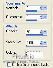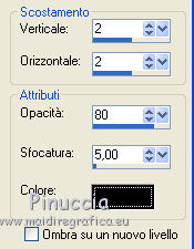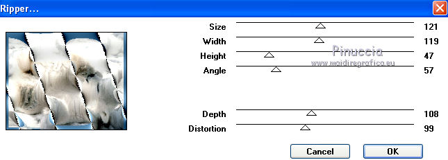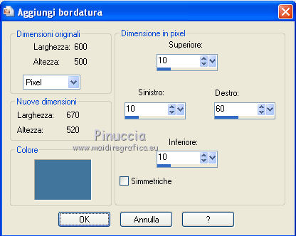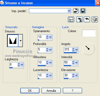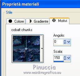 qui puoi trovare qualche risposta ai tuoi dubbi. Se l'argomento che ti interessa non è presente, ti prego di segnalarmelo. Questo tutorial è stato creato con PSP Ultimate Photo X2, ma può essere eseguito anche con le altre versioni di PSP. Per tradurlo, ho usato PSP X. Occorrente: Materiale qui Se vuoi usare tuo materiale, l'immagine da incorniciare deve avere una larghezza massima di 500 pixels. L'angolo deve essere di 233 x 233 pixels. Filtri: Filter Factory Gallery A qui Graphics Plus qui I filtri Factory Gallery per essere usati devono prima essere convertiti. Come fare vedi qui Si usano importandoli in Filters Unlimited (come fare vedi qui) ma possono funzionare anche da soli ![]() 1. Apri tutto il materiale in PSP e minimizzalo. 2. Scegli un colore scuro dal motivo Cobalt Chunks e impostalo come colore di sfondo. Passa il colore di primo piano a Motivi e seleziona il motivo Cobalt Chunks con i seguenti settaggi. ![]() 3. Se vuoi usare altri colori, prima di impostare il motivo come colore di sfondo, colorizzalo con il colore scelto. (Sul viraggio vedi qui). 4. Apri la tua immagine (la mia "baby ysbeer"). Livelli>Innalza livello di sfondo. 5. Immagine>Aggiungi bordatura, 10 pixels, simmetriche, con il colore di sfondo. 6. Attiva lo strumento Bacchetta magica ![]() ![]() Clicca sul bordo per selezionarlo. 7. Effetti>Plugins>Filter Factory Gallery A - Ripper: ![]() 8. Effetti>Effetti 3D>Smusso a incasso. ![]() 9. Selezione>Deseleziona. 10. Immagine>Aggiungi bordatura, 30 pixels, simmetriche, con un colore contrastante. 11. Selezione questo bordo con la bacchetta magica ![]() 12. Riempi la selezione con il colore di sfondo (tasto destro del mouse).13. Effetti>Plugins>Graphics Plus - Cross Shadow. ![]() 14. Selezione>Deseleziona. 15. Immagine>Aggiungi bordatura, 10 pixels, simmetriche, con il colore bianco. 16. Seleziona il bordo con la bacchetta magica ![]() 17. Riempi la selezione con il motivo Cobalt Chunks.18. Effetti>Effetti 3D>Smusso a rilievo. ![]() 19. Selezione>Deseleziona. 20. Apri il tube "corner1a" e vai a Modifica>Copia. 21. Torna al tuo lavoro e vai a Modifica>Incolla come nuovo livello. 22. Spostalo nell'angolo in alto a sinistra (vedi il mio esempio).23. Effetti>Effetti 3D>Sfalsa ombra: ![]() Ripeti l'Effetto Sfalsa ombra, cambiando verticale e orizzontale con -2. 24. Immagine>Aggiungi bordatura, simmetriche non selezionato, con il colore di sfondo. ![]() 25. Seleziona questo bordo con la bacchetta magica ![]() 26. Effetti>Plugins>Graphics Plus - Cross Shadow, con i settaggi precedenti. 27. Selezione>Deseleziona. 28. Immagine>Aggiungi bordatura, 10 pixels, simmetriche, con un colore contrastante. 29. Seleziona questo bordo con la bacchetta magica ![]() 30. Riempi con il motivo di sfondo.31. Effetti>Plugins>Filter Factory Gallery A - Ripper, con i settaggi precedenti. 32. Effetti>Effetti 3D>Smusso a incasso. ![]() 33. Selezione>Deseleziona. 34. Attiva lo strumento Testo ![]() e seleziona il font FairdustB con i seguenti settaggi (attenzione: direzione verticale). ![]() 35. Clicca sulla freccia tra le palettine dei materiali per invertire i colori e avere così il motivo impostato come colore di sfondo. 36. Scrivi il tuo testo e posizionalo nella striscia chiara a destra. 37. Livelli>Converti in livello raster. 38. Effetti>Effetti 3D>Sfalsa ombra, con i settaggi precedenti, ma con il colore bianco. ![]() 39. Aggiungi il tuo nome e/o il tuo watermark su un nuovo livello. 40. Livelli>Unisci>Unisci tutto. 41. Immagine>Ridimensiona, a 600 pixels di larghezza. 42. Salva in formato jpg. ![]() Se hai problemi o dubbi, o trovi un link non funzionante, o anche soltanto per un saluto, scrivimi. 1 Giugno 2010 |