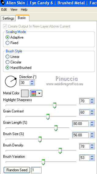 33. Effetti>Plugins>Alien Skin Eye Candy 6 Textures - Brushed Metal, con i settaggi precedenti.
