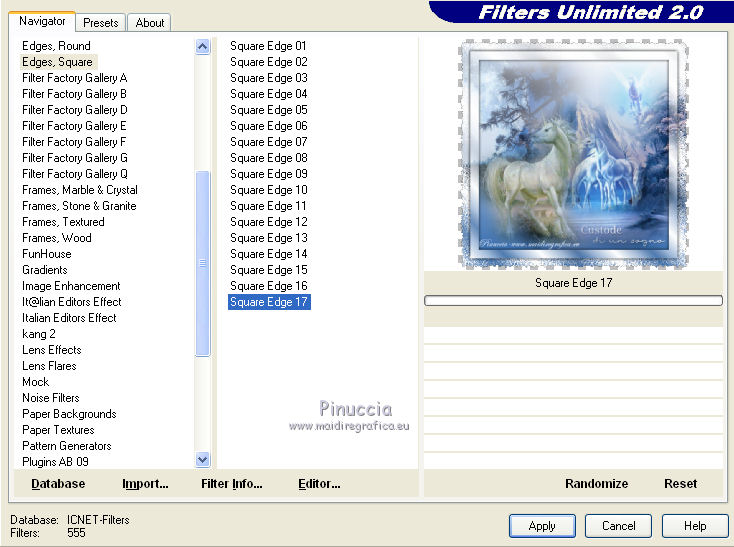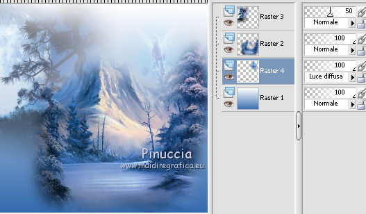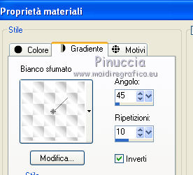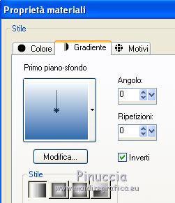 qui puoi trovare qualche risposta ai tuoi dubbi. Se l'argomento che ti interessa non è presente, ti prego di segnalarmelo. Questo tutorial è stato creato con PSP X3. Per tradurlo, ho usato PSP X. Occorrente: Materiale: qui A tua scelta, puoi usare un pennello di testo. Questi i tubes che trovi nello zip: Misted tube Eenhoorn_1_Maria (361 x 400 pixels) Misted tube Eenhoorn_2_Maria (373 x 400 pixels) Misted tube Tubed by Monique42_1279[1] (280 x 357 pixels) Misted scenery Kat_artistunknown_scenery13_03_062008 (713 x 540 pixels) Misted scenery winter_wonders (420 x 320 pixels) Filtri: Filters Unlimited 2.0 qui 1. Apri tutto il materiale in PSP. 2. Imposta il colore di primo piano con il bianco, e il colore di sfondo con il blu #346bae. Passa il colore di primo piano a Gradiente. ![]() 3. Apri una nuova immagine trasparente 600 x 600 pixels, e riempila con il gradiente.4. Selezione>Seleziona tutto. 5. Livelli>Nuovo livello raster. 6. Apri "winter_wonders" e vai a Modifica>Copia. Torna al tuo lavoro e vai a Modifica>Incolla nella selezione. Selezione>Deseleziona. 7. Sposta il tube un po' più in basso e a destra.8. Apri il tube "kat_artistunknown_scenery" e vai a Modifica>Copia. Torna al tuo lavoro e vai a Modifica>Incolla come nuovo livello. 9. Immagine>Rifletti. Immagine>Ridimensiona, al 75%, tutti i livelli non selezionato. 10. Sposta il tube in alto a sinistra, metà luna fuori dall'immagine.![]() Abbassa l'opacità di questo livello al 50%. 11. Apri il tube "tube by Monique42_1279(1)" e vai a Modifica>Copia. Torna al tuo lavoro e vai a Modifica>Incolla come nuovo livello. 12. Immagine>Ridimensiona, al 75%, tutti i livelli non selezionato. Immagine>Rifletti. 13. Sposta il tube nell'angolo in alto a destra.Cambia la modalità di miscelatura di questo livello in Luce diffusa. 14. Livelli>Disponi>Sposta giù - 2 volte. ![]() 15. Livelli>Duplica. 16. Attiva nuovamente il livello superiore. 17. Apri il tube "Eenhoorn_2_Maria" e vai a Modifica>Copia. Torna al tuo lavoro e vai a Modifica>Incolla come nuovo livello. 18. Immagine>Ridimensiona, al 75%, tutti i livelli non selezionato. 19. Sposta il tube accanto agli alberi a destra.20. Livelli>Duplica. Livelli>Unisci>Unisci giù. 21. Apri il tube "Eenhoorn_1_Maria" e vai a Modifica>Copia. torna al tuo lavoro e vai a Modifica>Incolla come nuovo livello. 22. Immagine>Rifletti. 23. Sposta il tube in basso a sinistra.![]() 24. Livelli>Duplica. 25. Livelli>Unisci>Unisci tutto. 26. Livelli>Duplica. 27. Selezione>Seleziona tutto. Selezione>Modifica>Contrai - 25 pixels. Selezione>Inverti. 28. Imposta il colore di primo piano con il Gradiente bianco sfumato e i seguenti settaggi. ![]() 29. Livelli>Nuovo livello raster. 30. Strumento riempimento , tolleranza 0, opacità 100,e riempi la selezione con questo gradiente. 31. Effetti>Effetti 3D>Sfalsa ombra: ![]() Ripeti l'Effetto Sfalsa ombra, cambiando verticale e orizzontale con -2. 32. Livelli>Unisci>Unisci giù. Selezione>Deseleziona. 33. Immagine>Ridimensiona, al 90%, tutti i livelli non selezionato. 34. Attiva il livello inferiore. 35. Livelli>Nuovo livello raster. Riempi con il gradiente.Cambia la modalità di miscelatura di questo livello in Dissolvi. 36. Attiva il livello superiore. 37. Effetti>Effetti 3D>Sfalsa ombra, con i settaggi precedenti, compresa la ripetizione a -2. 38. Livelli>Unisci>Unisci visibile. 39. Immagine>Aggiungi bordatura, 1 pixel, simmetriche, con il colore di sfondo. 40. Aggiungi il tuo nome e/o il tuo watermark su un nuovo livello. 41. Livelli>Nuovo livello raster. Attiva lo strumento Pennello e applica un pennello di testo a tua scelta con il gradiente.Eventualmente, duplica il livello per renderlo più scuro. 42. Livelli>Unisci>Unisci visibile. 43. Effetti>Plugins>Filters Unlimited 2.0 - Edges square - Square Edge 17. ![]() 44. Effetti>Effetti 3D>Sfalsa ombra, con i settaggi precedenti (compresa la ripetizione a -2). 45. Esposta il tuo lavoro in formato png. ![]() Se hai problemi o dubbi, o trovi un link non funzionante, o anche soltanto per un saluto, scrivimi. 23 Agosto 2010 |