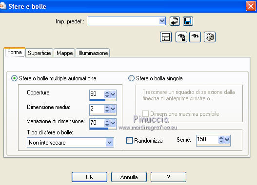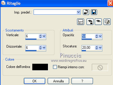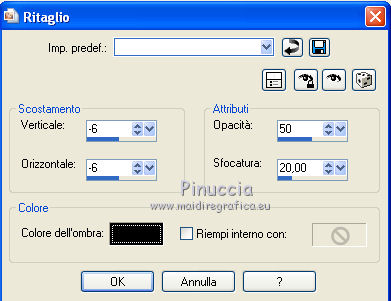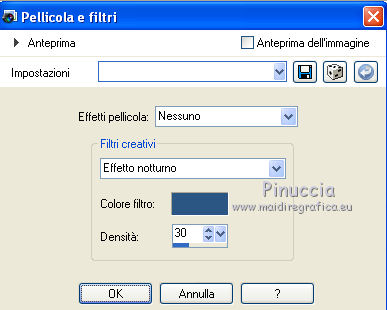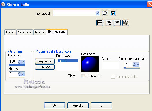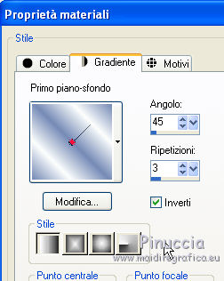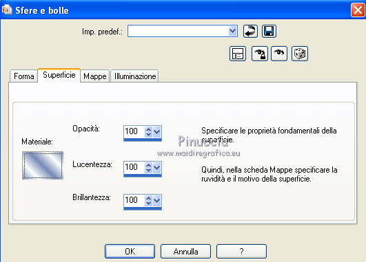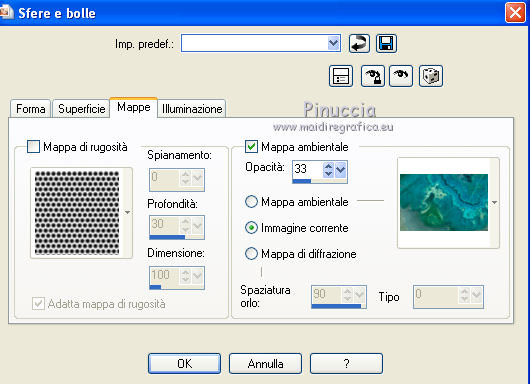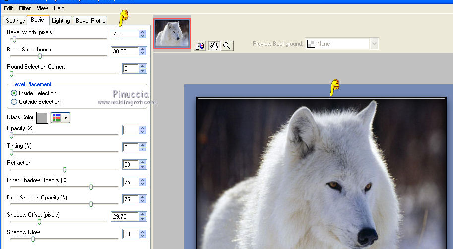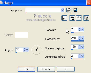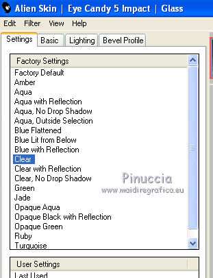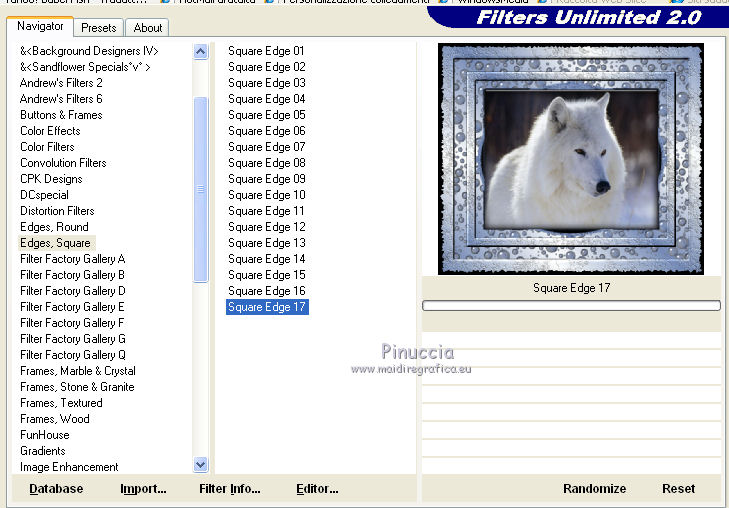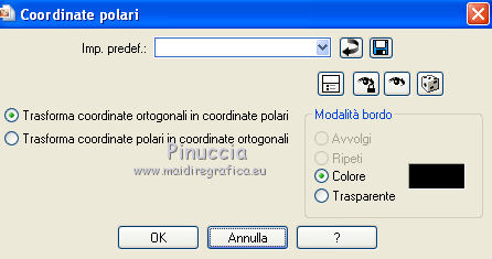 qui puoi trovare qualche risposta ai tuoi dubbi. Se l'argomento che ti interessa non è presente, ti prego di segnalarmelo. Questo tutorial è stato creato con PSP X2. Per tradurlo, ho usato PSP X. Occorrente: Un'immagine della larghezza massima di 500 pixels. qui l'immagine usata per l'esempio del tutorial. Filtri: Alien Skin Eye Candy 5 Impact qui 1. Apri l'immagine in PSP. 2. Effetti>Effetti di foto>Pellicola e filtri. ![]() se stai usando la versione 9 o X di PSP, non trovi questo effetto. Puoi saltare il passaggio o iniziare da qui usando l'immagine con l'effetto già applicato qui 3. Attiva lo strumento Contagocce ![]() e scegli dalla tua immagine un colore chiaro e un colore scuro. Passando il mouse sull'immagine, vedrai l'icona del contagocce; clicca con il tasto sinistro del mouse per impostare un colore chiaro come colore di primo piano, e con il tasto destro del mouse per impostare un colore scuro come colore di sfondo. ![]() 4. Passa il colore di primo piano a Gradiente, con i seguenti settaggi. ![]() 5. Immagine>Aggiungi bordatura, 2 pixels, simmetriche, con il colore nero. 6. Immagine>Aggiungi bordatura, 25 pixels, simmetriche, con il colore di sfondo. 7. Attiva lo strumento Bacchetta magica con i seguenti settaggi.![]() clicca sul bordo da 25 pixels per selezionarlo. 8. Livelli>Nuovo livello raster. 9. Attiva lo strumento Riempimento , opacità 100, e riempi la selezione con il colore di sfondo (tasto destro del mouse). 10. Effetti>Effetti di trama>Nappa. ![]() 11. Effetti>Effetti di distorsione>Coordinate polari. ![]() 12. Selezione>Deseleziona. 13. Clicca con la bacchetta magica sugli angoli neri per selezionarli.![]() 14. Selezione>Modifica>Espandi - 5 pixels. 15. Livelli>Nuovo livello raster. 16. Riempi le selezioni con il gradiente.impostando lo strumento in Modalità Nessuno, ti basterà un solo clic ![]() 17. Effetti>Effetti artistici>Sfere e bolle. Forma: ![]() Superficie. ![]() Mappe: ![]() Illuminazione. ![]() 18. Attiva il livello inferiore. 19. Selezione>Seleziona tutto. Selezione>Modifica>Contrai - 25 pixels. 20. Livelli>Nuovo livello raster. 21. Effetti>Effetti 3D>Ritaglio. ![]() 22. Livelli>Nuovo livello raster. Ripeti l'Effetto Ritaglio cambiando verticale e orizzontale con i valori positivi. ![]() 23. Livelli>Unisci>Unisci giù - 2 volte. 24. Effetti>Plugins>Alien Skin Eye Candy 5 Impact - Glass. Imposta il preset Clear e, prima di applicare il filtro.... ![]() .... abbassa il settaggio di "bevel width", controllando il risultato dell'effetto nella finestra di anteprima, finchè non ti soddisfa. ![]() 25. Selezione>Deseleziona. 26. Livelli>Unisci>Unisci tutto. 27. Immagine>Aggiungi bordatura, 1 pixel, simmetriche, con il colore nero. 28. Immagine>Aggiungi bordatura, 25 pixels, simmetriche, con il colore di sfondo. 29. Seleziona questo bordo con la bacchetta magica. 30. Riempi la selezione con il gradiente.31. Effetti>Effetti di trama>Nappa, con i settaggi precedenti. 32. Effetti>Effetti 3D>Smusso a incasso. ![]() Selezione>Deseleziona. 33. Immagine>Aggiungi bordatura, 1 pixel, simmetriche, con il colore nero. 34. Immagine>Aggiungi bordatura, 35 pixels, simmetriche, con il colore di sfondo. 35. Seleziona questo bordo con la bacchetta magica ![]() 36. Riempi la selezione con il gradiente.37. Effetti>Effetti artistici>Sfere e bolle, con i settaggi precedenti. Selezione>Deseleziona. 38. Immagine>Aggiungi bordatura, 1 pixel, simmetriche, con il colore nero. 39. Immagine>Aggiungi bordatura, 45 pixels, simmetriche, con il colore di sfondo. 40. Seleziona questo bordo con la bacchetta magica .41. Riempi la selezione con il gradiente.42. Effetti>effetti di trama>Nappa, con i settaggi precedenti. 43. Effetti>Effetti 3D>Smusso a incasso, con i settaggi precedenti. Selezione>Deseleziona. 44. Immagine>Aggiungi bordatura, 1 pixel, simmetriche, con il colore nero. 45. Immagine>Ridimensiona, a 650 pixels di larghezza. 46. Regola>Messa a fuoco>Metti a fuoco. 47. Aggiungi il tuo nome e/o il tuo watermark su un nuovo livello. 48. Livelli>Unisci>Unisci tutto. 49. Effetti>Plugins>Filters Unlimited - Edges Square - Square edge 17. ![]() Salva in formato jpg. se vuoi ottenere il bordo trasparente, come nell'esempio in fondo al tutorial, prima di applicare il filtro Unlimited, invece di "Unisci Tutto", devi usare il comando "Unisci visibile", ed esportare in formato png. ![]() ![]() ![]() Se hai problemi o dubbi, o trovi un link non funzionante, o anche soltanto per un saluto, scrivimi. 20 Agosto 2010 |