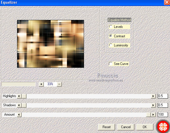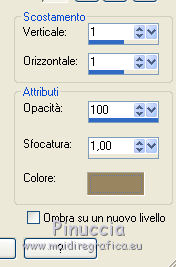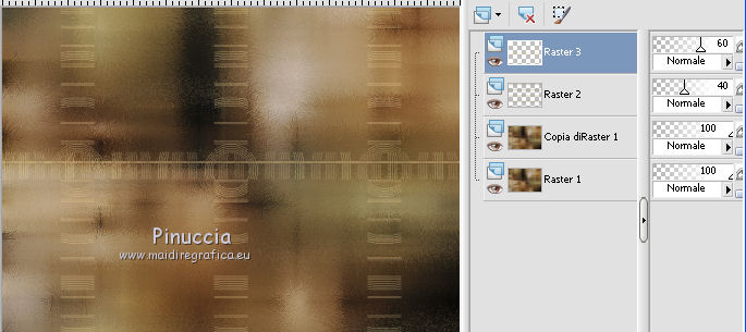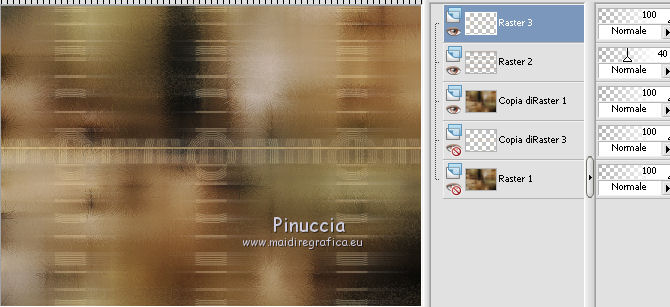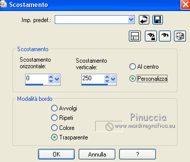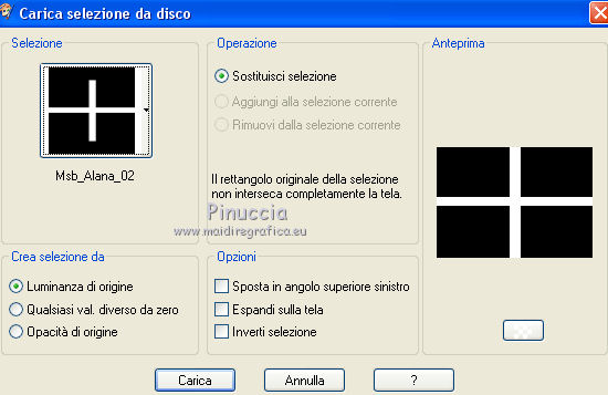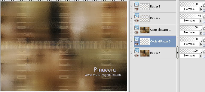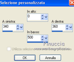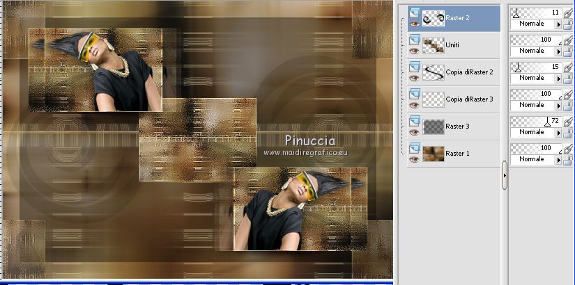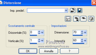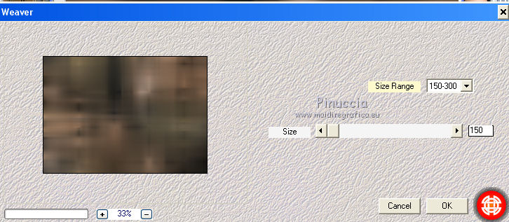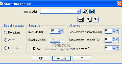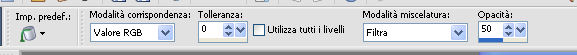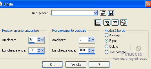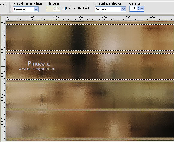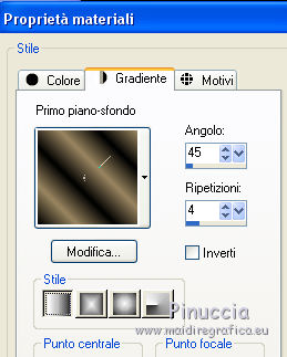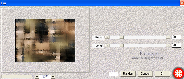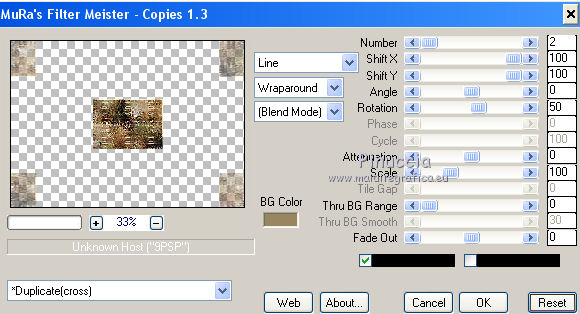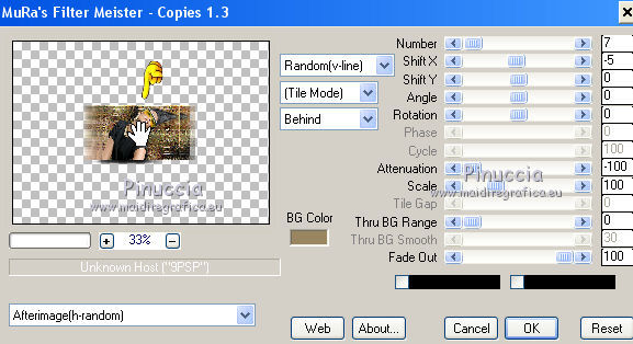 qui puoi trovare qualche risposta ai tuoi dubbi. Se l'argomento che ti interessa non è presente, ti prego di segnalarmelo. Questo tutorial è una creazione ©Meetjesplekje e non può essere copiato su altri siti nè essere offerto per il download. Lo stesso vale per la mia traduzione. Il materiale viene da vari gruppi di condivisione. Il copyright appartiene ai rispettivi autori. Grazie ai creatori dei tubes che mettono a disposizione il loro lavoro in vari gruppi di condivisione. Per tradurre questo tutorial ho usato CorelX, ma può essere realizzato anche con le altre versioni di PSP. Dalla versione X4, il comando Immagine>Rifletti è stato sostituito con Immagine>Capovolgi in orizzontale, e il comando Immagine>Capovolgi con Immagine>Capovolgi in verticale. Nelle versioni X5 e X6, le funzioni sono state migliorate rendendo disponibile il menu Oggetti. Vedi la scheda sull'argomento qui traduzione in francese qui le vostre versioni qui Occorrente: Materiale qui Per il tubes della donna grazie Annelies Grazie Roxy per il pennello. (i siti dei creatori di materiale ici) Filtri: consulta, se necessario, la mia sezione filtri qui Filters Unlimited 2.0 qui &<Bkg Designer sf10III> - Radial Tile01 (da importare in Unlimited) qui &<Bkg Designer sf10IV> - @THE BLAST (da importare in Unlimited) qui Mehdi - Weaver, Equalizer, Fur qui Transparency - Eliminate White qui Mura's Meister - Copies qui I filtri Transparency si possono usare da soli o importati in Filters Unlimited (come fare vedi qui) Se un filtro fornito appare con questa icona ![]() Se stai usando altri colori puoi sperimentare le modalità di miscelatura e le opacità più adatte ai tuoi colori. non esitare a cambiare modalità di miscelatura e opacità secondo i colori utilizzati. Nelle ultime versioni di PSP non c'è il gradiente di primo piano/sfondo (Corel_06_029) Puoi usare i gradienti delle versioni precedenti. Trovi qui i gradienti Corel X. Apri il font e minimizzalo. Lo troverai nella lista dei font disponibili quando ti servirà. Con i nuovi sistemi operativi questo non è più possibile. Per usare un font, occorre copiarlo nella cartella Font di Windows. Metti i pennelli nella cartella Pennelli. Attenzione, ogni pennello è composto da due files che non devono essere separati. Vedi gli appunti sui pennelli qui Metti le selezioni nella cartella Selezioni. Imposta il colore di primo piano con #000000, e il colore di sfondo con #998560. ![]() Passa il colore di primo piano a Gradiente di primo piano/sfondo, stile Lineare. ![]() 1. Apri una nuova immagine trasparente 700 x 500 pixels, e riempila con il gradiente.Selezione>Seleziona tutto. Apri il tube Alies-481-vrouw-208032011 e vai a Modifica>Copia. non chiuderlo perchè ti servirà ancora Torna al tuo lavoro e vai a Modifica>Incolla nella selezione. Selezione>Deseleziona. Effetti>Effetti di immagine>Motivo unico. ![]() Regola>Sfocatura>Sfocatura radiale. ![]() Effetti>Plugins>Mehdi - Weaver. ![]() 2. Livelli>Duplica. Effetti>Effetti di bordo>Aumenta. Effetti>Plugins>Mehdi - Equalizer, con i settaggi standard. ![]() Abbassa l'opacità di questo livello al 40%. Livelli>Unisci>Unisci giù. Livelli>Duplica. Ancora Livelli>Duplica. Effetti>Plugins>Mehdi - Fur, con i settaggi standard. ![]() Effetti>Effetti di bordo>Aumenta. Abbassa l'opacità di questo livello al 40%. Livelli>Unisci>Unisci giù. 3. Livelli>Nuovo livello raster. Selezione>Carica/Salva selezione>Carica selezione da disco. Cerca e carica la selezione Msb_Alana_01. ![]() Riempi la selezione con il colore di sfondo.Modalità di corrispondenza dello strumento impostata in Nessuno e basterà un solo clic per riempire le selezioni. ![]() Selezione>Deseleziona. Effetti>Plugins>Filters Unlimited - &<Bkg Designer sf10IV> - @THE BLAST, con i settaggi standard. ![]() Ripeti il filtro una seconda volta, con i settaggi standard. Abbassa l'opacità di questo livello al 40%. 4. Livelli>Nuovo livello raster. Selezione>Carica/Salva selezione>Carica selezione da disco. Cerca e carica la selezione Msb_Alana_02. ![]() Riempi la selezione con il colore di sfondo.Selezione>Deseleziona. Effetti>Plugins>Filters Unlimited - &<Bkg Designer sf10III> - Radial Tile 01, con i settaggi standard. ![]() **** Circola in rete una versione di Unlimited che non si installa ed è composta da files in formato .8bf. A volte, causa vari fattori, alcuni filtri danno risultati differenti, ma queste differenze non sono codificabili e si possono riscontrare soltanto confrontando i risultati con quelli del tutorial che si sta eseguendo. Questo è uno di questi casi. Se applicando il filtro la tua finestra di anteprima apparirà così: ![]() per avere il risultato corretto, devi sostituire nei Percorsi files il filtro che si installa, con il filtro in formato .8bf che puoi scaricare qui **** Effetti>Plugins>Transparency - Eliminate White. Selezione>Carica/Salva selezione>Carica selezione da disco. Carina nuovamente la selezione Msb_Alana_02. ![]() Selezione>Inverti e avrai selezionato i quattro riquadri ![]() Premi sulla tastiera il tasto CANC ![]() Selezione>Deseleziona. Effetti>Plugins>Mura's Meister - Copies. ![]() Regola>Messa a fuoco>Accentua messa a fuoco. Abbassa l'opacità di questo livello al 60%. ![]() Livelli>Duplica. Attiva il livello sottostante dell'originale. Effetti>Effetti di distorsione>Vento - da sinistra, intensità 100. ![]() Ripeti l'Effetto Vento, questa volta da destra. ![]() Attiva il livello superiore. Livelli>Unisci>Unisci giù. Livelli>Duplica. Livelli>Disponi>Sposta giù. Ripeti ancora due volte Livelli>Disponi>Sposta giù. Il livello deve trovarsi sopra il livello di sfondo. ![]() Chiudi i due livelli inferiori e attiva il livello superiore. ![]() Livelli>Unisci>Unisci visibile. Riapri i due livelli inferiori e rimani posizionato sul livello Uniti. 5. Livelli>Nuovo livello raster. Attiva lo strumento Selezione ![]() clicca sull'icona Selezione personalizzata ![]() e imposta i seguenti settaggi. ![]() Riporta il colore di primo piano 