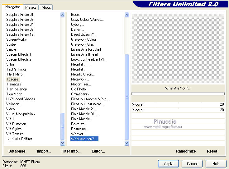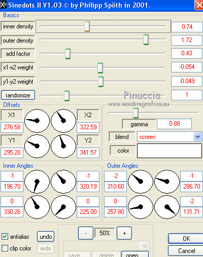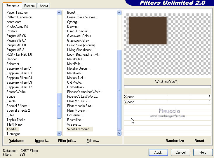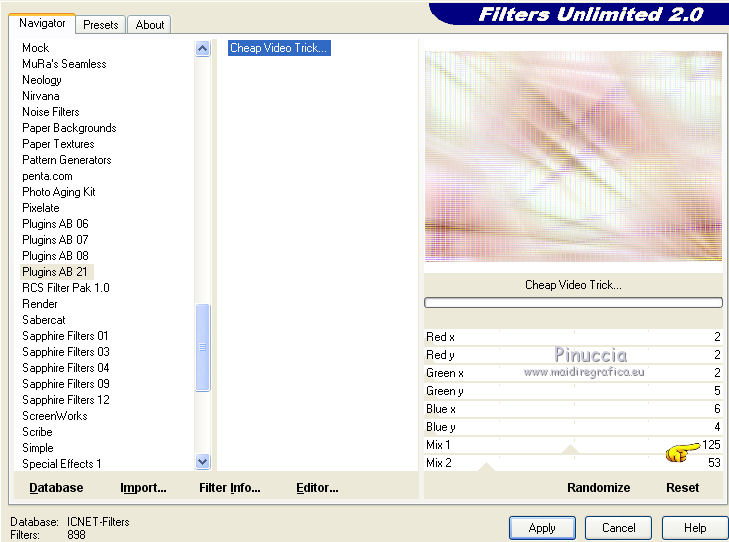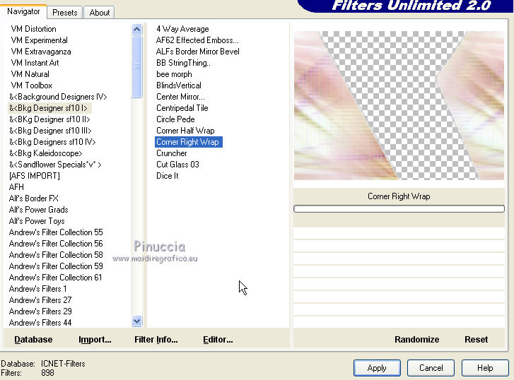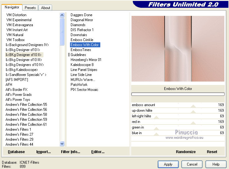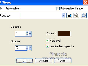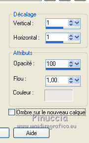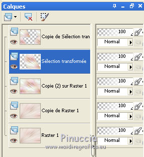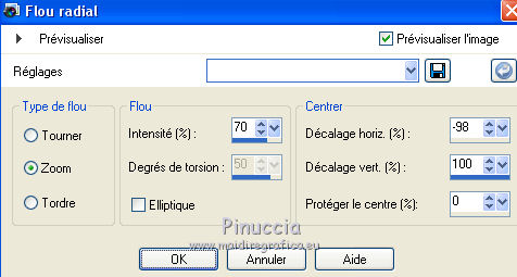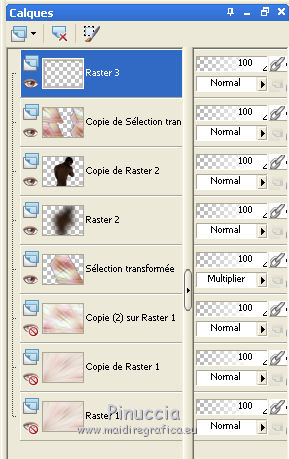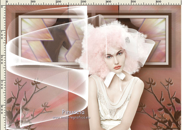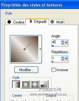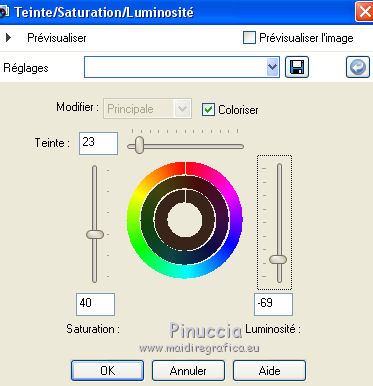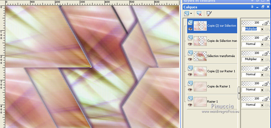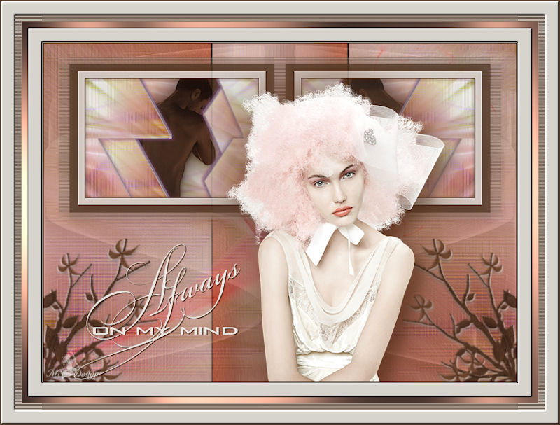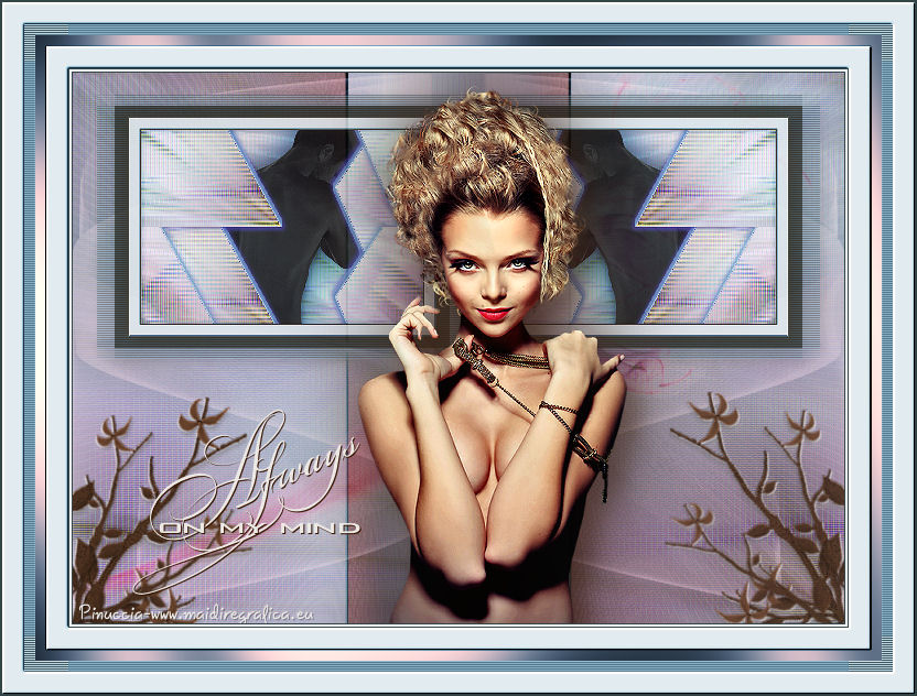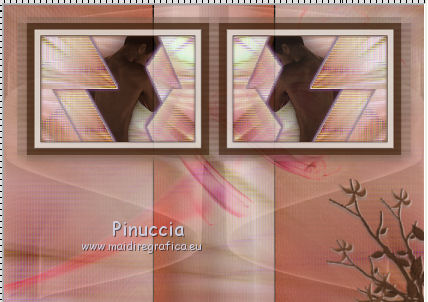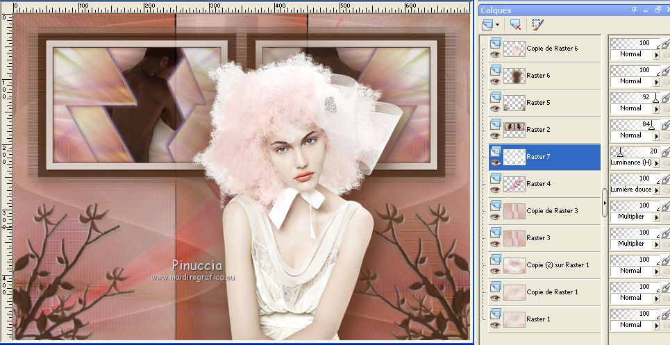 Pour traduire ce tutoriel j'ai utilisé Corel X7 e CorelX2 mais il peut également être exécuté avec les autres versions. Suivant la version utilisée, vous pouvez obtenir des résultats différents. Depuis la version X4, la fonction Image>Miroir a été remplacée par Image>Renverser hhorizontalment, et Image>Renverser avec Image>Renverser verticalemente. Dans les versions X5 et X6, les fonctions ont été améliorées par la mise à disposition du menu Objets. Avec la nouvelle version X7, nous avons à nouveau Miroir/Retourner, mais avec nouvelles différences. Consulter, si vouz voulez, mes notes ici Certaines dénominations ont changées entre les versions de PSP. Les plus frequentes dénominations utilisées: ![]() traduction italienne ici vos versions ici Nécessaire pour réalise le tutoriel: Matériel ici Merci: pour les tubes Annelies et Patries, pour le fractal Sylke. (les liens des sites des tubeuses ici) Modules Externes. consulter, si nécessaire, ma section de filtre ici Filters Unlimited 2.0 ici &<Bkg Designer sf10II> - Emboss with color (da importare in Unlimited) ici &<Bkg Designer sf10I> - Corner Half Wrap, Corner Right Wrap (da importare in Unlimited) ici Plugins AB 21 - Cheap Video Trick ici Toadies - What are you ici Flaming Pear - Flexify 2 ici Dragon Fly - Sinedots2 ici Graphics Plus - Cross Shadow ici Filtres Plugins AB, Toadies et Graphics Plus peuvent être utilisés seuls ou importés dans Filters Unlimited. voir comment le faire ici). Si un filtre est fourni avec cette icône, ![]() N'hésitez pas à changer le mode mélange des calques et leur opacité selon les couleurs que vous utiliserez Dans les plus récentes versions de PSP, vous ne trouvez pas le dégradé d'avant plan/arrière plan ou Corel_06_029. Vous pouvez utiliser le dégradé des versions antérieures. Ici le dossier Dégradés de CorelX. Ouvrez les polices et les minimiser. Vous les trouverez dans la liste des polices disponibles lorsque vous en avez besoin. Avec les nouveaux s.o. ce n'est plus possible. Pour utiliser une police, vous devez la copier dans le dossier Fonts de Windows. Placer les sélections dans le dossier Sélections. Placer en avant plan la couleur #e9cfc9, et en arrière plan la couleur #ece9e5. ![]() Préparer en avant plan un dégradé de premier plan/arrière plan, style Linéaire. ![]() 1. Ouvrir une nouvelle image transparente 700 x 500 pixels, et remplir du dégradé.Sélections>Sélectionner tout. Ouvrir le tube Alies-401-vrouw-2081011 et Édition>Copier. minimiser le tube; on va s'en servir plus tard Revenir sur votre travail et Édition>Coller dans la sélection. Sélections>Désélectionner tout. Effets>Effets d'image>Mosaïque sans jointures, par dèfaut. ![]() Réglage>Flou>Flou radial. ![]() 2. Calques>Dupliquer - 2 fois. Effets>Modules Externes>Filters Unlimited 2.0 - Plugins AB 21 - Cheap Video Trick. ![]() Sélections>Charger/enregistrer une sélection>Charger à partir du disque. Chercher et charger la sélection Msb_Always_on_my_Mind_01. ![]() Sélections>Transformer la sélection en calque. Effets>Effets 3D>Ciselage, couleur blanche. ![]() Sélections>Désélectionner tout. Calques>Dupliquer. Effets>Modules Externes>Filters Unlimited 2.0 - &<Bkg Designer sf10I> - Corner Half Wrap. ![]() Effets>Effets 3D>Ombre portée, couleur #814d93. ![]() Répéter Ombre portée, mais vertical et horizontal -5. Vous positionner sur le calque de dessous. ![]() Calques>Dupliquer. Effets>Modules Externes>Filters Unlimited 2.0 - &<Bkg Designer sf10I> - Corner Right Wrap. ![]() Effets>Effets 3D>Ombre portée, couleur #814d93. ![]() Répéter Ombre portée, mais vertical et horizontal -5. Vous positionner sur le calque de dessous. Effets>Effets 3D>Ombre portée, couleur #814d93. ![]() Placer le calque en mode Multiplier. ![]() Calques>Dupliquer. Calques>Fusionner>Fusionner le calque de dessous. Vous positionner sur le calque du haut de la pile. Calques>Fusionner>Fusionner le calque de dessous. Calques>Dupliquer. Calques>Fusionner>Fusionner le calque de dessous. Calques>Dupliquer. Placer le calque en mode Multiplier. ![]() Calques>Fusionner>Fusionner le calque de dessous. 3. Ouvrir le tube 1Patries_MN122-fetch3-nudetorso lisascan_23-1-11, Édition>Copier. Revenir sur votre travail et Édition>Coller comme nouveau calque. Image>Redimensionner, 1 fois à 90% et 1 fois à 95%, redimensionner tous les calques décoché. Réglage>Teinte et Saturation>Teinte/Saturation>Luminosité. ![]() Effets>Effets 3D>Ombre portée, couleur noire. ![]() Calques>Agencer>Déplacer vers le bas. Positionner bien le tube.![]() Calques>Dupliquer. Vous positionner sur le calque de dessous de l'original. Réglage>Flou>Flou gaussien - rayon 50. ![]() 4. Vous positionner sur le calque du haut de la pile. Placer en avant plan la couleur #543d2b. ![]() Calques>Nouveau calque raster. Remplir avec la couleur d'avant plan.Sélections>Sélectionner tout. Sélections>Modifier>Contracter - 2 pixels. Presser CANC sur le clavier ![]() Remplir avec la couleur d'arrière plan #ece9e5.Sélections>Modifier>Contracter - 25 pixels. Presser CANC sur le clavier ![]() Remplir avec la couleur d'avant plan #543d2b.Sélections>Modifier>Contracter - 2 pixels. Presser CANC sur le clavier ![]() Sélections>Désélectionner tout. Activer l'outil Baguette magique ![]() ![]() cliquer dans le bord de 25 pixels pour le sélectionner. Effets>Effets 3D>Biseautage intérieur. ![]() Sélections>Modifier>Agrandir - 2 pixels. Effets>Effets 3D>Ombre portée, couleur #361602. ![]() Répéter Ombre portée, mais vertical et horizontal -5. Sélections>Désélectionner tout. Fermer les trois calques du bas de la pile. ![]() Calques>Fusionner>Calques visibles. Re-ouvrir les calques fermés et rester positionné sur le calque Fusionné. Image>Redimensionner, à 40%, redimensonner tous les calques décoché. Réglage>Netteté>Netteté. Effets>Effets d'image>Décalage. ![]() Calques>Dupliquer. Image>Miroir. Calques>Fusionner>Fusionner le calque de d