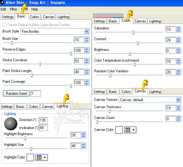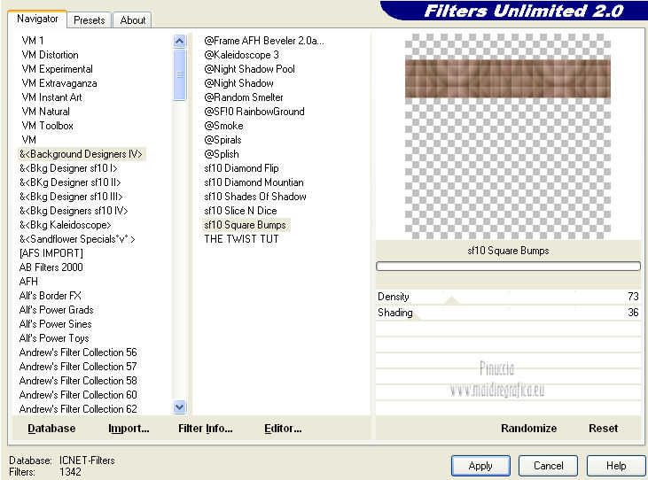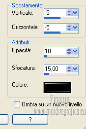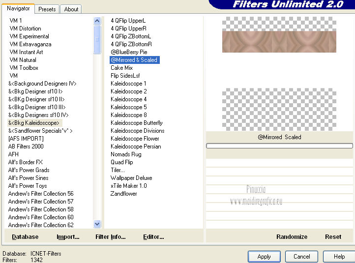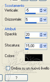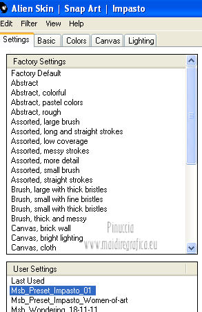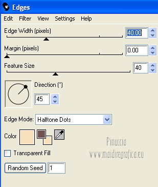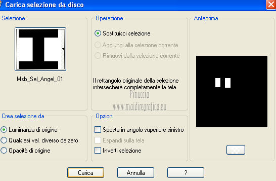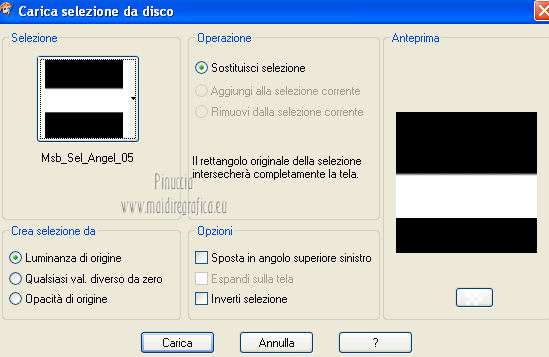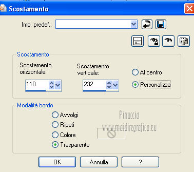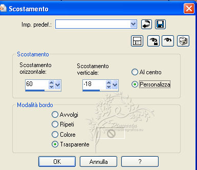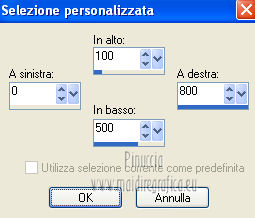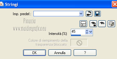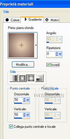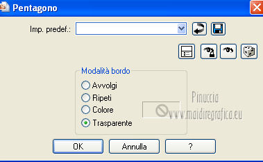 qui puoi trovare qualche risposta ai tuoi dubbi. Se l'argomento che ti interessa non è presente, ti prego di segnalarmelo. Questo tutorial è una creazione ©Meetjesplekje e non può essere copiato su altri siti nè essere offerto per il download. Lo stesso vale per la mia traduzione. Il materiale viene da vari gruppi di condivisione. Il copyright appartiene ai rispettivi autori. Grazie ai creatori dei tubes che mettono a disposizione il loro lavoro in vari gruppi di condivisione. Per tradurre questo tutorial ho usato PSP X. Occorrente: Materiale qui Per i tubes della donna grazie Gina Per il misted delle barche grazie Sharlimar Per il tube del ponte grazie Nikita Filtri: consulta, se necessario, la mia sezione filtri qui Filters Unlimited 2.0 qui &<Background Designers IV> - sf10 Square Bumps (da importare in Unlimited) qui &<Bkg Kaleidoscope> - @Mirrored&Scaled (da importare in Unlimited) qui Alien Skin Eye Candy 5 Impact - Glass qui Alien Skin Eye Candy 5 Texture - Wood qui Alien Skin Splat! - Border Stamp, Edges qui Alien Skin Snap Art - Impasto qui Nik Software - Color Efex Pro qui Flaming Pear - Flood qui Graphics Plus - Cross Shadow qui ![]() Se stai usando altri colori puoi sperimentare le modalità di miscelatura e le opacità più adatte ai tuoi colori. Metti il preset Cliccando sul file una o due volte (a seconda delle tue impostazioni), automaticamente il preset si installerà nella cartella corretta. perchè uno o due clic vedi qui Metti le selezioni nella cartella Selezioni. Imposta il colore di primo piano con #6f5250, e il colore di sfondo con #f9e1c0. ![]() Passa il colore di primo piano a Gradiente, stile Sprazzo di luce, con i seguenti settaggi ![]() 1. Apri una nuova immagine trasparente 800 x 600 pixels, e riempila con il gradiente.Selezione>Seleziona tutto. Apri il tube GINATUBES DIVERS 356 e vai a Modifica>Copia. non chiuderlo perchè ti servirà ancora. Torna al tuo lavoro e vai a Modifica>Incolla nella selezione. Selezione>Deseleziona. Effetti>Effetti di immagine>Motivo unico, con i settaggi standard. ![]() Regola>Sfocatura>Sfocatura radiale, con i seguenti settaggi. ![]() Livelli>Duplica. Effetti>Effetti di riflesso>Caleidoscopio. ![]() 2. Attiva lo strumento Selezione ,clicca sull'icona Selezione personalizzata ![]() e imposta i seguenti settaggi: ![]() Selezione>Innalza selezione a livello. Selezione>Deseleziona. Effetti>Plugins>Unlimited 2.0 – &<Bkg Kaleidoscope> - @Mirrored & Scaled. ![]() Attiva lo strumento Bacchetta magica ![]() e clicca nella striscia bianca al centro per selezionarla. ![]() Premi sulla tastiera il tasto CANC .Selezione>Deseleziona. Livelli>Duplica. Effetti>Plugins>Filters Unlimited 2.0 – &<Background Designers IV> - sf10 Square Bumps. ![]() Effetti>Effetti geometrici>Pentagono. ![]() Modifica>Ripeti Pentagono. 3. Livelli>Nuovo livello raster. Selezione>Carica/Salva selezione>Carica selezione da disco. Cerca e carica la selezione Msb_Sel_Angel_01. ![]() Effetti>Plugins>Splat – Edges, colore #f9e1c0. ![]() Livelli>Nuovo livello raster. Effetti>Plugins>Alien Skin Eye candy 5 Impact – Glass. Seleziona il preset Clear e ok. ![]() Selezione>Deseleziona. 4. Livelli>Nuovo livello raster. Selezione>Carica/Salva selezione>Carica selezione da disco. Cerca e carica la selezione Msb_Sel_Angel_02. ![]() Effetti>Plugins>Splat – Border Stamp, ti apparirà un messaggio di avvertimento che la selezione è troppo piccola. Non preoccuparti. Clicca ok e continua ![]() Settings: seleziona Small Flowers con i seguenti settaggi: ![]() Selezione>Deseleziona. Regola>Tonalità e saturazione>Viraggio. ![]() Livelli>Unisci>Unisci giù - 2 volte. Livelli>Duplica. Immagine>Rifletti. Posiziona i due elementi,in modo che la distanza tra le "finestre" sia ordinata. ![]() Assicurati di essere posizionato sul livello superiore dei due. Livelli>Unisci>Unisci giù. Effetti>Effetti 3D>Sfalsa ombra, con il colore nero. ![]() 5. La tua paletta è sempre: colore di primo piano: #6f5250. Colore di sfondo #f9e1c0. ![]() Gradiente Sprazzo di luce. ![]() Livelli>Nuovo livello raster. Selezione>Carica/Salva selezione>Carica selezione da disco. Cerca e carica la selezione Msb_Sel_Angel_03. ![]() Riempi la selezione con il gradiente.Effetti>Plugins>Alien Skin Snap Art – Impasto. Seleziona il preset Msb_Preset_Impasto_01 e ok. ![]() Questi i settaggi, che puoi impostare manualmente in caso di problemi con il preset. ![]() Selezione>Deseleziona. Livelli>Disponi>Sposta giù. Attiva nuovamente il livello superiore. Livelli>Unisci>Unisci giù - 2 volte. 6. Livelli>Nuovo livello raster. Selezione>Carica/Salva selezione>Carica selezione da disco. Cerca e carica la selezione Msb_Sel_Angel_04. ![]() Effetti>Plugins>Alien Skin Eye candy 5 Texture – Wood, seleziona il preset Cedar Sotto Basic: Pulp Colore: colore di sfondo #6f5250 e Bark Color: colore di primo piano #f9e1c0. ![]() Selezione>Deseleziona. Effetti>Effetti 3D>Sfalsa ombra, con il colore nero. ![]() Ripeti l'Effetto Sfalsa ombra, cambiando verticale e orizzontale con -5. Livelli>Unisci>Unisci giù. Effetti>Effetti di distorsione>Stringi (nelle versioni più recenti ha assunto la denominazione Compressione). ![]() Effetti>Effetti di immagine>Scostamento. ![]() Effetti>Plugins>Flaming Pear – Flood. ![]() Livelli>Duplica. Immagine>Rifletti. Effetti>Effetti di immagine>Scostamento. ![]() Livelli>Unisci>Unisci giù. Effetti>Effetti 3D>Sfalsa ombra, con il colore nero. ![]() 7. Livelli>Nuovo livello raster. Selezione>Carica/Salva selezione>Carica selezione da disco. Cerca e carica la selezione Msb_Sel_Angel_05. ![]() Riempi la selezione con il gradiente.Effetti>Plugins>Flaming Pear - Flood, cambia Horizon con 0 e ok. ![]() Selezione>Deseleziona. Livelli>Disponi>Sposta giù. Effetti>Effetti 3D>Sfalsa ombra, con il colore nero. ![]() Attiva nuovamente il livello superiore. 8. Apri il misted "afbeelding 2" e vai a Modifica>Copia. Torna al tuo lavoro e vai a Modifica>Incolla come nuovo livello. Sposta il tube un po' più in al