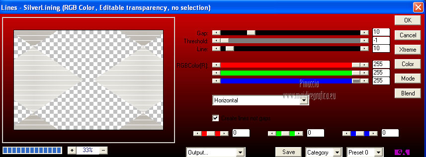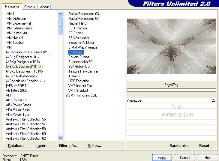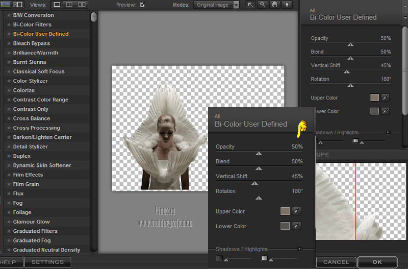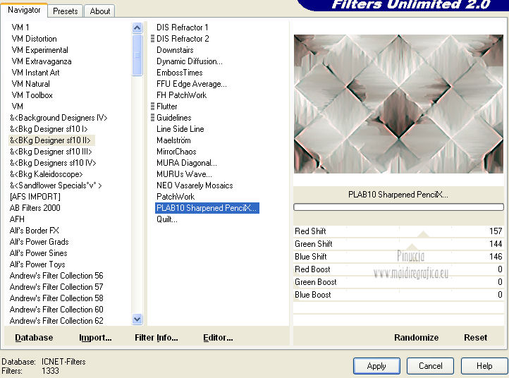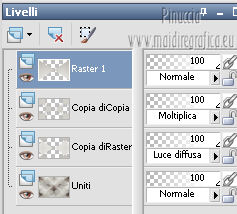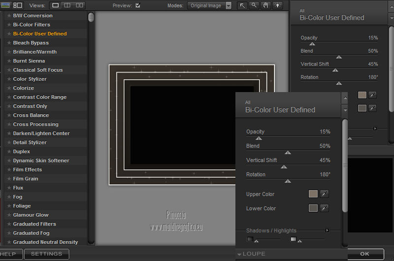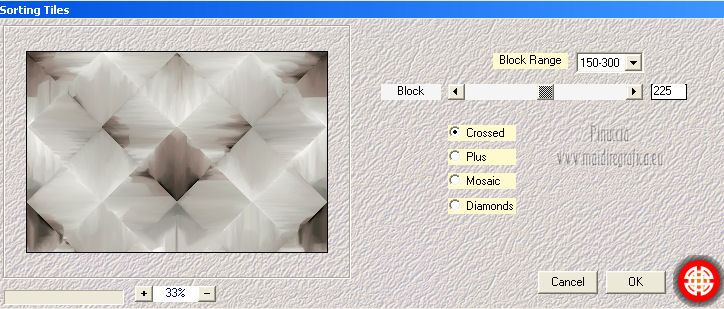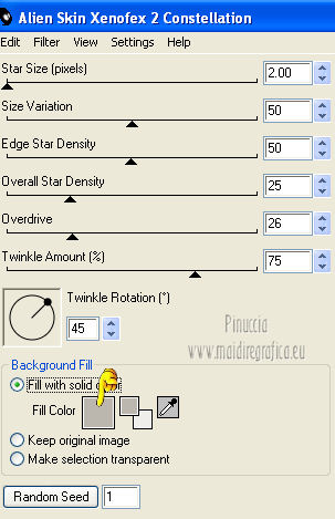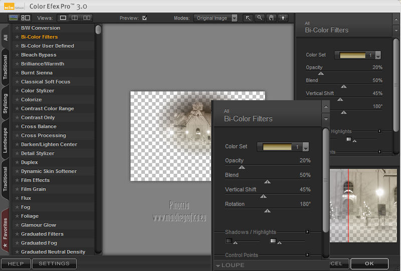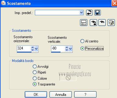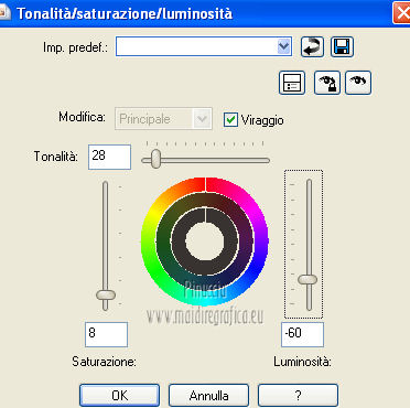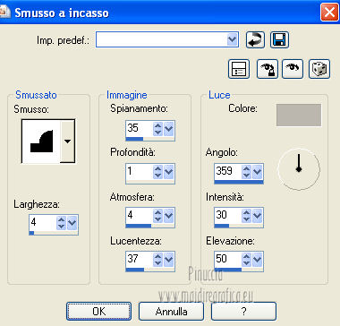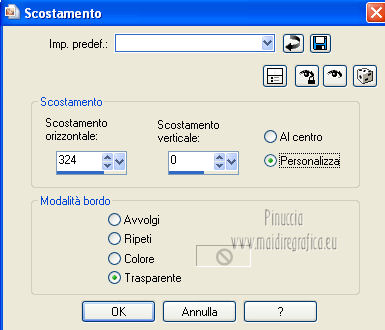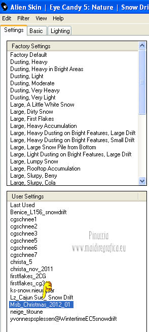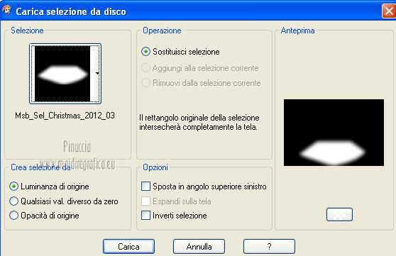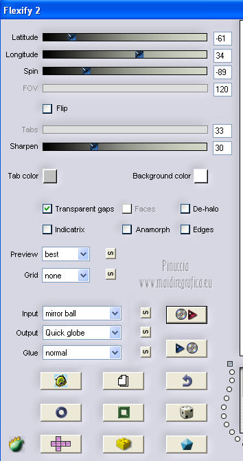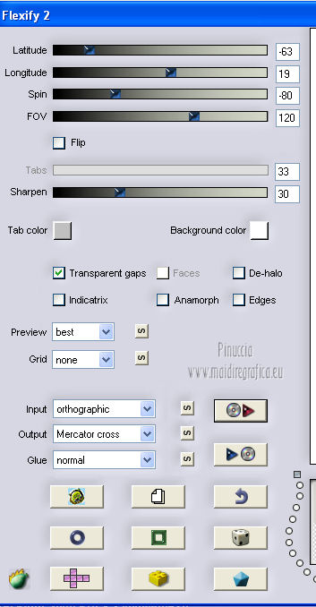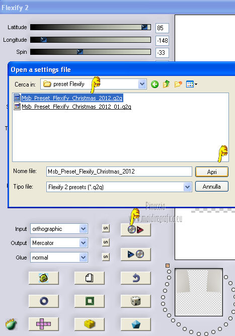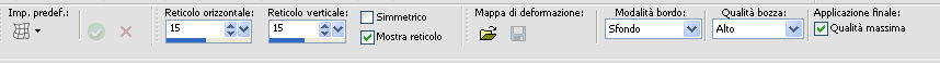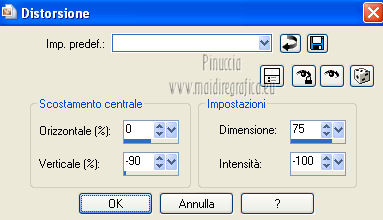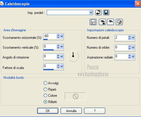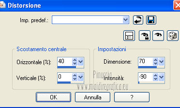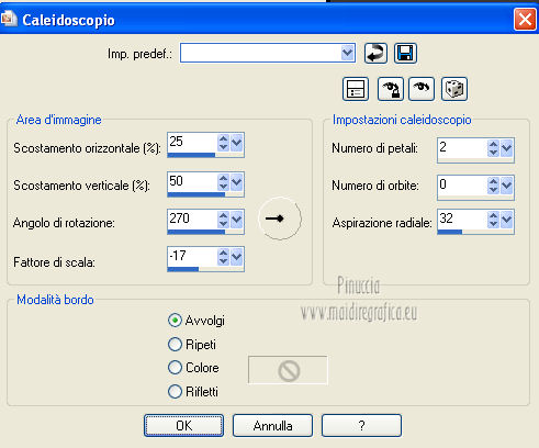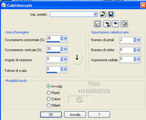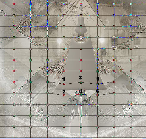 qui puoi trovare qualche risposta ai tuoi dubbi. Se l'argomento che ti interessa non è presente, ti prego di segnalarmelo. Questo tutorial è una creazione ©Meetjesplekje e non può essere copiato su altri siti nè essere offerto per il download. Lo stesso vale per la mia traduzione. Il materiale viene da vari gruppi di condivisione. Il copyright appartiene ai rispettivi autori. Grazie ai creatori dei tubes che mettono a disposizione il loro lavoro in vari gruppi di condivisione. Questo tutorial è stato creato con PSP X3. Per tradurlo ho usato PSP X. Occorrente: Materiale qui Per il tube della donna grazie Annelies Per il misted grazie Daan. Filtri: consulta, se necessario, la mia sezione filtri qui Filters Unlimited 2.0 qui &<Bkg Designersf10II> - PLAB10 Sharpened PencilX (da importare in Unlimited) qui &<Bkg Designersf10III> - SpyroZag (da importare in Unlimited) qui Mehdi - Sorting Tiles qui Flaming Pear - Flexify 2 qui AP 01 [Innovations] Lines - Lines SilverLining qui Alien Skin Xenofex 2.0 - Constellation qui Alien Skin Eye Candy 5 Nature - Snowdrift qui Nik Software - Color Efex Pro qui Italian Editors - Effetto Fantasma qui Adjust - Variations qui ![]() Se stai usando altri colori puoi sperimentare le modalità di miscelatura e le opacità più adatte ai tuoi colori. Metti i preset per Flaming Pear in una cartella a scelta. Lo importerai da questa cartella quando ti servirà. Metti il gradiente nella cartella Gradienti. Metti le selezioni nella cartella Selezioni. Imposta il colore di primo piano con #bbb7af, e il colore di sfondo con #efeeea. ![]() Passa il colore di primo piano a Gradiente, e seleziona il gradiente Msb_Gradient_10-11-12, con i seguenti settaggi. ![]() 1. Apri una nuova immagine trasparente 900 x 600 pixels, e riempila con il gradiente.Selezione>Seleziona tutto. Apri il tube Alies 11VR31 e vai a Modifica>Copia. non chiuderlo perchè ti servirà ancora Torna al tuo lavoro e vai a Modifica>Incolla nella selezione. Selezione>Deseleziona. Effetti>Effetti di immagine>Motivo unico, con i settaggi standard. ![]() Effetti>Plugins>Mehdi - Sorting Tiles. ![]() Livelli>Duplica. Effetti>Plugins>Filters Unlimited 2.0 - &<Bkg Designer sf10II> PLAB10 Sharpened PencilX, con i settaggi standard. ![]() Abbassa l'opacità di questo livello al 50%. Livelli>Unisci>Unisci visibile. ![]() 2. Attiva lo strumento Selezione ,clicca sull'icona Selezione personalizzata ![]() e imposta i seguenti settaggi: ![]() Selezione>Innalza selezione a livello. Effetti>Plugins>Filters Unlimited 2.0 - &<Bkg Designer sf10III> SpyroZag. ![]() Effetti>Effetti di bordo>Aumenta. Selezione>Deseleziona. Livelli>Unisci>Unisci visibile. ![]() 3. Livelli>Nuovo livello raster. Selezione>Carica/Salva selezione>Carica selezione da disco. Cerca e carica la selezione Msb_Sel_Christmas_2012_01. ![]() Riempi la selezione con il gradiente.Selezione>Deseleziona. Livelli>Duplica. Immagine>Rifletti. Livelli>Unisci>Unisci giù. Livelli>Duplica. Ancora Livelli>Duplica. Chiudi i due livelli inferiori. ![]() Effetti>Plugins>Flaming Pear - Flexify 2. clicca sull'icona con la freccia rossa cerca e seleziona il preset Msb_Preset_Flexify_Christmas_2012. Clicca Apri per applicare. ![]() Ok per confermare. se hai problemi con il preset, imposta manualmente i settaggi che vedi nella schermata ![]() Effetti>Effetti di riflesso>Caleidoscopio. ![]() Cambia la modalità di miscelatura di questo livello in Moltiplica. Effetti>Effetti 3D>Sfalsa ombra, con il colore nero. ![]() Livelli>Disponi>Sposta giù - 2 volte. Apri e attiva il livello superiore. ![]() 4. Effetti>Effetti di riflesso>Caleidoscopio. ![]() Cambia la modalità di miscelatura di questo livello in Luce diffusa. Effetti>Plugins>AP 01 [Innovations] - Lines SilverLining. ![]() Effetti>Effetti 3D>Sfalsa ombra, con il colore nero. ![]() Livelli>Disponi>Sposta giù - 2 volte. Apri e attiva il livello superiore. ![]() 5. Effetti>Effetti di riflesso>Caleidoscopio. ![]() Cambia la modalità di miscelatura di questo livello in Luce diffusa. Effetti>Effetti 3D>Sfalsa ombra, con il colore nero. ![]() Livelli>Disponi>Sposta giù - 2 volte. 6. Livelli>Nuovo livello raster. Selezione>Carica/Salva selezione>Carica selezione da disco. Cerca e carica la selezione Msb_Sel_Christmas_2012_02. ![]() Riempi la selezione con il gradiente.Effetti>Plugins>Alien skin Xenofex 2.0 - Constellation - colore di primo piano. ![]() Selezione>Deseleziona. Effetti>Effetti 3D>Sfalsa ombra, con il colore nero. ![]() 7. Apri il tube daantje.christmashouse e vai a Modifica>Copia. Torna al tuo lavoro e vai a Modifica>Incolla come nuovo livello. Effetti>Effetti di immagine>Scostamento. ![]() Regola>Tonalità e saturazione>Viraggio. ![]() Effetti>Plugins>Nik software – Color Efex Pro 3.0 A sinistra seleziona Bi-Color Filters, e a destra seleziona il Color set Brown 1, con i seguenti settaggi. ![]() Regola>Messa a fuoco>Metti a fuoco. Abbassa l'opacità di questo livello al 76%. Livelli>Disponi>Porta in alto. 8. Livelli>Nuovo livello raster. Selezione>Carica/Salva selezione>Carica selezione da disco. Cerca e carica nuovamente la selezione Msb_Sel_Christmas_2012_01. ![]() Riempi la selezione con il gradiente.Selezione>Deseleziona. Livelli>Duplica. Immagine>Rifletti. Livelli>Unisci>Unisci giù. Immagine>Ridimensiona, al 60%, tutti i livelli non selezionato. Immagine>Ruota per gradi - 90 gradi a destra. ![]() Effetti>Effetti di distorsione>Distorsione. ![]() Immagine>Ridimensiona, al 50%, tutti i livelli non selezionato. Effetti>Effetti 3D>Smusso a incasso, con il colore di primo piano. ![]() Attiva lo strumento Distorsione con reticolo ![]() con i seguenti settaggi. ![]() Tira i nodi indicati nella schermata sotto, per dare una leggera rotondità alla forma. ![]() Effetti>Effetti 3D>Sfalsa ombra, con il colore nero. ![]() 9. Riporta il colore di primo piano da Gradiente al colore iniziale. Livelli>Nuovo livello raster. Riempi con il colore di primo piano.Effetti>Plugins>Flaming Pear - Flexify 2. Clicca sull'icona d
