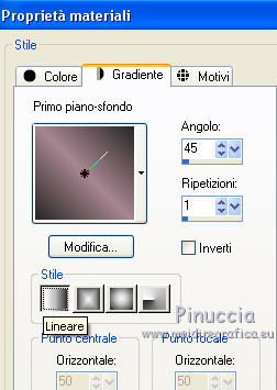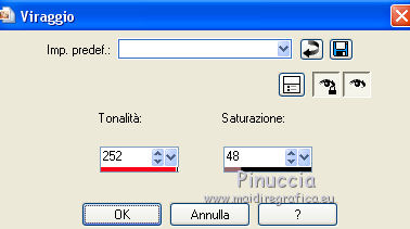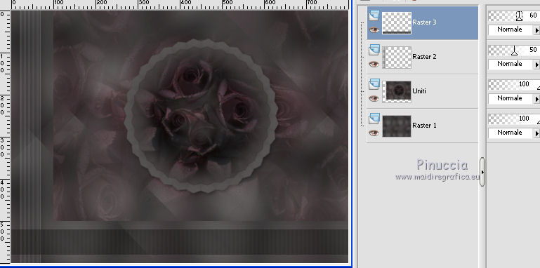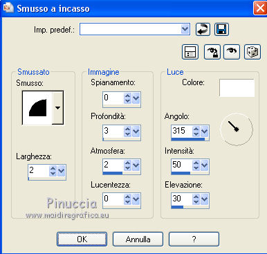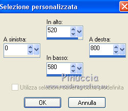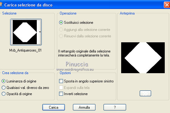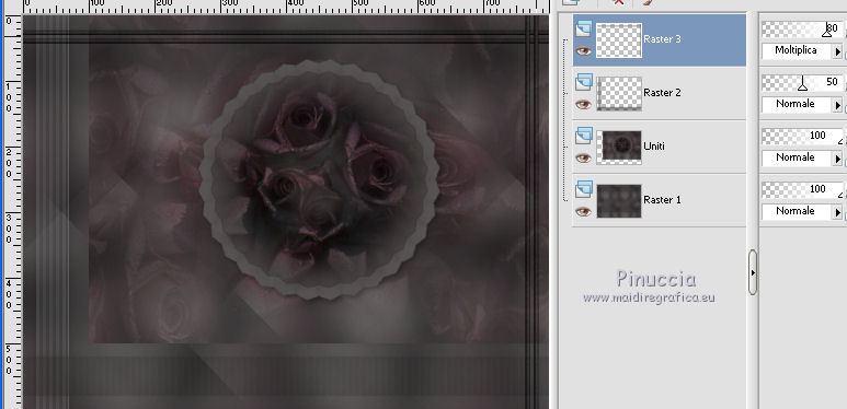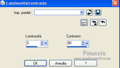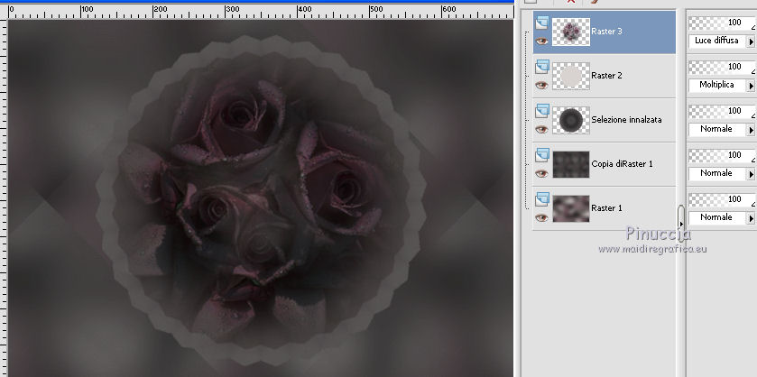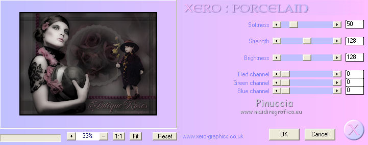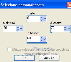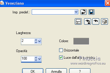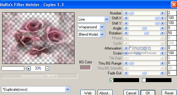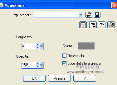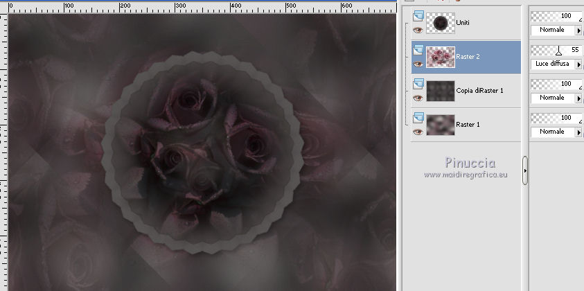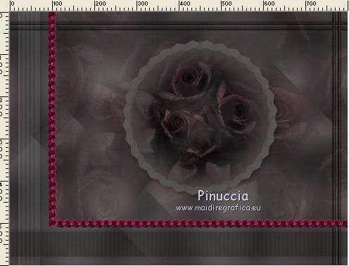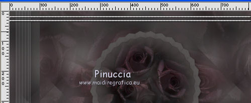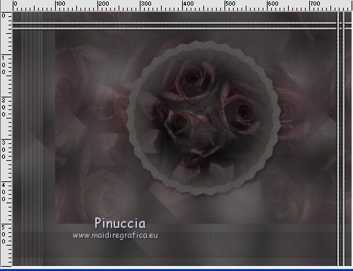 qui puoi trovare qualche risposta ai tuoi dubbi. Se l'argomento che ti interessa non è presente, ti prego di segnalarmelo. Questo tutorial è una creazione ©Meetjesplekje e non può essere copiato su altri siti nè essere offerto per il download. Lo stesso vale per la mia traduzione. Il materiale viene da vari gruppi di condivisione. Il copyright appartiene ai rispettivi autori. Grazie ai creatori dei tubes che mettono a disposizione il loro lavoro in vari gruppi di condivisione. Per tradurre questo tutorial ho usato CorelX, ma può essere realizzato anche con le altre versioni di PSP. Dalla versione X4, il comando Immagine>Rifletti è stato sostituito con Immagine>Capovolgi in orizzontale, e il comando Immagine>Capovolgi con Immagine>Capovolgi in verticale. Nelle versioni X5 e X6, le funzioni sono state migliorate rendendo disponibile il menu Oggetti. Con la versione X7 sono tornati i comandi Immagine>Rifletti e Immagine>Capovolgi, ma con nuove funzioni. Vedi la scheda sull'argomento qui traduzione in francese/traduction en français qui/ici le vostre versioni/vos versions qui/ici Occorrente: Materiale qui Per i tubes grazie Kitty, Kb.Anderson, Gini, e Monique. Filtri: consulta, se necessario, la mia sezione filtri qui Filters Unlimited 2.0 qui &<Bkg Designer sf10II> - Emboss Crinkle, Diamonds, Kaleidoscope 8 (da importare in Unlimited) qui Mura's Meister - Copies qui Adjust - Variations qui Xero - Porcelain qui ![]() Se stai usando altri colori puoi sperimentare le modalità di miscelatura e le opacità più adatte ai tuoi colori. Nelle ultime versioni di PSP non c'è il gradiente di primo piano/sfondo (Corel_06_029) Trovi i gradienti delle versioni precedenti qui Apri il font e minimizzalo. Lo troverai nella lista dei font disponibili quando ti servirà. Con i nuovi sistemi operativi questo non è più possibile. Per usare un font, occorre copiarlo nella cartella Font di Windows. Metti la selezione nella cartella Selezioni. Imposta il colore di primo piano con #282725, e il colore di sfondo con #a78691. ![]() Passa il colore di primo piano a Gradiente di primo piano/sfondo, stile Lineare. ![]() 1. Apri una nuova immagine trasparente 700 x 500 pixels, e riempila con il gradiente.Selezione>Seleziona tutto. Apri il tube kittys-pinkroses e vai a Modifica>Copia. Torna al tuo lavoro e vai a Modifica>Incolla nella selezione. Selezione>Deseleziona. Effetti>Effetti di immagine>Motivo unico, con i settaggi standard. ![]() Regola>Sfocatura>Sfocatura gaussiana, raggio 40. ![]() 2. Livelli>Duplica. Effetti>Plugins>Filters Unlimited 2.0 - &<Bkg Designer sf10 II> - Emboss Crinkle, con i settaggi standard. ![]() Effetti>Plugins>Filters Unlimited 2.0 - &<Bkg Designer sf10 II> - Diamonds. ![]() Selezione>Carica/Salva selezione>Carica selezione da disco. Cerca e carica la selezione Msb_Antiqueroses_01. ![]() Selezione>Innalza selezione a livello. Selezione>Deseleziona. Effetti>Plugins>Filters Unlimited 2.0 - &<Bkg Designer sf10 II> - Kaleidoscope 8, con i settaggi standard. ![]() Selezione>Seleziona tutto. Selezione>Mobile. Selezione>Immobilizza. Selezione>Modifica>Contrai - 2 pixels. Selezione>Inverti. Premi sulla tastiera il tasto CANC ![]() Selezione>Inverti. 3.Livelli>Nuovo livello raster. Imposta il colore di primo piano con il colore #d8d3d0, e riempi con questo colore.Mantieni ancora selezionato. Immagine>Ridimensiona, al 90%, tutti i livelli non selezionato. Cambia la modalità di miscelatura di questo livello in Moltiplica. ![]() Livelli>Nuovo livello raster. Apri il tube AntiqueRoses_MistedByGini_08-12-06 e vai a Modifica>Copia. Torna al tuo lavoro e vai a Modifica>Incolla nella selezione. Selezione>Deseleziona. Effetti>Effetti 3D>Sfalsa ombra, colore nero. ![]() Effetti>Plugins>Adjust – Variatons. un clic su Original per annullare eventuali precedenti settaggi memorizzati dal filtro, 1 clic su More Cyan et ok. ![]() Cambia la modalità di miscelatura di questo livello in Luce diffusa. ![]() Attiva il livello sottostante (Raster 2). Effetti>Effetti 3D>Sfalsa ombra, colore nero. ![]() Attiva il livello sottostante (selezione innalzata). Effetti>Effetti 3D>Sfalsa ombra, colore nero. ![]() Chiudi i due livelli inferiori. ![]() Livelli>Unisci>Unisci visibile. Immagine>Ridimensiona, all'80%, tutti i livelli non selezionato. Livelli>Visualizza>Tutto e rimani posizionato sul livello superiore. 4. Livelli>Nuovo livello raster. Selezione>Seleziona tutto. Modifica>Incolla nella selezione (il tube AntiqueRoses_MistedByGini_08-12-06 è sempre in memoria). Selezione>Deseleziona. Effetti>Plugins>MuRa’s Meister – Copies. ![]() Cambia la modalità di miscelatura di questo livello in Luce diffusa e abbassa l'opacità al 55%. Livelli>Disponi>Sposta giù. ![]() 5. Attiva il secondo livello dal basso - copia di Raster 1. Modifica>Copia. Modifica>Incolla come nuova immagine. Salva l'immagine per precauzione, e minimizzala. Torna al tuo lavoro. Livelli>Unisci>Unisci visibile. Immagine>Dimensioni tela - 800 x 600 pixels, ![]() Livelli>Nuovo livello raster. Selezione>Seleziona tutto. Modifica>Incolla nella selezione. Livelli>Disponi>Porta sotto. Attiva nuovamente il livello superiore. Selezione>Deseleziona. 5.Livelli>Nuovo livello raster. Attiva lo strumento Selezione ![]() (non importa il tipo di selezione impostato, perchè con la selezione personalizzata si ottiene sempre un rettangolo) clicca sull'icona Selezione personalizzata ![]() e imposta i seguenti settaggi. ![]() Abbassa l'opacità dello strumento Riempimento a 50. Riempi la selezione con il colore di primo piano #d8d3d0.Abbassa l'opacità di questo livello al 50%. ![]() Selezione>Deseleziona. Effetti>Effetti di trama>Veneziana, colore #808080 ![]() Effetti>Effetti di bordo>Aumenta. Effetti>Effetti 3D>Sfalsa ombra, colore nero. ![]() Ripeti l'Effetto Sfalsa ombra, cambiando verticale e orizzontale con -5. 6.Livelli>Nuovo livello raster. Selezione personalizzata ![]() ![]() Riporta il colore di primo piano al colore iniziale #282725. Imposta l'opaci