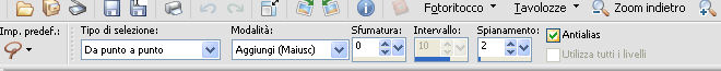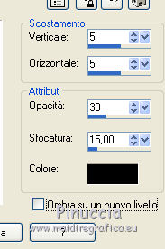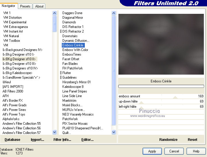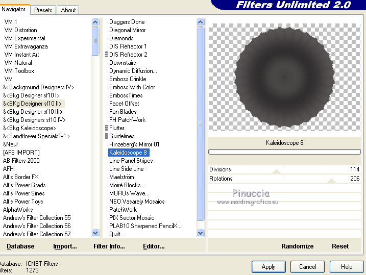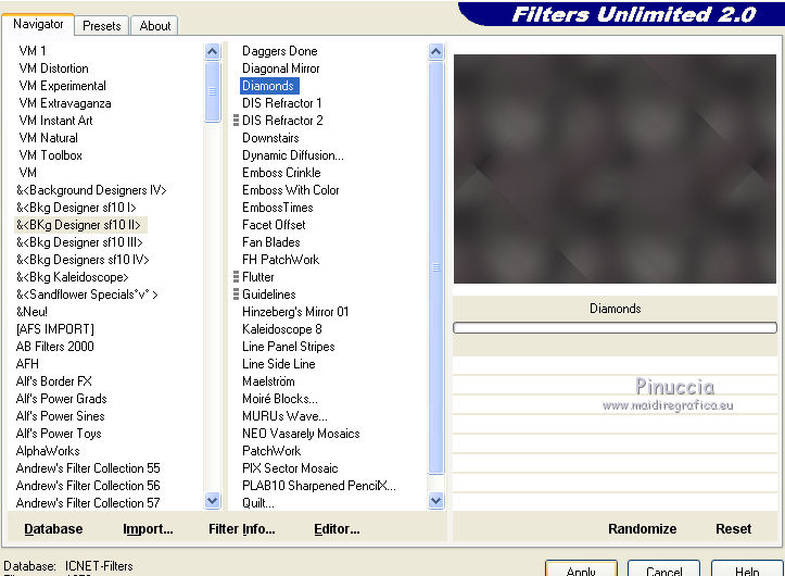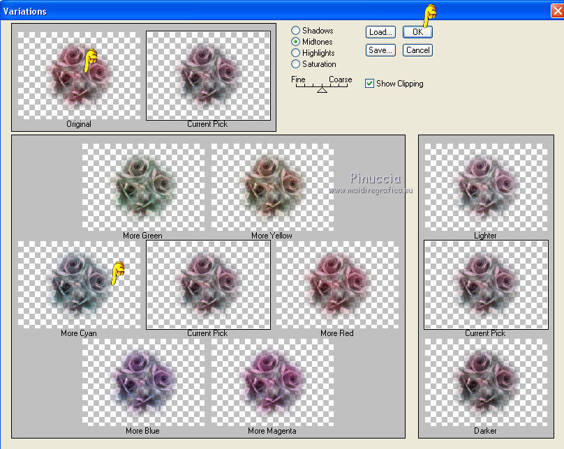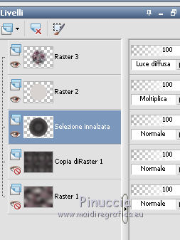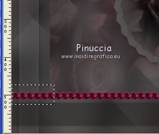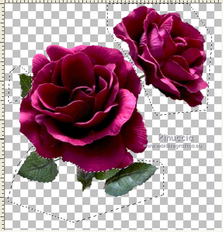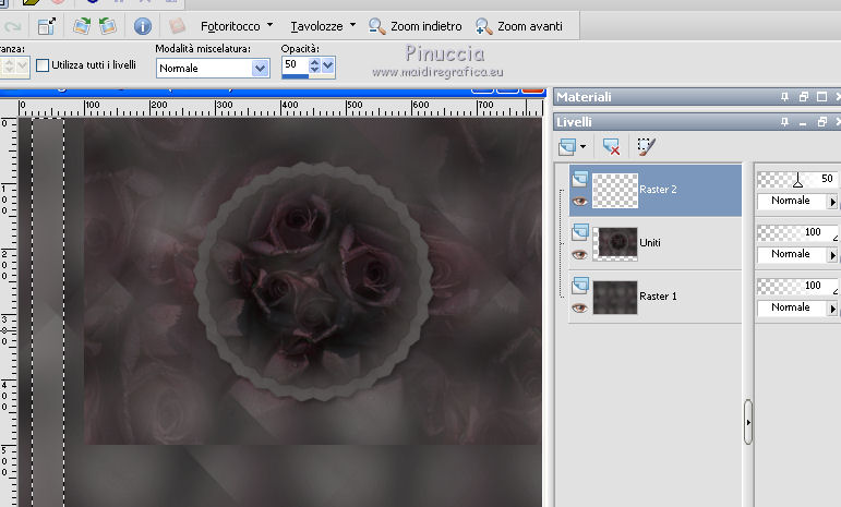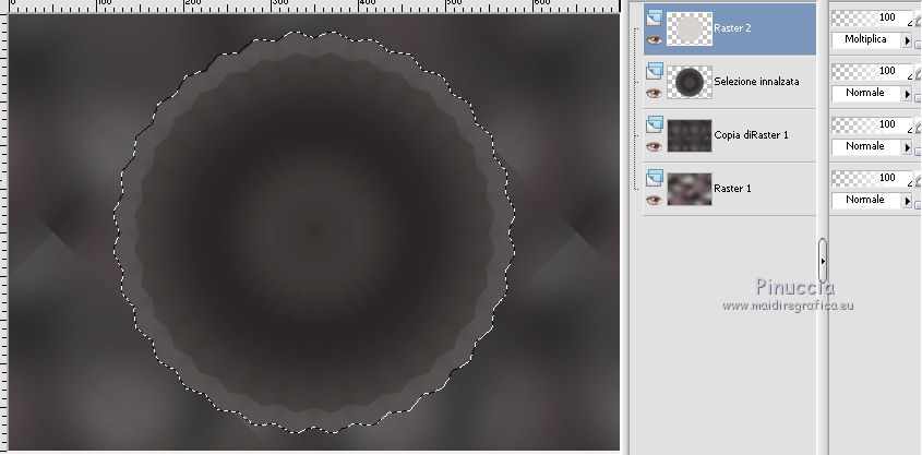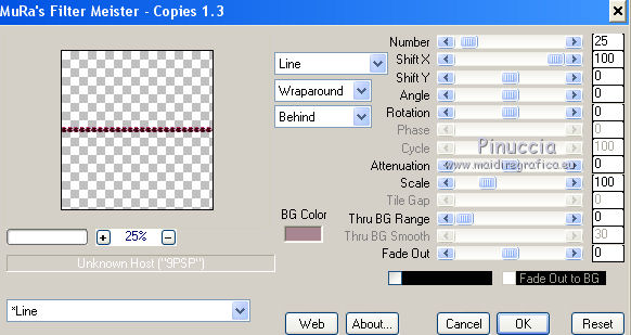 qui puoi trovare qualche risposta ai tuoi dubbi. Se l'argomento che ti interessa non è presente, ti prego di segnalarmelo. Questo tutorial è una creazione ©Meetjesplekje e non può essere copiato su altri siti nè essere offerto per il download. Lo stesso vale per la mia traduzione. Il materiale viene da vari gruppi di condivisione. Il copyright appartiene ai rispettivi autori. Grazie ai creatori dei tubes che mettono a disposizione il loro lavoro in vari gruppi di condivisione. Per tradurre questo tutorial ho usato CorelX, ma può essere realizzato anche con le altre versioni di PSP. Dalla versione X4, il comando Immagine>Rifletti è stato sostituito con Immagine>Capovolgi in orizzontale, e il comando Immagine>Capovolgi con Immagine>Capovolgi in verticale. Nelle versioni X5 e X6, le funzioni sono state migliorate rendendo disponibile il menu Oggetti. Con la versione X7 sono tornati i comandi Immagine>Rifletti e Immagine>Capovolgi, ma con nuove funzioni. Vedi la scheda sull'argomento qui traduzione in francese/traduction en français qui/ici le vostre versioni/vos versions qui/ici Occorrente: Materiale qui Per i tubes grazie Kitty, Kb.Anderson, Gini, e Monique. Filtri: consulta, se necessario, la mia sezione filtri qui Filters Unlimited 2.0 qui &<Bkg Designer sf10II> - Emboss Crinkle, Diamonds, Kaleidoscope 8 (da importare in Unlimited) qui Mura's Meister - Copies qui Adjust - Variations qui Xero - Porcelain qui ![]() Se stai usando altri colori puoi sperimentare le modalità di miscelatura e le opacità più adatte ai tuoi colori. Nelle ultime versioni di PSP non c'è il gradiente di primo piano/sfondo (Corel_06_029) Trovi i gradienti delle versioni precedenti qui Apri il font e minimizzalo. Lo troverai nella lista dei font disponibili quando ti servirà. Con i nuovi sistemi operativi questo non è più possibile. Per usare un font, occorre copiarlo nella cartella Font di Windows. Metti la selezione nella cartella Selezioni. Imposta il colore di primo piano con #282725, e il colore di sfondo con #a78691. ![]() Passa il colore di primo piano a Gradiente di primo piano/sfondo, stile Lineare. ![]() 1. Apri una nuova immagine trasparente 700 x 500 pixels, e riempila con il gradiente.Selezione>Seleziona tutto. Apri il tube kittys-pinkroses e vai a Modifica>Copia. Torna al tuo lavoro e vai a Modifica>Incolla nella selezione. Selezione>Deseleziona. Effetti>Effetti di immagine>Motivo unico, con i settaggi standard. ![]() Regola>Sfocatura>Sfocatura gaussiana, raggio 40. ![]() 2. Livelli>Duplica. Effetti>Plugins>Filters Unlimited 2.0 - &<Bkg Designer sf10 II> - Emboss Crinkle, con i settaggi standard. ![]() Effetti>Plugins>Filters Unlimited 2.0 - &<Bkg Designer sf10 II> - Diamonds. ![]() Selezione>Carica/Salva selezione>Carica selezione da disco. Cerca e carica la selezione Msb_Antiqueroses_01. ![]() Selezione>Innalza selezione a livello. Selezione>Deseleziona. Effetti>Plugins>Filters Unlimited 2.0 - &<Bkg Designer sf10 II> - Kaleidoscope 8, con i settaggi standard. ![]() Selezione>Seleziona tutto. Selezione>Mobile. Selezione>Immobilizza. Selezione>Modifica>Contrai - 2 pixels. Selezione>Inverti. Premi sulla tastiera il tasto CANC ![]() Selezione>Inverti. 3.Livelli>Nuovo livello raster. Imposta il colore di primo piano con il colore #d8d3d0, e riempi con questo colore.Mantieni ancora selezionato. Immagine>Ridimensiona, al 90%, tutti i livelli non selezionato. Cambia la modalità di miscelatura di questo livello in Moltiplica. ![]() Livelli>Nuovo livello raster. Apri il tube AntiqueRoses_MistedByGini_08-12-06 e vai a Modifica>Copia. Torna al tuo lavoro e vai a Modifica>Incolla nella selezione. Selezione>Deseleziona. Effetti>Effetti 3D>Sfalsa ombra, colore nero. ![]() Effetti>Plugins>Adjust – Variatons. un clic su Original per annullare eventuali precedenti settaggi memorizzati dal filtro, 1 clic su More Cyan et ok. ![]() Cambia la modalità di miscelatura di questo livello in Luce diffusa. ![]() Attiva il livello sottostante (Raster 2). Effetti>Effetti 3D>Sfalsa ombra, colore nero. ![]() Attiva il livello sottostante (selezione innalzata). Effetti>Effetti 3D>Sfalsa ombra, colore nero. ![]() Chiudi i due livelli inferiori. ![]() Livelli>Unisci>Unisci visibile. Immagine>Ridimensiona, all'80%, tutti i livelli non selezionato. Livelli>Visualizza>Tutto e rimani posizionato sul livello superiore. 4. Livelli>Nuovo livello raster. Selezione>Seleziona tutto. Modifica>Incolla nella selezione (il tube AntiqueRoses_MistedByGini_08-12-06 è sempre in memoria). Selezione>Deseleziona. Effetti>Plugins>MuRa’s Meister – Copies. ![]() Cambia la modalità di miscelatura di questo livello in Luce diffusa e abbassa l'opacità al 55%. Livelli>Disponi>Sposta giù. ![]() 5. Attiva il secondo livello dal basso - copia di Raster 1. Modifica>Copia. Modifica>Incolla come nuova immagine. Salva l'immagine per precauzione, e minimizzala. Torna al tuo lavoro. Livelli>Unisci>Unisci visibile. Immagine>Dimensioni tela - 800 x 600 pixels, ![]() Livelli>Nuovo livello raster. Selezione>Seleziona tutto. Modifica>Incolla nella selezione. Livelli>Disponi>Porta sotto. Attiva nuovamente il livello superiore. Selezione>Deseleziona. 5.Livelli>Nuovo livello raster. Attiva lo strumento Selezione ![]() (non importa il tipo di selezione impostato, perchè con la selezione personalizzata si ottiene sempre un rettangolo) clicca sull'icona Selezione personalizzata ![]() e imposta i seguenti settaggi. ![]() Abbassa l'opacità dello strumento Riempimento a 50. Riempi la selezione con il colore di primo piano #d8d3d0.Abbassa l'opacità di questo livello al 50%. ![]() Selezione>Deseleziona. Effetti>Effetti di trama>Veneziana, colore #808080 ![]() Effetti>Effetti di bordo>Aumenta. Effetti>Effetti 3D>Sfalsa ombra, colore nero. ![]() Ripeti l'Effetto Sfalsa ombra, cambiando verticale e orizzontale con -5. 6.Livelli>Nuovo livello raster. Selezione personalizzata ![]() ![]() Riporta il colore di primo piano al colore iniziale #282725. Imposta l'opaci