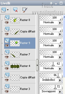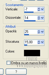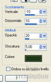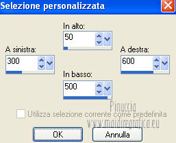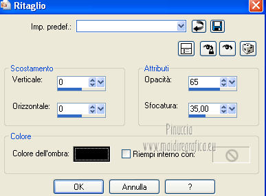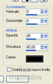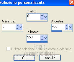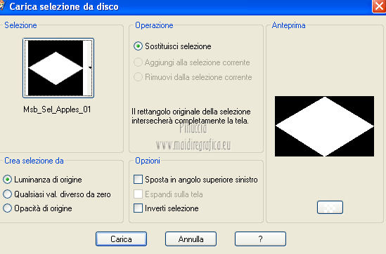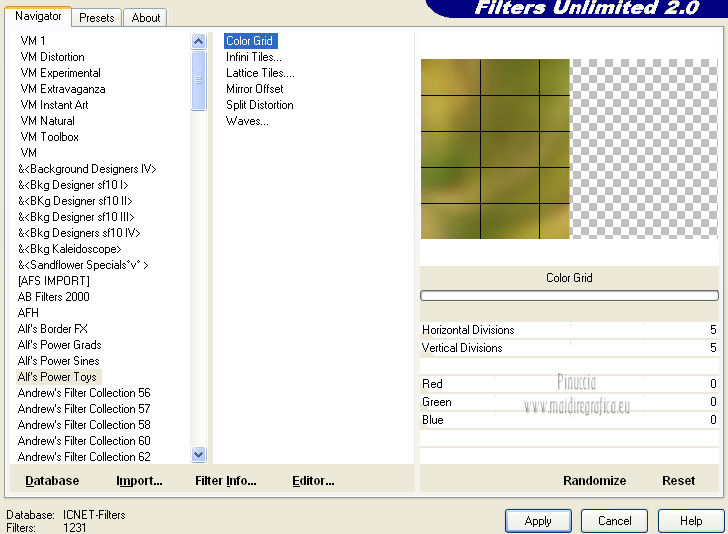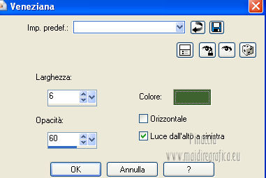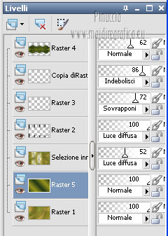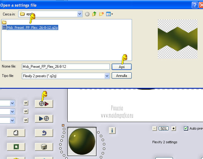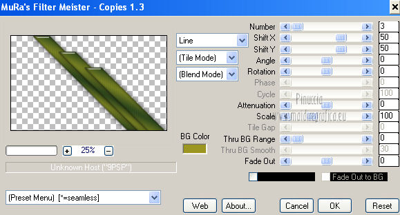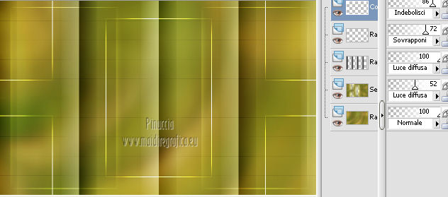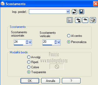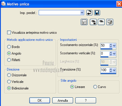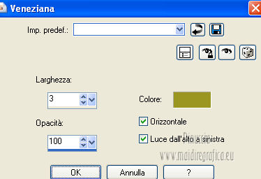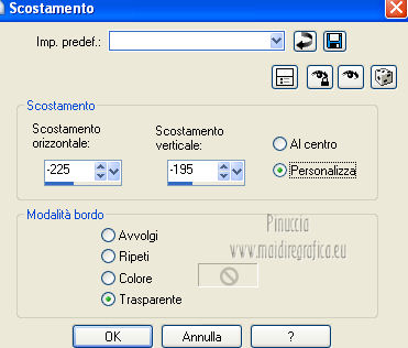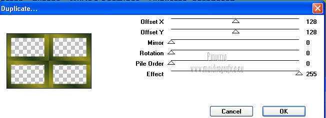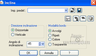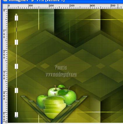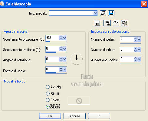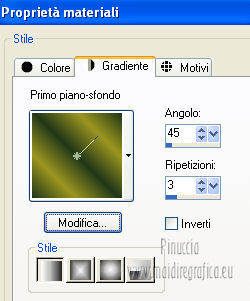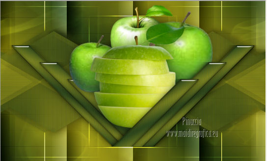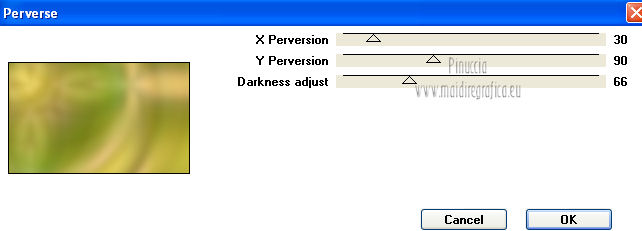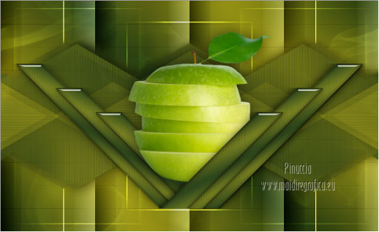 qui puoi trovare qualche risposta ai tuoi dubbi. Se l'argomento che ti interessa non è presente, ti prego di segnalarmelo. Questo tutorial è una creazione ©Meetjesplekje e non può essere copiato su altri siti nè essere offerto per il download. Lo stesso vale per la mia traduzione. Il materiale viene da vari gruppi di condivisione. Il copyright appartiene ai rispettivi autori. Grazie ai creatori dei tubes che mettono a disposizione il loro lavoro in vari gruppi di condivisione. Questo tutorial è stato creato con PSP X3. Per tradurlo usato PSP X. Occorrente: Materiale qui Per il tube della donna grazie Kitty Per i tube delle mele grazie Athenais Filtri: consulta, se necessario, la mia sezione filtri qui Filters Unlimited 2.0 qui Alf's Power Toys - Color Grid qui Flexify 2 qui Alien Skin Eye Candy 5 Impact - Glass qui Neology . H/V Blender qui Mura's Meister - Copies qui Mura's Seamless - Duplicate qui Graphics Plus - Cross Shadow qui Funhouse - Perverse qui i filtri Alf's Power, Funhouse e Neology si possono usare da soli o importati in Filters Unlimited. A volte si riscontrano differenze nel risultato tra i diversi usi, ma non ci sono regole codificate. Per questo si possono notare soltanto al momento di usarli. ![]() Se stai usando altri colori puoi sperimentare le modalità di miscelatura e le opacità più adatte ai tuoi colori. Salva il preset per Flexify 2 in una cartella tua scelta. Lo importerai da questa cartella quando ti servirà. Metti la selezione nella cartella Selezioni. Imposta il colore di primo piano con #213718, e il colore di sfondo con #9b9620. Passa il colore di primo piano a Gradiente, stile Lineare, con i seguenti settaggi. ![]() 1. Apri una nuova immagine trasparente 900 x 550 pixels, e riempila con il gradiente.Selezione>Seleziona tutto. Apri il tube Kittys-Karcia e vai a Modifica>Copia. non chiuderlo perchè ti servirà ancora Torna al tuo lavoro e vai a Modifica>Incolla nella selezione. Selezione>Deseleziona. Effetti>Effetti di immagine>Motivo unico. ![]() Regola>Sfocatura>Sfocatura radiale. ![]() Regola>Sfocatura>Sfocatura gaussiana - raggio 15. ![]() 2. Livelli>Duplica. Effetti>Plugins>Funhouse - Perverse. ![]() Cambia la modalità di miscelatura di questo livello in Sovrapponi, e abbassa l'opacità al 55%. Livelli>Unisci>Unisci giù. 3. Attiva lo strumento Selezione ,clicca sull'icona Selezione personalizzata ![]() e imposta i seguenti settaggi: ![]() Selezione>Innalza selezione a livello. Selezione>Deseleziona. Effetti>Plugins>Filters Unlimited 2.0 - Alf's Power Toys - Color Grid, con i settaggi standard. ![]() Effetti>Effetti di distorsione>Vento - da destra, intensità 100. ![]() Modifica>Ripeti Vento. Livelli>Duplica. Immagine>Rifletti. Livelli>Unisci>Unisci giù. Effetti>Effetti di immagine>Motivo unico. ![]() Cambia la modalità di miscelatura di questo livello in Luce diffusa, e abbassa l'opacità al 52%. 4. Livelli>Nuovo livello raster. Selezione personalizzata ![]() ![]() Riporta il colore di primo piano al colore #213718. Riempi la selezione con il colore di primo piano.Selezione>Deseleziona. Effetti>Plugins>Filters Unlimited 2.0 - Neology - H/V Blender. ![]() Effetti>Plugins>Mura's Meister - Copies. ![]() Cambia la modalità di miscelatura di questo livello in Luce diffusa. 5. Livelli>Nuovo livello raster. Selezione personalizzata ![]() ![]() Imposta il colore di primo piano con il colore bianco #ffffff, e riempi la selezione con il colore bianco.Selezione>Modifica>Contrai - 2 pixels. Premi sulla tastiera il tasto CANC. Selezione>Deseleziona. Effetti>Effetti di immagine>Motivo unico, con i settaggi standard. ![]() Livelli>Duplica. Attiva il livello sottostante dell'originale. Effetti>Effetti di riflesso>Caleidoscopio. ![]() Cambia la modalità di miscelatura di questo livello in Sovrapponi, e abbassa l'opacità al 72%. Effetti>Effetti di distorsione>Vento - da sinistra, intensità 50. ![]() Attiva il livello superiore della copia. Cambia la modalità di miscelatura di questo livello in Indebolisci, e abbassa l'opacità all'86%. ![]() 6. Livelli>Nuovo livello raster. Riporta il colore di primo al colore iniziale #213718, e imposta il Gradiente del punto 1. ![]() Riempi il livello con il gradiente.Regola>Sfocatura>Sfocatura gaussiana - raggio 15. ![]() Effetti>Plugins>Flaming Pear - Flexify 2. Clicca sull'icona della freccia rossa e cerca, nella cartella in cui lo hai salvato, il preset Msb_Preset_FP_Flex_26-8-12 e clicca Apri per applicarlo ![]() Questi i settaggi. Se hai problemi con il preset puoi impostare manualmente i settaggi che vedi nella schermata. ![]() 7. Livelli>Duplica. Effetti>Effetti di riflesso>Caleidoscopio. ![]() Effetti>Effetti di trama>Veneziana, con il colore di sfondo #9b9620. ![]() Effetti>Effetti 3D>Sfalsa ombra, con il colore nero. ![]() Attiva il livello sottostante dell'originale. Effetti>Effetti di trama>Veneziana, con il colore di primo piano #213718. ![]() Attiva il livello superiore. Livelli>Unisci>Unisci giù. Abbassa l'opacità di questo livello al 37%. Livelli>Duplica, e attiva il livello sottostante. Effetti>Effetti di riflesso>Caleidoscopio. ![]() Effetti>Effetti 3D>Sfalsa ombra, con il colore nero. ![]() Attiva il livello superiore. Livelli>Unisci>Unisci giù. Effetti>Effetti 3D>Sfalsa ombra, con il colore nero. ![]() Abbassa l'opacità di questo livello al 62%. Selezione>Seleziona tutto. Selezione>Mobile. Selezione>Immobilizza. Attiva il livello sottostante. Premi sulla tastiera 4 volte il tasto CANC. Attiva il livello ancora sottostante. Premi sulla tastiera 4 volte il tasto CANC. Ancora attiva il livello immediatamente sotto e premi sulla tastiera 4 volte il tasto CANC. Selezione>Deseleziona. 8. Livelli>Nuovo livello raster. Riempi il livello con il gradiente del punto 1.![]() Regola>Sfocatura>Sfocatura gaussiana - raggio 15. Livelli>Disponi>Sposta giù - due volte, e dovresti avere questo. ![]() ![]() 9. Livelli>Nuovo livello raster. Selezione>Seleziona tutto. Apri il tube Msb_Smoke_1 e vai a Modifica>C