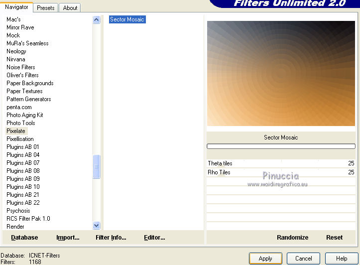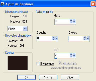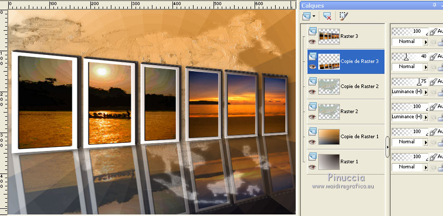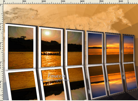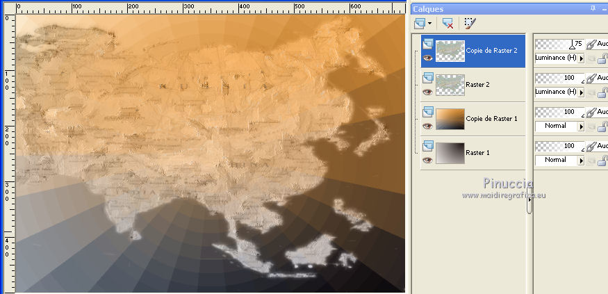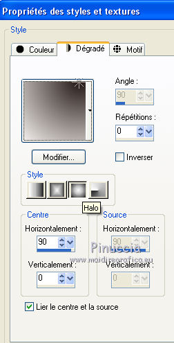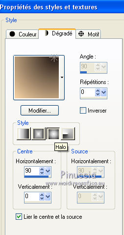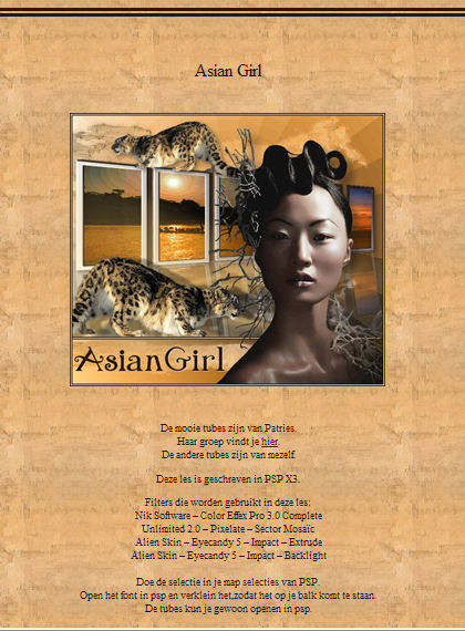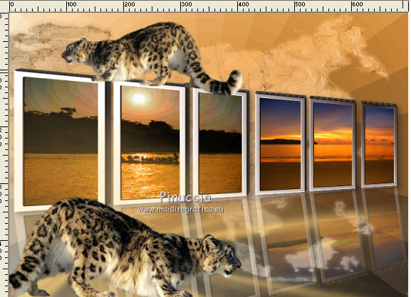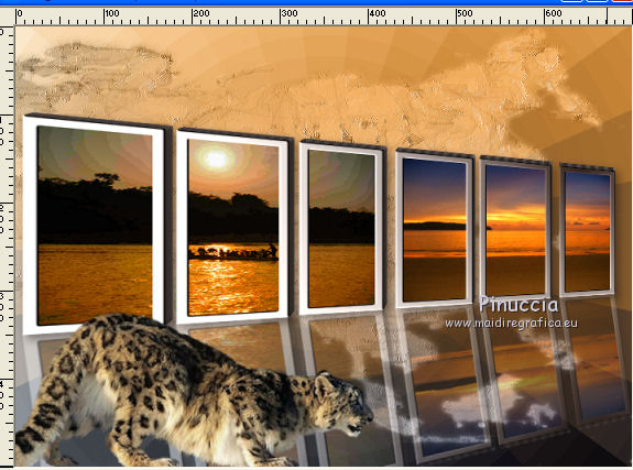 qui puoi trovare qualche risposta ai tuoi dubbi. Se l'argomento che ti interessa non è presente, ti prego di segnalarmelo. Pour traduire ce tutoriel j'ai utilisé Corel X2, mais il peut également être exécuté avec les autres versions. Suivant la version utilisée, vous pouvez obtenir des résultats différents. Depuis la version X4, la fonction Image>Miroir a été remplacée par Image>Renverser horizontalement, et Image>Renverser avec Image>Renverser verticalement. Dans les versions X5 et X6, les fonctions ont été améliorées par la mise à disposition du menu Objets. Avec la nouvelle version X7, nous avons à nouveau Miroir/Retourner, mais avec nouvelles différences. Consulter, si vouz voulez, mes notes ici Certaines dénominations ont changées entre les versions de PSP. Les plus frequentes dénominations utilisées: ![]() traduction italienne ici vos versions iciNécessaire pour réalise le tutoriel: Matériel ici Pour les tubes merci Patries. (les liens des sites des tubeuses ici) Modules Externes. consulter, si nécessaire, ma section de filtre ici Filters Unlimited 2.0 ici Pixelate - Sector Mosaic ici Alien Skin Eye Candy 5 Impact ici Nik Software - Color Efex ici Filtres Pixelate peuvent être utilisés seuls ou importés dans Filters Unlimited. voir comment le faire ici). Si un filtre est fourni avec cette icône, ![]() N'hésitez pas à changer le mode mélange des calques et leur opacité selon les couleurs que vous utiliserez Dans les plus récentes versions de PSP, vous ne trouvez pas le dégradé d'avant plan/arrière plan ou Corel_06_029. Vous pouvez utiliser le dégradé des versions antérieures. Ici le dossier Dégradés de CorelX. Ouvrez la police et la minimiser. Vous la trouverez dans la liste des polices disponibles lorsque vous en avez besoin. Avec les nouveaux s.o. ce n'est plus possible. Pour utiliser une police, vous devez le copier dans le dossier Fonts de Windows. Placer la sélection dans le dossier Sélections. Placer en avant plan la couleur #241915, et en arrière plan la couleur #f1edea. ![]() Préparer en avant plan un dégradé de premier plan/arrière plan, style Halo, avec ces réglages. ![]() 1. Ouvrir une nouvelle image transparente 700 x 500 pixels, Remplir l'image transparente du dégradéCalques>Dupliquer. Effets>Modules Externes>Nik Software - Color Efex Pro - Bi-Color Filters. A destra seleziona il color set Cool/Warm 4 e ok. ![]() Effets>Modules Externes>Filters Unlimited 2.0 - Pixelate - Sector Mosaic, par défaut. le résultat de cet effet peut être légèrement différent selon la version d'Unlimited utilisée; voir le résultat de la traduction italienne Image>Renverser. 2. Calques>Nouveau calque raster. Sélections>Sélectionner tout. Ouvrir le tube Msb_Asia_01 - Édition>Copier. Revenir sur votre travail et Édition>Coller dans la sélection. Sélections>Désélectionner tout. Placer le calque en mode Luminance (héritée). Calques>Dupliquer. Effets>Effets de Traits>Coups de pinceau. Couleur #505050. ![]() Réduire l'opacité de ce calque à 75%. ![]() Réglage>Netteté>Netteté. 3. Calques>Nouveau calque raster. Sélections>Charger/Enregistrer une sélection>Charger à partir du disque. Chercher et charger la sélection Msb_Asia_01, ![]() Remplir la sélection du dégradé.Sélections>Modifier>Contracter - 10 pixels. Presser CANC sur le clavier .Sélections>Inverser. Sélections>Flottante. Sélections>Statique. Effets>Effets 3D>Biseautage intérieur. ![]() Sélections>Désélectionner tout. Activer l'outil Baguette magique ![]() et cliquers dans les première 3 cadres pour les sélectionner. ![]() Calques>Nouveau calque raster. Sélections>Modifier>Agrandir - 2 pixels. Ouvrir l'image Msb_Asie_02 - Édition>Copier. Revenir sur votre travail et Édition>Coller dans la sélection. Réglage>Netteté>Netteté. Calques>Agencer>Déplacer vers le bas. Effets>Modules Externes>Nik Software - Color Efex Pro, comme précédemment (Color set cool/warm4). ![]() Vous positionner sur le calque du haut de la pile. Calques>Fusionner>Fusionner le calque de dessous. Sélections>Désélectionner tout. Sélectionners les autres 3 cadre avec la baguette magique ![]() ![]() 4. Calques>Nouveau calque raster. Sélections>Modifier>Agrandir - 2 pixels. Ouvrir l'image Msb_Asie_04 - Édition>Copier. Revenir sur votre travail et Édition>Coller dans la sélection. Réglage>Netteté>Netteté. Calques>Agencer>Déplacer vers le bas. Effets>Modules Externes>Nik Software - Color Efex Pro, comme précédemment (Color set cool/warm4). ![]() Vous positionner sur le calque du haut de la pile. Calques>Fusionner>Fusionner le calque de dessous. Sélections>Désélectionner tout. 5. Effets>Effets géométriques>Perspective horizontale. ![]() Effets>Modules Externes>Alien Skin Eye Candy 5 Impact - Extrude, Sélectionner le preset Small Offset,30 degrees, avec ces réglages. Solid color: couleur d'avant plan - hightlight color: couleur d'arrière plan. ![]() Effets>Effets 3D>Ombre portée, couleur d'avant plan. ![]() Calques>Dupliquer. Image>Renverser. Image>Rotation libre - 8 degrés à gauche. ![]() Déplacer l'image contre l'original, comme ci-dessous.![]() Réduire l'opacité de ce calque à 40%. Calques>Agencer>Déplacer vers le bas. ![]() Vous positionner à nouveau sur le calque du haut de la pile. 6. Ouvrir le tube 1Patries_DR148-LeopardReady to jump-21-1-10 - Édition>Copier. Revenir sur votre travail et Édition>Coller comme nouveau calque. Image>Redimensionner, 2 fois à 80%, redimensionner tous les calques décoché. Image>Rotation libre - 2 degrés à droite. ![]() Déplacer le tube en bas à gauche, sur le bord.![]() Calques>Dupliquer, et vous positionner sur le calque de dessous de l'original. Effets>Modules Externes>Alien Skin Eye Candy 5 Impact - Backlight. Sélectionner le preset Maximun Expansion et ok. ![]() Vous positionner à nouveau sur le calque du haut de la pile. Calques>Dupliquer. Image>Redimensionner, 2 fois à 80%, redimensionner tous les calq