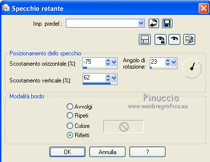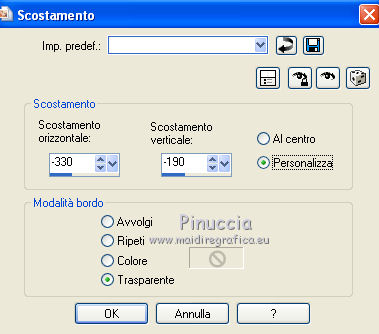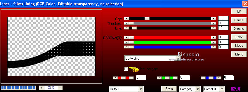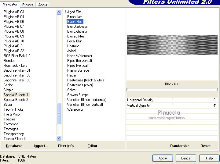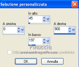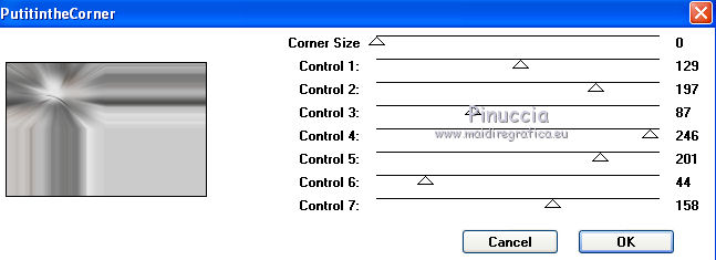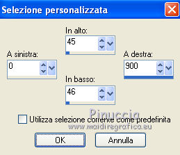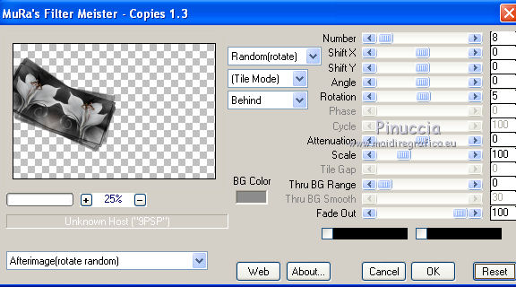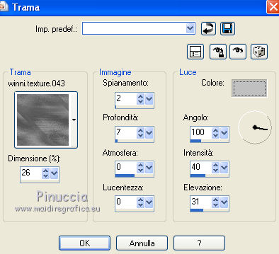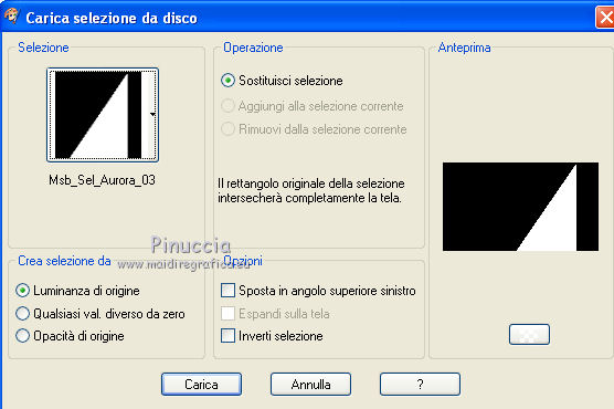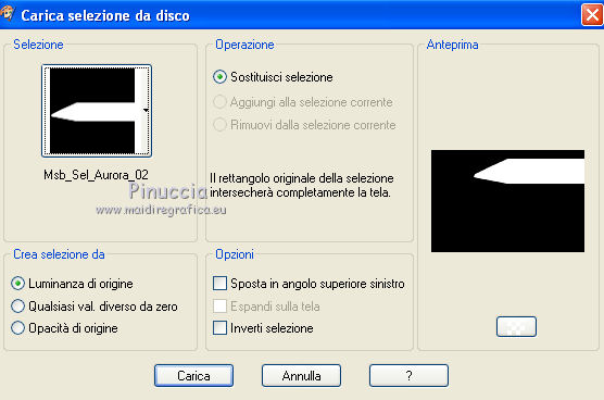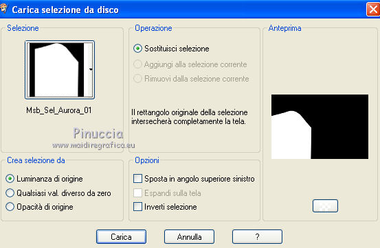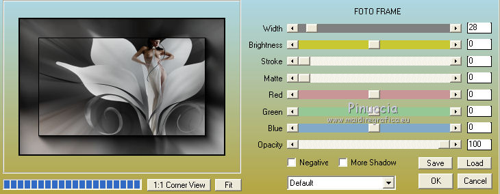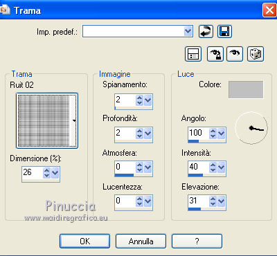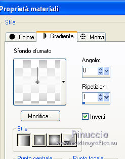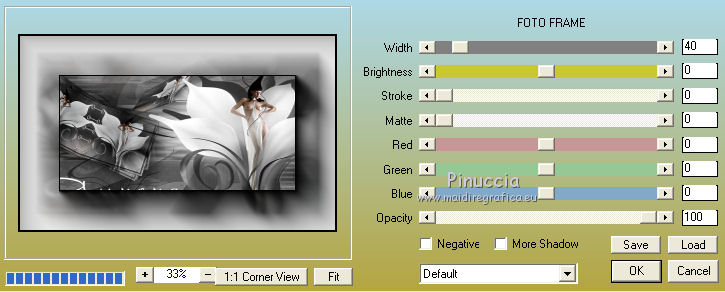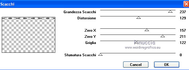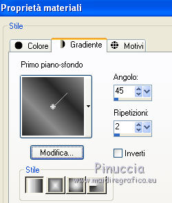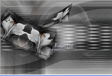 qui puoi trovare qualche risposta ai tuoi dubbi. Se l'argomento che ti interessa non è presente, ti prego di segnalarmelo. Per tradurre questo tutorial ho usato PSP X. Questo tutorial è una creazione ©Meetjesplekje e non può essere copiato su altri siti nè essere offerto per il download. Lo stesso vale per la mia traduzione. Il materiale viene da vari gruppi di condivisione. Il copyright appartiene ai rispettivi autori. Grazie ai creatori dei tubes che mettono a disposizione il loro lavoro in vari gruppi di condivisione. Occorrente: Materiale qui Il tube della donna è di Syl Il tube del fiore è di Moon Catcher's Club Grazie a tutti gli autori per i loro bellissimi tubes. Filtri: consulta, se necessario, la mia sezione filtri qui Filters Unlimited 2.0 qui AAA Frames - Foto frame qui &<Background Designer IV> - @Night Shadow qui Horizonaus Mixed Bag - PutintheCorner qui Simple - Top Left Mirror, 4Way Average qui It@lian Editors Effect - Scacchi qui Filters Unlimited 2.0 qui AP 01 Innovations - Lines SilverLining qui Alien Skin Eye Candy 5 Impact qui Mura's Meister - Copies qui ![]() Metti le trame Ruit02 e winni.texture.043 nella cartella Trame. Metti i pennelli nella cartella Pennelli. Attenzione, i pennelli sono composti da 2 files che non devono essere separati. Vedi gli appunti sui pennelli qui Metti le selezioni nella cartella Selezioni. Se non vuoi sentire la musica premi il tasto ESC Imposta il colore di primo piano con #282828, e il colore di sfondo con #8c8c8c. Passa il colore di primo piano a Gradiente, stile Lineare, con i seguenti settaggi. ![]() 1. Apri una nuova immagine trasparente 900 x 600 pixels, e riempila con il gradiente.Selezione>Seleziona tutto. Apri il tube ©SvB(551)Beauty, e vai a Modifica>Copia. non chiuderlo perchè ti servirà ancora Torna al tuo lavoro e vai a Modifica>Incolla nella selezione. Selezione>Deseleziona. Effetti>Effetti di immagine>Motivo unico, con i settaggi standard. ![]() Regola>Sfocatura>Sfocatura radiale. ![]() 2. Livelli>Duplica. Fai due copie di questo sfondo, usando la combinazione di tasti maiuscola+D. Salva la prima copia con il nome "sfondo" e minimizzala. (La userai più tardi per i bordi). ![]() Attiva la seconda copia. Sul livello superiore: cambia la modalità di miscelatura di questo livello in Moltiplica. Modifica>Incolla come nuovo livello (il tube ©SvB(551)Beauty è ancora in memoria). Immagine>Ridimensiona, al 93%, tutti i livelli non selezionato. Lascialo come sta. Livelli>Duplica. Attiva il livello sottostante dell'originale. Effetti>Effetti 3D>Sfalsa ombra, con il colore #c0c0c0. ![]() Attiva il livello superiore. Ancora Livelli>Duplica, e attiva il livello sottostante. Effetti>Effetti 3D>Sfalsa ombra, con il colore nero. ![]() Attiva il livello superiore. Effetti>Effetti 3D>Sfalsa ombra, con il colore nero. ![]() Effetti>Effetti di bordo>Passaggio alto. ![]() Se stai usando Psp 9, non troverai questo Effetto, che serve per scurire il livello. Eventualmente, puoi cambiare la modalità di miscelatura in Scurisci. Livelli>Unisci>Unisci tutto. Effetti>Plugins>AAA Frames - Foto Frame. ![]() Salva questa immagine con il nome "quadro" e minimizzala. ![]() 3. Attiva il lavoro originale. Sei posizionato sul livello del duplicato. Effetti>Plugins>Horizonaus Mixed Bag - PutintheCorner, con i settaggi standard. ![]() Selezione>Carica/Salva selezione>Carica selezione da disco. Cerca e carica la selezione Msb_aurora_01. ![]() Selezione>Innalza selezione a livello. Selezione>Deseleziona. Effetti>Plugins>Simple - Top Left Mirror. Abbassa l'opacità di questo livello al 46%. 4. Attiva il livello centrale. Selezione>Carica/Salva selezione>Carica selezione da disco. Cerca e carica la selezione Msb_aurora_02. ![]() Selezione>Innalza selezione a livello. Livelli>Disponi>Porta in alto. Selezione>Deseleziona. Effetti>Plugins>Simple - 4Way Average. Livelli>Unisci>Unisci giù. Effetti>Effetti di bordo>Passaggio alto, con i settaggi precedenti. ![]() Se non hai questo effetto nel tuo PSP, in sostituzione di questo passaggio, puoi copiare e incollare su un nuovo livello il "Msb_Template-Aurora Highpass", che trovi nel materiale. 5. Attiva lo strumento Selezione ![]() clicca sull'icona Selezione personalizzata ![]() e imposta i seguenti settaggi. ![]() Selezione>Innalza selezione a livello. Effetti>Plugins>Special Effects 1 - Black Net, con i settaggi standard. ![]() 6. Attiva il livello sottostante. ![]() Selezione personalizzata ![]() ![]() Selezione>Innalza selezione a livello. Effetti>Effetti di trama>Trama, seleziona la trama winni.texture043 con i seguenti settaggi. Colore #c0c0bf. ![]() Livelli>Nuovo livello raster. Selezione personalizzata ![]() ![]() Lo spazio è stretto, ingrandisci molto l'immagine per vederlo meglio, usando la rotellina del mouse. Riempi la selezione con il colore #fafafa.Selezione>Deseleziona. Livelli>Duplica. Effetti>Effetti di immagine>Scostamento. ![]() Livelli>Unisci>Unisci giù - 2 volte. Livelli>Duplica. Immagine>Capovolgi. Effetti>Effetti di immagine>Scostamento. ![]() Livelli>Unisci>Unisci giù. Effetti>Plugins>Alien Skin Eye Candy 5 Impact - Perspective Shadow. Seleziona il preset Drop Shadow, Blurry e ok. ![]() Livelli>Unisci>Unisci visibile. 7. Livelli>Nuovo livello raster. Selezione personalizzata ![]() ![]() Riempi la selezione con il colore #fafafa.Selezione>Deseleziona. Effetti>Effetti di distorsione>Distorsione. ![]() Effetti>Plugins>AP 01 Innovations - Lines SilverLining, attenzione Create lines non è selezionato. ![]() Effetti>Effetti di immagine>Scostamento. ![]() Livelli>Duplica. Immagine>Rifletti. Immagine>Capovolgi. Livelli>Unisci>Unisci giù. Cambia la modalità di miscelatura di questo livello in Luce diffusa, e abbassa l'opacità al 63%. 8. Livelli>Nuovo livello raster. Attiva lo strumento Pennello ![]() cerca e seleziona il pennello Msb_Brush_Aurora_01 con i seguenti settaggi. ![]() attenzione, questo pennello è stato creato con le versioni più recenti di PSP. Se stai usando una versio